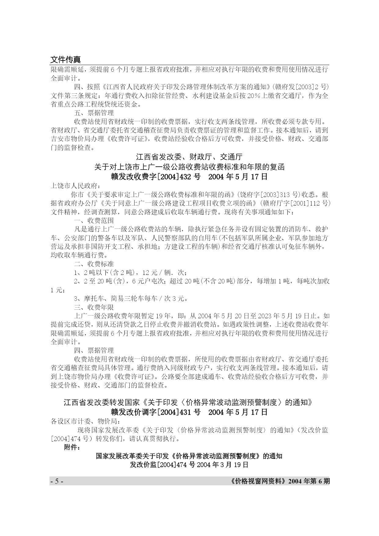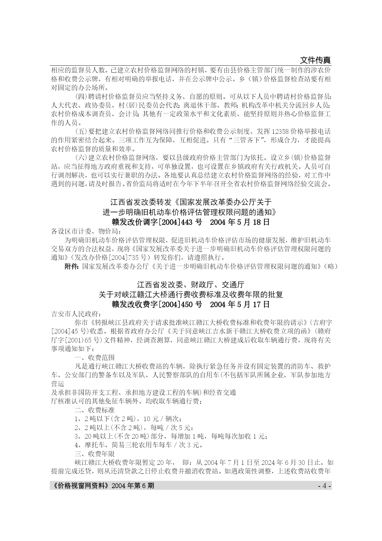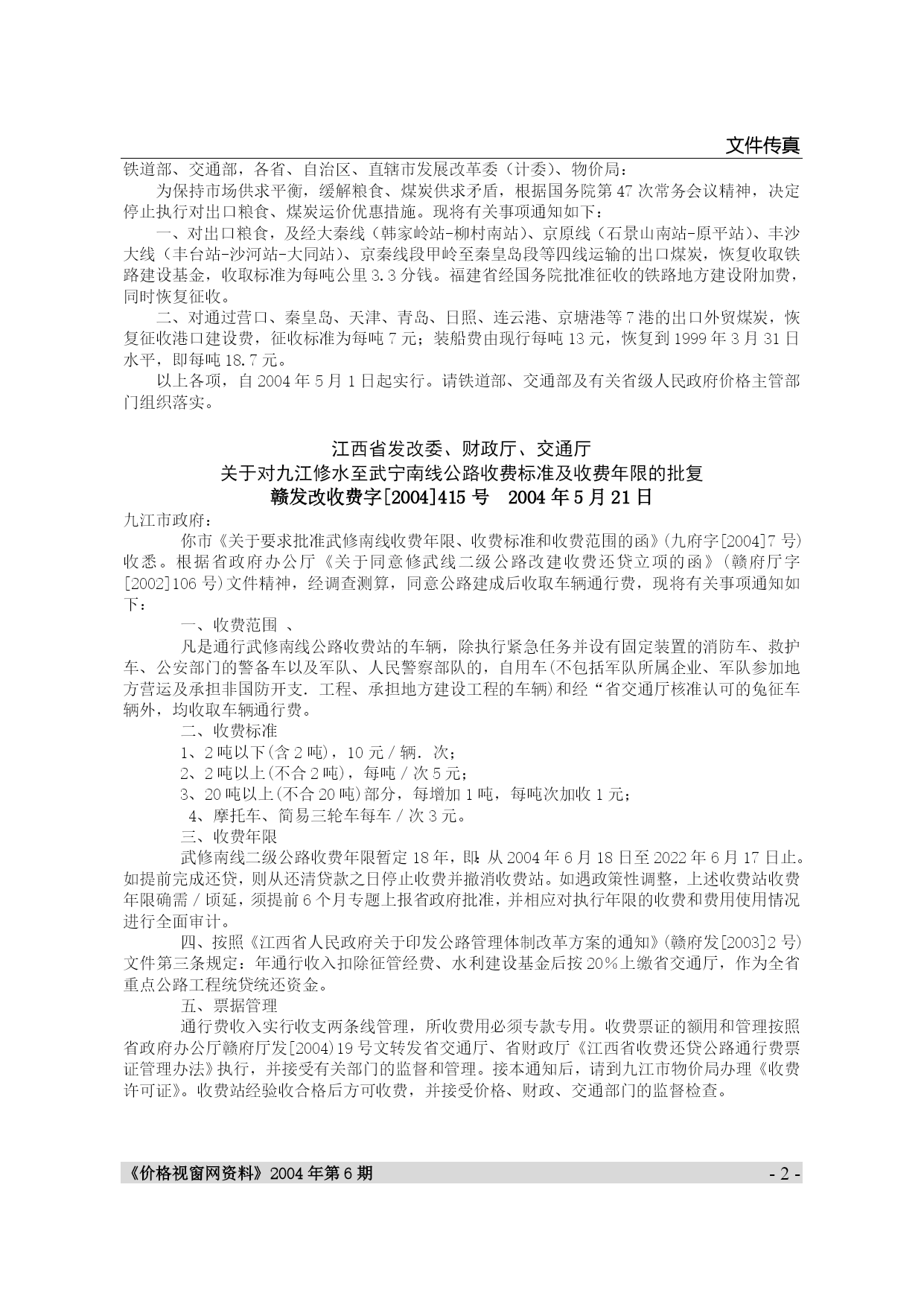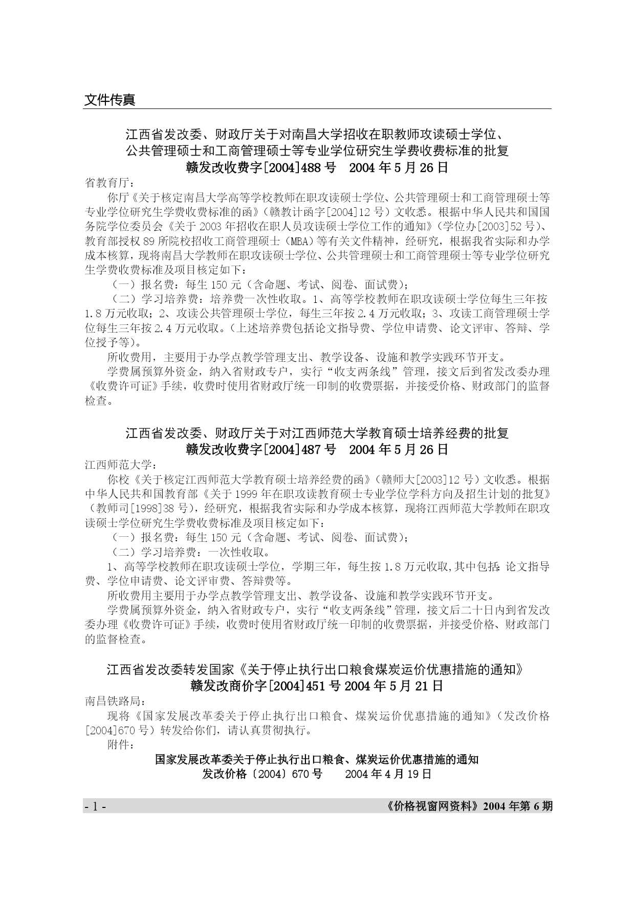 文件传真文件传真PAGE-32-《价格视窗网资料》2004年第6期PAGE-31-《价格视窗网资料》2004年第6期江西省发改委、财政厅关于对南昌大学招收在职教师攻读硕士学位、公共管理硕士和工商管理硕士等专业学位研究生学费收费标准的批复赣发改收费字[2004]488号2004年5月26日省教育厅:你厅《关于核定南昌大学高等学校教师在职攻读硕士学位、公共管理硕士和工商管理硕士等专业学位研究生学费收费标准的函》(赣教计函字[2004]12号)文收悉。根据中华人民共和国国务院学位委员会《关于2003年招收在职人员攻读硕士学位工作的通知》(学位办[2003]52号)、教育部授权89所院校招收工商管理硕士(MBA)等有关文件精神,经研究,根据我省实际和办学成本核算,现将南昌大学教师在职攻读硕士学位、公共管理硕士和工商管理硕士等专业学位研究生学费收费标准及项目核定如下:(一)报名费:每生150元(含命题、考试、阅卷、面试费);(二)学习培养费:培养费一次性收取。1、高等学校教师在职攻读硕士学位每生三年按1.8万元收取;2、攻读公共管理硕士学位,每生三年按2.4万元收取;3、攻读工商管理硕士学位每生三年按2.4万元收取。(上述培养费包括论文指导费、学位申请费、论文评审、答辩、学位授予等)。所收费用,主要用于办学点教学管理支出、教学设备、设施和教学实践环节开支。学费属预算外资金,纳入省财政专户,实行“收支两条线”管理,接文后到省发改委办理《收费许可证》手续,收费时使用省财政厅统一印制的收费票据,并接受价格、财政部门的监督检查。江西省发改委、财政厅关于对江西师范大学教育硕士培养经费的批复赣发改收费字[2004]487号2004年5月26日江西师范大学:你校《关于核定江西师范大学教育硕士培养经费的函》(赣师大[2003]12号)文收悉。根据中华人民共和国教育部《关于1999年在职攻读教育硕士专业学位学科方向及招生计划的批复》(教师司[1998]38号),经研究,根据我省实际和办学成本核算,现将江西师范大学教师在职攻读硕士学位研究生学费收费标准及项目核定如下:(一)报名费:每生150元(含命题、考试、阅卷、面试费);(二)学习培养费:一次性收取。1、高等学校教师在职攻读硕士学位,学期三年,每生按1.8万元收取,其中包括:论文指导费、学位申请费、论文评审费、答辩费等。所收费用主要用于办学点教学管理支出、教学设备、设施和教学实践环节开支。学费属预算外资金,纳入省财政专户,实行“收支两条线”管理,接文后二十日内到省发改委办理《收费许可证》手续,收费时使用省财政厅统一印制的收费票据,并接受价格、财政部门的监督检查。江西省发改委转发国家《关于停止执行出口粮食煤炭运价优惠措施的通知》赣发改商价字[2004]451号2004年5月21日南昌铁路局:现将《国家发展改革委关于停止执行出口粮食、煤炭运价优惠措施的通知》(发改价格[2004]670号)转发给你们,请认真贯彻执行。附件:国家发展改革委关于停止执行出口粮食、煤炭运价优惠措施的通知发改价格〔2004〕670号2004年4月19日铁道部、交通部,各省、自治区、直辖市发展改革委(计委)、物价局:为保持市场供求平衡,缓解粮食、煤炭供求矛盾,根据国务院第47次常务会议精神,决定停止执行对出口粮食、煤炭运价优惠措施。现将有关事项通知如下:一、对出口粮食,及经大秦线(韩家岭站-柳村南站)、京原线(石景山南站-原平站)、丰沙大线(丰台站-沙河站-大同站)、京秦线段甲岭至秦皇岛段等四线运输的出口煤炭,恢复收取铁路建设基金,收取标准为每吨公里3.3分钱。福建省经国务院批准征收的铁路地方建设附加费,同时恢复征收。二、对通过营口、秦皇岛、天津、青岛、日照、连云港、京塘港等7港的出口外贸煤炭,恢复征收港口建设费,征收标准为每吨7元;装船费由现行每吨13元,恢复到1999年3月31日水平,即每吨18.7元。以上各项,自2004年5月1日起实行。请铁道部、交通部及有关省级人民政府价格主管部门组织落实。江西省发改委、财政厅、交通厅关于对九江修水至武宁南线公路收费标准及收费年限的批复赣发改收费字[2004]415号2004年5月21日九江市政府:你市《关于要求批准武修南线收费年限、收费标准和收费范围的函》(九府字[2004]7号)收悉。根据省政府办公厅《关于同意修武线二级公路改建收费还贷立项的函》(赣府厅字[2002]106号)文件精神,经调查测算,同意公路建成后收取车辆通行费,现将有关事项通知如下:一、收费范围、凡是通行武修南线公路收费站的车辆,除执行紧急任务并设有固定装置的消防车、救护车、公安部门的警备车以及军队、人民警察部队的,自用车(不包括军队所属企业、军队参加地方营运及承担非国防开支.工程、承担地方建设工程的车辆)和经