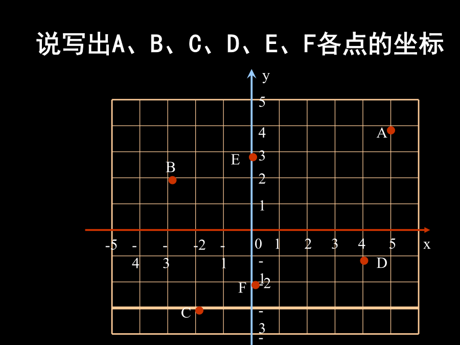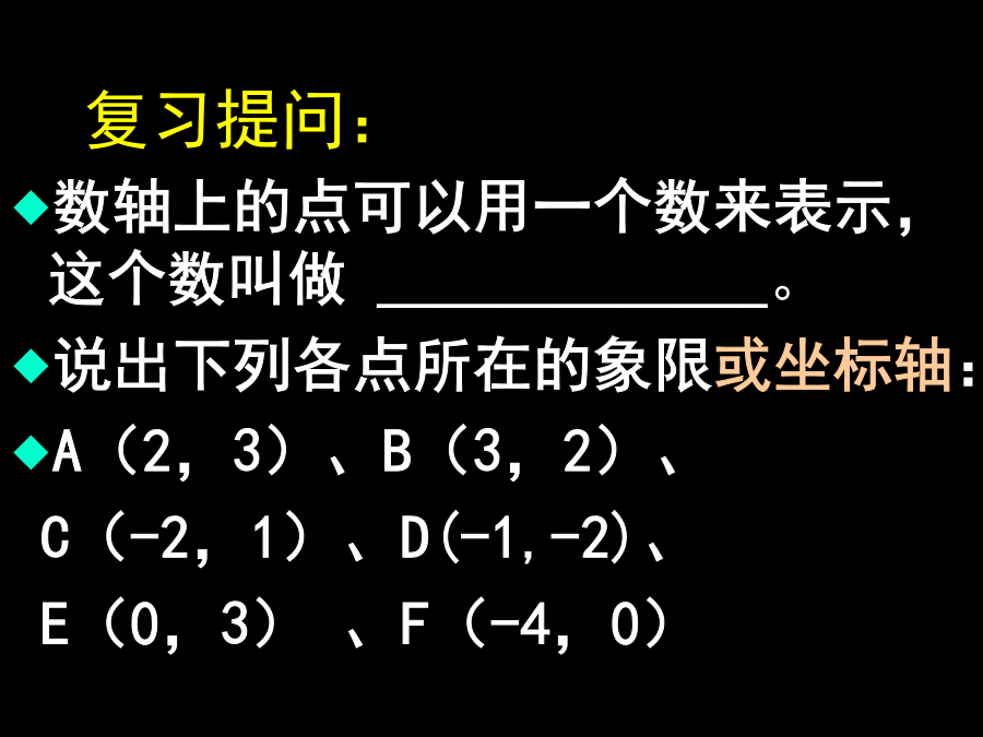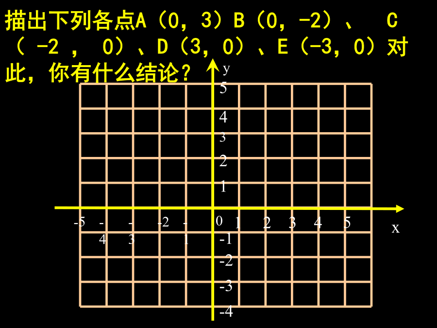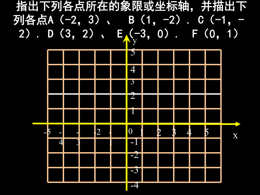 平面直角坐标系2复习提问:指出下列各点所在的象限或坐标轴,并描出下列各点A(-2,3)、B(1,-2).C(-1,-2).D(3,2)、E(-3,0).F(0,1)规律:规律:规律:规律:点的坐标符号规律:练习:根据点的特点填表:练习:练习:描出下列各点A(2,3)B(2,-3)、C(-1,-2)D(-1,2)、E(1,4)、F(-1,4)。你有什么结论?请作出点A(2,3)关于X轴、Y轴的对称点A’、A’’。并求出它们的坐标。规律:例题:练习1:练习:练习: 作业本:P504、6、8、9