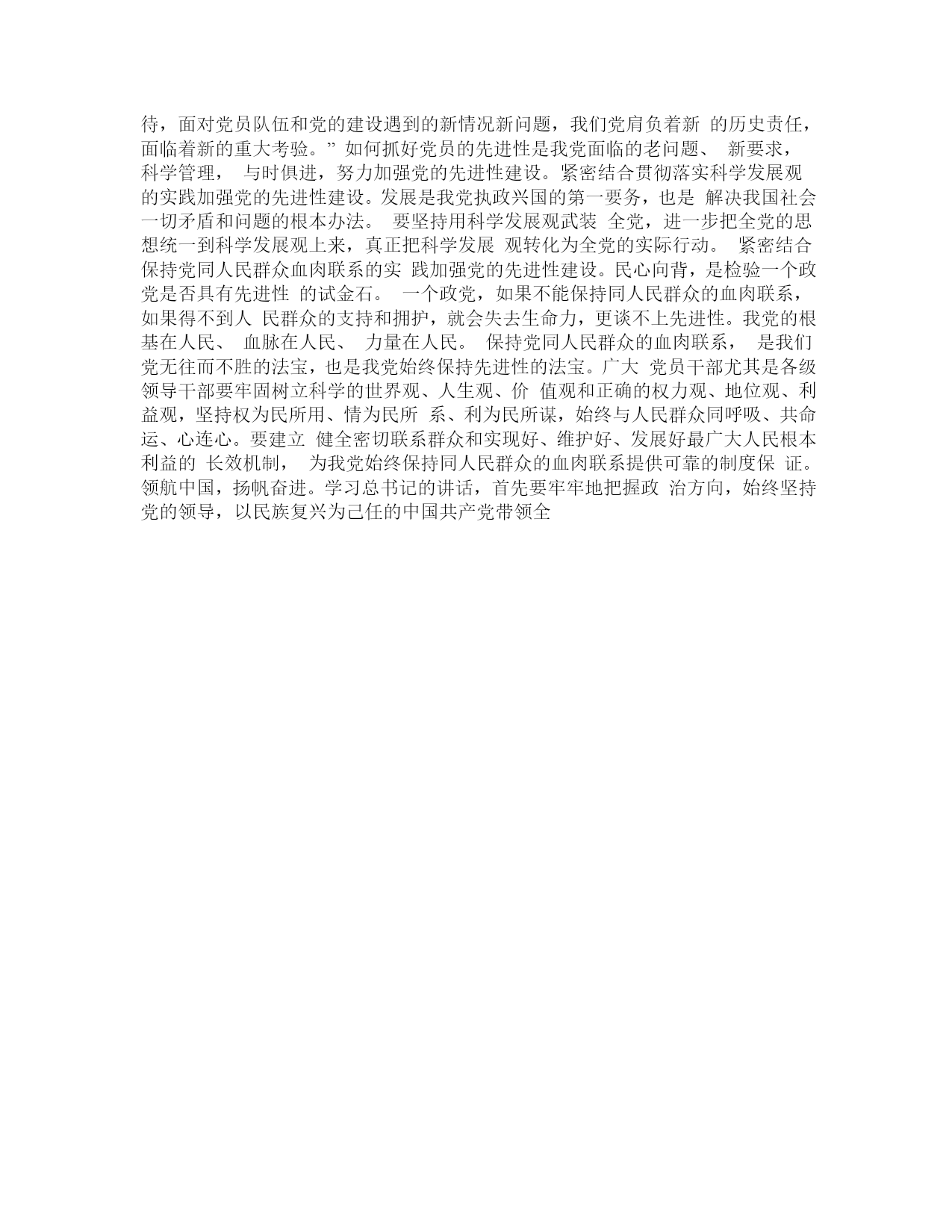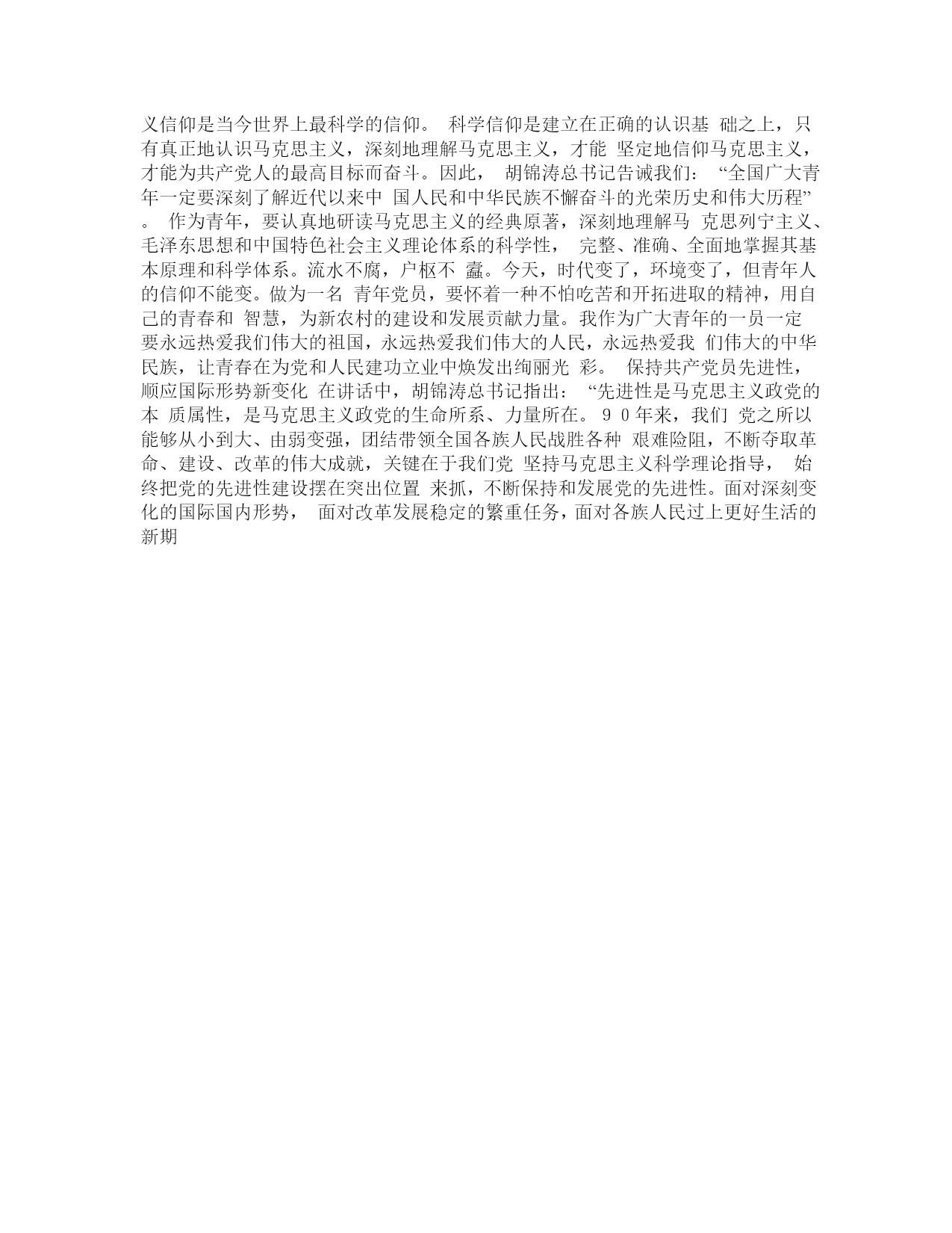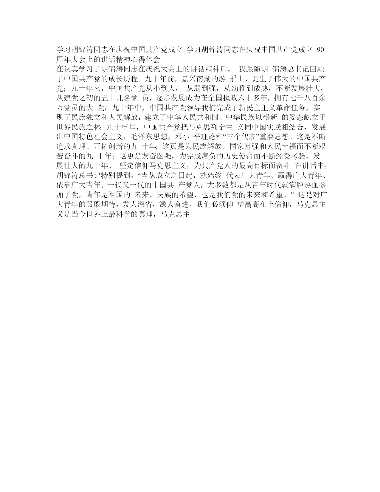 学习胡锦涛同志在庆祝中国共产党成立学习胡锦涛同志在庆祝中国共产党成立90周年大会上的讲话精神心得体会在认真学习了胡锦涛同志在庆祝大会上的讲话精神后,我跟随胡锦涛总书记回顾了中国共产党的成长历程。九十年前,嘉兴南湖的游船上,诞生了伟大的中国共产党;九十年来,中国共产党从小到大,从弱到强,从幼稚到成熟,不断发展壮大,从建党之初的五十几名党员,逐步发展成为在全国执政六十多年,拥有七千八百余万党员的大党;九十年中,中国共产党领导我们完成了新民主主义革命任务,实现了民族独立和人民解放,建立了中华人民共和国、中华民族以崭新的姿态屹立于世界民族之林;九十年里,中国共产党把马克思列宁主义同中国实践相结合,发展出中国特色社会主义,毛泽东思想,邓小平理论和“三个代表”重要思想。这是不断追求真理、开拓创新的九十年;这页是为民族解放、国家富强和人民幸福而不断艰苦奋斗的九十年;这更是发奋图强,为完成肩负的历史使命而不断经受考验、发展壮大的九十年。坚定信仰马克思主义,为共产党人的最高目标而奋斗在讲话中,胡锦涛总书记特别提到,“当从成立之日起,就始终代表广大青年、赢得广大青年、依靠广大青年。一代又一代的中国共产党人,大多数都是从青年时代就满腔热血参加了党,青年是祖国的未来、民族的希望,也是我们党的未来和希望。”这是对广大青年的殷殷期待,发人深省,激人奋进。我们必须仰望高高在上信仰,马克思主义是当今世界上最科学的真理,马克思主义信仰是当今世界上最科学的信仰。科学信仰是建立在正确的认识基础之上,只有真正地认识马克思主义,深刻地理解马克思主义,才能坚定地信仰马克思主义,才能为共产党人的最高目标而奋斗。因此,胡锦涛总书记告诫我们:“全国广大青年一定要深刻了解近代以来中国人民和中华民族不懈奋斗的光荣历史和伟大历程”。作为青年,要认真地研读马克思主义的经典原著,深刻地理解马克思列宁主义、毛泽东思想和中国特色社会主义理论体系的科学性,完整、准确、全面地掌握其基本原理和科学体系。流水不腐,户枢不蠧。今天,时代变了,环境变了,但青年人的信仰不能变。做为一名青年党员,要怀着一种不怕吃苦和开拓进取的精神,用自己的青春和智慧,为新农村的建设和发展贡献力量。我作为广大青年的一员一定要永远热爱我们伟大的祖国,永远热爱我们伟大的人民,永远热爱我们伟大的中华民族,让青春在为党和人民建功立业中焕发出绚丽光彩。保持共产党员先进性,顺应国际形势新变化在讲话中,胡锦涛总书记指出:“先进性是马克思主义政党的本质属性,是马克思主义政党的生命所系、力量所在。90年来,我们党之所以能够从小到大、由弱变强,团结带领全国各族人民战胜各种艰难险阻,不断夺取革命、建设、改革的伟大成就,关键在于我们党坚持马克思主义科学理论指导,始终把党的先进性建设摆在突出位置来抓,不断保持和发展党的先进性。面对深刻变化的国际国内形势,面对改革发展稳定的繁重任务,面对各族人民过上更好生活的新期待,面对党员队伍和党的建设遇到的新情况新问题,我们党肩负着新的历史责任,面临着新的重大考验。”如何抓好党员的先进性是我党面临的老问题、新要求,科学管理,与时俱进,努力加强党的先进性建设。紧密结合贯彻落实科学发展观的实践加强党的先进性建设。发展是我党执政兴国的第一要务,也是解决我国社会一切矛盾和问题的根本办法。要坚持用科学发展观武装全党,进一步把全党的思想统一到科学发展观上来,真正把科学发展观转化为全党的实际行动。紧密结合保持党同人民群众血肉联系的实践加强党的先进性建设。民心向背,是检验一个政党是否具有先进性的试金石。一个政党,如果不能保持同人民群众的血肉联系,如果得不到人民群众的支持和拥护,就会失去生命力,更谈不上先进性。我党的根基在人民、血脉在人民、力量在人民。保持党同人民群众的血肉联系,是我们党无往而不胜的法宝,也是我党始终保持先进性的法宝。广大党员干部尤其是各级领导干部要牢固树立科学的世界观、人生观、价值观和正确的权力观、地位观、利益观,坚持权为民所用、情为民所系、利为民所谋,始终与人民群众同呼吸、共命运、心连心。要建立健全密切联系群众和实现好、维护好、发展好最广大人民根本利益的长效机制,为我党始终保持同人民群众的血肉联系提供可靠的制度保证。领航中国,扬帆奋进。学习总书记的讲话,首先要牢牢地把握政治方向,始终坚持党的领导,以民族复兴为己任的中国共产党带领全国各族人民,奔向新的地平线!身为新世纪、新阶段的工作者,新一代的共产党员,我将面临的是新的考验,紧跟中国特色社会主义领导者的步伐,坚强的向各族人民期待的新生活迈进。