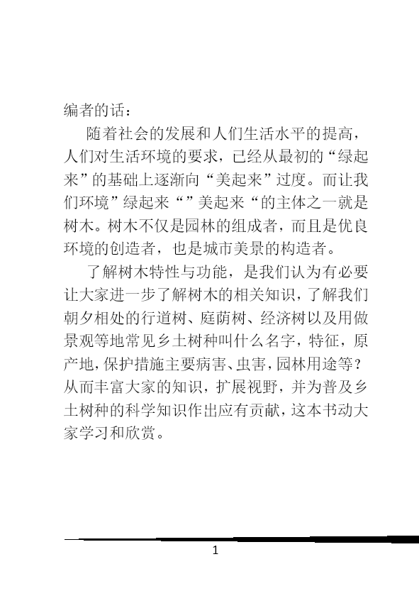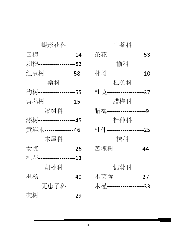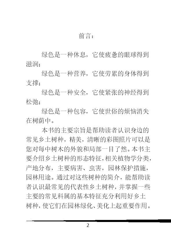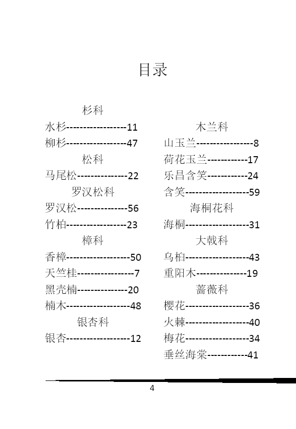 PAGE\*MERGEFORMAT64编者的话:随着社会的发展和人们生活水平的提高,人们对生活环境的要求,已经从最初的“绿起来”的基础上逐渐向“美起来”过度。而让我们环境”绿起来“”美起来“的主体之一就是树木。树木不仅是园林的组成者,而且是优良环境的创造者,也是城市美景的构造者。了解树木特性与功能,是我们认为有必要让大家进一步了解树木的相关知识,了解我们朝夕相处的行道树、庭荫树、经济树以及用做景观等地常见乡土树种叫什么名字,特征,原产地,保护措施主要病害、虫害,园林用途等?从而丰富大家的知识,扩展视野,并为普及乡土树种的科学知识作出应有贡献,这本书动大家学习和欣赏。前言:绿色是一种休息,它使疲惫的眼球得到滋润;绿色是一种营养,它使劳累的身体得到支撑;绿色是一种安全,它使紧张的神经得到松弛;绿色是一种包容,它使世俗的烦恼消失在树荫中。本书的主要宗旨是帮助读者认识身边的常见乡土树种,精美,清晰的彩图照片可以是您对每中树木的外貌和局部一目了然。本书主要介绍乡土树种的形态特征,相关植物学分类,产地分布,主要病害、虫害,园林保护措施,园林用途。通过对这些树种的简介,能帮助读者认识最常见的代表性乡土树种,并掌握一些主要的常见科属的基本特征充分利用好乡土树种,使它们在园林绿化、美化上起重要作用。本书的编写,除了帮助读者初步掌握识别树木的本领之外,还希望能传承我们民族的植物、园林文化作一点引玉之功。在城市中利用些什么树木才即美化环境,又给我们带来更多的经济价值呢?又能改善生态环境?除了从国外引进新的苗木品种,我们家乡的宝贵财富—乡土树种是不是应该开发呢?本书还可以为园林绿化者,学者,专家提供园林苗木保护做一些参考。这只是一本小小的书,一切只是一个小小的开头,我们会从这起步,不断探索,这也是时代的需要。目录杉科水杉------------------11柳杉------------------47松科马尾松---------------22罗汉松科罗汉松---------------56竹柏------------------23樟科香樟-------------------50天竺桂-----------------7黑壳楠---------------20楠木-------------------48银杏科银杏-------------------12木兰科山玉兰-----------------8荷花玉兰------------17乐昌含笑------------24含笑-------------------59海桐花科海桐-------------------31大戟科乌桕-------------------43重阳木---------------19蔷薇科樱花-------------------36火棘-------------------40梅花-------------------34垂丝海棠------------41蝶形花科国槐-------------------14刺槐-------------------52红豆树---------------58桑科构树-------------------55黄葛树---------------15漆树科漆树-------------------45黄连木---------------46木犀科女贞-------------------26桂花-------------------13山茶科茶花-------------------53榆科朴树-------------------10杜英科杜英-------------------37腊梅科腊梅--------------------9杜仲科杜仲-------------------25楝科苦楝树---------------44胡桃科枫杨-------------------49无患子科栾树-------------------29锦葵科木芙蓉---------------27木槿-------------------33千屈菜科紫薇-------------------16梧桐科梧桐-------------------57含羞草科合欢-------------------18桦木科桤木-------------------39蓝果树科喜树-------------------21杨柳科柳树-------------------54云实科皂荚-------------------32连香树科连香树---------------39柏科柏树-------------------61红豆杉科南方红豆杉---------62一、天竺桂天竺桂学名:Cinnamomumpedunculatum科属:樟科樟属别名:普陀樟形态特征: