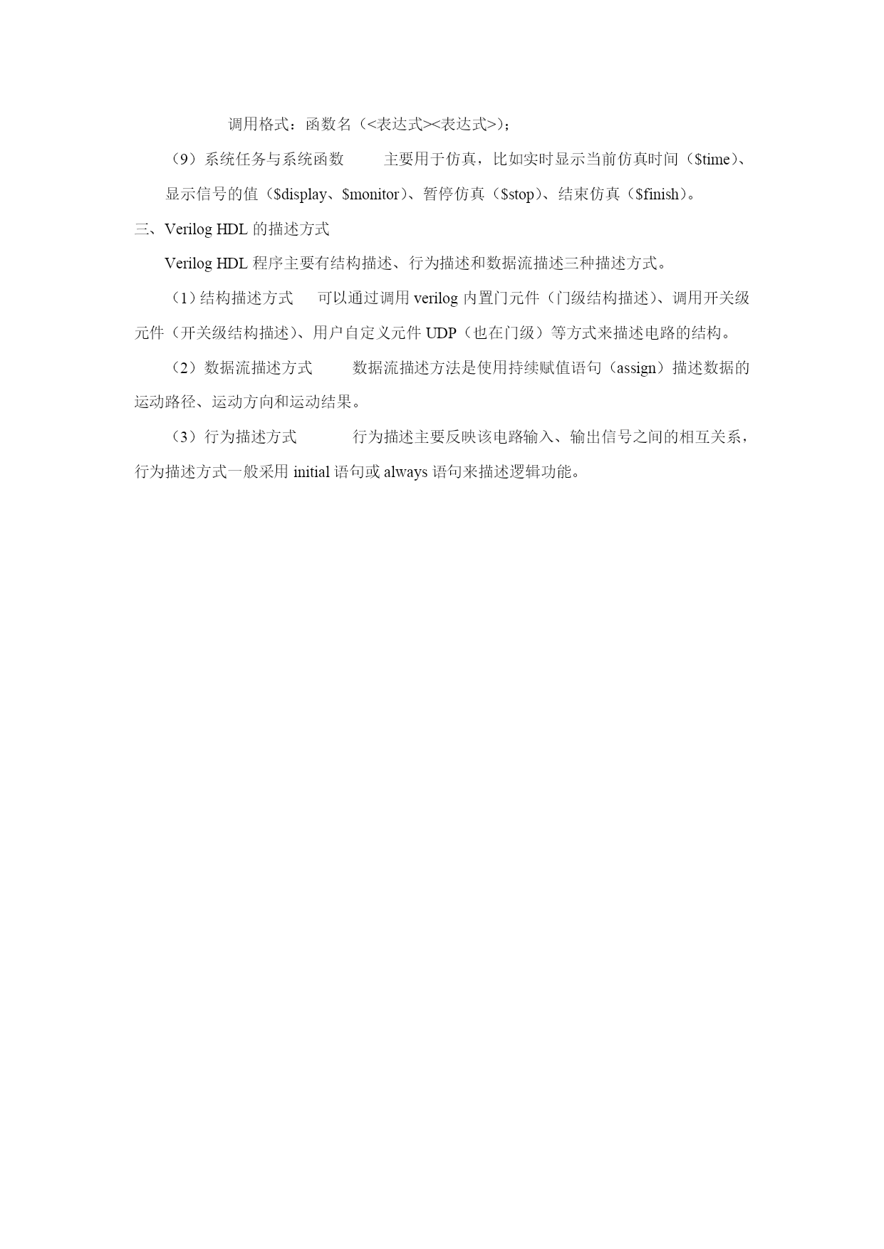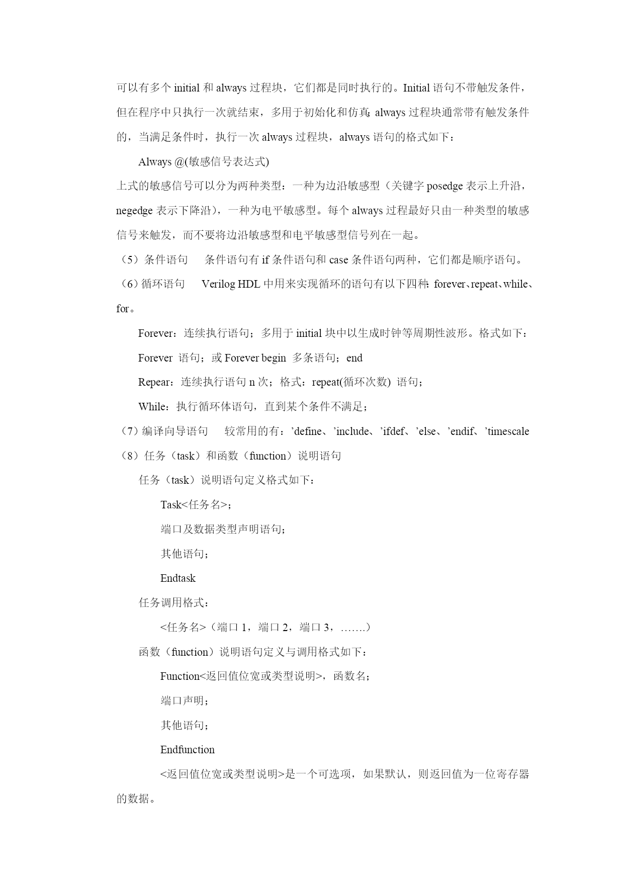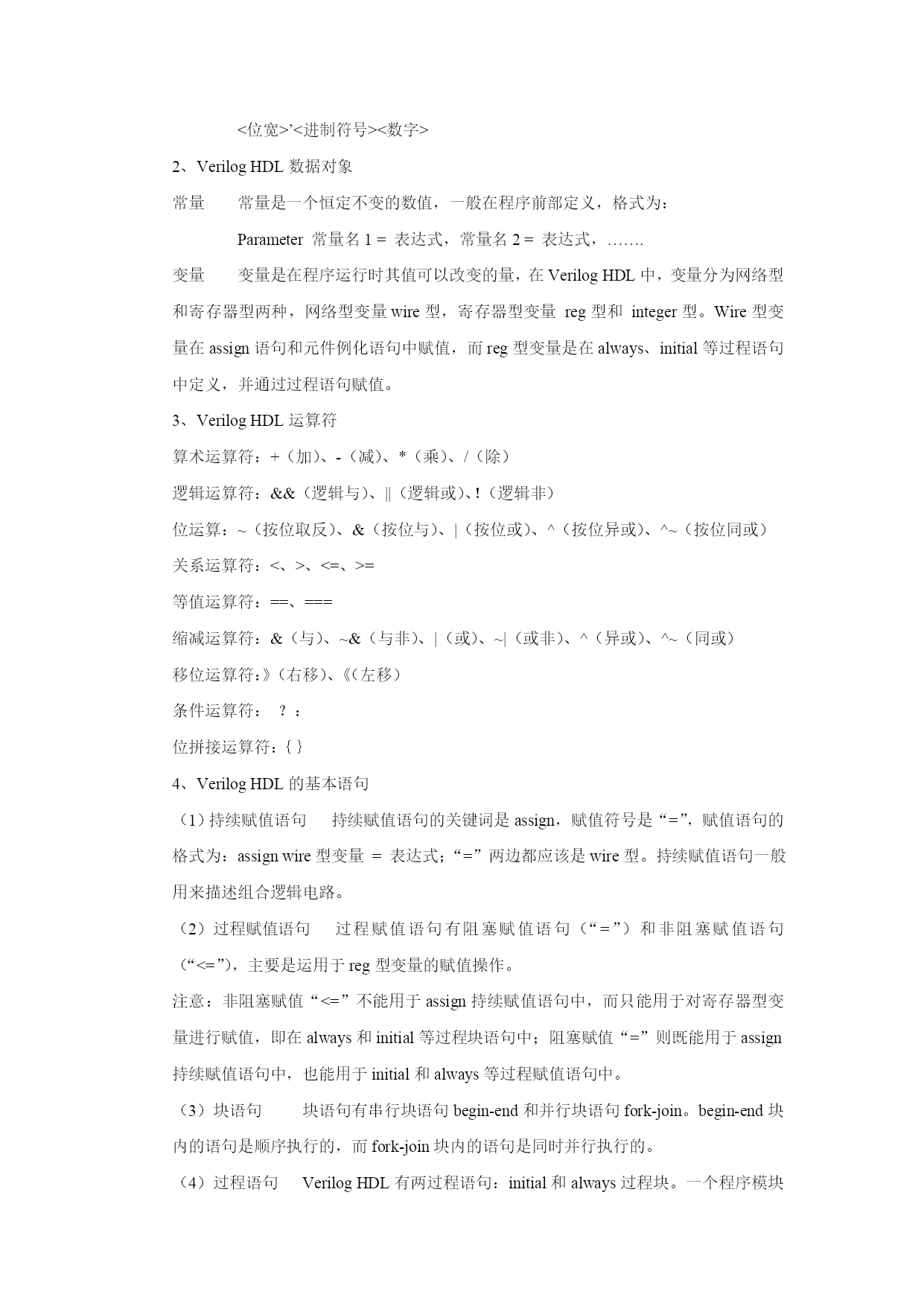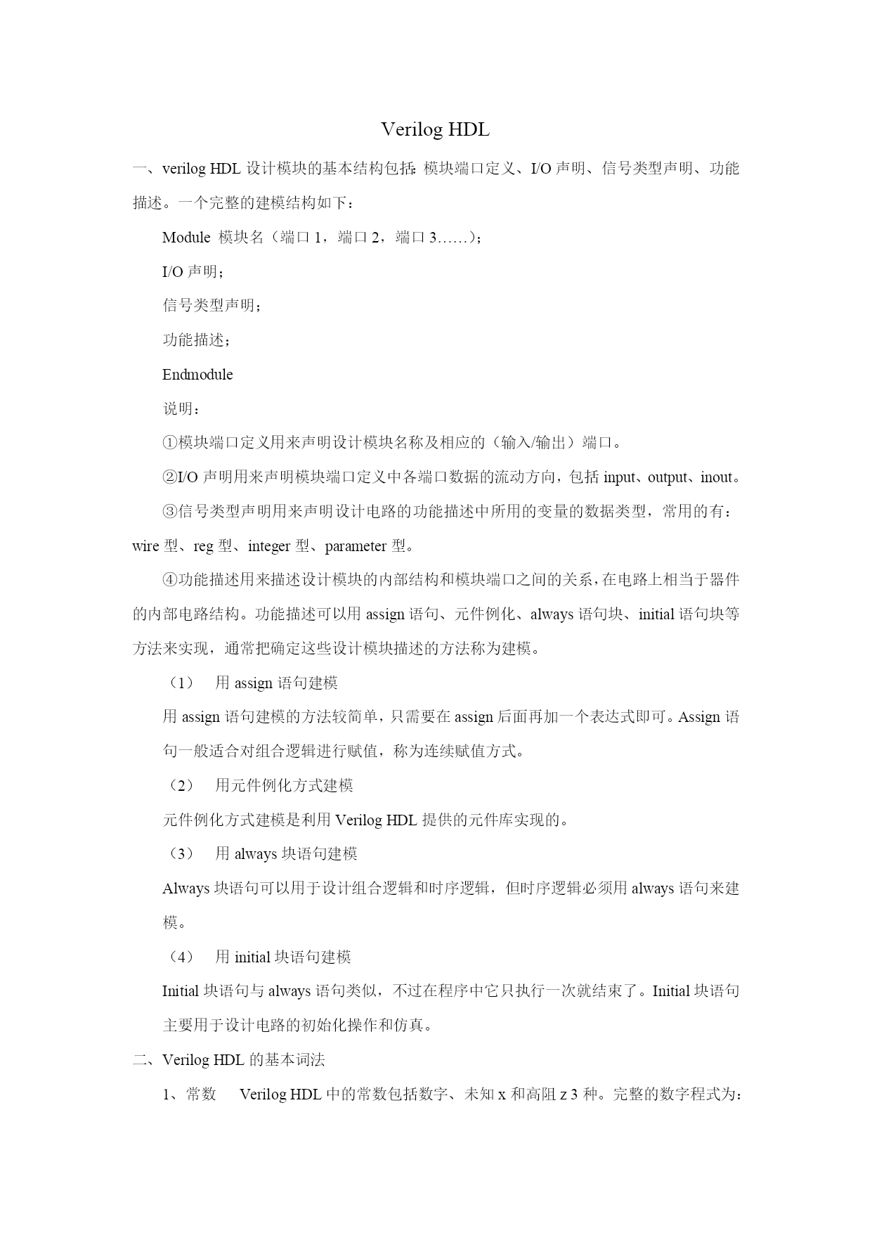 VerilogHDL 一、verilogHDL设计模块的基本结构包括:模块端口定义、I/O声明、信号类型声明、功能描述。一个完整的建模结构如下: Module模块名(端口1,端口2,端口3……); I/O声明; 信号类型声明; 功能描述; Endmodule 说明: ①模块端口定义用来声明设计模块名称及相应的(输入/输出)端口。 ②I/O声明用来声明模块端口定义中各端口数据的流动方向,包括input、output、inout。 ③信号类型声明用来声明设计电路的功能描述中所用的变量的数据类型,常用的有:wire型、reg型、integer型、parameter型。 ④功能描述用来描述设计模块的内部结构和模块端口之间的关系,在电路上相当于器件的内部电路结构。功能描述可以用assign语句、元件例化、always语句块、initial语句块等方法来实现,通常把确定这些设计模块描述的方法称为建模。 用assign语句建模 用assign语句建模的方法较简单,只需要在assign后面再加一个表达式即可。Assign语句一般适合对组合逻辑进行赋值,称为连续赋值方式。 用元件例化方式建模 元件例化方式建模是利用VerilogHDL提供的元件库实现的。 用always块语句建模 Always块语句可以用于设计组合逻辑和时序逻辑,但时序逻辑必须用always语句来建模。 用initial块语句建模 Initial块语句与always语句类似,不过在程序中它只执行一次就结束了。Initial块语句主要用于设计电路的初始化操作和仿真。 二、VerilogHDL的基本词法 1、常数 VerilogHDL中的常数包括数字、未知x和高阻z3种。完整的数字程式为: <位宽>’<进制符号><数字> 2、VerilogHDL数据对象 常量 常量是一个恒定不变的数值,一般在程序前部定义,格式为: Parameter常量名1=表达式,常量名2=表达式,……. 变量 变量是在程序运行时其值可以改变的量,在VerilogHDL中,变量分为网络型和寄存器型两种,网络型变量wire型,寄存器型变量reg型和integer型。Wire型变量在assign语句和元件例化语句中赋值,而reg型变量是在always、initial等过程语句中定义,并通过过程语句赋值。 3、VerilogHDL运算符 算术运算符:+(加)、-(减)、*(乘)、/(除) 逻辑运算符:&&(逻辑与)、||(逻辑或)、!(逻辑非) 位运算:~(按位取反)、&(按位与)、|(按位或)、^(按位异或)、^~(按位同或) 关系运算符:<、>、<=、>= 等值运算符:==、=== 缩减运算符:&(与)、~&(与非)、|(或)、~|(或非)、^(异或)、^~(同或) 移位运算符:》(右移)、《(左移) 条件运算符:?: 位拼接运算符:{} 4、VerilogHDL的基本语句 (1)持续赋值语句 持续赋值语句的关键词是assign,赋值符号是“=”,赋值语句的格式为:assignwire型变量=表达式;“=”两边都应该是wire型。持续赋值语句一般用来描述组合逻辑电路。 (2)过程赋值语句 过程赋值语句有阻塞赋值语句(“=”)和非阻塞赋值语句(“<=”),主要是运用于reg型变量的赋值操作。 注意:非阻塞赋值“<=”不能用于assign持续赋值语句中,而只能用于对寄存器型变量进行赋值,即在always和initial等过程块语句中;阻塞赋值“=”则既能用于assign持续赋值语句中,也能用于initial和always等过程赋值语句中。 (3)块语句 块语句有串行块语句begin-end和并行块语句fork-join。begin-end块内的语句是顺序执行的,而fork-join块内的语句是同时并行执行的。 (4)过程语句 VerilogHDL有两过程语句:initial和always过程块。一个程序模块可以有多个initial和always过程块,它们都是同时执行的。Initial语句不带触发条件,但在程序中只执行一次就结束,多用于初始化和仿真;always过程块通常带有触发条件的,当满足条件时,执行一次always过程块,always语句的格式如下: Always@(敏感信号表达式) 上式的敏感信号可以分为两种类型:一种为边沿敏感型(关键字posedge表示上升沿,negedge表示下降沿),一种为电平敏感型。每个always过程最好只由一种类型的敏感信号来触发,而不要将边沿敏感型和电平敏感型信号列在一起。 (5)条件语句 条件语句有if条件语句和case条件语句两种,它们都是顺序语句。 (6)循环语句 VerilogHDL中用来实现循环的语句有以下四种:forever、repeat、wh