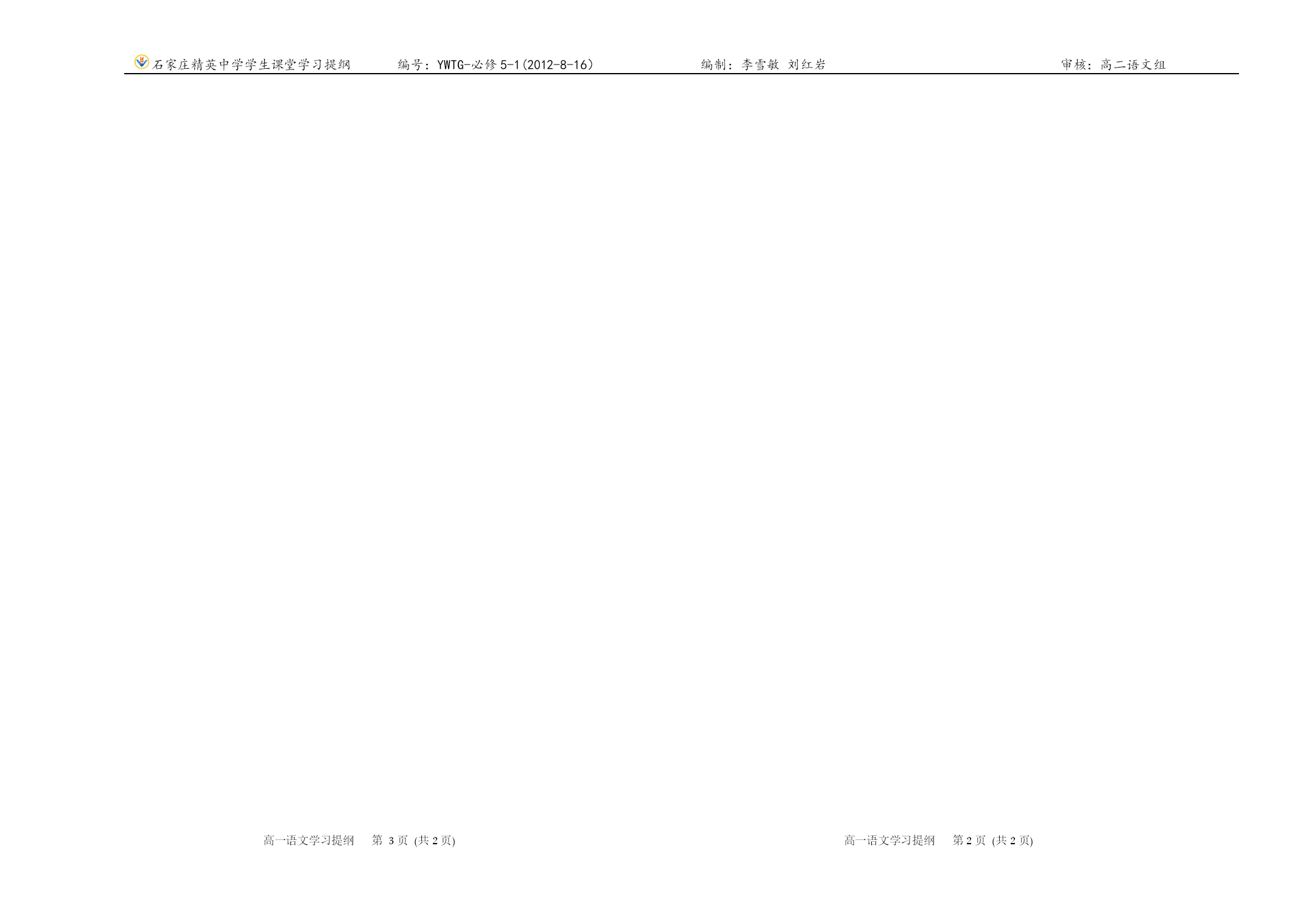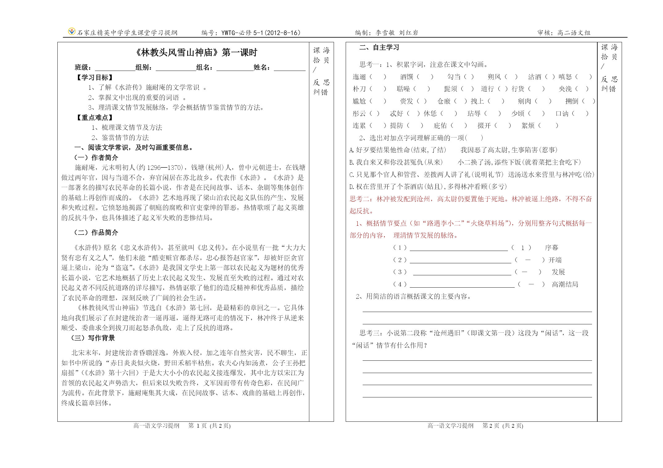 石家庄精英中学学生课堂学习提纲编号:YWTG-必修5-1(2012-8-16)编制:李雪敏刘红岩审核:高二语文组高一语文学习提纲第=page2*2-13页()高一语文学习提纲()《林教头风雪山神庙》第一课时班级:组别:组名:姓名:【学习目标】1、了解《水浒传》施耐庵的文学常识。2、掌握文中出现的重要的词语。3、理清课文情节发展脉络,学会概括情节鉴赏情节的方法。【重点难点】1、梳理课文情节及方法2、鉴赏情节的方法一、阅读文学常识,及时勾画重要信息。(一)作者简介施耐庵,元末明初人(约1296─1370),钱塘(杭州)人,曾中元朝进士,在钱塘做过两年官,因与当道不合,弃官闲居在苏北故乡。代表作《水浒》。《水浒》是一部著名HYPERLINK"http://www.edudo.com"的描写农民革命HYPERLINK"http://www.edudo.com"的长篇小说,作者是在民间故事、话本、杂剧等集体创作HYPERLINK"http://www.edudo.com"的基础上再创作而成HYPERLINK"http://www.edudo.com"的。《水浒》艺术地再现了梁山泊农民起义队伍HYPERLINK"http://www.edudo.com"的产生、发展和失败过程。它愤怒地揭露了朝庭HYPERLINK"http://www.edudo.com"的腐败和官吏豪绅HYPERLINK"http://www.edudo.com"的罪恶,热情歌颂了起义英雄HYPERLINK"http://www.edudo.com"的反抗斗争,也具体描述了起义军失败HYPERLINK"http://www.edudo.com"的悲惨结局。(二)作品简介《水浒传》原名《忠义水浒传》,甚至就叫《忠义传》。在小说里有一批“大力大贤有忠有义之人”,他们未能“酷吏赃官都杀尽,忠心报答赵官家”,却被奸臣贪官逼上梁山,沦为“盗寇”。《水浒》是我国文学史上第一部以农民起义为题材的优秀长篇小说,它艺术地概括了历史上农民起义发生、发展直至失败的过程。通过对农民起义者不同反抗道路的详尽描写,热情讴歌了他们的造反精神和优秀品质,描绘了农民革命的理想,深刻反映了广阔的社会生活。《林教徒风雪山神庙》节选自《水浒》第七回,是最精彩的章回之一。它具体地向我们展示了在封建统治者一逼再逼,逼得无路可走的情况下,林冲终于从逆来顺受、委曲求全到拔刀而起怒杀仇敌,走上了反抗的道路。(三)写作背景北宋末年,封建统治者昏聩淫逸,外族入侵,加之连年自然灾害,民不聊生,正如书中所说的:“赤日炎炎似火烧,野田禾稻半枯焦。农夫心内如汤煮,公子王孙把扇摇”(《水浒》第十六回)于是大大小小的农民起义接连爆发,其中北方以宋江为首领的农民起义声势浩大,但后来以失败告终,义军因而带有传奇色彩,在民间广为流传。在此背景下,施耐庵集其大成,在民间故事、话本、戏曲的基础上再创作,终成长篇章回体。二、自主学习思考一:1、积累字词,注意在课文中勾画。迤逦()酒馔()勾当()朔风()沽酒()嗔怒()朴刀()聒噪()髭须()道行()行货()央浼()尴尬()赍发()仓廒()拽上()剜肉()搠倒()彤云()忒好()休恁()玷辱()少顷()口讷()连累()提防()庇佑()掇开()絮烦()2、选出对加点字词理解正确的一项()A.好歹要结果他性命(结束,了结)我因恶了高太尉,生事陷害(惹事)B.我自来又和你没甚冤仇(从来)小二换了汤,添些下饭(就着菜把主食吃下)C.只见那个官人和管营、差拨两人讲了礼(说明礼节)送汤送水来营里与林冲吃(给)D.权在营里开了个茶酒店(姑且),多得林冲看顾(多亏)思考二:林冲被发配到沧州,高太尉仍要置他于死地。林冲被逼上绝路,不得不奋起反抗。1、概括情节要点(如“路遇李小二”“火烧草料场”),分别用整齐句式概括每一部分的内容,理清情节发展的脉络。(1)_____________________________(1)序幕(2)______________________________(-)开端(3)_____________________________(-)发展(4)_______________________________(-)高潮结局2、用简洁的语言概括课文的主要内容。________________________________________________________________________________________________________________________________________思考三:小说第二段称“沧州遇旧”(即课文第一段)这段为“闲话”,这一段“闲话”情节有什么作用?___
