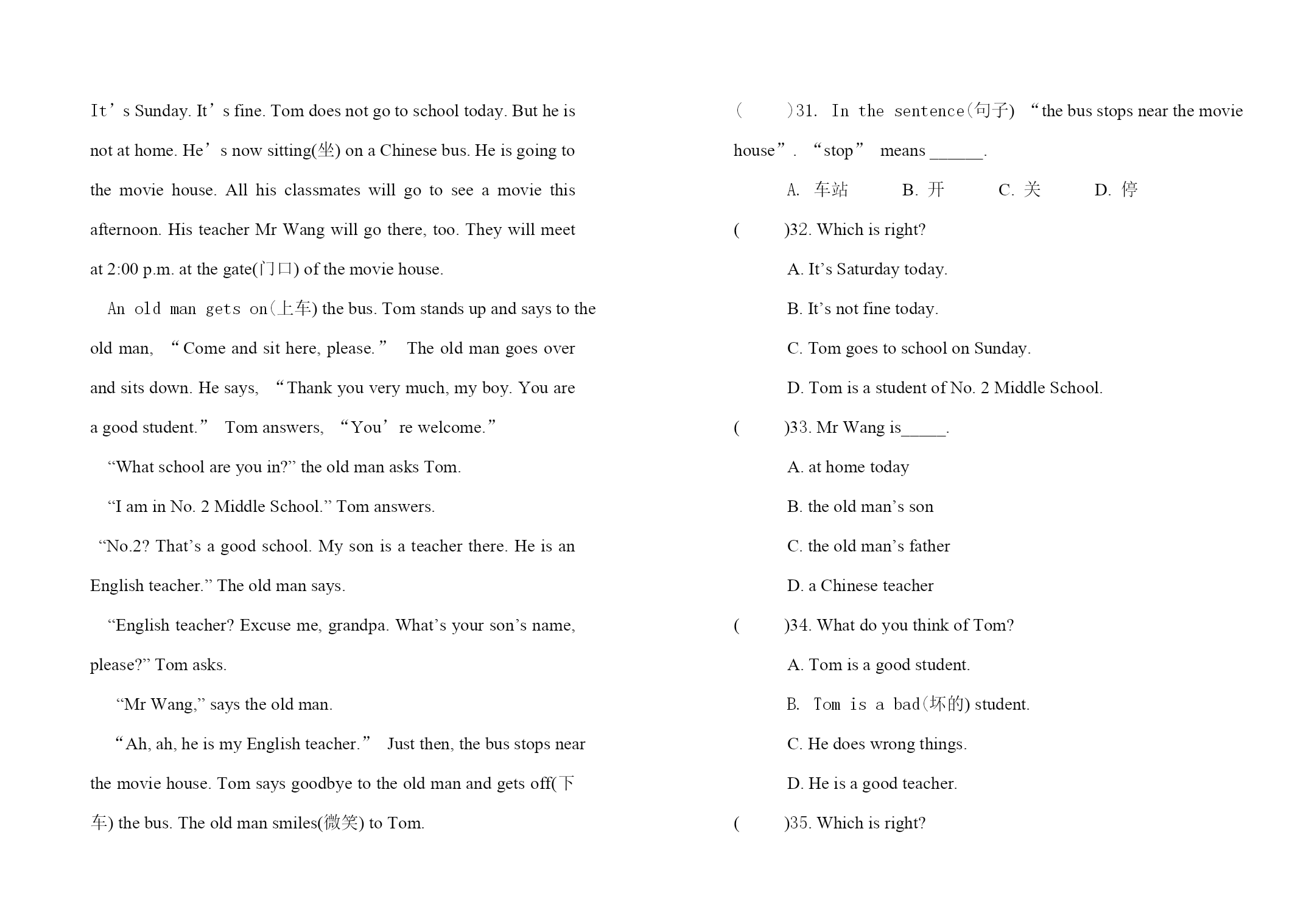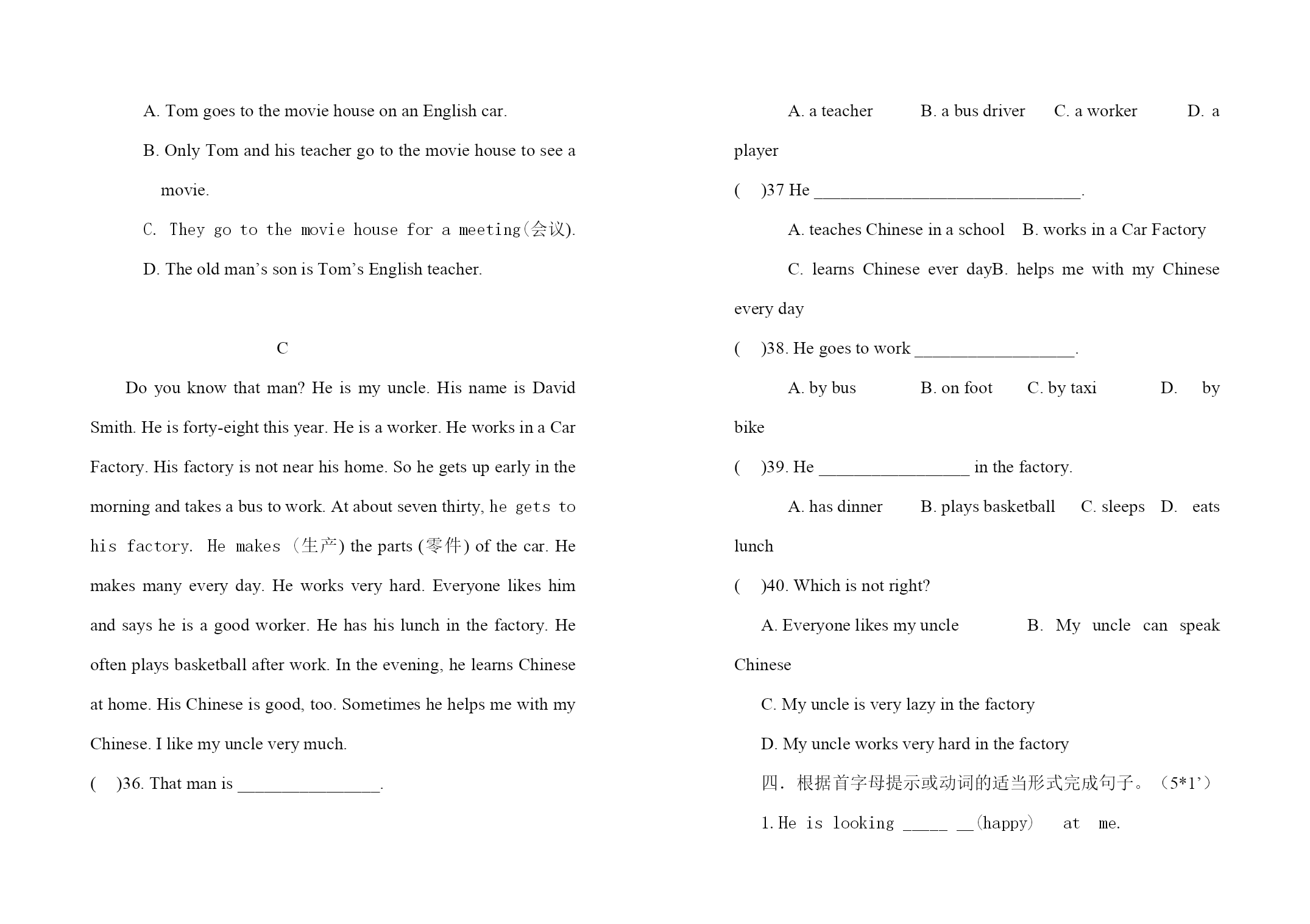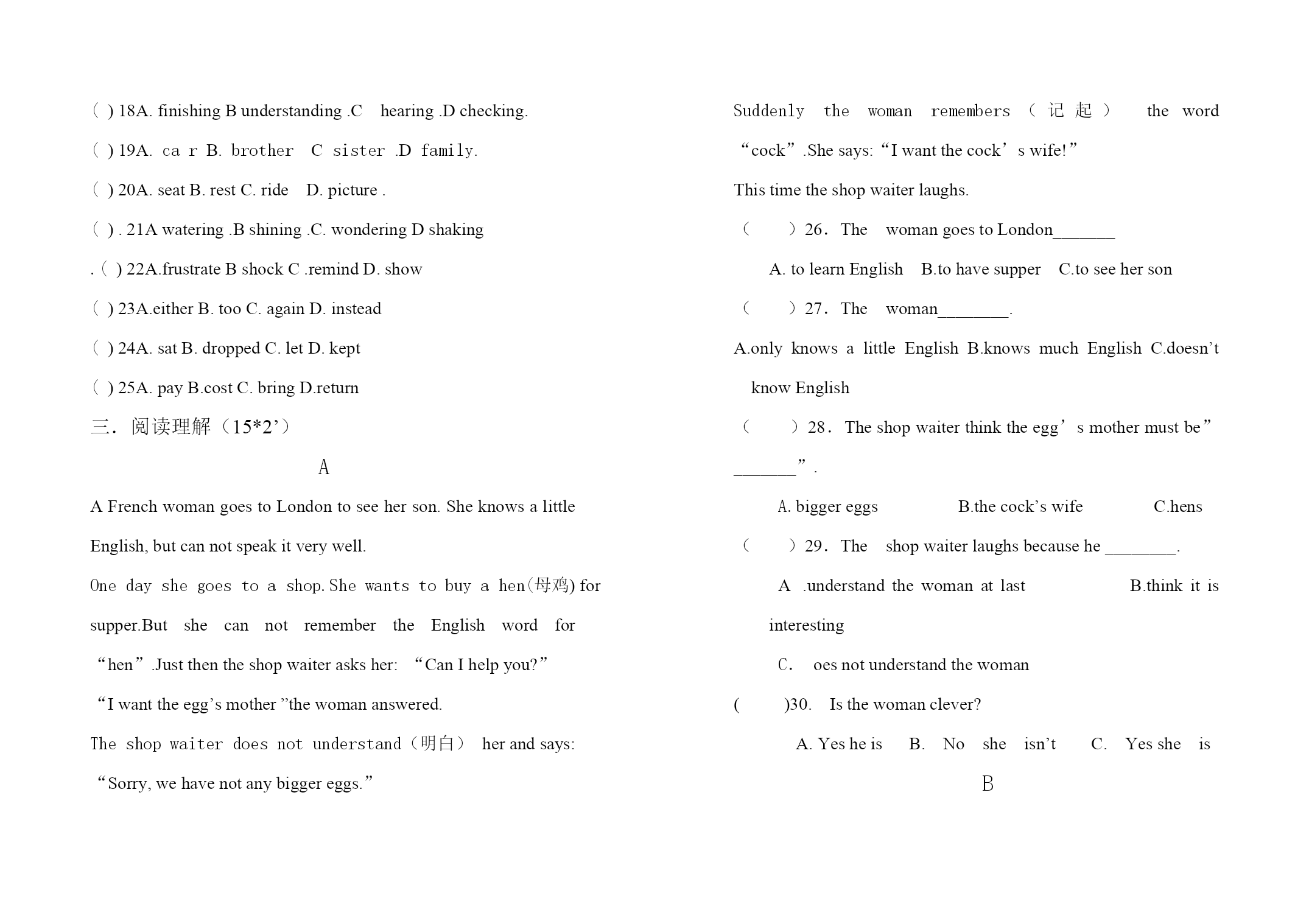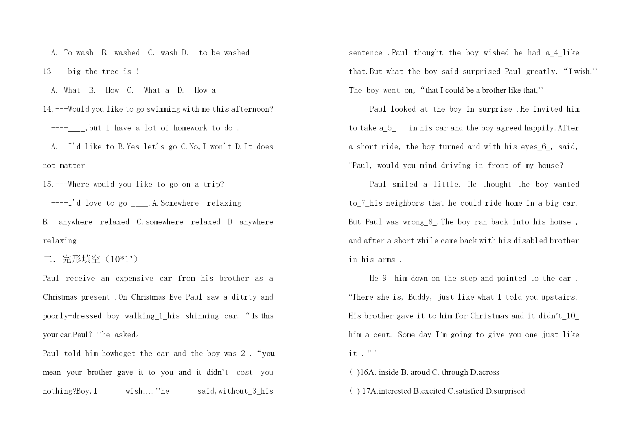 八年级英语水平测试一单项选择(15*1’)1.---Doyouknow___ladyinblue?---Yes,sheisateacherofauniversity.A.theB.aC.anD./2.---Wouldyouliketoplaybasketballwithus?---Yes,I'dliketo.___I'mafraidIhavenotimeA.SoBBut.COr.DAnd3.----Canyouhearme?----No,Icannot..Wouldyoupleasespeak___?A.clealyenoughBclearenough.C.enoughclearD.enoughclearly4.---Howsoonwillyourfatherbeback?----____twoweeks.A.ForB.InC.OrD.Since5.Wehadameeting___theendoflastmonthA.atB.inCby.Dto6.ThemovieBatmanandJokerisonethatI'veeverseenA.moreexcitingB.moreexcitedC.themostexcitingD.themostexcited7.Wewilltryourbesttodotheworkwith__moneyand___peopleA,.fewlittleB.afewalittleC.lessfewerD.fewerless8.Thoughthefamousdancerisdeaf,shedances___mostofthepeopleA.asgoodasBaswellas.Cbestamong.D.betterthan9.___themorningofMarch31,shemadeanimportantdecisionA.OnB.AtC.InD.Of10.It'simportant___thepianowellA.ofhimtoplayB.forhimtoplayC.OfhimplayingD.forhimplaying.11.Colourcanchangeourmoodsandmakeus___happyorsad,energetic,sleepy.A.tofeelB.FeelingC.FeltD.Feel12..---Shoppingwithme?----Sorry,Ihavealotofclothes____A.TowashB.washedC.washD.tobewashed13____bigthetreeis!A.WhatB.HowC.WhataD.Howa14.---Wouldyouliketogoswimmingwithmethisafternoon?----____,butIhavealotofhomeworktodo.A.I'dliketoB.Yeslet'sgoC.No,Iwon'tD.Itdoesnotmatter15.---Wherewouldyouliketogoonatrip?----I'dlovetogo____.A.SomewhererelaxingB.anywhererelaxedC.somewhererelaxedDanywhererelaxing二.完形填空(10*1’)PaulreceiveanexpensivecarfromhisbrotherasaChristmaspresent.OnChristmasEvePaulsawaditrtyandpoorly-dressedboywalking_1_hisshinningcar.“Isthisyourcar,Paul?’’heasked。Paultoldhimhowhegetthecarandtheboywas_2_.“youmeanyourbrothergaveittoyouanditdidn’tcostyounothing?Boy,Iwish….’’hesaid,without_3_hissentence.Paulthoughttheboywishedhehada_4_likethat.ButwhattheboysaidsurprisedPaulgreatly.“Iwish.’’Theboywenton,“thatIcouldbeabrotherlikethat,’’Paullookedattheboyinsurprise.Heinvitedhimtotakea_5_inhiscarandtheboyagreedhappily.Afterashortride,theboyturnedandwithhiseyes_6_,said,“Paul,wouldyouminddrivinginfrontofmyhouse?Pa