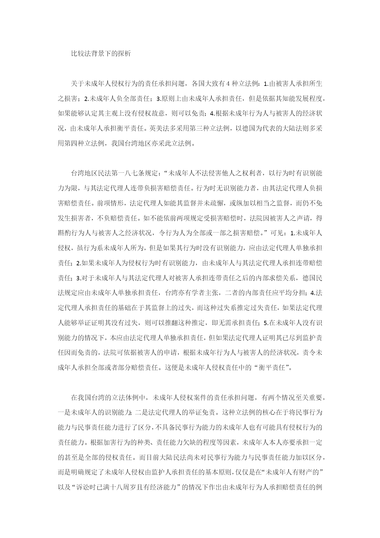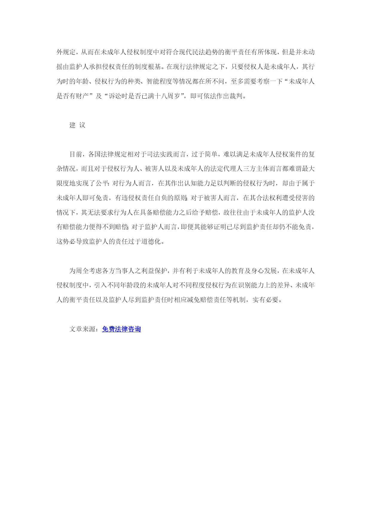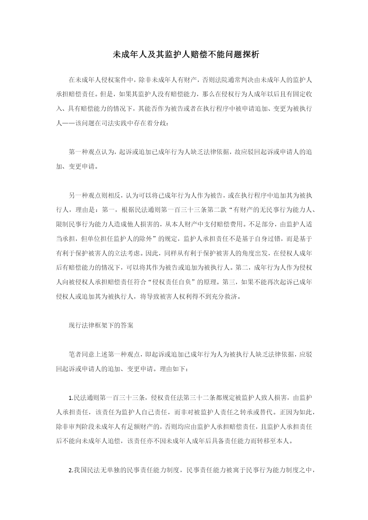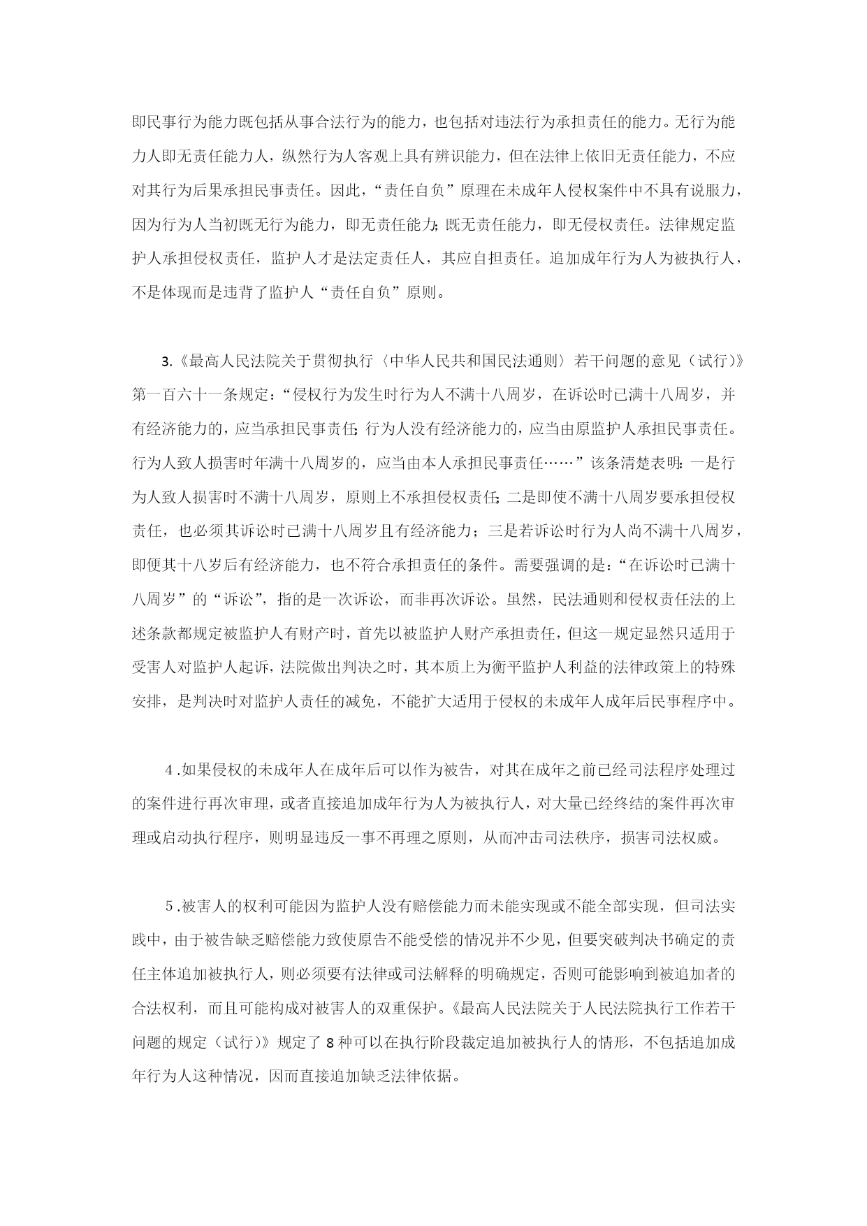 未成年人及其监护人赔偿不能问题探析在未成年人侵权案件中,除非未成年人有财产,否则法院通常判决由未成年人的监护人承担赔偿责任。但是,如果其监护人没有赔偿能力,那么在侵权行为人成年以后且有固定收入、具有赔偿能力的情况下,其能否作为被告或者在执行程序中被申请追加、变更为被执行人——该问题在司法实践中存在着分歧:第一种观点认为,起诉或追加已成年行为人缺乏法律依据,故应驳回起诉或申请人的追加、变更申请。另一种观点则相反,认为可以将已成年行为人作为被告,或在执行程序中追加其为被执行人,理由是:第一,根据民法通则第一百三十三条第二款“有财产的无民事行为能力人、限制民事行为能力人造成他人损害的,从本人财产中支付赔偿费用。不足部分,由监护人适当承担,但单位担任监护人的除外”的规定,监护人承担责任不是基于自身过错,而是基于有利于保护被害人的立法考虑。因此,同样从有利于保护被害人的角度出发,在侵权人成年后有赔偿能力的情况下,可以将其作为被告或追加为被执行人。第二,成年行为人作为侵权人向被侵权人承担赔偿责任符合“侵权责任自负”的原理。第三,如果不能再次起诉已成年侵权人或追加其为被执行人,将导致被害人权利得不到充分救济。现行法律框架下的答案笔者同意上述第一种观点,即起诉或追加已成年行为人为被执行人缺乏法律依据,应驳回起诉或申请人的追加、变更申请。理由如下:1.民法通则第一百三十三条,侵权责任法第三十二条都规定被监护人致人损害,由监护人承担责任,该责任为监护人自己责任,而非对被监护人责任之转承或替代。正因为如此,除非审判阶段未成年人有足额财产的,否则均应由监护人承担赔偿责任,且监护人承担责任后不能向未成年人追偿,该责任亦不因未成年人成年后具备责任能力而转移至本人。2.我国民法无单独的民事责任能力制度,民事责任能力被寓于民事行为能力制度之中,即民事行为能力既包括从事合法行为的能力,也包括对违法行为承担责任的能力。无行为能力人即无责任能力人,纵然行为人客观上具有辨识能力,但在法律上依旧无责任能力,不应对其行为后果承担民事责任。因此,“责任自负”原理在未成年人侵权案件中不具有说服力,因为行为人当初既无行为能力,即无责任能力;既无责任能力,即无侵权责任。法律规定监护人承担侵权责任,监护人才是法定责任人,其应自担责任。追加成年行为人为被执行人,不是体现而是违背了监护人“责任自负”原则。3.《最高人民法院关于贯彻执行〈中华人民共和国民法通则〉若干问题的意见(试行)》第一百六十一条规定:“侵权行为发生时行为人不满十八周岁,在诉讼时已满十八周岁,并有经济能力的,应当承担民事责任;行为人没有经济能力的,应当由原监护人承担民事责任。行为人致人损害时年满十八周岁的,应当由本人承担民事责任……”该条清楚表明:一是行为人致人损害时不满十八周岁,原则上不承担侵权责任;二是即使不满十八周岁要承担侵权责任,也必须其诉讼时已满十八周岁且有经济能力;三是若诉讼时行为人尚不满十八周岁,即便其十八岁后有经济能力,也不符合承担责任的条件。需要强调的是:“在诉讼时已满十八周岁”的“诉讼”,指的是一次诉讼,而非再次诉讼。虽然,民法通则和侵权责任法的上述条款都规定被监护人有财产时,首先以被监护人财产承担责任,但这一规定显然只适用于受害人对监护人起诉,法院做出判决之时,其本质上为衡平监护人利益的法律政策上的特殊安排,是判决时对监护人责任的减免,不能扩大适用于侵权的未成年人成年后民事程序中。4.如果侵权的未成年人在成年后可以作为被告,对其在成年之前已经司法程序处理过的案件进行再次审理,或者直接追加成年行为人为被执行人,对大量已经终结的案件再次审理或启动执行程序,则明显违反一事不再理之原则,从而冲击司法秩序,损害司法权威。5.被害人的权利可能因为监护人没有赔偿能力而未能实现或不能全部实现,但司法实践中,由于被告缺乏赔偿能力致使原告不能受偿的情况并不少见,但要突破判决书确定的责任主体追加被执行人,则必须要有法律或司法解释的明确规定,否则可能影响到被追加者的合法权利,而且可能构成对被害人的双重保护。《最高人民法院关于人民法院执行工作若干问题的规定(试行)》规定了8种可以在执行阶段裁定追加被执行人的情形,不包括追加成年行为人这种情况,因而直接追加缺乏法律依据。比较法背景下的探析关于未成年人侵权行为的责任承担问题,各国大致有4种立法例:1.由被害人承担所生之损害;2.未成年人负全部责任;3.原则上由未成年人承担责任,但是依据其知能发展程度,如果能够认定其主观上没有侵权故意,则可以免责;4.根据未成年行为人与被害人的经济状况,由未成年人承担衡平责任。英美法多采用第三种立法例,以德国为代表的大陆法则多采用第四种立法例,我国台湾地区亦采此立法例。台湾地区民法第一八七条规定:“未成年人不法侵害他人之权利者,以行为时有识别能