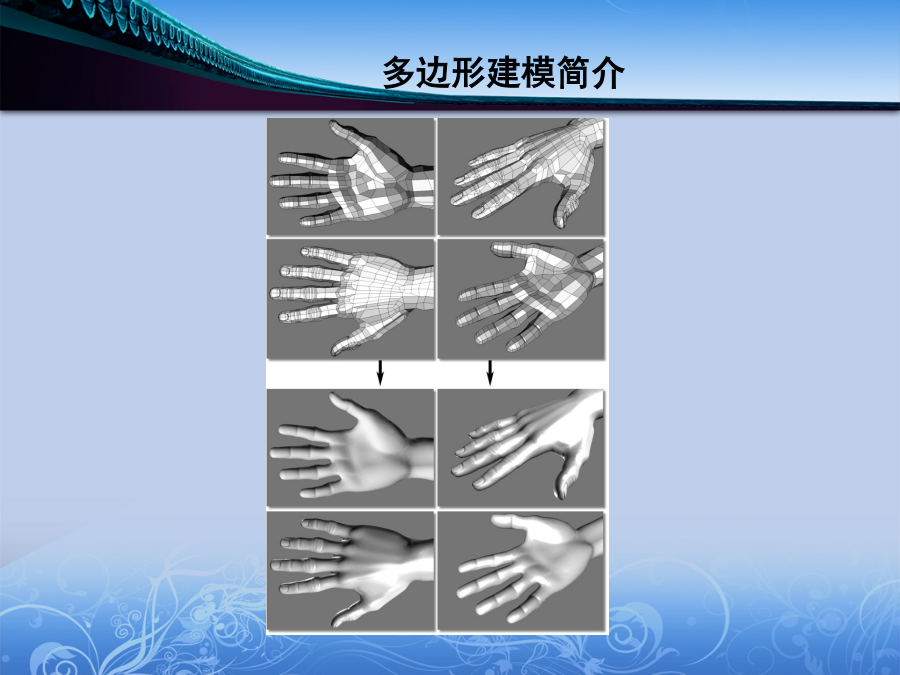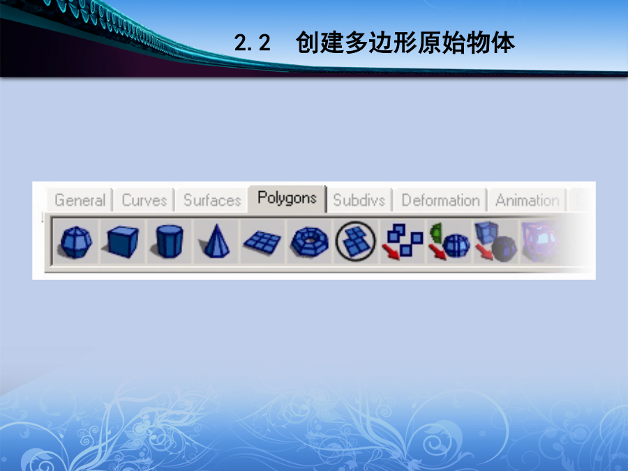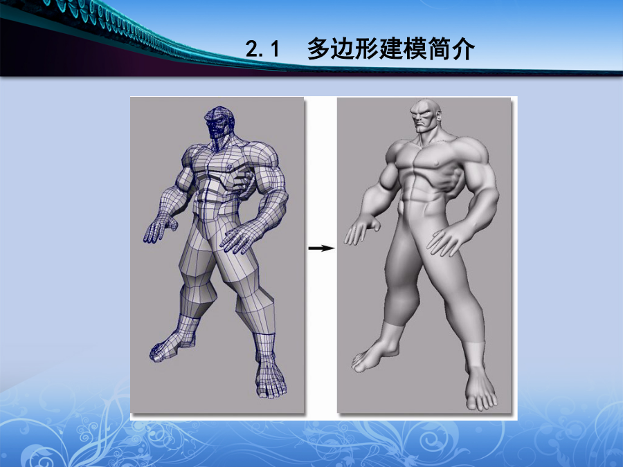《MAYA动画设计》模型部分第二章2.1多边形建模简介多边形建模简介2.2创建多边形原始物体创建球体创建立方体创建圆柱体创建圆锥体创建多边形平面物体创建圆环体2.3多边形物体表面元素的基本编辑方法2.4多边形的创建、组合以及建模辅助工具CreatePolygonTool/AppendtoPolygonTool创建多边形工具和多边形添加工具Transfer传递工具Booleans布尔运算MirrorGeometry镜像几何体工具MirrorCut镜像切割Smooth光滑多边形SmoothProxy多边形光滑代理AverageVertices均化点命令Triangulate三角化命令Quadrangulate四边化命令Cleanup清除PaintReduceWeightsTool喷涂精简权重工具ToolOptions工具配置选项2.5编辑多边形工具Subdivide细分多边形命令SplitPolygonTool劈割多边形工具ExtrudeFace挤压面命令ExtrudeEdge挤压边命令ExtrudeVertex挤压点命令ChamferVertex导角点命令Bevel导角边命令CutFacesTool切割面工具PokeFaces刺破面命令WedgeFaces楔形面命令MergeVertices合并点命令MergeMultipleEdges合并多重边命令MergeEdgeTool合并边工具SplitVertex分割点命令FlipTriangleEdge翻转三角形边命令Collapse塌陷命令DeleteVertex删除点命令DuplicateFace复制面命令Extract提取面命令MakeHoleTool创建洞工具FillHole填洞命令Selection选择命令组Colors颜色处理命令组Normals法线修改命令组MoveComponent移动元素工具2.6创建卡通男孩引入参考图调整立方体得到头部的大体轮廓挤压出眼睛和嘴制作鼻子细化眼睛和鼻子,增加耳朵创建身体调整出整体裤子的形状制作鞋子制作手掌最终完成卡通男孩的创建