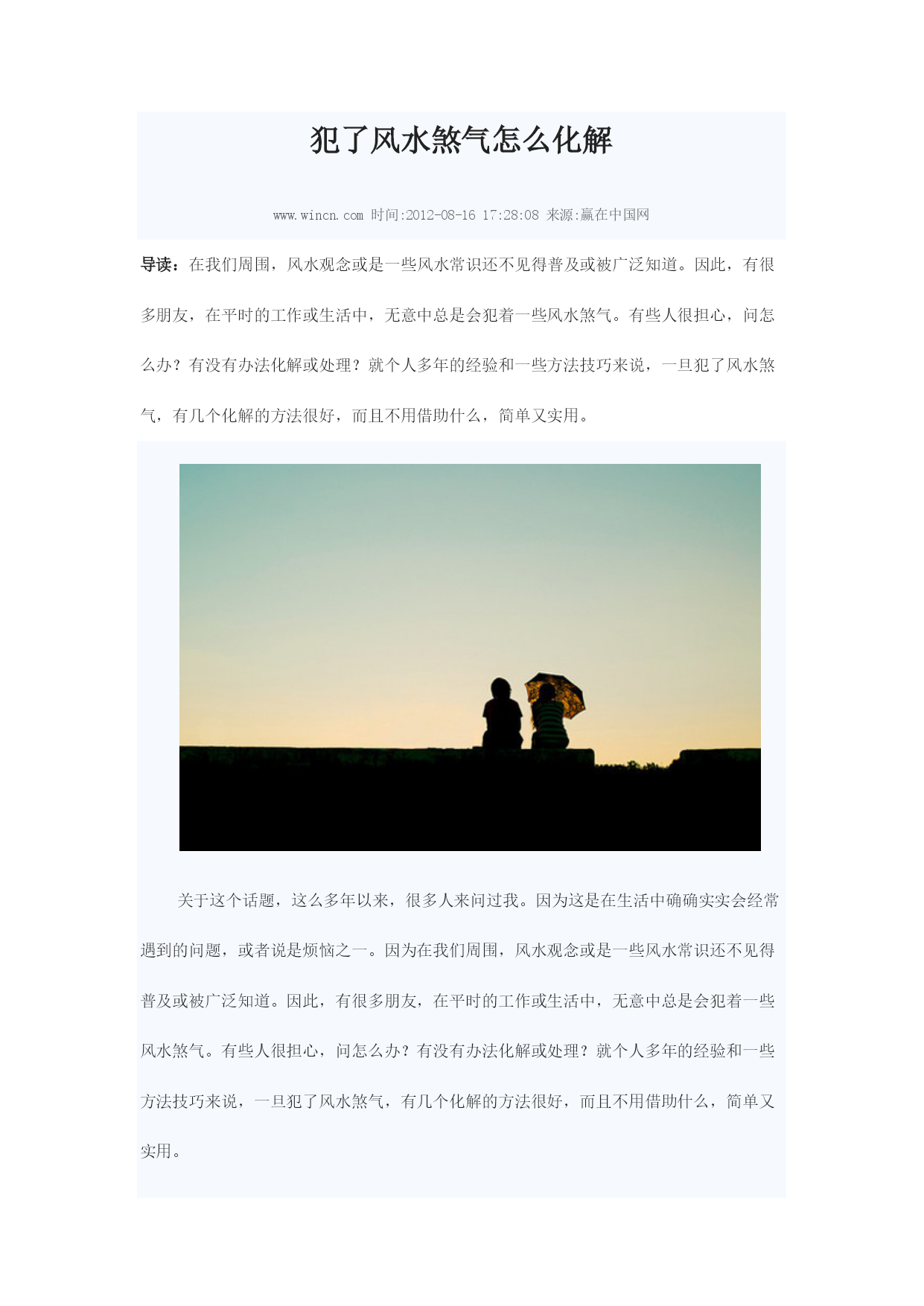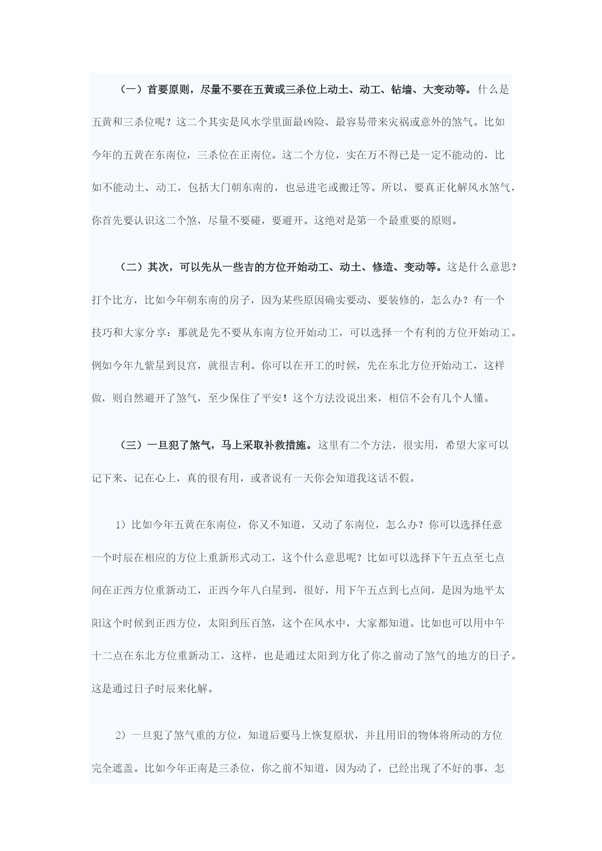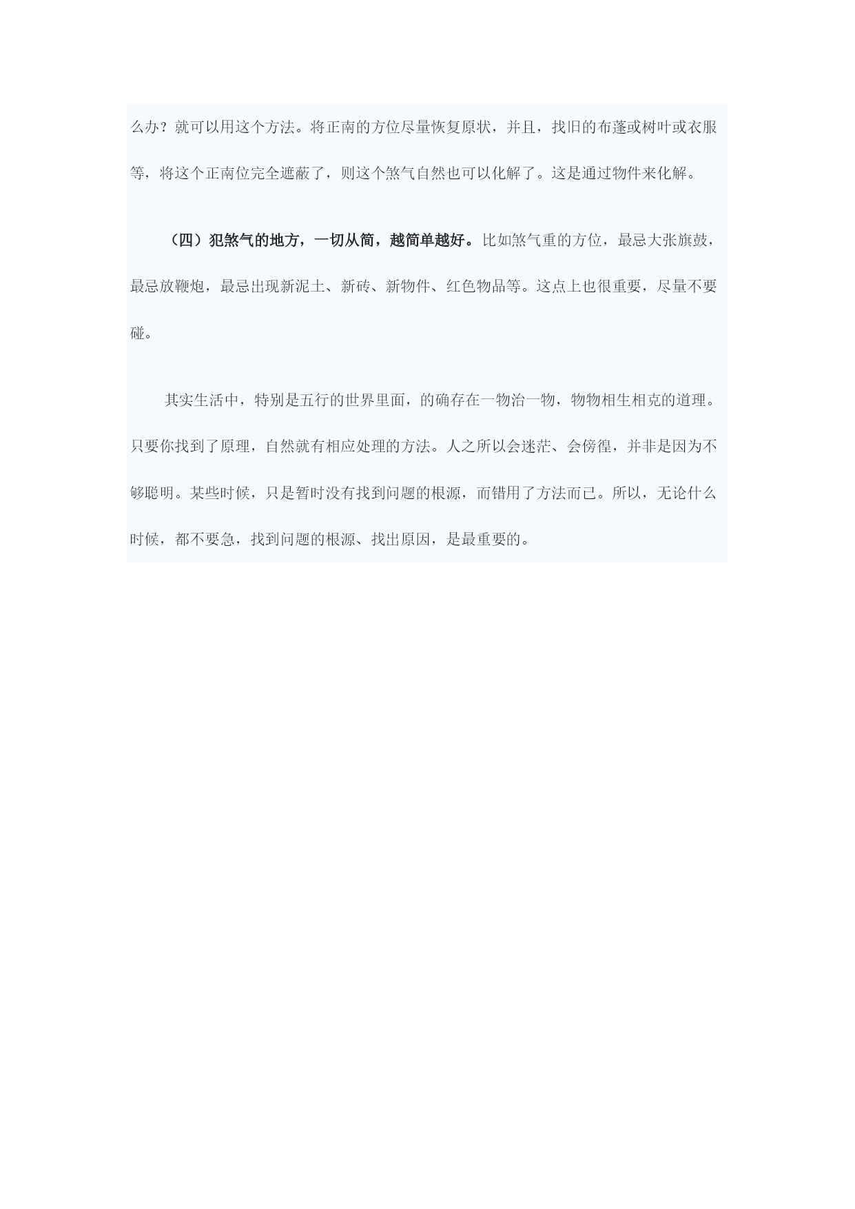 犯了风水煞气怎么化解HYPERLINK"http://www.wincn.com/"www.wincn.com时间:2012-08-1617:28:08来源:赢在中国网导读:在我们周围,风水观念或是一些风水常识还不见得普及或被广泛知道。因此,有很多朋友,在平时的工作或生活中,无意中总是会犯着一些风水煞气。有些人很担心,问怎么办?有没有办法化解或处理?就个人多年的经验和一些方法技巧来说,一旦犯了风水煞气,有几个化解的方法很好,而且不用借助什么,简单又实用。关于这个话题,这么多年以来,很多人来问过我。因为这是在生活中确确实实会经常遇到的问题,或者说是烦恼之一。因为在我们周围,风水观念或是一些风水常识还不见得普及或被广泛知道。因此,有很多朋友,在平时的工作或生活中,无意中总是会犯着一些风水煞气。有些人很担心,问怎么办?有没有办法化解或处理?就个人多年的经验和一些方法技巧来说,一旦犯了风水煞气,有几个化解的方法很好,而且不用借助什么,简单又实用。(一)首要原则,尽量不要在五黄或三杀位上动土、动工、钻墙、大变动等。什么是五黄和三杀位呢?这二个其实是风水学里面最凶险、最容易带来灾祸或意外的煞气。比如今年的五黄在东南位,三杀位在正南位。这二个方位,实在万不得已是一定不能动的,比如不能动土、动工,包括大门朝东南的,也忌进宅或搬迁等。所以,要真正化解风水煞气,你首先要认识这二个煞,尽量不要碰,要避开。这绝对是第一个最重要的原则。(二)其次,可以先从一些吉的方位开始动工、动土、修造、变动等。这是什么意思?打个比方,比如今年朝东南的房子,因为某些原因确实要动、要装修的,怎么办?有一个技巧和大家分享:那就是先不要从东南方位开始动工,可以选择一个有利的方位开始动工。例如今年九紫星到艮宫,就很吉利。你可以在开工的时候,先在东北方位开始动工,这样做,则自然避开了煞气,至少保住了平安!这个方法没说出来,相信不会有几个人懂。(三)一旦犯了煞气,马上采取补救措施。这里有二个方法,很实用,希望大家可以记下来、记在心上,真的很有用,或者说有一天你会知道我这话不假。1)比如今年五黄在东南位,你又不知道,又动了东南位,怎么办?你可以选择任意一个时辰在相应的方位上重新形式动工,这个什么意思呢?比如可以选择下午五点至七点间在正西方位重新动工,正西今年八白星到,很好,用下午五点到七点间,是因为地平太阳这个时候到正西方位,太阳到压百煞,这个在风水中,大家都知道。比如也可以用中午十二点在东北方位重新动工,这样,也是通过太阳到方化了你之前动了煞气的地方的日子。这是通过日子时辰来化解。2)一旦犯了煞气重的方位,知道后要马上恢复原状,并且用旧的物体将所动的方位完全遮盖。比如今年正南是三杀位,你之前不知道,因为动了,已经出现了不好的事,怎么办?就可以用这个方法。将正南的方位尽量恢复原状,并且,找旧的布蓬或树叶或衣服等,将这个正南位完全遮蔽了,则这个煞气自然也可以化解了。这是通过物件来化解。(四)犯煞气的地方,一切从简,越简单越好。比如煞气重的方位,最忌大张旗鼓,最忌放鞭炮,最忌出现新泥土、新砖、新物件、红色物品等。这点上也很重要,尽量不要碰。其实生活中,特别是五行的世界里面,的确存在一物治一物,物物相生相克的道理。只要你找到了原理,自然就有相应处理的方法。人之所以会迷茫、会傍徨,并非是因为不够聪明。某些时候,只是暂时没有找到问题的根源,而错用了方法而已。所以,无论什么时候,都不要急,找到问题的根源、找出原因,是最重要的。