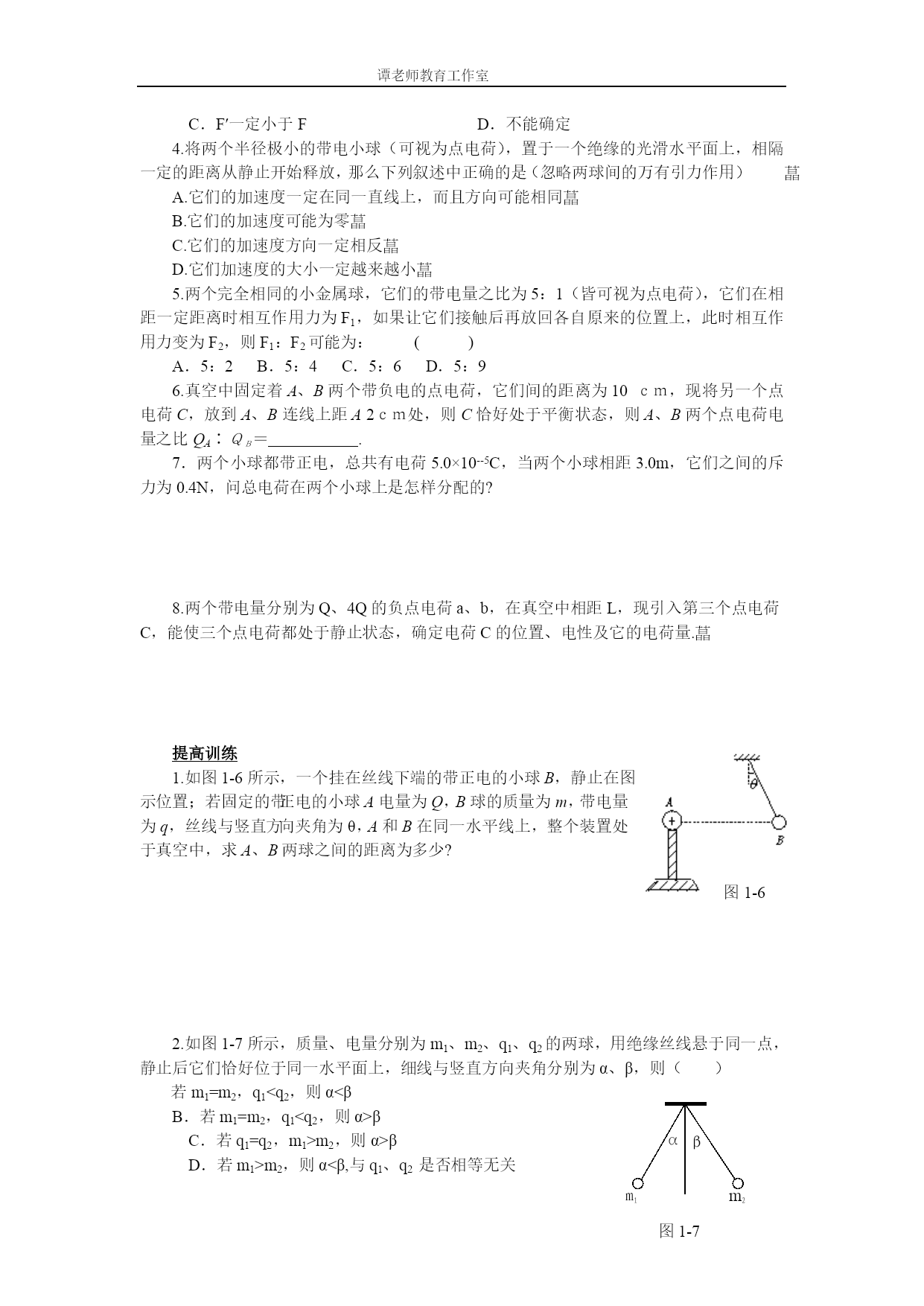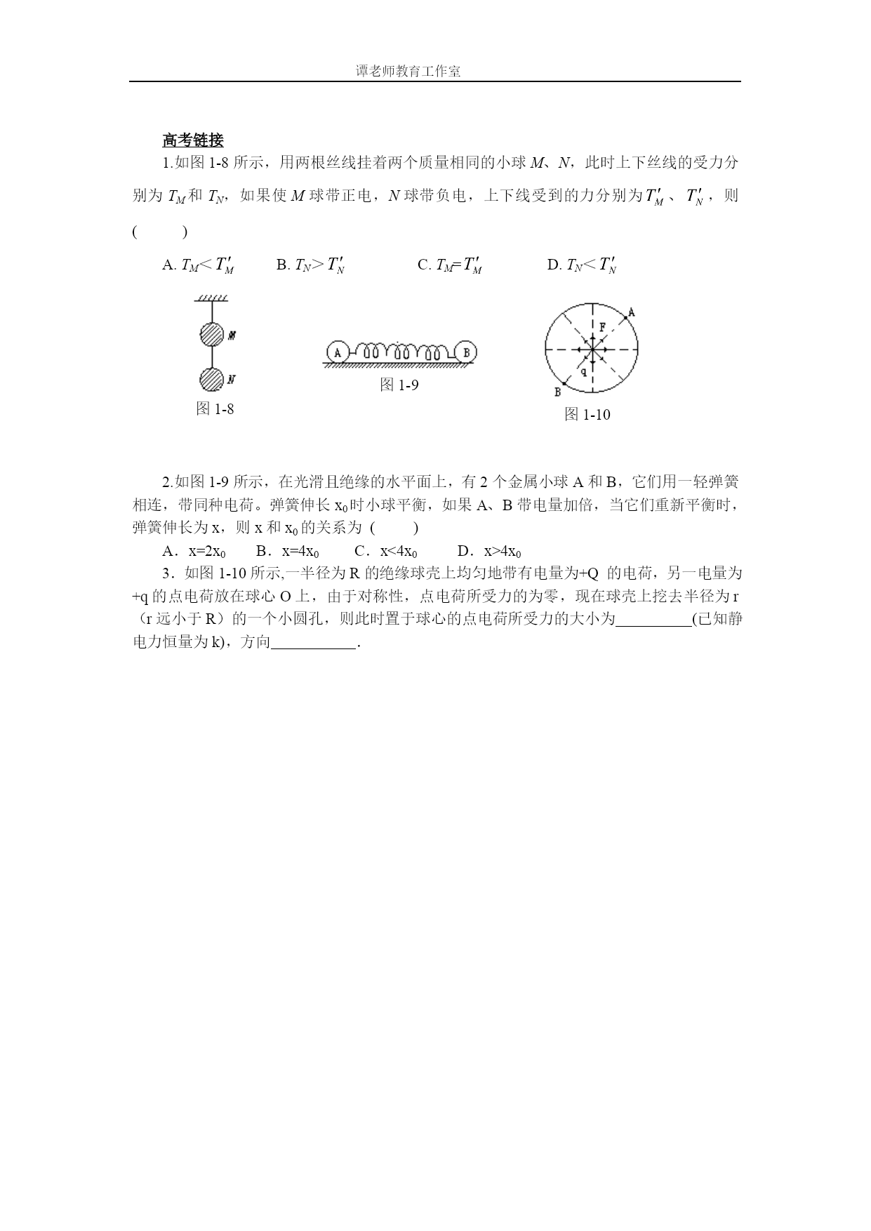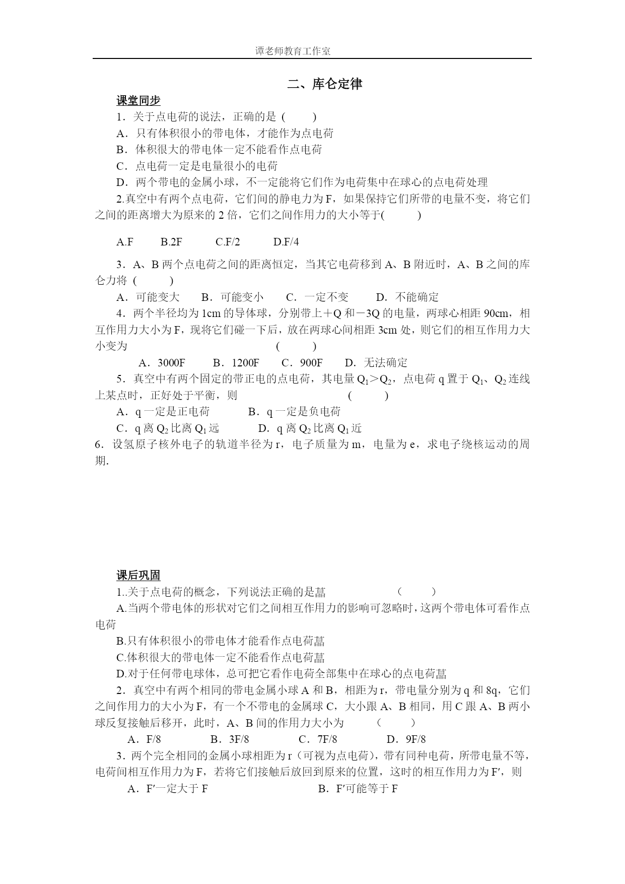 谭老师教育工作室二、库仑定律课堂同步1.关于点电荷的说法,正确的是()A.只有体积很小的带电体,才能作为点电荷B.体积很大的带电体一定不能看作点电荷C.点电荷一定是电量很小的电荷D.两个带电的金属小球,不一定能将它们作为电荷集中在球心的点电荷处理2.真空中有两个点电荷,它们间的静电力为F,如果保持它们所带的电量不变,将它们之间的距离增大为原来的2倍,它们之间作用力的大小等于()A.FB.2FC.F/2D.F/43.A、B两个点电荷之间的距离恒定,当其它电荷移到A、B附近时,A、B之间的库仑力将()A.可能变大B.可能变小C.一定不变D.不能确定4.两个半径均为1cm的导体球,分别带上+Q和-3Q的电量,两球心相距90cm,相互作用力大小为F,现将它们碰一下后,放在两球心间相距3cm处,则它们的相互作用力大小变为()A.3000FB.1200FC.900FD.无法确定5.真空中有两个固定的带正电的点电荷,其电量Q1>Q2,点电荷q置于Q1、Q2连线上某点时,正好处于平衡,则()A.q一定是正电荷B.q一定是负电荷C.q离Q2比离Q1远D.q离Q2比离Q1近6.设氢原子核外电子的轨道半径为r,电子质量为m,电量为e,求电子绕核运动的周期.课后巩固1..关于点电荷的概念,下列说法正确的是()A.当两个带电体的形状对它们之间相互作用力的影响可忽略时,这两个带电体可看作点电荷B.只有体积很小的带电体才能看作点电荷C.体积很大的带电体一定不能看作点电荷D.对于任何带电球体,总可把它看作电荷全部集中在球心的点电荷2.真空中有两个相同的带电金属小球A和B,相距为r,带电量分别为q和8q,它们之间作用力的大小为F,有一个不带电的金属球C,大小跟A、B相同,用C跟A、B两小球反复接触后移开,此时,A、B间的作用力大小为()A.F/8B.3F/8C.7F/8D.9F/83.两个完全相同的金属小球相距为r(可视为点电荷),带有同种电荷,所带电量不等,电荷间相互作用力为F,若将它们接触后放回到原来的位置,这时的相互作用力为F′,则A.F′一定大于FB.F′可能等于FC.F′一定小于FD.不能确定4.将两个半径极小的带电小球(可视为点电荷),置于一个绝缘的光滑水平面上,相隔一定的距离从静止开始释放,那么下列叙述中正确的是(忽略两球间的万有引力作用)A.它们的加速度一定在同一直线上,而且方向可能相同B.它们的加速度可能为零C.它们的加速度方向一定相反D.它们加速度的大小一定越来越小5.两个完全相同的小金属球,它们的带电量之比为5:1(皆可视为点电荷),它们在相距一定距离时相互作用力为F1,如果让它们接触后再放回各自原来的位置上,此时相互作用力变为F2,则F1:F2可能为:()A.5:2B.5:4C.5:6D.5:96.真空中固定着A、B两个带负电的点电荷,它们间的距离为10cm,现将另一个点电荷C,放到A、B连线上距A2cm处,则C恰好处于平衡状态,则A、B两个点电荷电量之比QA∶QB=.7.两个小球都带正电,总共有电荷5.0×10--5C,当两个小球相距3.0m,它们之间的斥力为0.4N,问总电荷在两个小球上是怎样分配的?8.两个带电量分别为Q、4Q的负点电荷a、b,在真空中相距L,现引入第三个点电荷C,能使三个点电荷都处于静止状态,确定电荷C的位置、电性及它的电荷量.图1-6提高训练1.如图1-6所示,一个挂在丝线下端的带正电的小球B,静止在图示位置;若固定的带正电的小球A电量为Q,B球的质量为m,带电量为q,丝线与竖直方向夹角为θ,A和B在同一水平线上,整个装置处于真空中,求A、B两球之间的距离为多少?2.如图1-7所示,质量、电量分别为m1、m2、q1、q2的两球,用绝缘丝线悬于同一点,静止后它们恰好位于同一水平面上,细线与竖直方向夹角分别为α、β,则()m1m2αβ图1-7若m1=m2,q1<q2,则α<βB.若m1=m2,q1<q2,则α>βC.若q1=q2,m1>m2,则α>βD.若m1>m2,则α<β,与q1、q2是否相等无关高考链接1.如图1-8所示,用两根丝线挂着两个质量相同的小球M、N,此时上下丝线的受力分别为TM和TN,如果使M球带正电,N球带负电,上下线受到的力分别为、,则()A.TM<B.TN>C.TM=D.TN<图1-8图1-9图1-102.如图1-9所示,在光滑且绝缘的水平面上,有2个金属小球A和B,它们用一轻弹簧相连,带同种电荷。弹簧伸长x0时小球平衡,如果A、B带电量加倍,当它们重新平衡时,弹簧伸长为x,则x和x0的关系为()A.x=2x0B.x=4x0C.x<4x0D.x>4x03.如图1-10所示,一半径为R的绝缘球壳上均匀地带有电量为+Q的电荷,另一电量为+q的点电荷放在球心O上,由于对称性,点