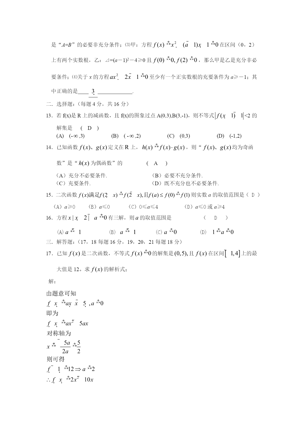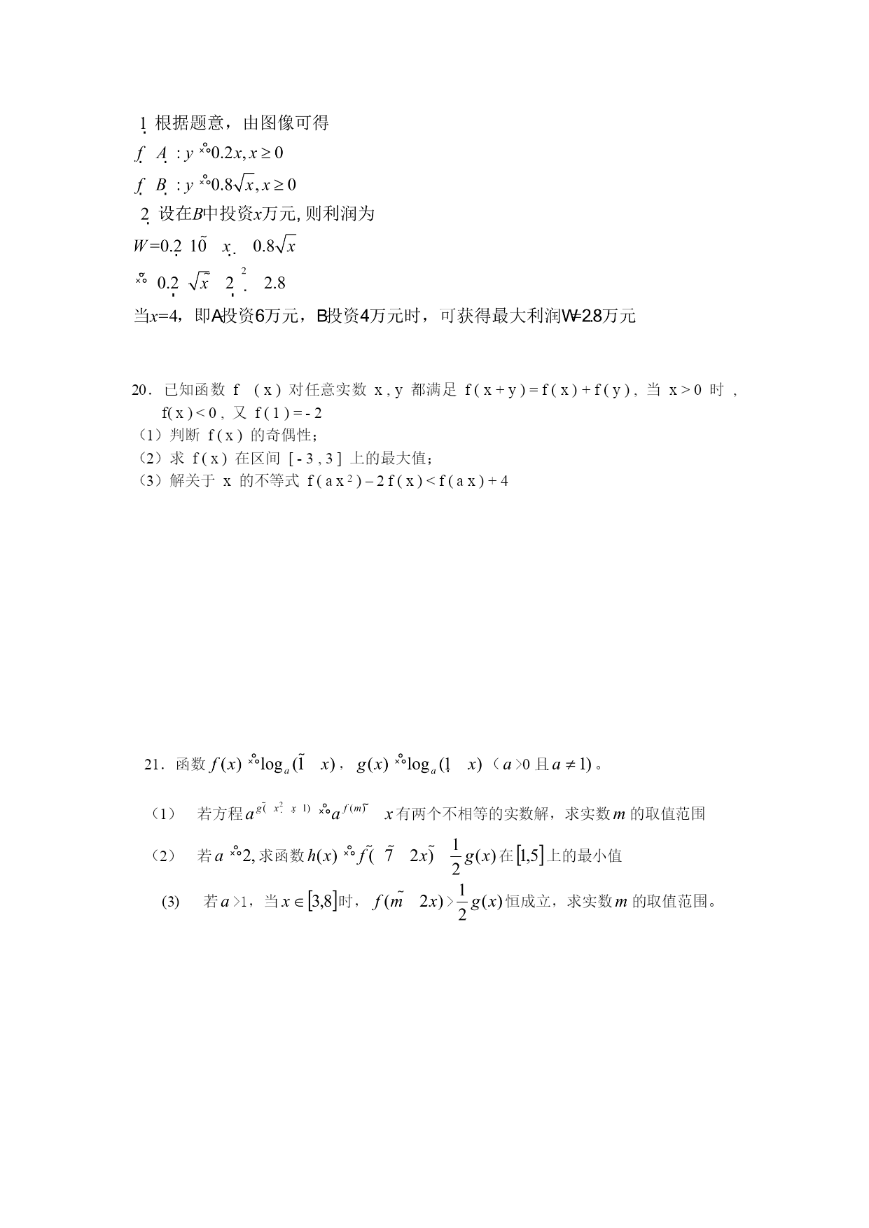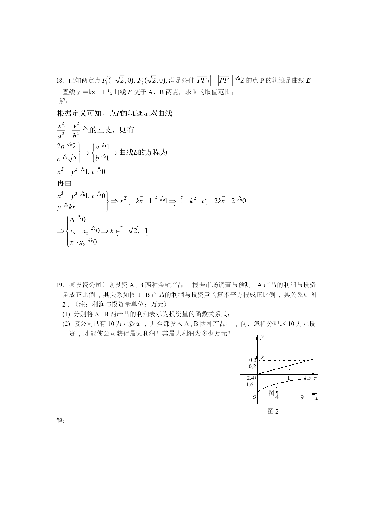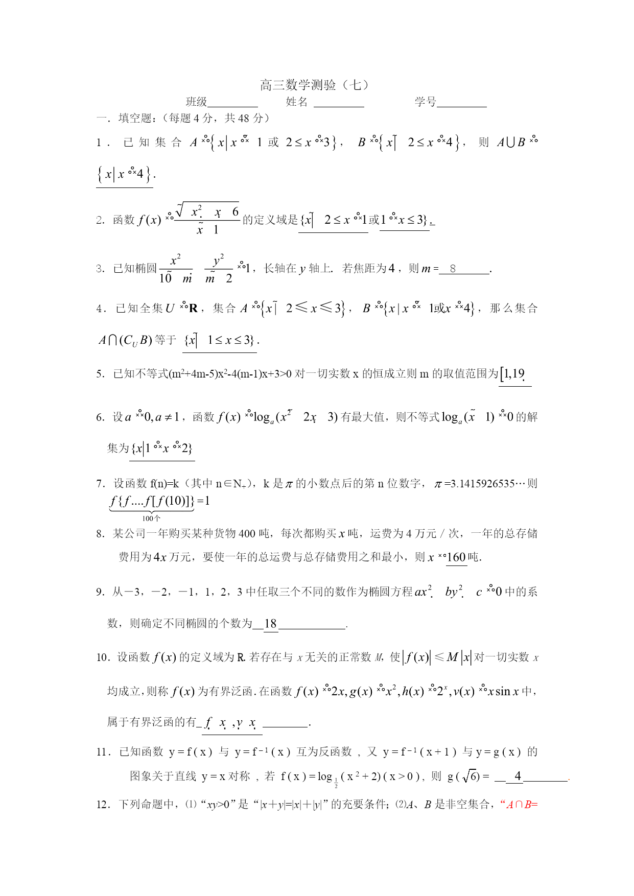 高三数学测验(七) 班级姓名学号 填空题:(每题4分,共48分) 1.已知集合或,,则. 2.函数的定义域是或. 3.已知椭圆,长轴在轴上.若焦距为,则=8. 4.已知全集,集合,,那么集合等于. 5.已知不等式(m2+4m-5)x2-4(m-1)x+3>0对一切实数x的恒成立则m的取值范围为 6.设,函数有最大值,则不等式的解集为 7.设函数f(n)=k(其中n∈N+),k是的小数点后的第n位数字,=3.1415926535…则= 8.某公司一年购买某种货物400吨,每次都购买吨,运费为4万元/次,一年的总存储费用为万元,要使一年的总运费与总存储费用之和最小,则吨. 9.从-3,-2,-1,1,2,3中任取三个不同的数作为椭圆方程中的系数,则确定不同椭圆的个数为. 10.设函数的定义域为R.若存在与x无关的正常数M,使≤对一切实数x均成立,则称为有界泛函.在函数中,属于有界泛函的有. 11.已知函数y=f(x)与y=f–1(x)互为反函数,又y=f–1(x+1)与y=g(x)的图象关于直线y=x对称,若f(x)=log(x2+2)(x>0),则g(eq\r(6))=. 12.下列命题中,⑴“xy>0”是“|x+y|=|x|+|y|”的充要条件;⑵A、B是非空集合,“A∩B=是“A=B”的必要非充分条件;⑶甲:方程在区间(0,2)上有两个实数根,乙:⊿=(a-1)2-4≥0且,那么甲是乙是充分非必要条件;⑷关于x的方程至少有一个正实数根的充要条件为a≥-1;其中正确的是. 选择题:(每题4分,共16分) 13.若f(x)是R上的减函数,且f(x)的图象过点A(0,3),B(3,-1),则不等式<2的解集是(D) (A)(-,3)(B)(-,2)(C)(0,3)(D)(-1,2) 14.已知函数定义在上,,则“均为奇函 数”是“为偶函数”的(A) (A)充分不必要条件.(B)必要不充分条件. (C)充要条件.(D)既不充分也不必要条件. 15.二次函数则实数a的取值范围是(D) (A)a≥0(B)a≤0(C)0≤a≤4(D)a≤0或a≥4 16.方程有三解,则的取值范围是(D) (A)(B)(C)(D) 解答题:(17,18每题16分,19,20,21每题18分) 17.已知是二次函数,不等式的解集是且在区间上的最大值是12。求的解析式; 解: 18.已知两定点满足条件的点P的轨迹是曲线E,直线y=kx-1与曲线E交于A、B两点,求k的取值范围; 解: 19.某投资公司计划投资A,B两种金融产品,根据市场调查与预测,A产品的利润与投资 量成正比例,其关系如图1,B产品的利润与投资量的算术平方根成正比例,其关系如图2,(注:利润与投资量单位:万元) (1)分别将A,B两产品的利润表示为投资量的函数关系式; (2)该公司已有10万元资金,并全部投入A,B两种产品中,问:怎样分配这10万元投 图1 资,才能使公司获得最大利润?其最大利润为多少万元? 图2 解: 20.已知函数f(x)对任意实数x,y都满足f(x+y)=f(x)+f(y),当x>0时,f(x)<0,又f(1)=-2 (1)判断f(x)的奇偶性; (2)求f(x)在区间[-3,3]上的最大值; (3)解关于x的不等式f(ax2)–2f(x)<f(ax)+4 21.函数,(>0且。 若方程有两个不相等的实数解,求实数的取值范围 若求函数在上的最小值 (3)若>1,当时,>恒成立,求实数的取值范围。