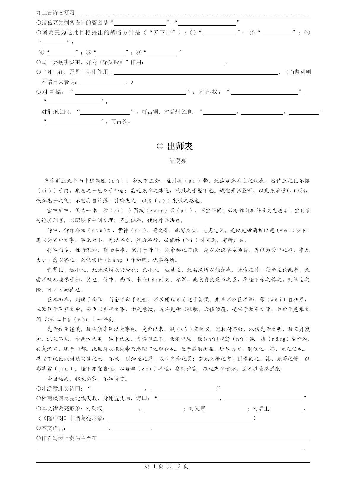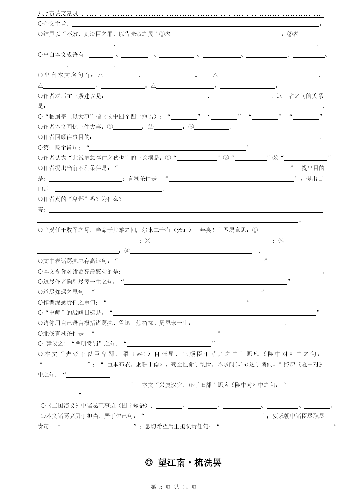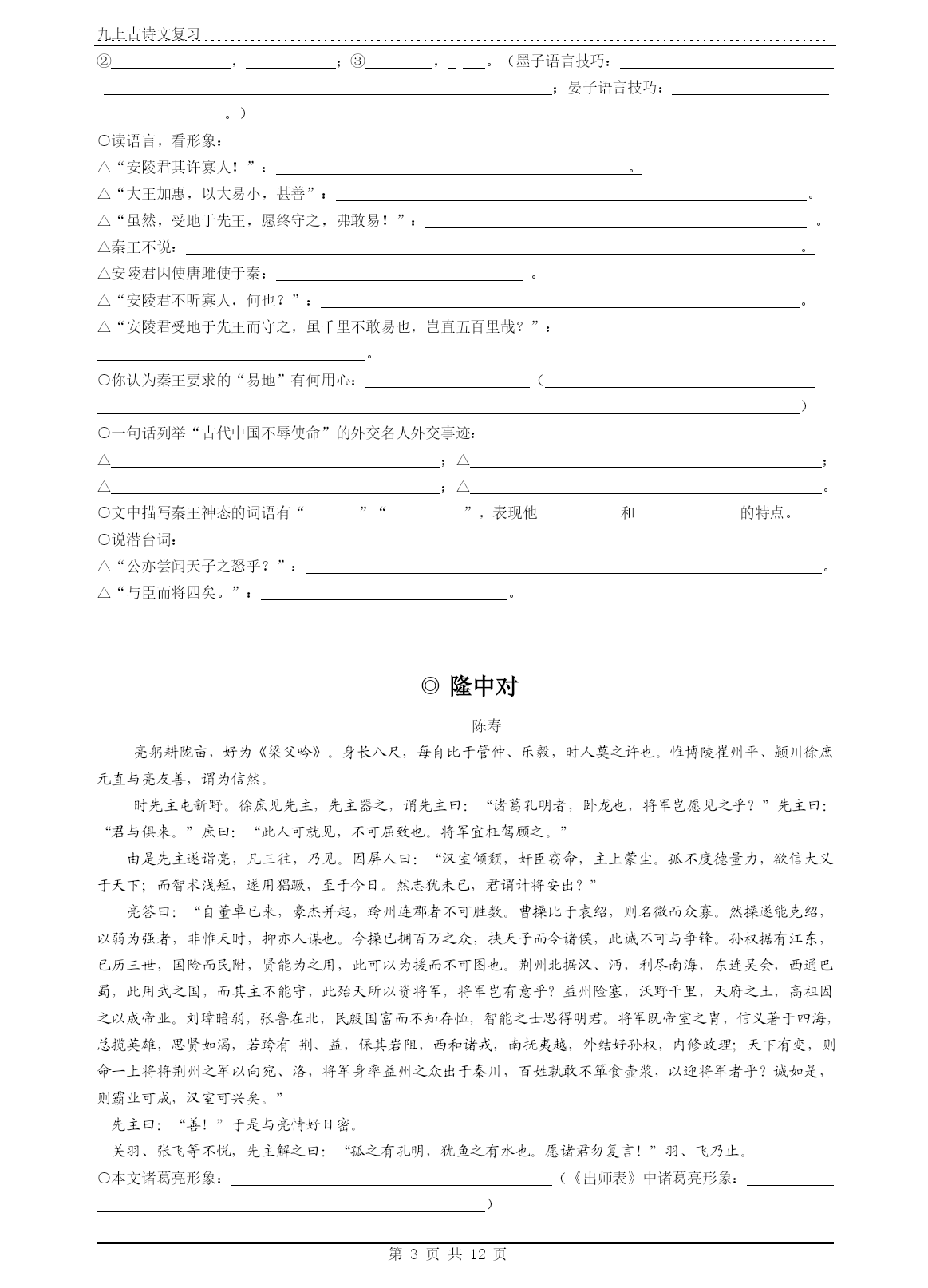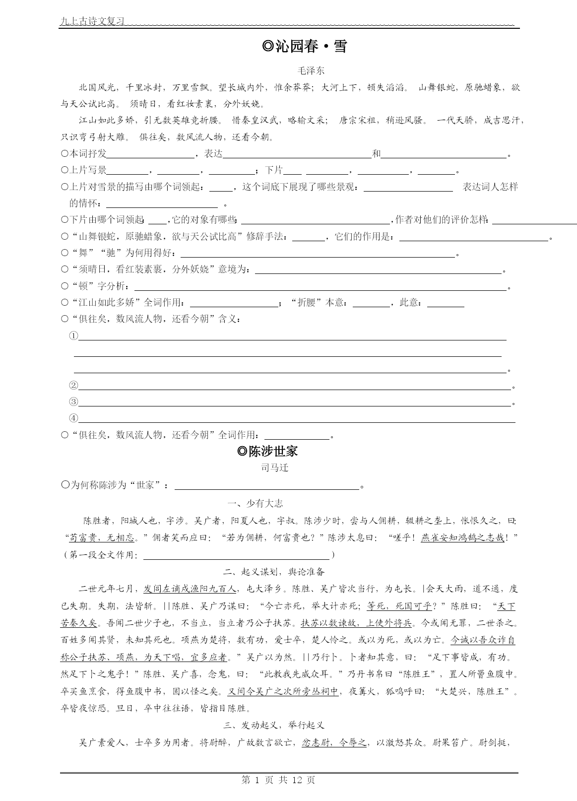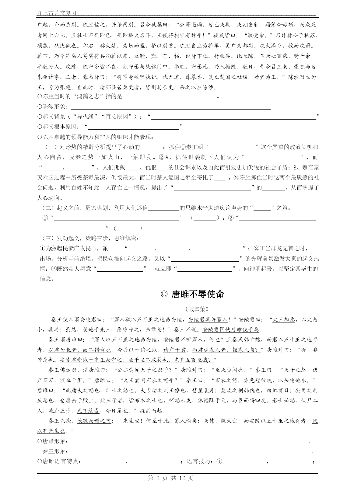 九上古诗文复习第页共NUMPAGES12页◎沁园春·雪毛泽东北国风光,千里冰封,万里雪飘。望长城内外,惟余莽莽;大河上下,顿失滔滔。山舞银蛇,原驰蜡象,欲与天公试比高。须晴日,看红妆素裹,分外妖娆。江山如此多娇,引无数英雄竞折腰。惜秦皇汉武,略输文采;唐宗宋祖,稍逊风骚。一代天骄,成吉思汗,只识弯弓射大雕。俱往矣,数风流人物,还看今朝。○本词抒发,表达和。○上片写景,,;下片,,。○上片对雪景的描写由哪个词领起:,这个词底下展现了哪些景观:表达词人怎样的情怀:。○下片由哪个词领起:,它的对象有哪些:,作者对他们的评价怎样:。○“山舞银蛇,原驰蜡象,欲与天公试比高”修辞手法:,它们的作用是:。○“舞”“驰”为何用得好:。○“须晴日,看红装素裹,分外妖娆”意境为:。○“顿”字分析:。○“江山如此多娇”全词作用:;“折腰”本意:,此意:○“俱往矣,数风流人物,还看今朝”含义:①。②。③。④○“俱往矣,数风流人物,还看今朝”全词作用:。◎陈涉世家司马迁○为何称陈涉为“世家”:。一、少有大志陈胜者,阳城人也,字涉。吴广者,阳夏人也,字叔。陈涉少时,尝与人佣耕,辍耕之垄上,怅恨久之,曰:“苟富贵,无相忘。”佣者笑而应曰:“若为佣耕,何富贵也?”陈涉太息曰:“嗟乎!燕雀安知鸿鹄之志哉!”(第一段全文作用:)二、起义谋划,舆论准备二世元年七月,发闾左谪戍渔阳九百人,屯大泽乡。陈胜、吴广皆次当行,为屯长。|会天大雨,道不通,度已失期。失期,法皆斩。||陈胜、吴广乃谋曰:“今亡亦死,举大计亦死;等死,死国可乎?”陈胜曰:“天下苦秦久矣。吾闻二世少子也,不当立,当立者乃公子扶苏。扶苏以数谏故,上使外将兵。今或闻无罪,二世杀之。百姓多闻其贤,未知其死也。项燕为楚将,数有功,爱士卒,楚人怜之。或以为死,或以为亡。今诚以吾众诈自称公子扶苏、项燕,为天下唱,宜多应者。”吴广以为然。||乃行卜。卜者知其意,曰:“足下事皆成,有功。然足下卜之鬼乎!”陈胜、吴广喜,念鬼,曰:“此教我先威众耳。”乃丹书帛曰“陈胜王”,置人所罾鱼腹中。卒买鱼烹食,得鱼腹中书,固以怪之矣。又间令吴广之次所旁丛祠中,夜篝火,狐鸣呼曰:“大楚兴,陈胜王”。卒皆夜惊恐。旦日,卒中往往语,皆指目陈胜。三、发动起义,举行起义吴广素爱人,士卒多为用者。将尉醉,广故数言欲亡,忿恚尉,令辱之,以激怒其众。尉果笞广。尉剑挺,广起,夺而杀尉。陈胜佐之,并杀两尉。召令徒属曰:“公等遇雨,皆已失期,失期当斩。藉第令毋斩,而戍死者固十六七。且壮士不死即已,死即举大名耳,王侯将相宁有种乎!”徒属皆曰:“敬受命。”乃诈称公子扶苏、项燕,从民欲也。袒右,称大楚。为坛而盟,祭以尉首。陈胜自立为将军,吴广为都尉。攻大泽乡,收而攻蕲。蕲下,乃令符离人葛婴将兵徇蕲以东,攻铚、酂、苦、柘、谯皆下之。行收兵。比至陈,车六七百乘,骑千余,卒数万人。攻陈,陈守令皆不在,独守丞与战谯门中。弗胜,守丞死,乃入据陈。数日,号令召三老、豪杰与皆来会计事。三老、豪杰皆曰:“将军身被坚执锐,伐无道,诛暴秦,复立楚国之社稷,功宜为王。”陈涉乃立为王,号为张楚。当此时,诸郡县苦秦吏者,皆刑其长吏,杀之以应陈涉。○陈胜当时的“鸿鹄之志”指的是。○陈涉形象:○起义背景(“导火线”“直接原因”):“”○起义根本原因:“”○陈胜卓越的领导能力和非凡的组织才能表现:(一)对形势的精辟分析提出了心动的:抓住①秦王朝“”这个严重的政治危机和人心向背,反秦之势一如火山,一触即发。②A、抓住世袭制下人们认为“”,而“,”,人们拥戴、仇恨的社会诉求以及由此而引发更加尖锐的社会矛盾;B、楚在秦灭六国过程中所受荼毒最深,仇恨最大,而当时楚人复国之梦全寄托于。③陈胜抓住当时这两个最敏感的社会问题,利用百姓不知此二人存亡之一情况,提出了“”的,从而掌握了人心动向。(二)起义之前,周密谋划,利用人们迷信的思维水平大造舆论声势的“”之策:①“”();②“”()(三)发动起义,策略三步,思维缜密:①为激起民愤广收民心,派“,,”;②正当群龙无首之时,出场,分析当前绝境,把民众推向起义之路,又以“”的光辉前景激发大家的起义热情;③既然众人愿意“”,就立即“”,向神明起誓,以坚定其毕生的信念。唐雎不辱使命《战国策》秦王使人谓安陵君曰:“寡人欲以五百里之地易安陵,安陵君其许寡人!”安陵君曰:“大王加惠,以大易小,甚善;虽然,受地于先王,愿终守之,弗敢易!”秦王不说。安陵君因使唐雎使于秦。秦王谓唐雎曰:“寡人以五百里之地易安陵,安陵君不听寡人,何也?且秦灭韩亡魏,而君以五十里之地存者,以君为长者,故不错意也。今吾以十倍之地,请广于君,而君逆寡人者,轻寡人与?”唐雎对曰:“否,非若是也。安陵君受地于先王而守之,虽千里不敢易也,岂直五百里哉?”秦王佛然怒,谓唐雎曰:“