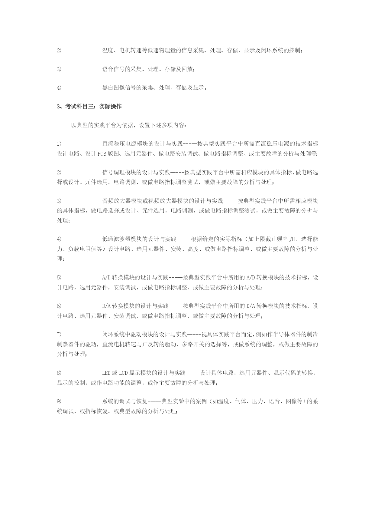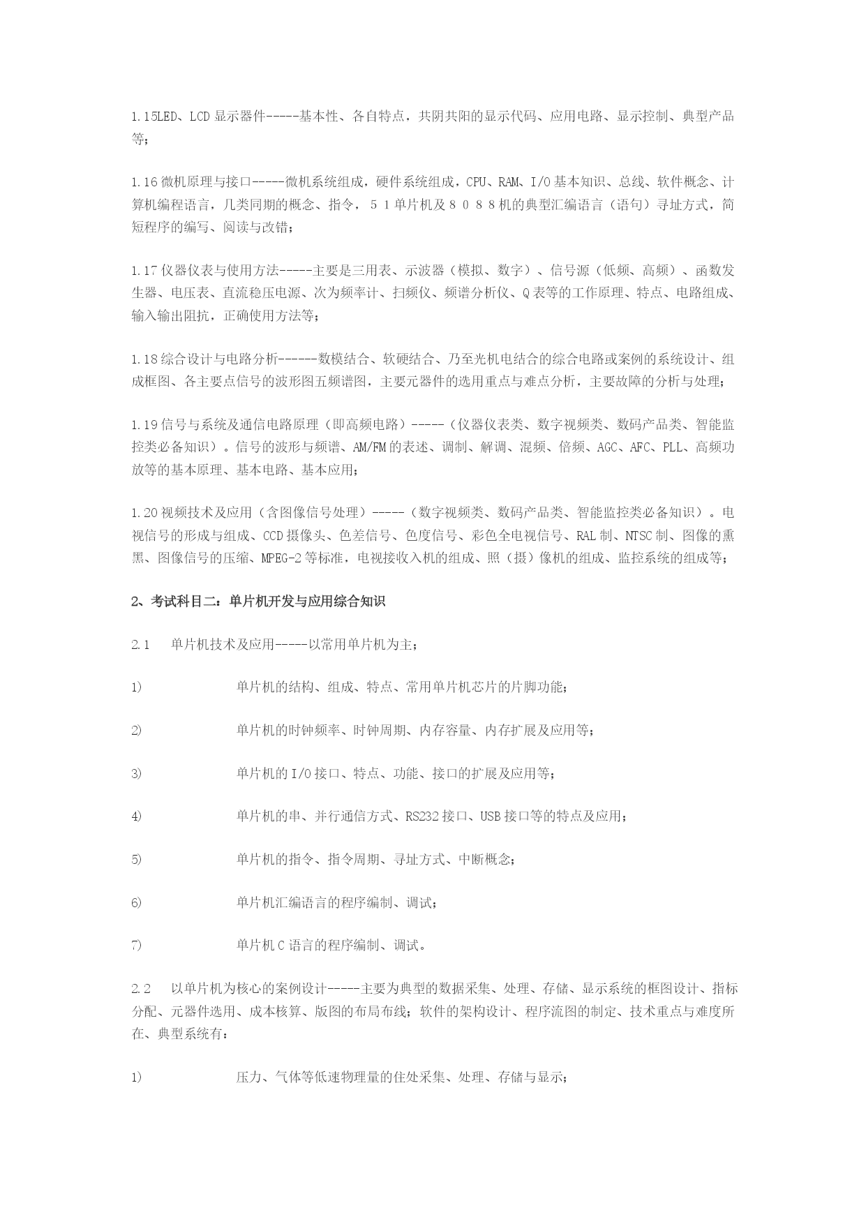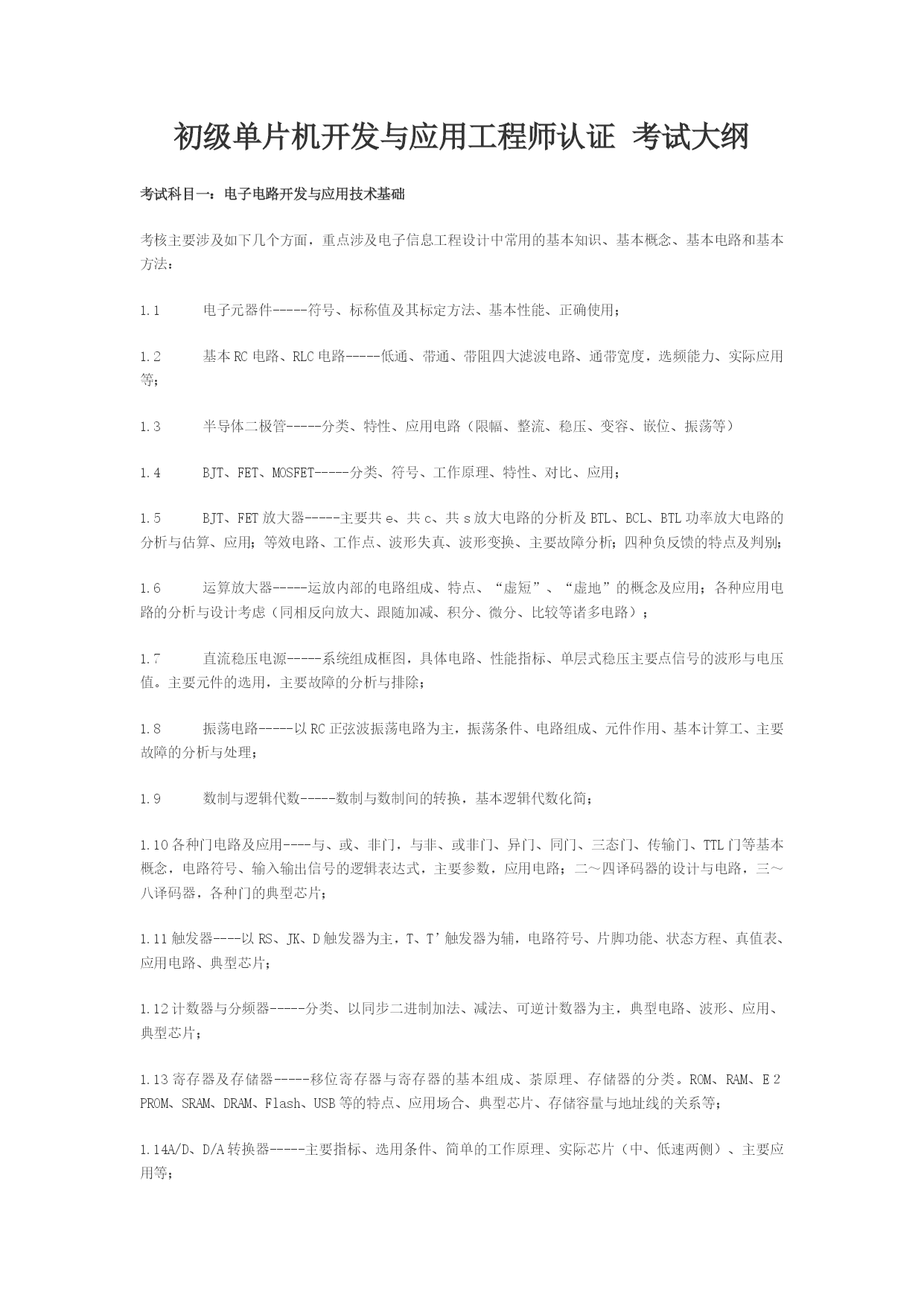 初级单片机开发与应用工程师认证考试大纲考试科目一:电子电路开发与应用技术基础考核主要涉及如下几个方面,重点涉及电子信息工程设计中常用的基本知识、基本概念、基本电路和基本方法:1.1电子元器件-----符号、标称值及其标定方法、基本性能、正确使用;1.2基本RC电路、RLC电路-----低通、带通、带阻四大滤波电路、通带宽度,选频能力、实际应用等;1.3半导体二极管-----分类、特性、应用电路(限幅、整流、稳压、变容、嵌位、振荡等)1.4BJT、FET、MOSFET-----分类、符号、工作原理、特性、对比、应用;1.5BJT、FET放大器-----主要共e、共c、共s放大电路的分析及BTL、BCL、BTL功率放大电路的分析与估算、应用;等效电路、工作点、波形失真、波形变换、主要故障分析;四种负反馈的特点及判别;1.6运算放大器-----运放内部的电路组成、特点、“虚短”、“虚地”的概念及应用;各种应用电路的分析与设计考虑(同相反向放大、跟随加减、积分、微分、比较等诸多电路);1.7直流稳压电源-----系统组成框图,具体电路、性能指标、单层式稳压主要点信号的波形与电压值。主要元件的选用,主要故障的分析与排除;1.8振荡电路-----以RC正弦波振荡电路为主,振荡条件、电路组成、元件作用、基本计算工、主要故障的分析与处理;1.9数制与逻辑代数-----数制与数制间的转换,基本逻辑代数化简;1.10各种门电路及应用----与、或、非门,与非、或非门、异门、同门、三态门、传输门、TTL门等基本概念,电路符号、输入输出信号的逻辑表达式,主要参数,应用电路;二~四译码器的设计与电路,三~八译码器,各种门的典型芯片;1.11触发器----以RS、JK、D触发器为主,T、T’触发器为辅,电路符号、片脚功能、状态方程、真值表、应用电路、典型芯片;1.12计数器与分频器-----分类、以同步二进制加法、减法、可逆计数器为主,典型电路、波形、应用、典型芯片;1.13寄存器及存储器-----移位寄存器与寄存器的基本组成、荼原理、存储器的分类。ROM、RAM、E2PROM、SRAM、DRAM、Flash、USB等的特点、应用场合、典型芯片、存储容量与地址线的关系等;1.14A/D、D/A转换器-----主要指标、选用条件、简单的工作原理、实际芯片(中、低速两侧)、主要应用等;1.15LED、LCD显示器件-----基本性、各自特点,共阴共阳的显示代码、应用电路、显示控制、典型产品等;1.16微机原理与接口-----微机系统组成,硬件系统组成,CPU、RAM、I/O基本知识、总线、软件概念、计算机编程语言,几类同期的概念、指令,51单片机及8088机的典型汇编语言(语句)寻址方式,简短程序的编写、阅读与改错;1.17仪器仪表与使用方法-----主要是三用表、示波器(模拟、数字)、信号源(低频、高频)、函数发生器、电压表、直流稳压电源、次为频率计、扫频仪、频谱分析仪、Q表等的工作原理、特点、电路组成、输入输出阻抗,正确使用方法等;1.18综合设计与电路分析------数模结合、软硬结合、乃至光机电结合的综合电路或案例的系统设计、组成框图、各主要点信号的波形图五频谱图,主要元器件的选用重点与难点分析,主要故障的分析与处理;1.19信号与系统及通信电路原理(即高频电路)-----(仪器仪表类、数字视频类、数码产品类、智能监控类必备知识)。信号的波形与频谱、AM/FM的表述、调制、解调、混频、倍频、AGC、AFC、PLL、高频功放等的基本原理、基本电路、基本应用;1.20视频技术及应用(含图像信号处理)-----(数字视频类、数码产品类、智能监控类必备知识)。电视信号的形成与组成、CCD摄像头、色差信号、色度信号、彩色全电视信号、RAL制、NTSC制、图像的熏黑、图像信号的压缩、MPEG-2等标准,电视接收入机的组成、照(摄)像机的组成、监控系统的组成等;2、考试科目二:单片机开发与应用综合知识2.1单片机技术及应用-----以常用单片机为主;1)单片机的结构、组成、特点、常用单片机芯片的片脚功能;2)单片机的时钟频率、时钟周期、内存容量、内存扩展及应用等;3)单片机的I/O接口、特点、功能、接口的扩展及应用等;4)单片机的串、并行通信方式、RS232接口、USB接口等的特点及应用;5)单片机的指令、指令周期、寻址方式、中断概念;6)单片机汇编语言的程序编制、调试;7)单片机C语言的程序编制、调试。2.2以单片机为核心的案例设计-----主要为典型的数据采集、处理、存储、显示系统的框图设计、指标分配、元器件选用、成本核算、版图的布局布线;软件的架构设计、程序流图的制定、技术重点与难度所在、典型系统有:1)压力、气体等低速物理量的住处采集、处理、存储与显示;2