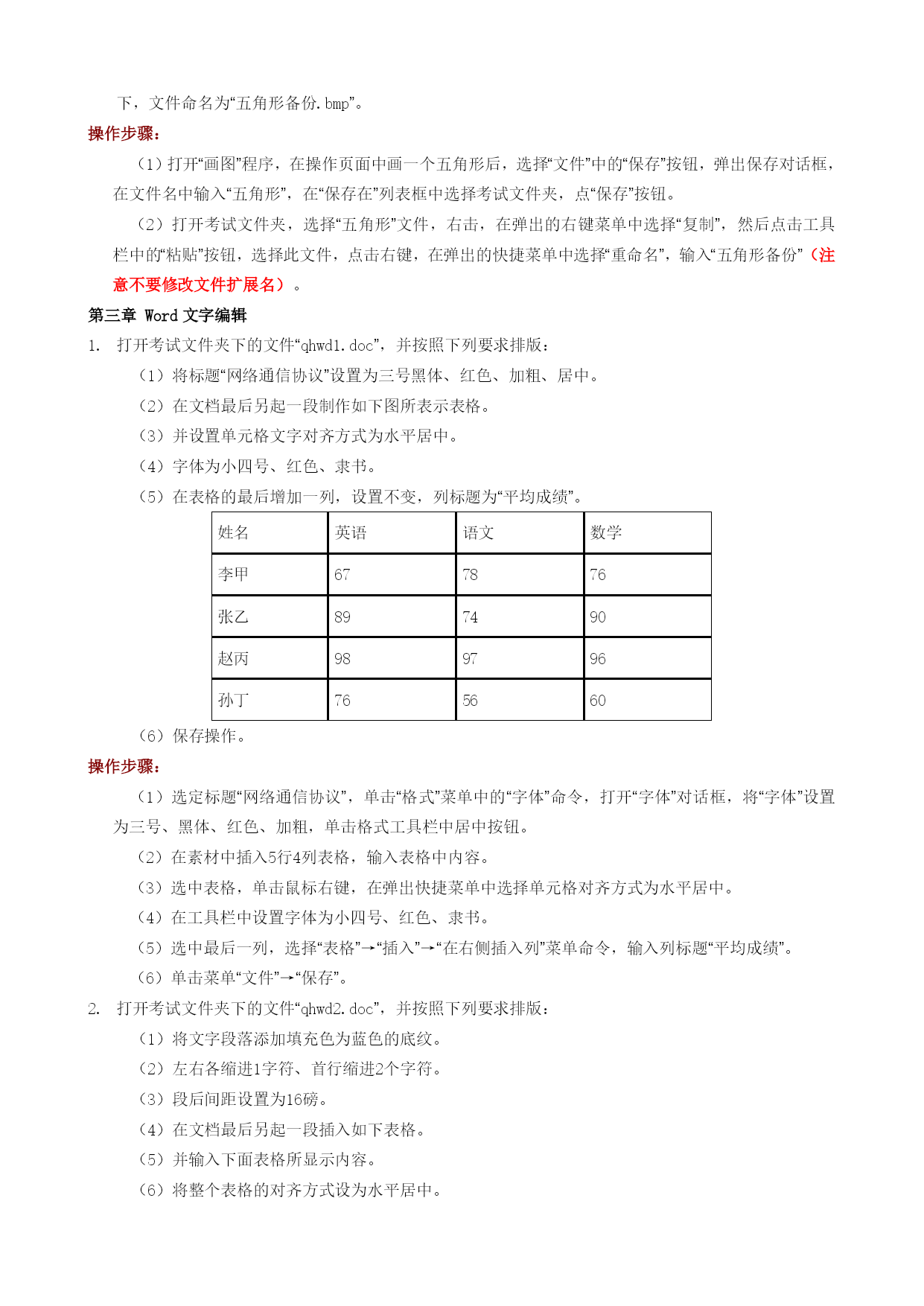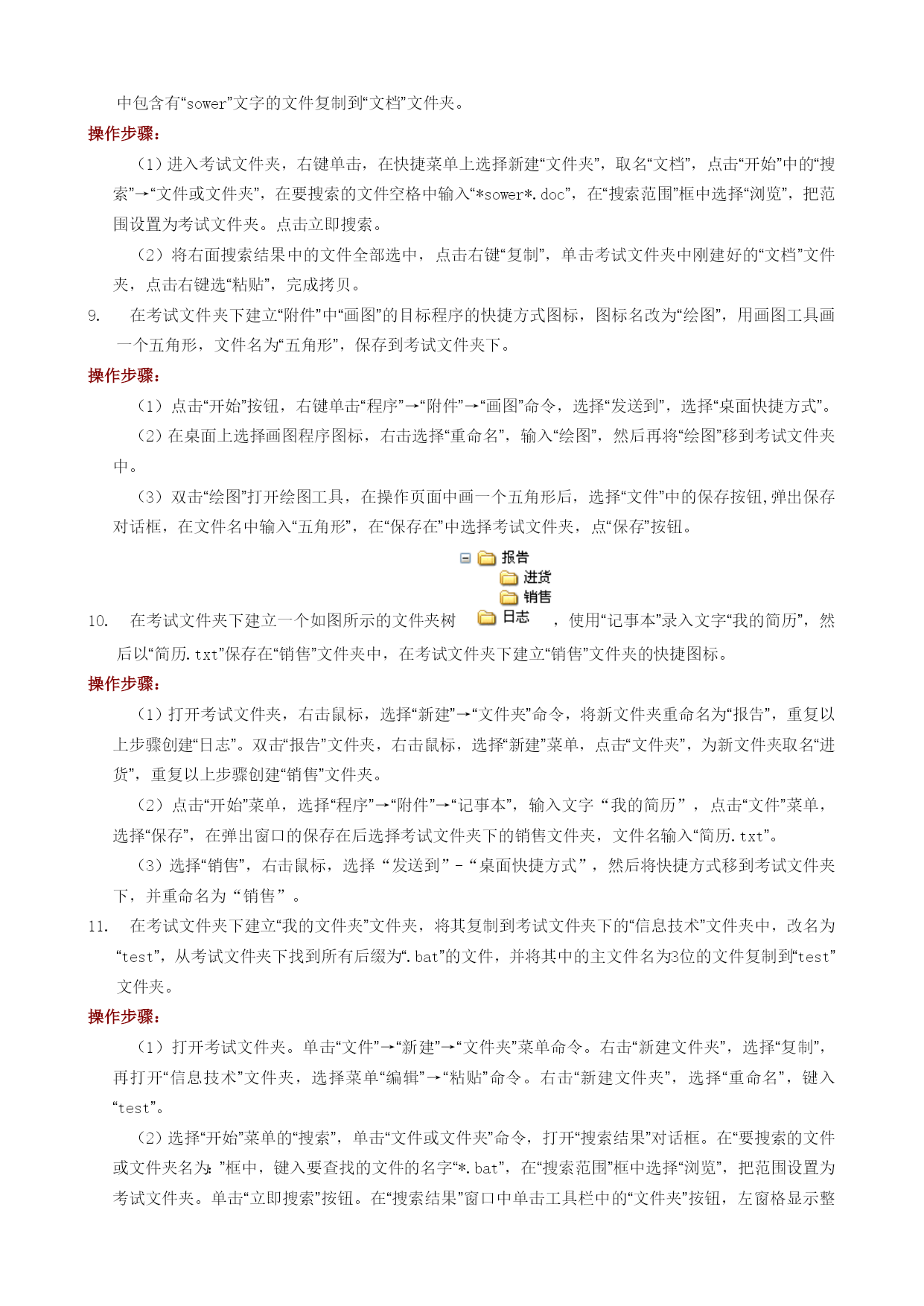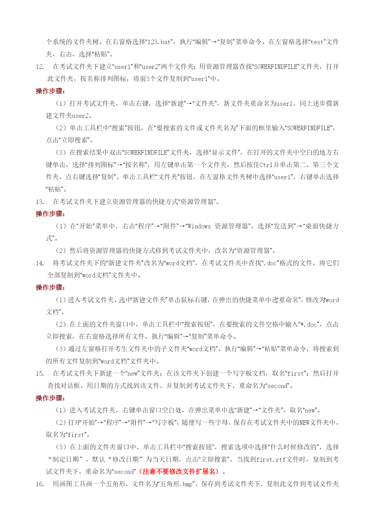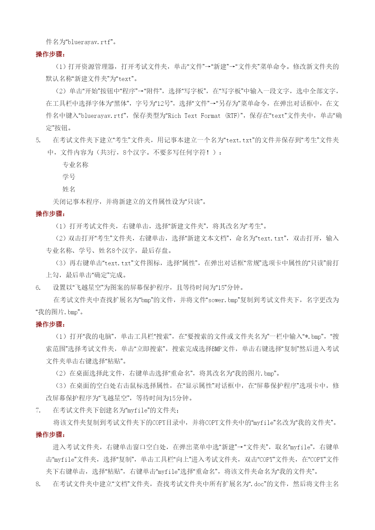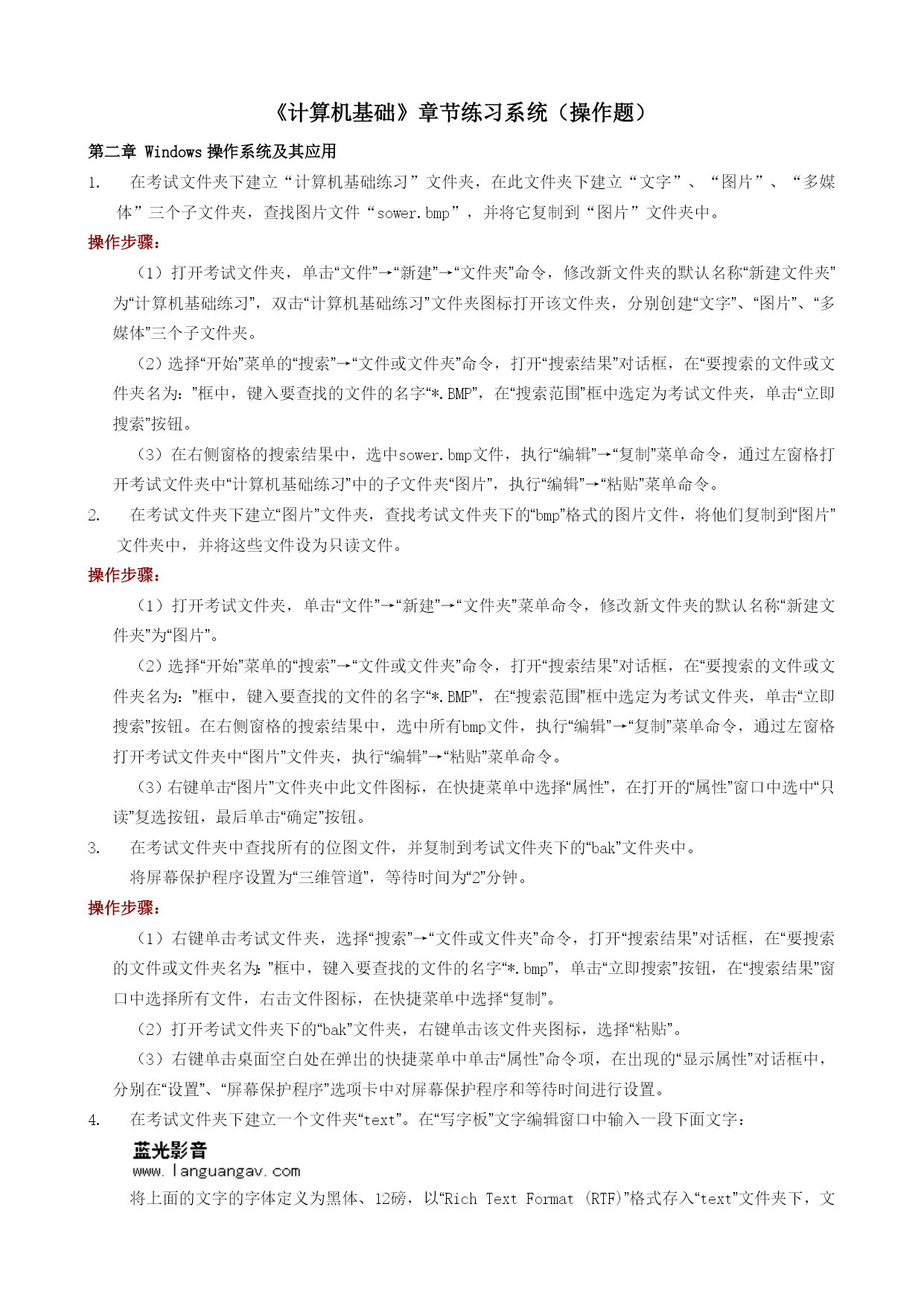 《计算机基础》章节练习系统(操作题)第二章Windows操作系统及其应用在考试文件夹下建立“计算机基础练习”文件夹,在此文件夹下建立“文字”、“图片”、“多媒体”三个子文件夹,查找图片文件“sower.bmp”,并将它复制到“图片”文件夹中。操作步骤:(1)打开考试文件夹,单击“文件”→“新建”→“文件夹”命令,修改新文件夹的默认名称“新建文件夹”为“计算机基础练习”,双击“计算机基础练习”文件夹图标打开该文件夹,分别创建“文字”、“图片”、“多媒体”三个子文件夹。(2)选择“开始”菜单的“搜索”→“文件或文件夹”命令,打开“搜索结果”对话框,在“要搜索的文件或文件夹名为:”框中,键入要查找的文件的名字“*.BMP”,在“搜索范围”框中选定为考试文件夹,单击“立即搜索”按钮。(3)在右侧窗格的搜索结果中,选中sower.bmp文件,执行“编辑”→“复制”菜单命令,通过左窗格打开考试文件夹中“计算机基础练习”中的子文件夹“图片”,执行“编辑”→“粘贴”菜单命令。在考试文件夹下建立“图片”文件夹,查找考试文件夹下的“bmp”格式的图片文件,将他们复制到“图片”文件夹中,并将这些文件设为只读文件。操作步骤:(1)打开考试文件夹,单击“文件”→“新建”→“文件夹”菜单命令,修改新文件夹的默认名称“新建文件夹”为“图片”。(2)选择“开始”菜单的“搜索”→“文件或文件夹”命令,打开“搜索结果”对话框,在“要搜索的文件或文件夹名为:”框中,键入要查找的文件的名字“*.BMP”,在“搜索范围”框中选定为考试文件夹,单击“立即搜索”按钮。在右侧窗格的搜索结果中,选中所有bmp文件,执行“编辑”→“复制”菜单命令,通过左窗格打开考试文件夹中“图片”文件夹,执行“编辑”→“粘贴”菜单命令。(3)右键单击“图片”文件夹中此文件图标,在快捷菜单中选择“属性”,在打开的“属性”窗口中选中“只读”复选按钮,最后单击“确定”按钮。在考试文件夹中查找所有的位图文件,并复制到考试文件夹下的“bak”文件夹中。将屏幕保护程序设置为“三维管道”,等待时间为“2”分钟。操作步骤:(1)右键单击考试文件夹,选择“搜索”→“文件或文件夹”命令,打开“搜索结果”对话框,在“要搜索的文件或文件夹名为:”框中,键入要查找的文件的名字“*.bmp”,单击“立即搜索”按钮,在“搜索结果”窗口中选择所有文件,右击文件图标,在快捷菜单中选择“复制”。(2)打开考试文件夹下的“bak”文件夹,右键单击该文件夹图标,选择“粘贴”。(3)右键单击桌面空白处在弹出的快捷菜单中单击“属性”命令项,在出现的“显示属性”对话框中,分别在“设置”、“屏幕保护程序”选项卡中对屏幕保护程序和等待时间进行设置。在考试文件夹下建立一个文件夹“text”。在“写字板”文字编辑窗口中输入一段下面文字:将上面的文字的字体定义为黑体、12磅,以“RichTextFormat(RTF)”格式存入“text”文件夹下,文件名为“bluerayav.rtf”。操作步骤:(1)打开资源管理器,打开考试文件夹,单击“文件”→“新建”→“文件夹”菜单命令。修改新文件夹的默认名称“新建文件夹”为“text”。(2)单击“开始”按钮中“程序”→“附件”,选择“写字板”,在“写字板”中输入一段文字,选中全部文字,在工具栏中选择字体为“黑体”,字号为“12号”,选择“文件”→“另存为”菜单命令,在弹出对话框中,在文件名中键入“bluerayav.rtf”,保存类型为“RichTextFormat(RTF)”,保存在“text”文件夹中,单击“确定”按钮。在考试文件夹下建立“考生”文件夹,用记事本建立一个名为“text.txt”的文件并保存到“考生”文件夹中,文件内容为(共3行,8个汉字。不要多写任何字符!):专业名称学号姓名关闭记事本程序,并将新建立的文件属性设为“只读”。操作步骤:(1)打开考试文件夹,右键单击,选择“新建文件夹”,将其改名为“考生”。(2)双击打开“考生”文件夹,右键单击,选择“新建文本文档”,命名为“text.txt”,双击打开,输入专业名称、学号、姓名8个汉字,最后存盘。(3)再右键单击“text.txt”文件图标,选择“属性”,在弹出对话框“常规”选项卡中属性的“只读”前打上勾,最后单击“确定”完成。设置以“飞越星空”为图案的屏幕保护程序,且等待时间为“15”分钟。在考试文件夹中查找扩展名为“bmp”的文件,并将文件“sower.bmp”复制到考试文件夹下,名字更改为“我的图片.bmp”。操作步骤:(1)打开“我的电脑”,单击工具栏“搜索”,在“要搜索的文件或文件夹名为”一栏中输入“*.bmp”,“搜索范围”选择考试文件夹,单击“立即搜索”,搜索完成选择BMP文件,单击右键选择“复制”然后进入考试文件夹单击右