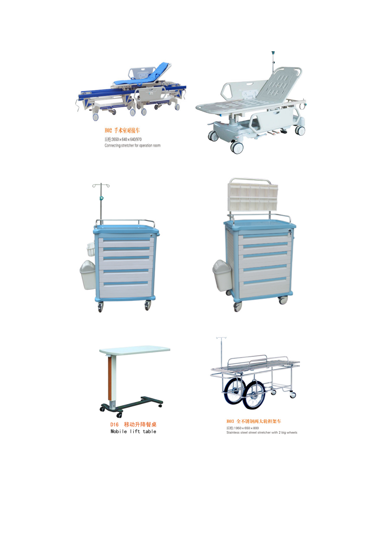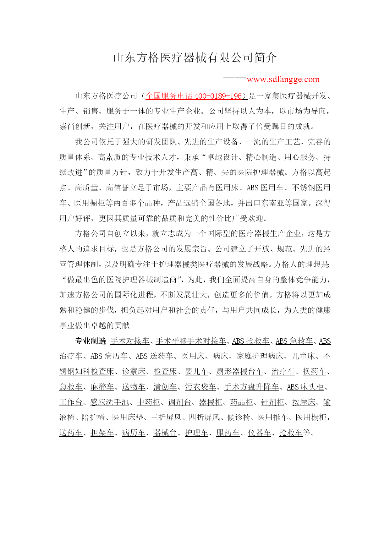 山东方格医疗器械有限公司简介——www.sdfangge.com山东方格医疗公司(全国服务电话400-0189-196)是一家集医疗器械开发、生产、销售、服务于一体的专业生产企业。公司坚持以人为本,以市场为导向,崇尚创新,关注用户,在医疗器械的开发和应用上取得了倍受瞩目的成就。我公司依托于强大的研发团队、先进的生产设备、一流的生产工艺、完善的质量体系、高素质的专业技术人才,秉承“卓越设计、精心制造、用心服务、持续改进”的质量方针,致力于开发生产高、精、尖的医院护理器械。方格以高起点、高质量、高信誉立足于市场,主要产品有医用床、ABS医用车、不锈钢医用车、医用橱柜等两百多个品种,产品远销全国各地,并出口东南亚等国家。深得用户好评,更因其质量可靠的品质和完美的性价比广受欢迎。方格公司自创立以来,就立志成为一个国际型的医疗器械生产企业,这是方格人的追求目标,也是方格公司的发展宗旨。公司建立了开放、规范、先进的经营管理体制,以及明确专注于护理器械类医疗器械的发展战略。方格人的理想是:“做最出色的医院护理器械制造商”,为此,我们全面提高自身的整体竞争能力,加速方格公司的国际化进程,不断发展壮大,创造更多的价值。方格将以更加成熟和稳健的步伐,担负起对用户和社会的责任,与用户共同成长,为人类的健康事业做出卓越的贡献。专业制造:手术对接车、手术平移手术对接车、ABS抢救车、ABS急救车、ABS治疗车、ABS病历车、ABS送药车、医用床、病床、家庭护理病床、儿童床、不锈钢妇科检查床、诊察床、检查床、婴儿车、扇形器械台车、治疗车、换药车、急救车、麻醉车、送物车、清创车、污衣袋车、手术方盘升降车、ABS床头柜、工作台、感应洗手池、中药柜、调剂台、器械柜、药品柜、针剂柜、按摩床、输液椅、陪护椅、医用床垫、三折屏风、四折屏风、候诊椅、医用推车、医用橱柜,送药车、担架车、病历车、器械台、护理车、服药车、仪器车、抢救车等。