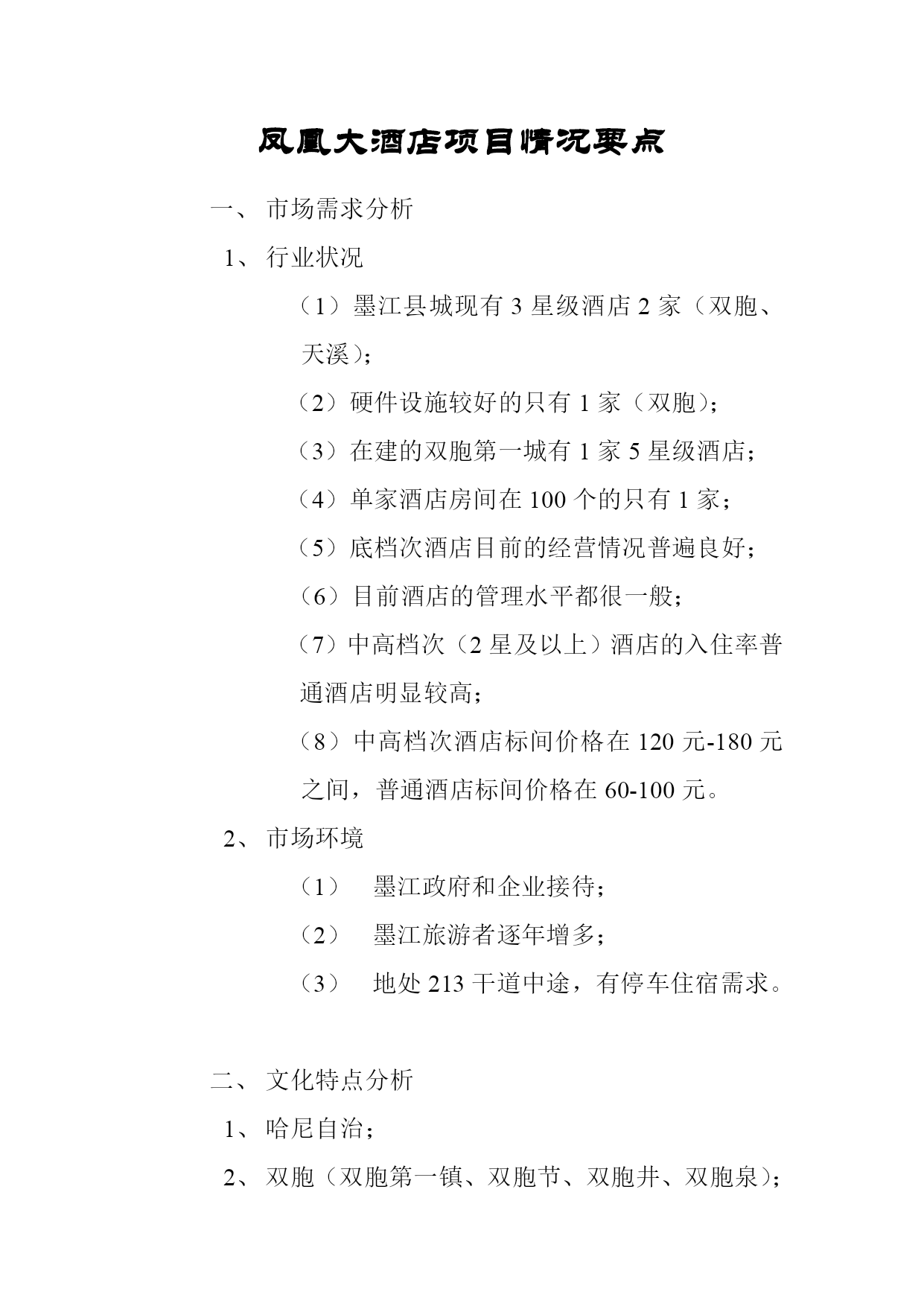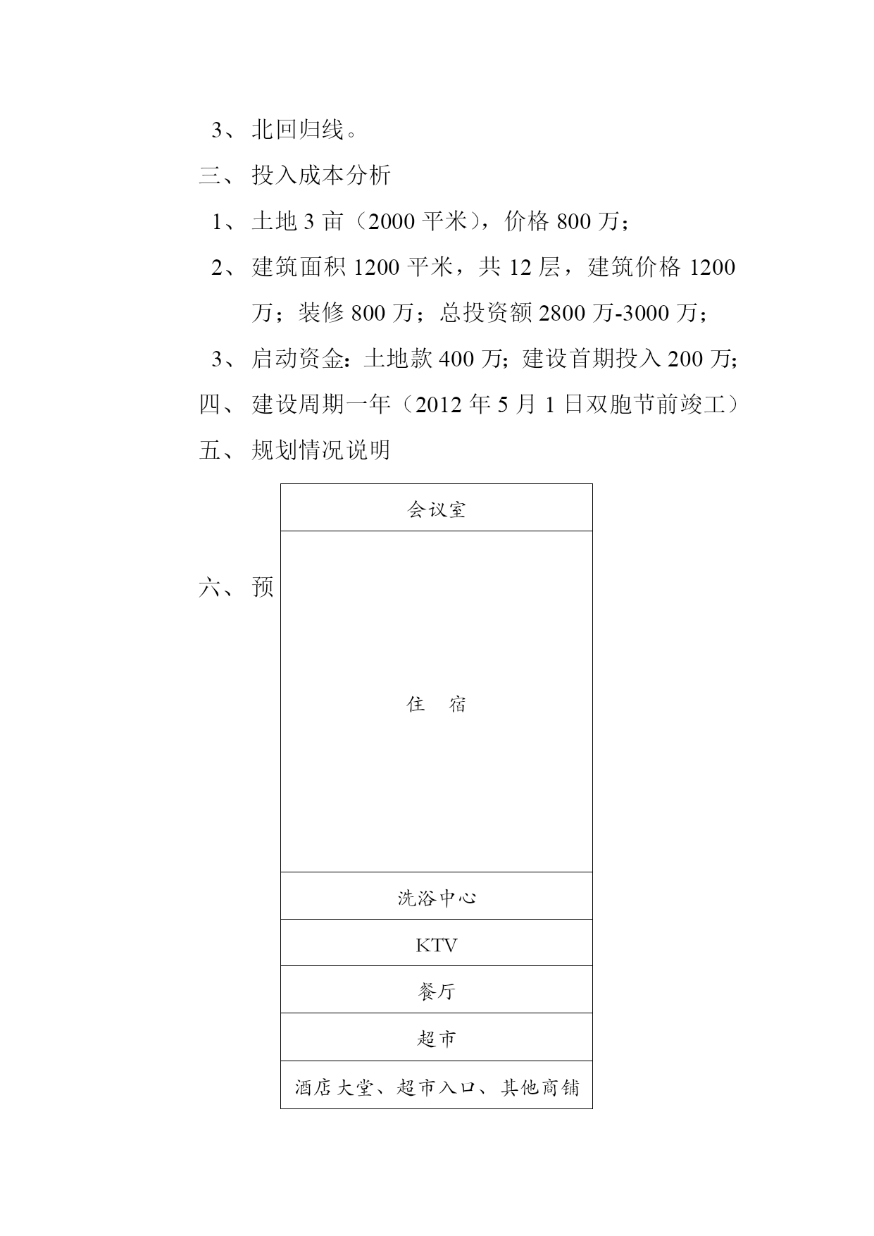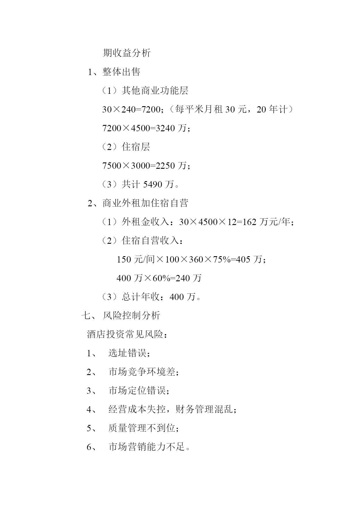 凤凰大酒店项目情况要点市场需求分析行业状况(1)墨江县城现有3星级酒店2家(双胞、天溪);(2)硬件设施较好的只有1家(双胞);(3)在建的双胞第一城有1家5星级酒店;(4)单家酒店房间在100个的只有1家;(5)底档次酒店目前的经营情况普遍良好;(6)目前酒店的管理水平都很一般;(7)中高档次(2星及以上)酒店的入住率普通酒店明显较高;(8)中高档次酒店标间价格在120元-180元之间,普通酒店标间价格在60-100元。市场环境墨江政府和企业接待;墨江旅游者逐年增多;地处213干道中途,有停车住宿需求。文化特点分析哈尼自治;双胞(双胞第一镇、双胞节、双胞井、双胞泉);北回归线。投入成本分析土地3亩(2000平米),价格800万;建筑面积1200平米,共12层,建筑价格1200万;装修800万;总投资额2800万-3000万;启动资金:土地款400万;建设首期投入200万;建设周期一年(2012年5月1日双胞节前竣工)规划情况说明会议室住宿洗浴中心KTV餐厅超市酒店大堂、超市入口、其他商铺预期收益分析1、整体出售(1)其他商业功能层30×240=7200;(每平米月租30元,20年计)7200×4500=3240万;(2)住宿层7500×3000=2250万;(3)共计5490万。2、商业外租加住宿自营(1)外租金收入:30×4500×12=162万元/年;(2)住宿自营收入:150元/间×100×360×75%=405万;400万×60%=240万(3)总计年收:400万。风险控制分析酒店投资常见风险:选址错误;市场竞争环境差;市场定位错误;经营成本失控,财务管理混乱;质量管理不到位;市场营销能力不足。
