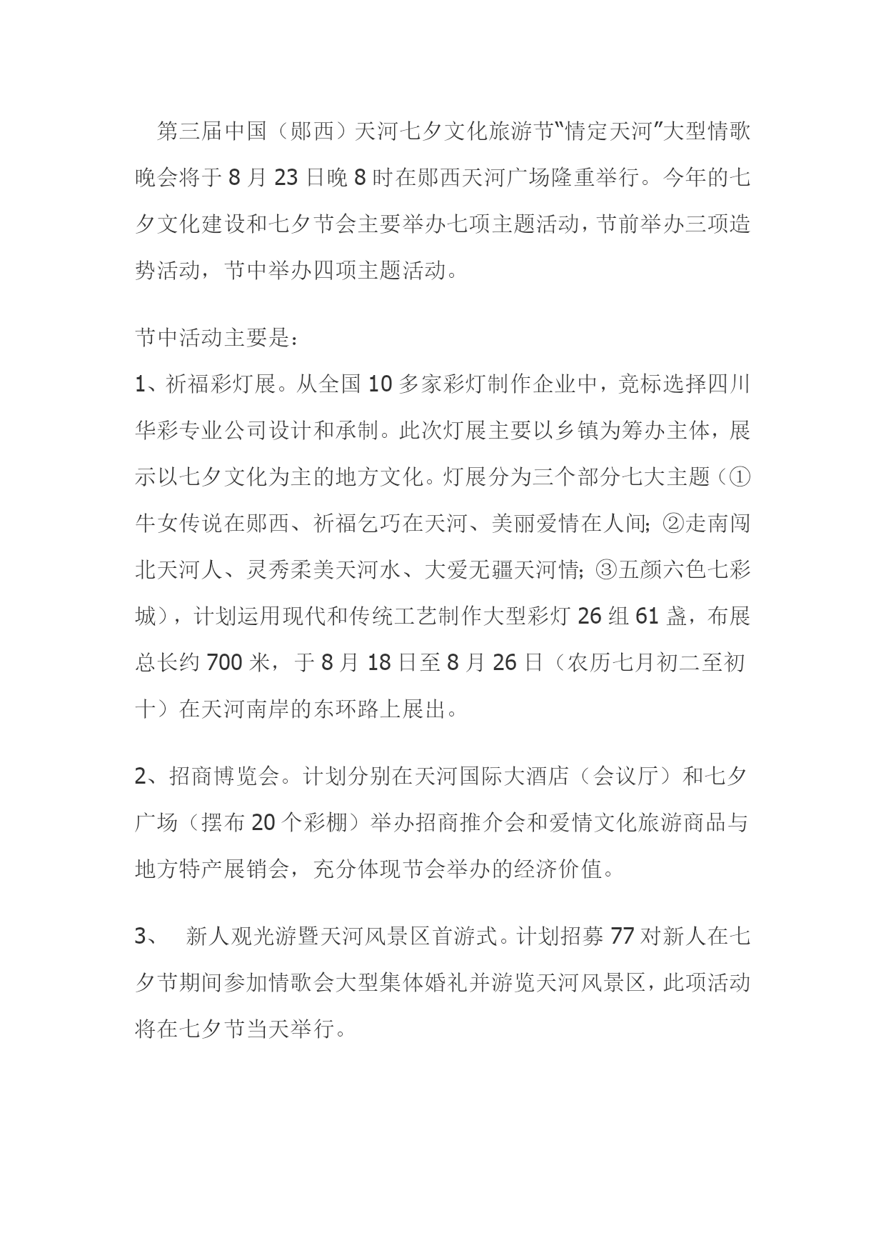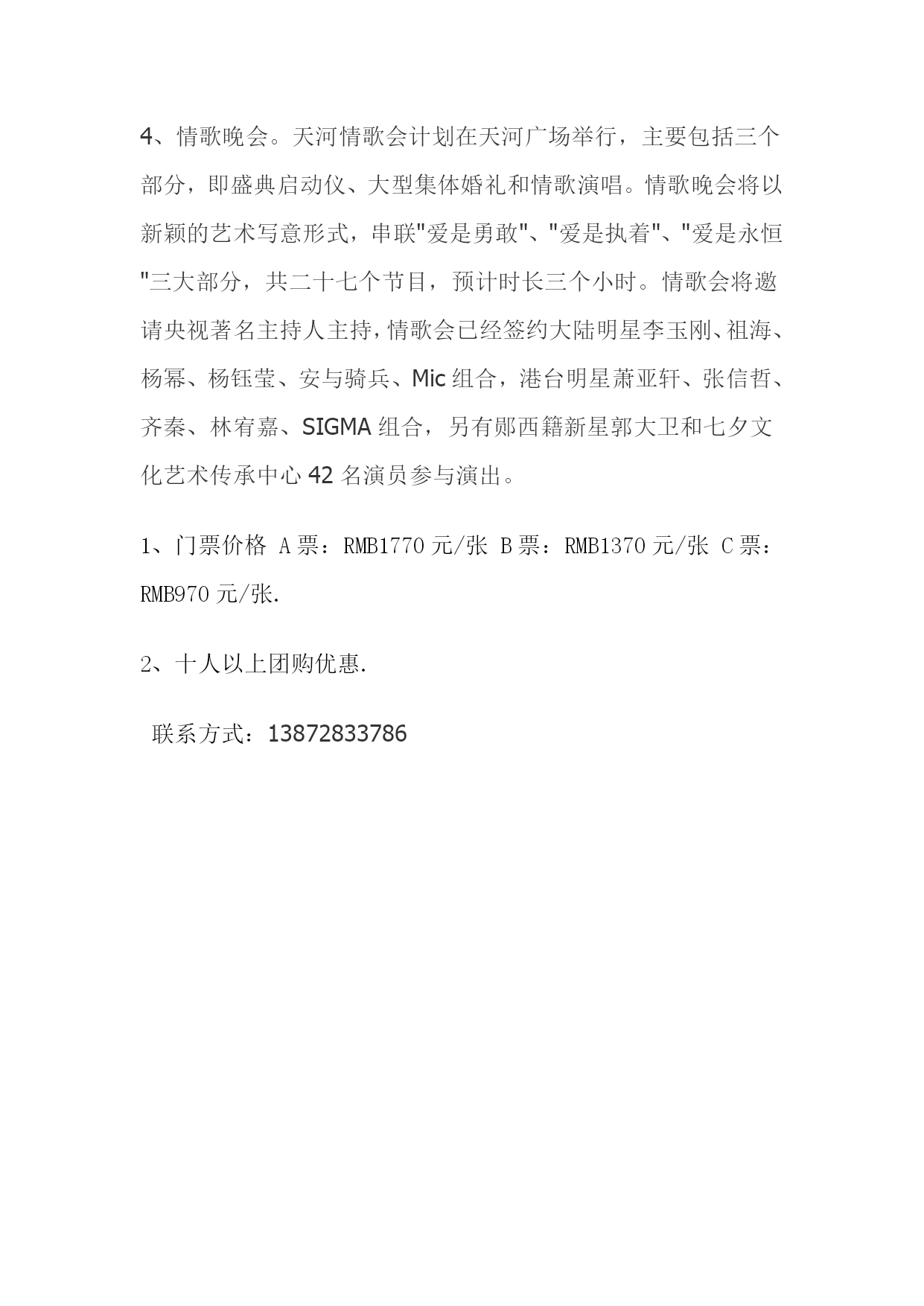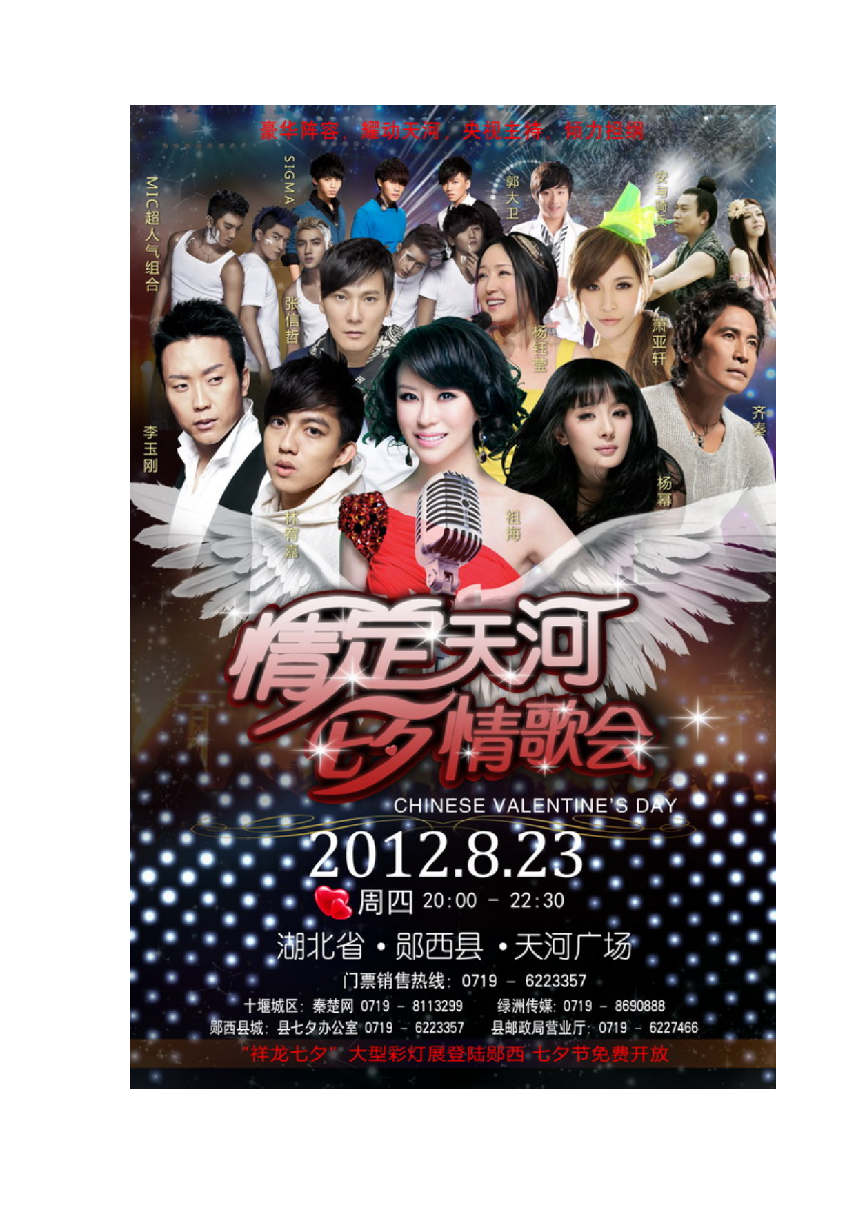 第三届中国(郧西)天河七夕文化旅游节“情定天河”大型情歌晚会将于8月23日晚8时在郧西天河广场隆重举行。今年的七夕文化建设和七夕节会主要举办七项主题活动,节前举办三项造势活动,节中举办四项主题活动。节中活动主要是:1、祈福彩灯展。从全国10多家彩灯制作企业中,竞标选择四川华彩专业公司设计和承制。此次灯展主要以乡镇为筹办主体,展示以七夕文化为主的地方文化。灯展分为三个部分七大主题(①牛女传说在郧西、祈福乞巧在天河、美丽爱情在人间;②走南闯北天河人、灵秀柔美天河水、大爱无疆天河情;③五颜六色七彩城),计划运用现代和传统工艺制作大型彩灯26组61盏,布展总长约700米,于8月18日至8月26日(农历七月初二至初十)在天河南岸的东环路上展出。2、招商博览会。计划分别在天河国际大酒店(会议厅)和七夕广场(摆布20个彩棚)举办招商推介会和爱情文化旅游商品与地方特产展销会,充分体现节会举办的经济价值。3、新人观光游暨天河风景区首游式。计划招募77对新人在七夕节期间参加情歌会大型集体婚礼并游览天河风景区,此项活动将在七夕节当天举行。4、情歌晚会。天河情歌会计划在天河广场举行,主要包括三个部分,即盛典启动仪、大型集体婚礼和情歌演唱。情歌晚会将以新颖的艺术写意形式,串联"爱是勇敢"、"爱是执着"、"爱是永恒"三大部分,共二十七个节目,预计时长三个小时。情歌会将邀请央视著名主持人主持,情歌会已经签约大陆明星李玉刚、祖海、杨幂、杨钰莹、安与骑兵、Mic组合,港台明星萧亚轩、张信哲、齐秦、林宥嘉、SIGMA组合,另有郧西籍新星郭大卫和七夕文化艺术传承中心42名演员参与演出。1、门票价格A票:RMB1770元/张B票:RMB1370元/张C票:RMB970元/张.2、十人以上团购优惠.联系方式:13872833786