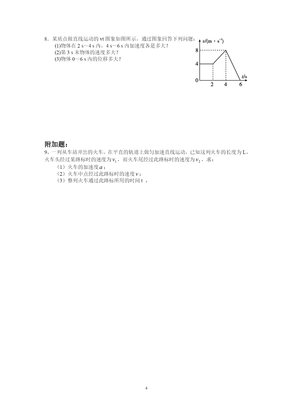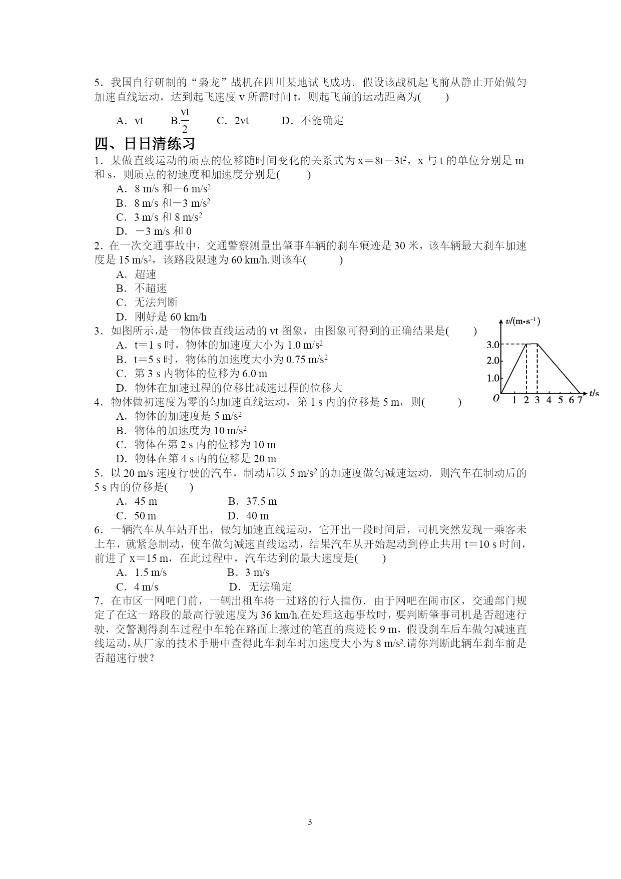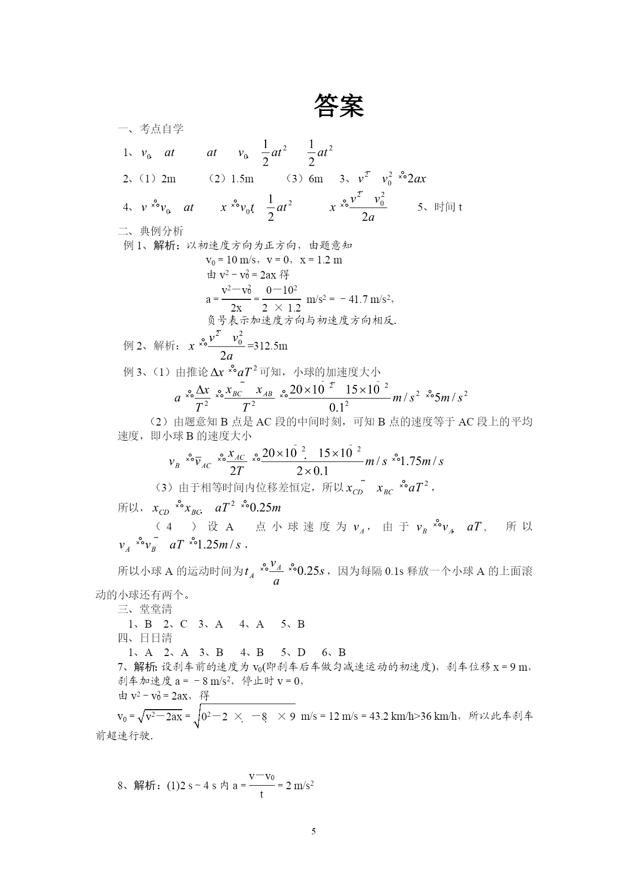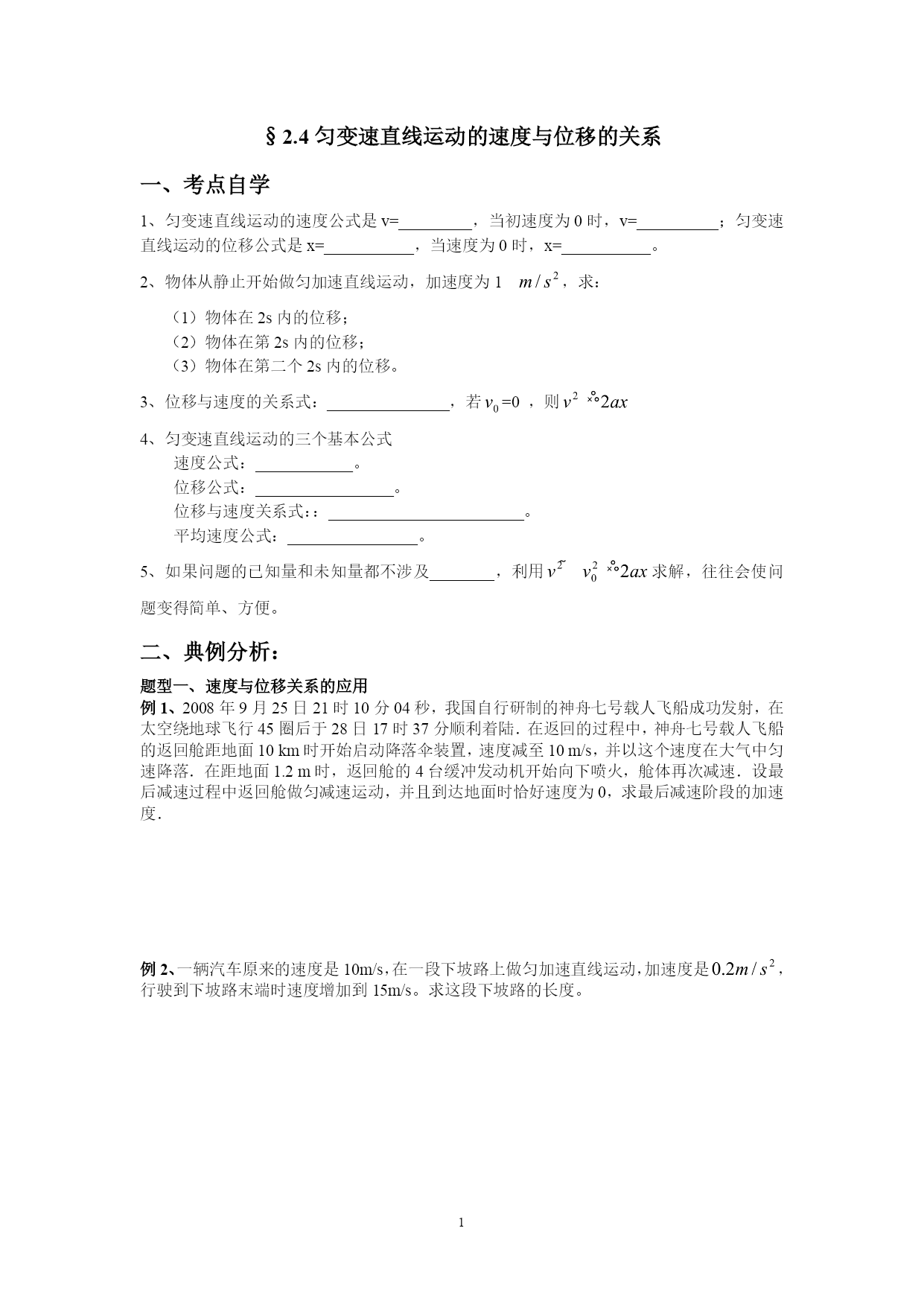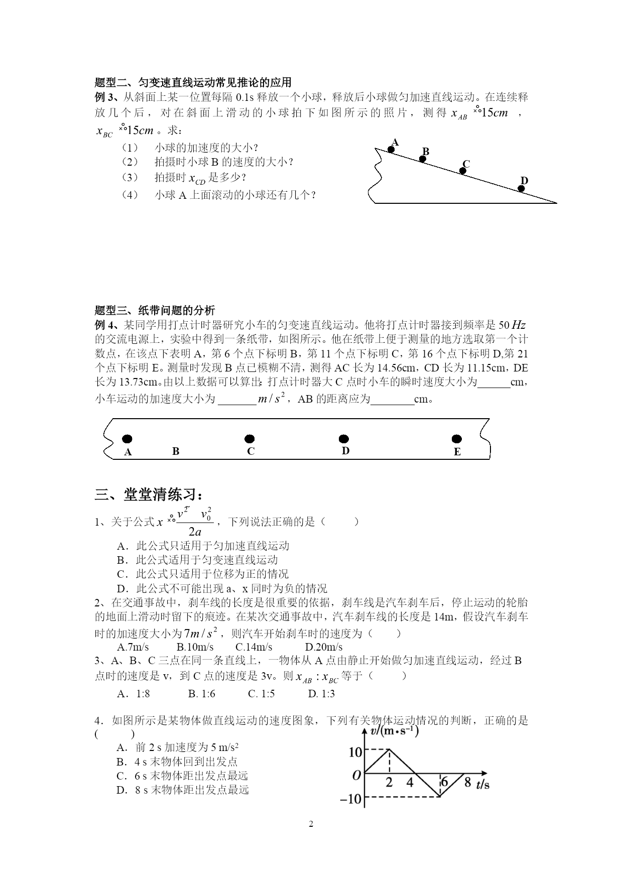 §2.4匀变速直线运动的速度与位移的关系一、考点自学1、匀变速直线运动的速度公式是v=_________,当初速度为0时,v=__________;匀变速直线运动的位移公式是x=___________,当速度为0时,x=___________。2、物体从静止开始做匀加速直线运动,加速度为1,求:(1)物体在2s内的位移;(2)物体在第2s内的位移;(3)物体在第二个2s内的位移。3、位移与速度的关系式:_______________,若=0,则4、匀变速直线运动的三个基本公式速度公式:____________。位移公式:_________________。位移与速度关系式::________________________。平均速度公式:________________。5、如果问题的已知量和未知量都不涉及________,利用求解,往往会使问题变得简单、方便。二、典例分析:题型一、速度与位移关系的应用例1、2008年9月25日21时10分04秒,我国自行研制的神舟七号载人飞船成功发射,在太空绕地球飞行45圈后于28日17时37分顺利着陆.在返回的过程中,神舟七号载人飞船的返回舱距地面10km时开始启动降落伞装置,速度减至10m/s,并以这个速度在大气中匀速降落.在距地面1.2m时,返回舱的4台缓冲发动机开始向下喷火,舱体再次减速.设最后减速过程中返回舱做匀减速运动,并且到达地面时恰好速度为0,求最后减速阶段的加速度.例2、一辆汽车原来的速度是10m/s,在一段下坡路上做匀加速直线运动,加速度是,行驶到下坡路末端时速度增加到15m/s。求这段下坡路的长度。题型二、匀变速直线运动常见推论的应用ABCD例3、从斜面上某一位置每隔0.1s释放一个小球,释放后小球做匀加速直线运动。在连续释放几个后,对在斜面上滑动的小球拍下如图所示的照片,测得,。求:小球的加速度的大小?拍摄时小球B的速度的大小?拍摄时是多少?小球A上面滚动的小球还有几个?题型三、纸带问题的分析例4、某同学用打点计时器研究小车的匀变速直线运动。他将打点计时器接到频率是50的交流电源上,实验中得到一条纸带,如图所示。他在纸带上便于测量的地方选取第一个计数点,在该点下表明A,第6个点下标明B,第11个点下标明C,第16个点下标明D,第21个点下标明E。测量时发现B点已模糊不清,测得AC长为14.56cm,CD长为11.15cm,DE长为13.73cm。由以上数据可以算出:打点计时器大C点时小车的瞬时速度大小为______cm,小车运动的加速度大小为_______,AB的距离应为________cm。ABCDE三、堂堂清练习:1、关于公式,下列说法正确的是()A.此公式只适用于匀加速直线运动B.此公式适用于匀变速直线运动C.此公式只适用于位移为正的情况D.此公式不可能出现a、x同时为负的情况2、在交通事故中,刹车线的长度是很重要的依据,刹车线是汽车刹车后,停止运动的轮胎的地面上滑动时留下的痕迹。在某次交通事故中,汽车刹车线的长度是14m,假设汽车刹车时的加速度大小为,则汽车开始刹车时的速度为()A.7m/sB.10m/sC.14m/sD.20m/s3、A、B、C三点在同一条直线上,一物体从A点由静止开始做匀加速直线运动,经过B点时的速度是v,到C点的速度是3v。则等于()A.1:8B.1:6C.1:5D.1:34.如图所示是某物体做直线运动的速度图象,下列有关物体运动情况的判断,正确的是()A.前2s加速度为5m/s2B.4s末物体回到出发点C.6s末物体距出发点最远D.8s末物体距出发点最远5.我国自行研制的“枭龙”战机在四川某地试飞成功.假设该战机起飞前从静止开始做匀加速直线运动,达到起飞速度v所需时间t,则起飞前的运动距离为()A.vtB.eq\f(vt,2)C.2vtD.不能确定四、日日清练习1.某做直线运动的质点的位移随时间变化的关系式为x=8t-3t2,x与t的单位分别是m和s,则质点的初速度和加速度分别是()A.8m/s和-6m/s2B.8m/s和-3m/s2C.3m/s和8m/s2D.-3m/s和02.在一次交通事故中,交通警察测量出肇事车辆的刹车痕迹是30米,该车辆最大刹车加速度是15m/s2,该路段限速为60km/h.则该车()A.超速B.不超速C.无法判断D.刚好是60km/h3.如图所示,是一物体做直线运动的vt图象,由图象可得到的正确结果是()A.t=1s时,物体的加速度大小为1.0m/s2B.t=5s时,物体的加速度大小为0.75m/s2C.第3s内物体的位移为6.0mD.物体在加速过程的位移比减速过程的位移大4.物体做初速度为零的匀加速直线运动,第1s内的位移是5m,则()A.物体的加速度是5m/s2B.物体的
