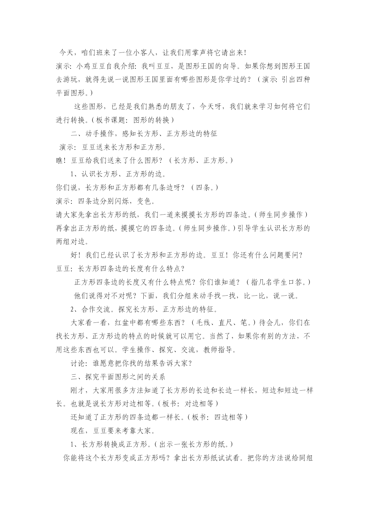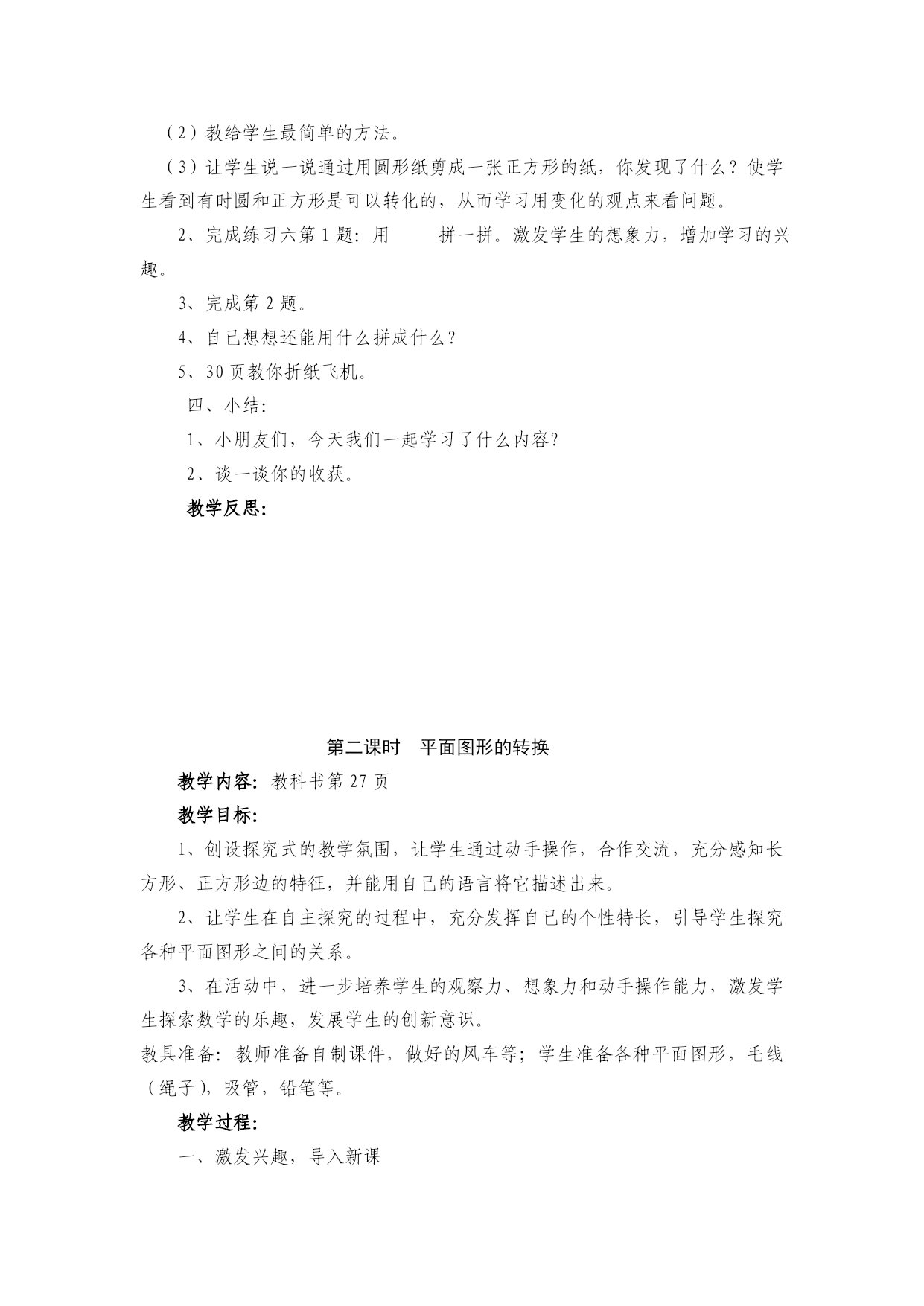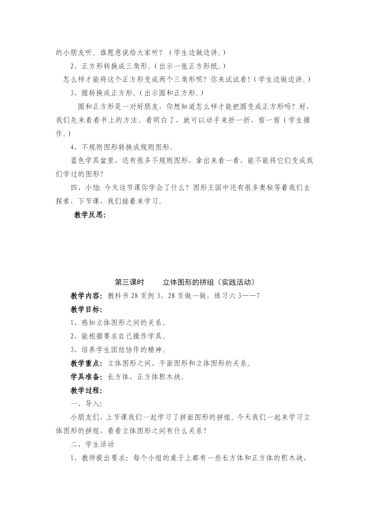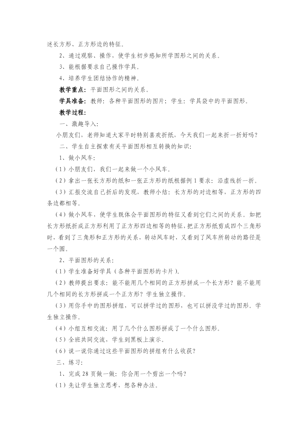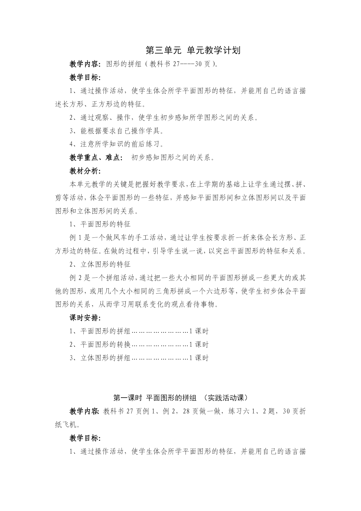 第三单元单元教学计划教学内容:图形的拼组(教科书27----30页)。教学目标:1、通过操作活动,使学生体会所学平面图形的特征,并能用自己的语言描述长方形、正方形边的特征。2、通过观察、操作,使学生初步感知所学图形之间的关系。3、能根据要求自己操作学具。4、注意所学知识的前后练习。教学重点、难点:初步感知图形之间的关系。教材分析:本单元教学的关键是把握好教学要求,在上学期的基础上让学生通过摆、拼、剪等活动,体会平面图形的一些特征,并感知平面图形间和立体图形间以及平面图形和立体图形间的关系。1、平面图形的特征例1是一个做风车的手工活动,通过让学生按要求折一折来体会长方形、正方形边的特征。在做的过程中,引导学生说一说,以突出平面图形的特征和关系。2、立体图形的特征例2是一个拼组活动,通过把一些大小相同的平面图形拼成一些更大的或其他的图形,或用几个大小相同的三角形拼成一个六边形等,使学生初步体会平面图形的关系,从而学习用联系变化的观点看待事物。课时安排:1、平面图形的拼组……………………1课时2、平面图形的转换……………………1课时3、立体图形的拼组……………………1课时第一课时平面图形的拼组(实践活动课)教学内容:教科书27页例1、例2,28页做一做,练习六1、2题,30页折纸飞机。教学目标:1、通过操作活动,使学生体会所学平面图形的特征,并能用自己的语言描述长方形、正方形边的特征。2、通过观察、操作,使学生初步感知所学图形之间的关系。3、能根据要求自己操作学具。4、培养学生团结协作的精神。教学重点:平面图形之间的关系。学具准备:教师:各种平面图形的图片;学生:学具袋中的平面图形。教学过程:一、激趣导入:小朋友们,老师知道大家平时特别喜欢折纸,今天我们一起来折一折好吗?二、学生自主探索有关平面图形相互转换的知识:1、做小风车:(1)小朋友们,我们一起来做一个小风车。(2)拿出一张长方形的纸和一张正方形的纸根据例1要求:沿虚线折一折。(3)汇报交流自己折后的发现,教师小结:长方形的对边相等,正方形的四条边都相等。(4)做小风车,使学生既体会平面图形的特征又看到它们之间的关系。如把长方形纸折成正方形利用了正方形四边相等的特征,把正方形纸剪成四个三角形时,看到了三角形和正方形的关系,转动风车时,又看到了风车所转动的路径是一个圆。2、平面图形的关系:(1)学生准备好学具(各种平面图形的卡片)。(2)教师提出要求:能不能用几个相同的正方形拼成一个长方形?能不能用几个相同的长方形拼成一个正方形?学生独立操作。(3)用你手中的图形拼组,可以拼学过的图形,也可以拼没学过的图形。学生独立操作。(4)小组互相交流:用了几个什么图形拼成了一个什么图形。(5)全班共同交流,学生到黑板上演示。(6)说一说你通过这些平面图形的拼组有什么收获?三、练习:1、完成28页做一做:你会用一个剪出一个吗?(1)先让学生独立思考,想各种办法。(2)教给学生最简单的方法。(3)让学生说一说通过用圆形纸剪成一张正方形的纸,你发现了什么?使学生看到有时圆和正方形是可以转化的,从而学习用变化的观点来看问题。2、完成练习六第1题:用拼一拼。激发学生的想象力,增加学习的兴趣。3、完成第2题。4、自己想想还能用什么拼成什么?5、30页教你折纸飞机。四、小结:1、小朋友们,今天我们一起学习了什么内容?2、谈一谈你的收获。教学反思:第二课时平面图形的转换教学内容:教科书教学目标:1、创设探究式的教学氛围,让学生通过动手操作,合作交流,充分感知长方形、正方形边的特征,并能用自己的语言将它描述出来。2、让学生在自主探究的过程中,充分发挥自己的个性特长,引导学生探究各种平面图形之间的关系。3、在活动中,进一步培养学生的观察力、想象力和动手操作能力,激发学生探索数学的乐趣,发展学生的创新意识。教具准备:教师准备自制课件,做好的风车等;学生准备各种平面图形,毛线(绳子),吸管,铅笔等。教学过程:一、激发兴趣,导入新课今天,咱们班来了一位小客人,让我们用掌声将它请出来!演示:小鸡豆豆自我介绍:我叫豆豆,是图形王国的向导。如果你想到图形王国去游玩,就得先说一说图形王国里面有哪些图形是你学过的?(演示:引出四种平面图形。)这些图形,已经是我们熟悉的朋友了,今天呀,我们就来学习如何将它们进行转换。(板书课题:图形的转换)二、动手操作,感知长方形、正方形边的特征演示:豆豆送来长方形和正方形。瞧!豆豆给我们送来了什么图形?(长方形、正方形。)1、认识长方形、正方形的边。你们说,长方形和正方形都有几条边呀?(四条。)演示:四条边分别闪烁,变色。请大家先拿出长方形的纸,我们一道来摸摸长方形的四条边。(师生同步操作)再拿出正方形的纸,摸摸它的四条边。(师生同步操作。)引导学生认识长方形的两组对边。好!我们已经认识了