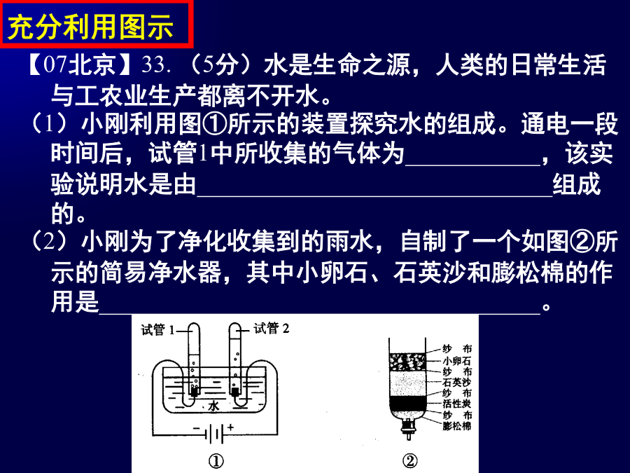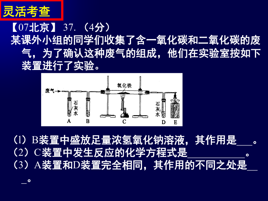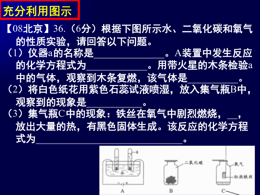 考试层次要求充分利用图示充分利用图示灵活考查【07北京】37.(4分) (4)该小组同学认为废气中的一氧化碳可以利用,于是设计如下装置除去废气中的二氧化碳,并收集一瓶一氧化碳,准备进行后续地探究。其中最合理的装置是_________(填序号,瓶内为氢氧化钠溶液)。【08北京】37.(4分) 老师用下图所示装置为同学们做了一个兴趣实验。A装置中盛有二氧化锰黑色粉末,B装置中盛有足量的澄清石灰水,C装置中盛有足量的稀盐酸,气球中装有少量的碳酸钠粉末。 (1)打开分液漏斗的活塞和玻璃塞,使A装置与大气相通,将气 球中的碳酸钠粉末全部倒入稀盐酸中,可以观察到C装置中 的现象是__________________。 (2)待上述反应结束后,从分液漏斗注入足量的过氧化氢溶液, 关闭活塞和玻璃塞,A装置中发生反应的化学方程式为___。 (3)在整个实验过程中,B装置中的现象是_______。 (4)C装置中气球的作用是___________(填字母)。 a.收集纯净气体 b.添加固体药品 c.调节C装置容积 d.控制气体总量专题一:常用仪器及实验基本操作专题一:常用仪器及实验基本操作专题一:常用仪器及实验基本操作专题一:常用仪器及实验基本操作专题一:常用仪器及实验基本操作专题一:常用仪器及实验基本操作专题一:常用仪器及实验基本操作专题一:常用仪器及实验基本操作专题一:常用仪器及实验基本操作物质组成的测定利用对比方法,探究物质发生反应的条件利用控制变量的方法,探究物质的反应固体加热型固-液不加热型专题一:常用仪器及实验基本操作专题二:气体的制取、净化与检验专题二:气体的制取、净化与检验专题二:气体的制取、净化与检验专题二:气体的制取、净化与检验例如:以下是实验室制取气体常用的化学仪器。专题二:气体的制取、净化与检验专题二:气体的制取、净化与检验专题二:气体的制取、净化与检验轻上重下轻上重下错误进行轻上重下专题二:气体的制取、净化与检验专题二:气体的制取、净化与检验专题二:气体的制取、净化与检验专题二:气体的制取、净化与检验专题二:气体的制取、净化与检验专题二:气体的制取、净化与检验专题二:气体的制取、净化与检验专题二:气体的制取、净化与检验专题二:气体的制取、净化与检验专题二:气体的制取、净化与检验专题二:气体的制取、净化与检验专题二:气体的制取、净化与检验专题二:气体的制取、净化与检验专题三:物质性质的应用专题三:物质性质的应用专题三:物质性质的应用专题三:物质性质的应用专题三:物质性质的应用专题三:物质性质的应用例如:由于大量使用一次性塑料方便袋而造成的“白色污染”已成为一个严重的社会问题。某化学研究小组的同学对某种塑料袋的组成进行分析研究(资料显示该塑料只含C、H两种元素)。他们设计了图所示的实验装置,使该塑料试样在纯氧中完全燃烧,观察实验现象、分析有关数据、推算元素含量。例如:正确连接如下图所示的装置进行实验,可以验 证mg某混合气体的成分是CO2、H2O和CO,并粗 略测出每种气体的质量(每套装置限用一次)。例如:利用粗盐提纯后获得的氯化钠配制50g15%的 氯化钠溶液。专题四:基本实验的简单综合专题四:基本实验的简单综合专题四:基本实验的简单综合专题四:基本实验的简单综合【08北京】37.(4分) 老师用下图所示装置为同学们做了一个兴趣实验。A装置中盛有二氧化锰黑色粉末,B装置中盛有足量的澄清石灰水,C装置中盛有足量的稀盐酸,气球中装有少量的碳酸钠粉末。 (4)C装置中气球的作用是___________(填字母)。 a.收集纯净气体 b.添加固体药品 c.调节C装置容积 d.控制气体总量其它内容补充