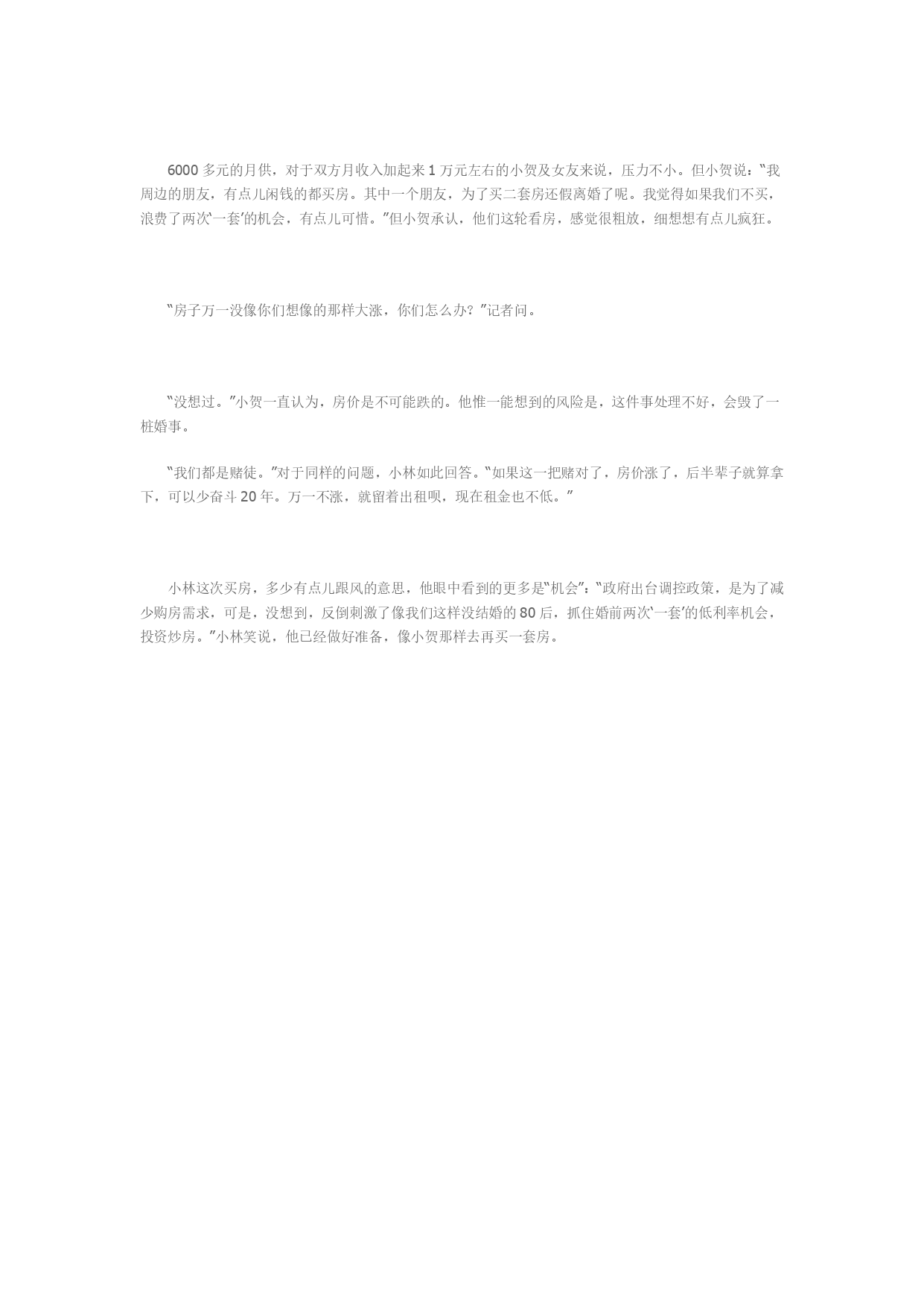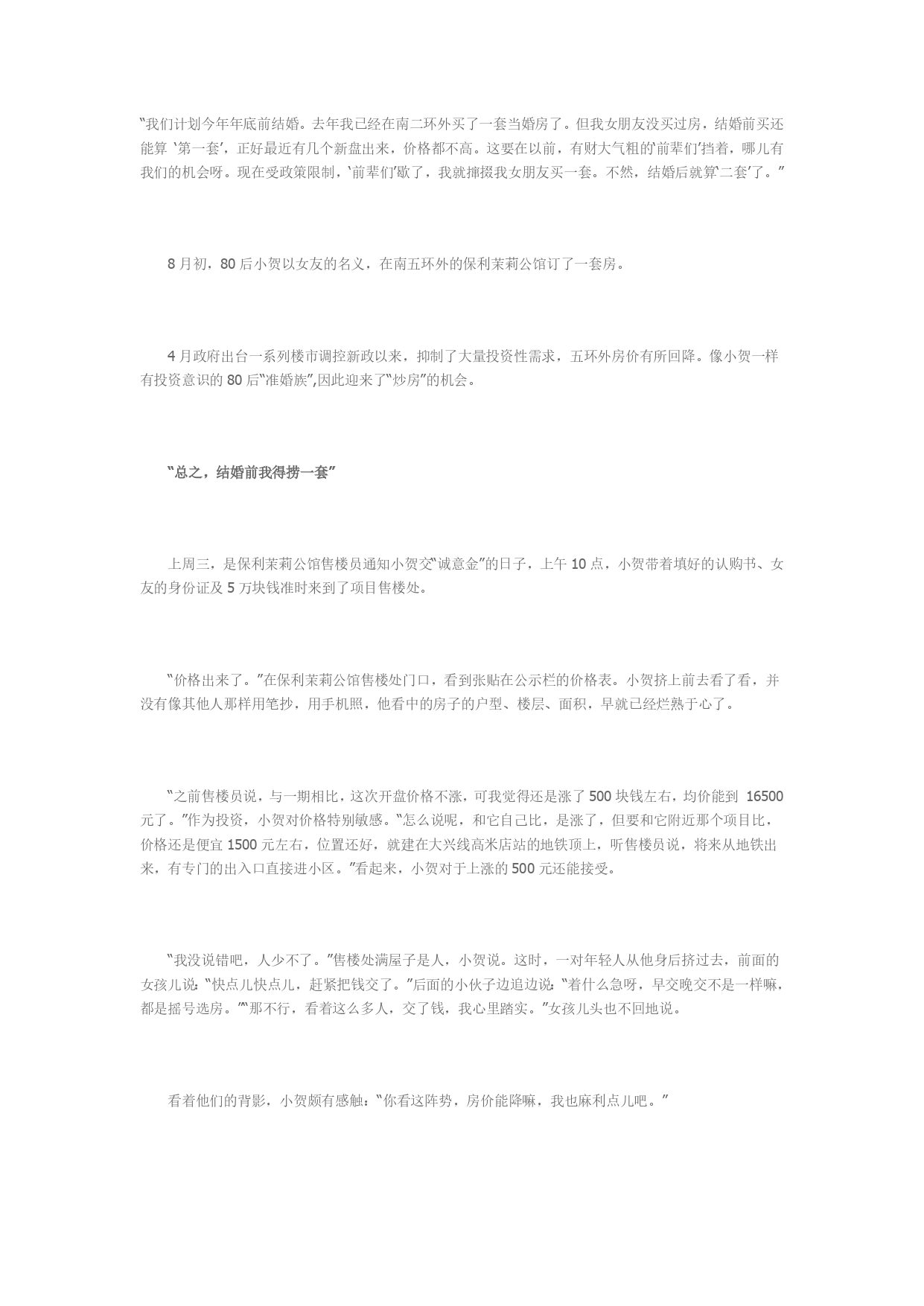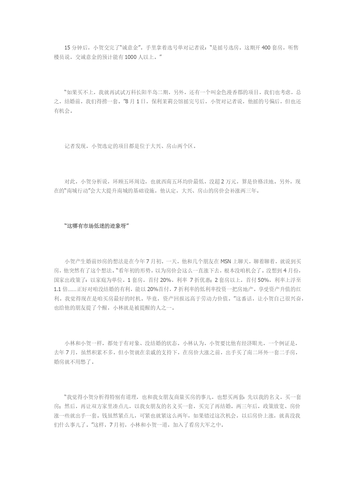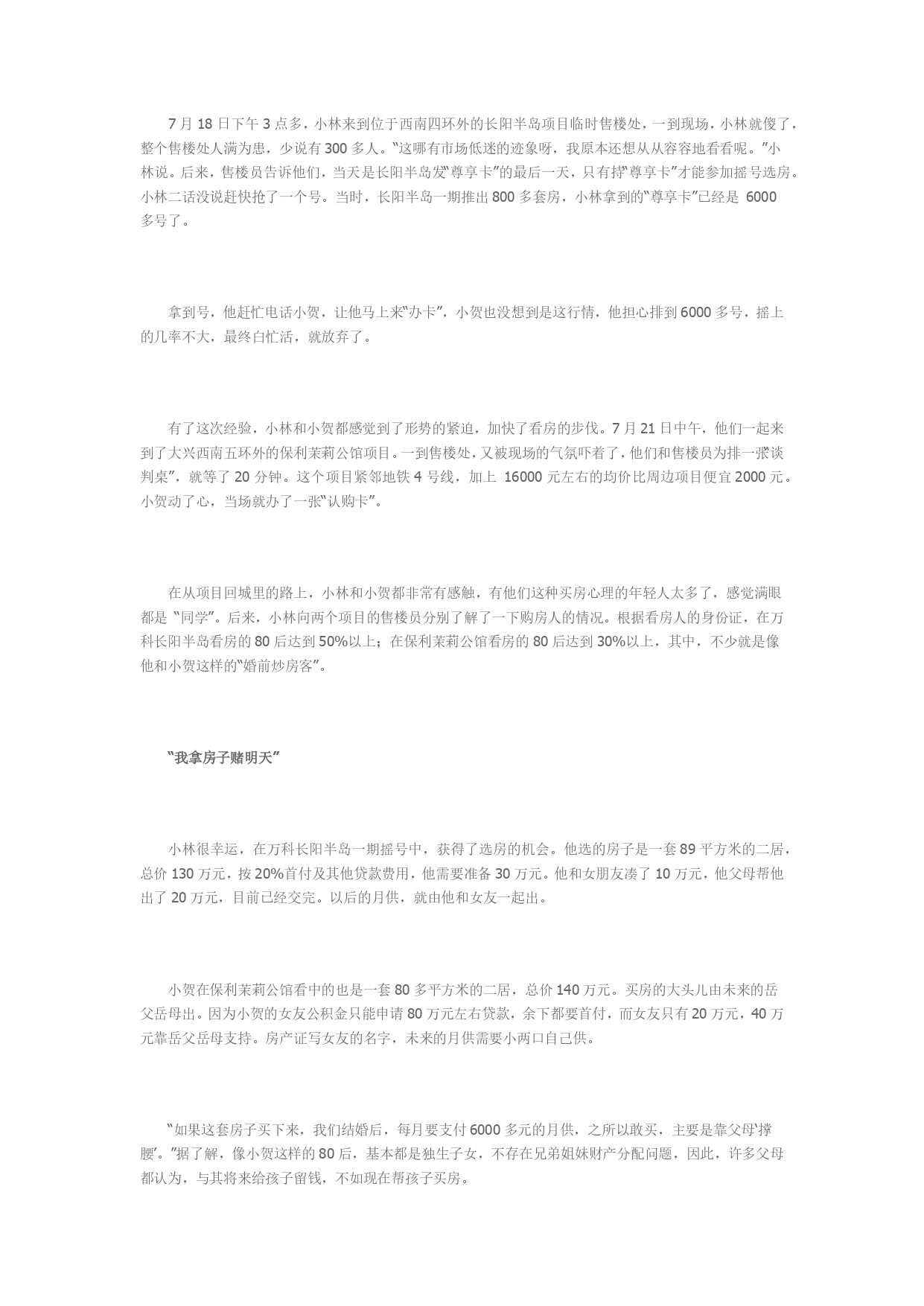 “我们计划今年年底前结婚。去年我已经在南二环外买了一套当婚房了。但我女朋友没买过房,结婚前买还能算‘第一套’,正好最近有几个新盘出来,价格都不高。这要在以前,有财大气粗的‘前辈们’挡着,哪儿有我们的机会呀。现在受政策限制,‘前辈们’歇了,我就撺掇我女朋友买一套。不然,结婚后就算‘二套’了。”8月初,80后小贺以女友的名义,在南五环外的保利茉莉公馆订了一套房。4月政府出台一系列楼市调控新政以来,抑制了大量投资性需求,五环外房价有所回降。像小贺一样有投资意识的80后“准婚族”,因此迎来了“炒房”的机会。“总之,结婚前我得捞一套”上周三,是保利茉莉公馆售楼员通知小贺交“诚意金”的日子,上午10点,小贺带着填好的认购书、女友的身份证及5万块钱准时来到了项目售楼处。“价格出来了。”在保利茉莉公馆售楼处门口,看到张贴在公示栏的价格表。小贺挤上前去看了看,并没有像其他人那样用笔抄,用手机照,他看中的房子的户型、楼层、面积,早就已经烂熟于心了。“之前售楼员说,与一期相比,这次开盘价格不涨,可我觉得还是涨了500块钱左右,均价能到16500元了。”作为投资,小贺对价格特别敏感。“怎么说呢,和它自己比,是涨了,但要和它附近那个项目比,价格还是便宜1500元左右,位置还好,就建在大兴线高米店站的地铁顶上,听售楼员说,将来从地铁出来,有专门的出入口直接进小区。”看起来,小贺对于上涨的500元还能接受。“我没说错吧,人少不了。”售楼处满屋子是人,小贺说。这时,一对年轻人从他身后挤过去,前面的女孩儿说:“快点儿快点儿,赶紧把钱交了。”后面的小伙子边追边说:“着什么急呀,早交晚交不是一样嘛,都是摇号选房。”“那不行,看着这么多人,交了钱,我心里踏实。”女孩儿头也不回地说。看着他们的背影,小贺颇有感触:“你看这阵势,房价能降嘛,我也麻利点儿吧。”15分钟后,小贺交完了“诚意金”。手里拿着选号单对记者说:“是摇号选房。这期开400套房,听售楼员说,交诚意金的预计能有1000人以上。”“如果买不上,我就再试试万科长阳半岛二期,另外,还有一个叫金色漫香郡的项目,我们也考虑,总之,结婚前,我们得捞一套。”8月1日,保利茉莉公馆摇完号后,小贺对记者说,他摇的号偏后,但也还有机会。记者发现,小贺选定的项目都是位于大兴、房山两个区。对此,小贺分析说,环顾五环周边,也就西南五环均价最低,没超2万元,算是价格洼地。另外,现在的“南城行动”会大大提升南城的基础设施,他认定,大兴、房山的房价会补涨两三年。“这哪有市场低迷的迹象呀”小贺产生婚前炒房的想法是在今年7月初。一天,他和几个朋友在MSN上聊天,聊着聊着,就说到买房,他突然有了这个想法。“看年初的形势,以为房价会这么一直涨下去,根本没咱机会了。没想到4月份,国家出政策了:以家庭为单位,1套房,首付20%,利率7折优惠;2套房以上,首付50%,利率上浮至1.1倍……正好对咱没结婚的有利,能以20%首付,7折利率的低利率投资一把房地产,享受资产升值的红利。我觉得现在是咱买房最好的时机。毕竟,资产回报远高于劳动力价值。”这番话,让小贺自己很兴奋,也给他的朋友提了个醒,小林就是被提醒的人之一。小林和小贺一样,都处于有对象、没结婚的状态。小林认为,小贺要比他有经济眼光,一个例证是,去年7月,虽然积累不多,但小贺就在亲戚的支持下,在房价大涨之前,出手买了南二环外一套二手房,婚房就不用愁了。“我觉得小贺分析得特别有道理,也和我女朋友商量买房的事儿,也想买两套:先以我的名义,买一套房;然后,再让双方家里凑点儿,以我女朋友的名义买一套,买完了再结婚。两三年后,政策放宽、房价涨一些就出手一套。钱虽然紧点儿,可紧也就紧这么两年,如果错过这次机会,以后房价上涨,就真没我们什么事儿了。”这样,7月初,小林和小贺一道,加入了看房大军之中。7月18日下午3点多,小林来到位于西南四环外的长阳半岛项目临时售楼处,一到现场,小林就傻了,整个售楼处人满为患,少说有300多人。“这哪有市场低迷的迹象呀,我原本还想从从容容地看看呢。”小林说。后来,售楼员告诉他们,当天是长阳半岛发“尊享卡”的最后一天,只有持“尊享卡”才能参加摇号选房。小林二话没说赶快抢了一个号。当时,长阳半岛一期推出800多套房,小林拿到的“尊享卡”已经是6000多号了。拿到号,他赶忙电话小贺,让他马上来“办卡”,小贺也没想到是这行情,他担心排到6000多号,摇上的几率不大,最终白忙活,就放弃了。有了这次经验,小林和小贺都感觉到了形势的紧迫,加快了看房的步伐。7月21日中午,他们一起来到了大兴西南五环外的保利茉莉公馆项目。一到售楼处,又被现场的气氛吓着了,他们和售楼员为排一张“谈判桌”,就等了20分钟。这个项目紧邻地铁4号线,加上16000元左右的均价比周边项目便宜2000元。小贺动了心,当场就办了