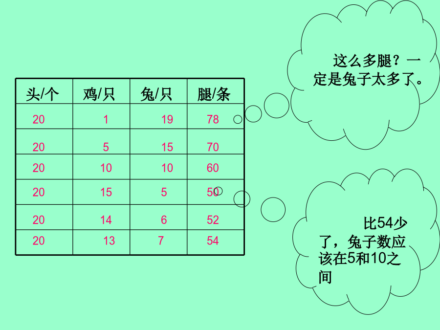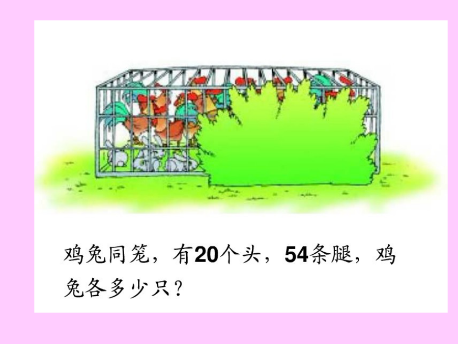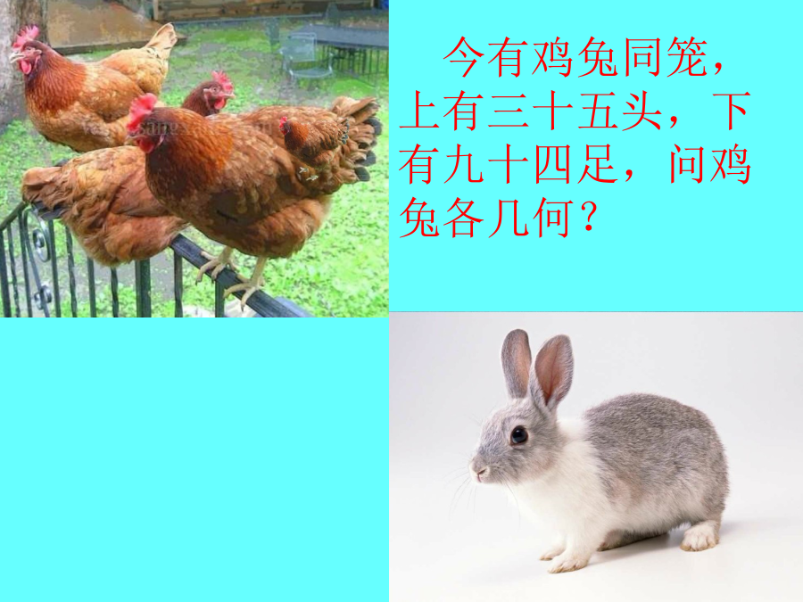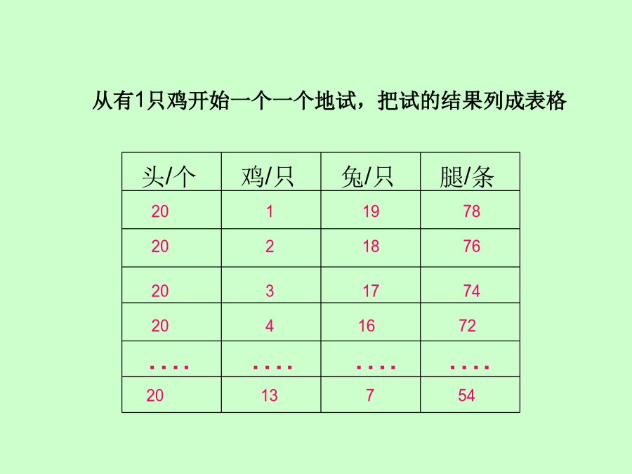 鸡兔同笼今有鸡兔同笼,上有三十五头,下有九十四足,问鸡兔各几何?从有1只鸡开始一个一个地试,把试的结果列成表格头/个头/个先画20个圆圈表示20个头今有鸡兔同笼,上有三十五头,下有九十四足,问鸡兔各几何?