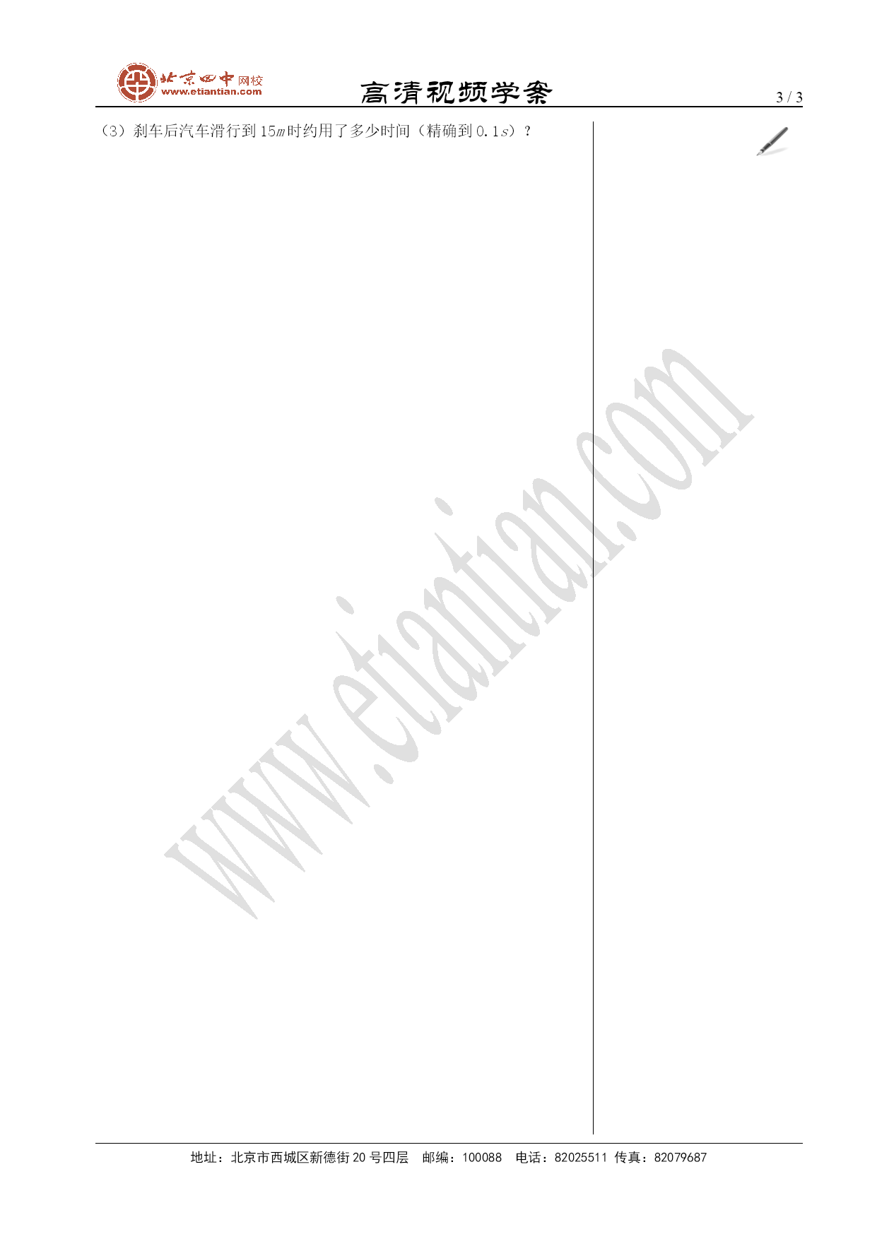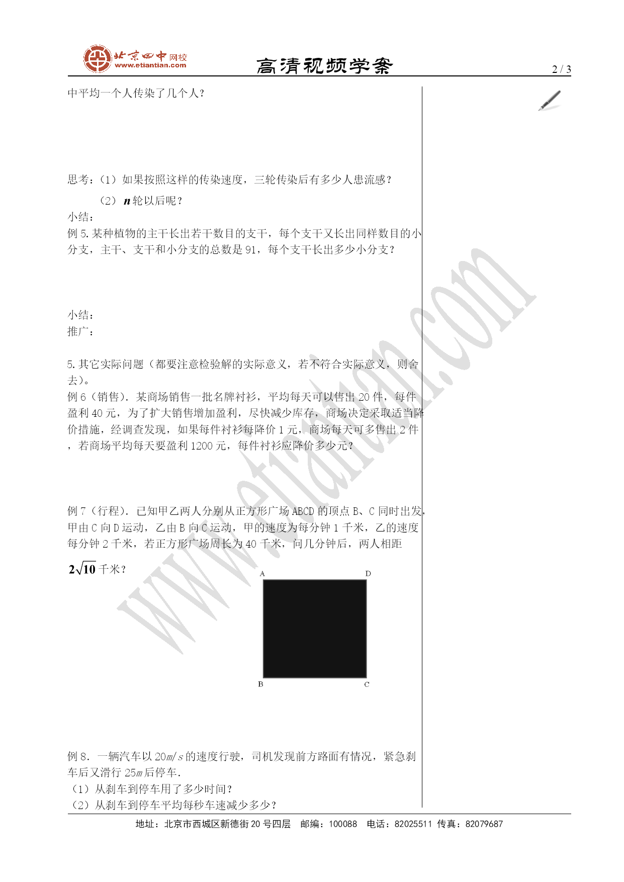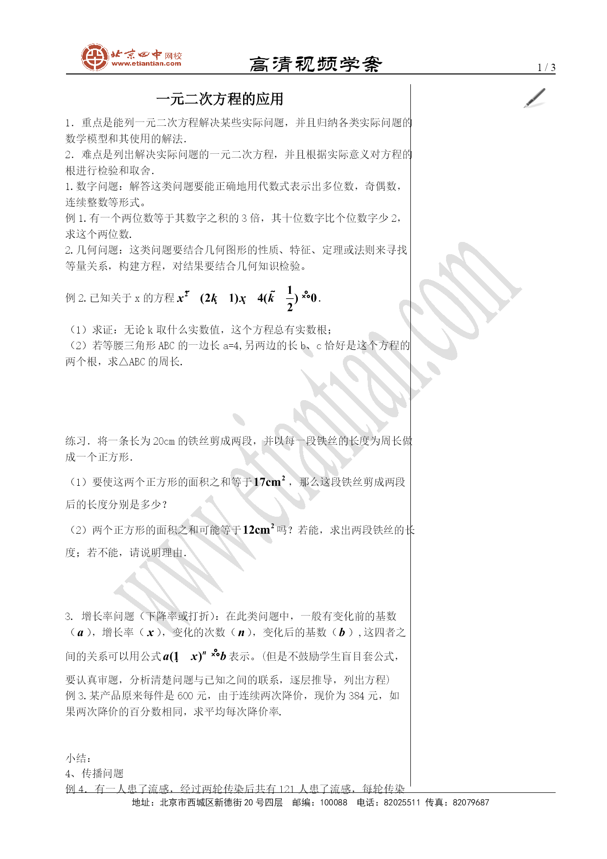 高清视频学案/NUMPAGES3地址:北京市西城区新德街20号四层邮编:100088电话:82025511传真:82079687一元二次方程的应用1.重点是能列一元二次方程解决某些实际问题,并且归纳各类实际问题的数学模型和其使用的解法.2.难点是列出解决实际问题的一元二次方程,并且根据实际意义对方程的根进行检验和取舍.1.数字问题:解答这类问题要能正确地用代数式表示出多位数,奇偶数,连续整数等形式。例1.有一个两位数等于其数字之积的3倍,其十位数字比个位数字少2,求这个两位数.2.几何问题:这类问题要结合几何图形的性质、特征、定理或法则来寻找等量关系,构建方程,对结果要结合几何知识检验。例2.已知关于x的方程.(1)求证:无论k取什么实数值,这个方程总有实数根;(2)若等腰三角形ABC的一边长a=4,另两边的长b、c恰好是这个方程的两个根,求△ABC的周长.练习.将一条长为20cm的铁丝剪成两段,并以每一段铁丝的长度为周长做成一个正方形.(1)要使这两个正方形的面积之和等于,那么这段铁丝剪成两段后的长度分别是多少?(2)两个正方形的面积之和可能等于吗?若能,求出两段铁丝的长度;若不能,请说明理由.3.增长率问题(下降率或打折):在此类问题中,一般有变化前的基数(),增长率(),变化的次数(),变化后的基数(),这四者之间的关系可以用公式表示。(但是不鼓励学生盲目套公式,要认真审题,分析清楚问题与已知之间的联系,逐层推导,列出方程)例3.某产品原来每件是600元,由于连续两次降价,现价为384元,如果两次降价的百分数相同,求平均每次降价率.小结:4、传播问题例4.有一人患了流感,经过两轮传染后共有121人患了流感,每轮传染中平均一个人传染了几个人?思考:(1)如果按照这样的传染速度,三轮传染后有多少人患流感?(2)轮以后呢?小结:例5.某种植物的主干长出若干数目的支干,每个支干又长出同样数目的小分支,主干、支干和小分支的总数是91,每个支干长出多少小分支?小结:推广:5.其它实际问题(都要注意检验解的实际意义,若不符合实际意义,则舍去)。例6(销售).某商场销售一批名牌衬衫,平均每天可以售出20件,每件盈利40元,为了扩大销售增加盈利,尽快减少库存,商场决定采取适当降价措施,经调查发现,如果每件衬衫每降价1元,商场每天可多售出2件,若商场平均每天要盈利1200元,每件衬衫应降价多少元?例7(行程).已知甲乙两人分别从正方形广场ABCD的顶点B、C同时出发,甲由C向D运动,乙由B向C运动,甲的速度为每分钟1千米,乙的速度每分钟2千米,若正方形广场周长为40千米,问几分钟后,两人相距千米?例8.一辆汽车以20m/s的速度行驶,司机发现前方路面有情况,紧急刹车后又滑行25m后停车.(1)从刹车到停车用了多少时间?(2)从刹车到停车平均每秒车速减少多少?(3)刹车后汽车滑行到15m时约用了多少时间(精确到0.1s)?