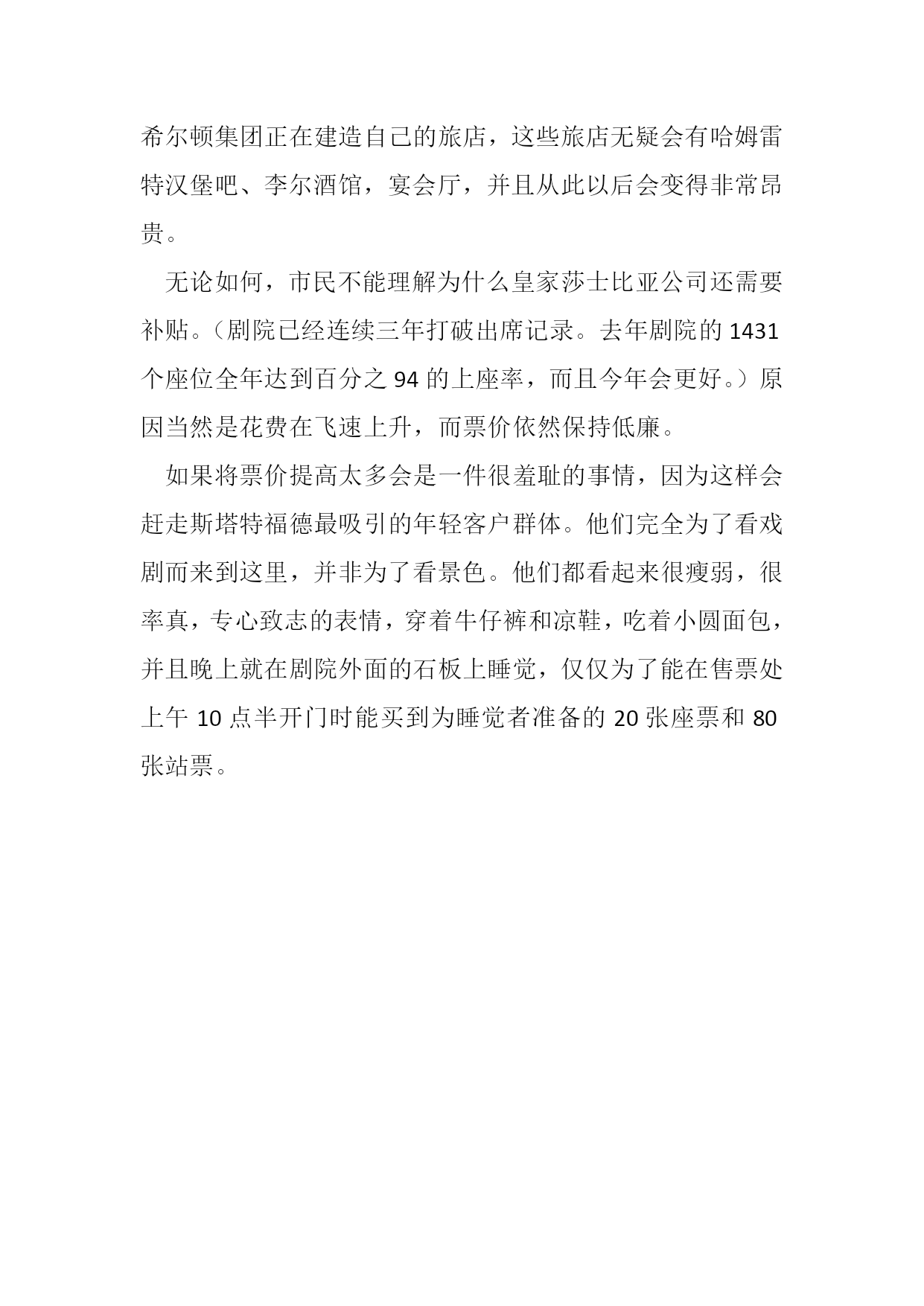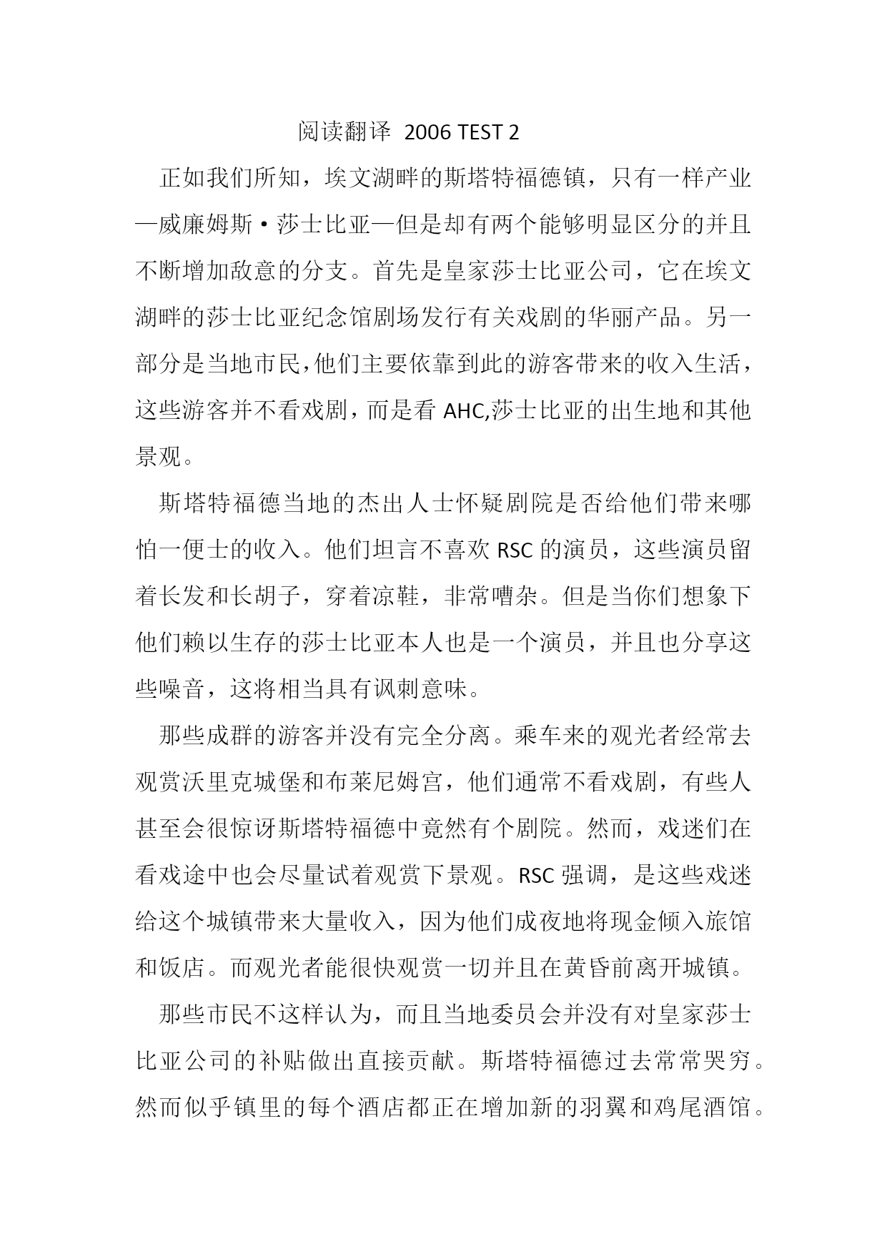 阅读翻译2006TEST2正如我们所知,埃文湖畔的斯塔特福德镇,只有一样产业—威廉姆斯·莎士比亚—但是却有两个能够明显区分的并且不断增加敌意的分支。首先是皇家莎士比亚公司,它在埃文湖畔的莎士比亚纪念馆剧场发行有关戏剧的华丽产品。另一部分是当地市民,他们主要依靠到此的游客带来的收入生活,这些游客并不看戏剧,而是看AHC,莎士比亚的出生地和其他景观。斯塔特福德当地的杰出人士怀疑剧院是否给他们带来哪怕一便士的收入。他们坦言不喜欢RSC的演员,这些演员留着长发和长胡子,穿着凉鞋,非常嘈杂。但是当你们想象下他们赖以生存的莎士比亚本人也是一个演员,并且也分享这些噪音,这将相当具有讽刺意味。那些成群的游客并没有完全分离。乘车来的观光者经常去观赏沃里克城堡和布莱尼姆宫,他们通常不看戏剧,有些人甚至会很惊讶斯塔特福德中竟然有个剧院。然而,戏迷们在看戏途中也会尽量试着观赏下景观。RSC强调,是这些戏迷给这个城镇带来大量收入,因为他们成夜地将现金倾入旅馆和饭店。而观光者能很快观赏一切并且在黄昏前离开城镇。那些市民不这样认为,而且当地委员会并没有对皇家莎士比亚公司的补贴做出直接贡献。斯塔特福德过去常常哭穷。然而似乎镇里的每个酒店都正在增加新的羽翼和鸡尾酒馆。希尔顿集团正在建造自己的旅店,这些旅店无疑会有哈姆雷特汉堡吧、李尔酒馆,宴会厅,并且从此以后会变得非常昂贵。无论如何,市民不能理解为什么皇家莎士比亚公司还需要补贴。(剧院已经连续三年打破出席记录。去年剧院的1431个座位全年达到百分之94的上座率,而且今年会更好。)原因当然是花费在飞速上升,而票价依然保持低廉。如果将票价提高太多会是一件很羞耻的事情,因为这样会赶走斯塔特福德最吸引的年轻客户群体。他们完全为了看戏剧而来到这里,并非为了看景色。他们都看起来很瘦弱,很率真,专心致志的表情,穿着牛仔裤和凉鞋,吃着小圆面包,并且晚上就在剧院外面的石板上睡觉,仅仅为了能在售票处上午10点半开门时能买到为睡觉者准备的20张座票和80张站票。