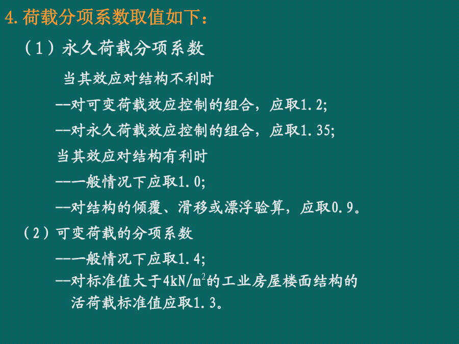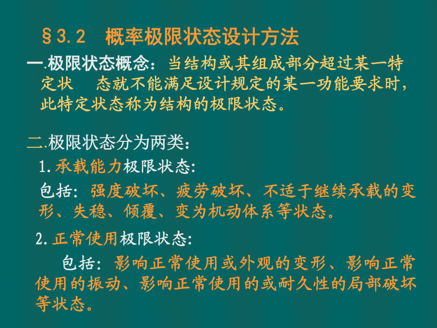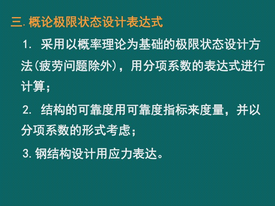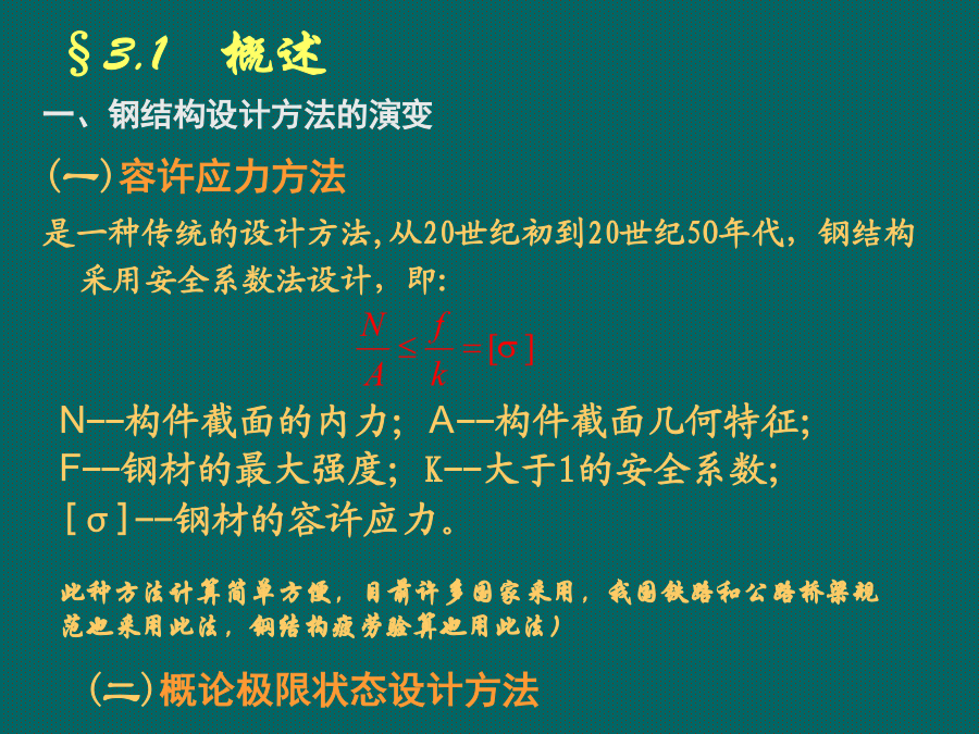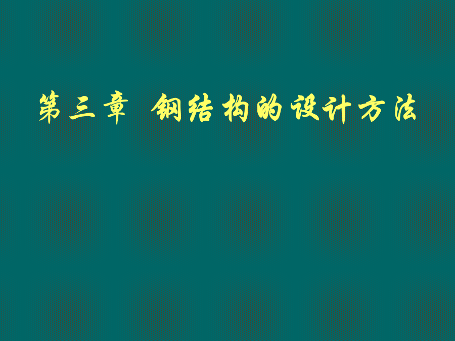 第三章钢结构的设计方法§3.1概述§3.2概率极限状态设计方法三.概论极限状态设计表达式 1.采用以概率理论为基础的极限状态设计方法(疲劳问题除外),用分项系数的表达式进行计算; 2.结构的可靠度用可靠度指标来度量,并以分项系数的形式考虑; 3.钢结构设计用应力表达。(1)永久荷载分项系数 当其效应对结构不利时 --对可变荷载效应控制的组合,应取1.2; --对永久荷载效应控制的组合,应取1.35; 当其效应对结构有利时 --一般情况下应取1.0; --对结构的倾覆、滑移或漂浮验算,应取0.9。 (2)可变荷载的分项系数 --一般情况下应取1.4; --对标准值大于4kN/m2的工业房屋楼面结构的 活荷载标准值应取1.3。对于钢结构这种单一材料,可以将荷载效应表达式用应力形式表示。(二)正常使用极限状态νQik--其他第i个可变荷载标准值在结构或构件中产 生的变形值。 [ν]--结构或结构构件的容许变形值。 2.对于受压、受拉构件,规范规定应限制其长细比, 即: λ≤[λ] 式中:λ--受压、受拉构件的计算长细比; [λ]--规范规定的受拉、受压构件容许长 细比,按规范采用。一.明确几个基本概念 (一)循环(重复)荷载——结构或构件承受的随时间变化的荷载。(二)应力循环(b)脉冲循环二.钢材的疲劳分类三.影响钢材疲劳强度的主要因素实际应力循环均形成在拉应力范围3.应力循环次数N(疲劳寿命)是指在连续重复荷载作用下应力由最大到最小的循环次数。结论:1.由试验结果,以及上述分析可知钢材的疲劳强度主要与构件和连接分类(内部缺陷、应力集中、残余应力)、应力循环次数和应力幅有关。(六)疲劳强度计算§3.5钢结构强度设计指标P31~34五.有关钢结构的规范、规程及标准简介第四层次:与施工有关的