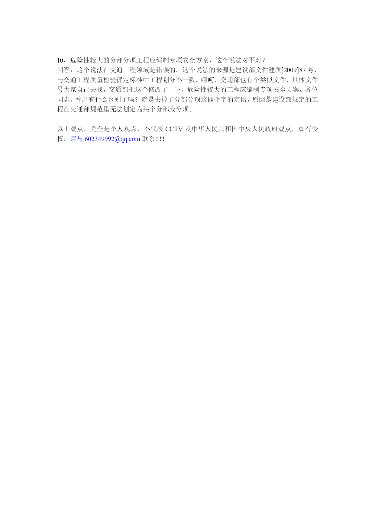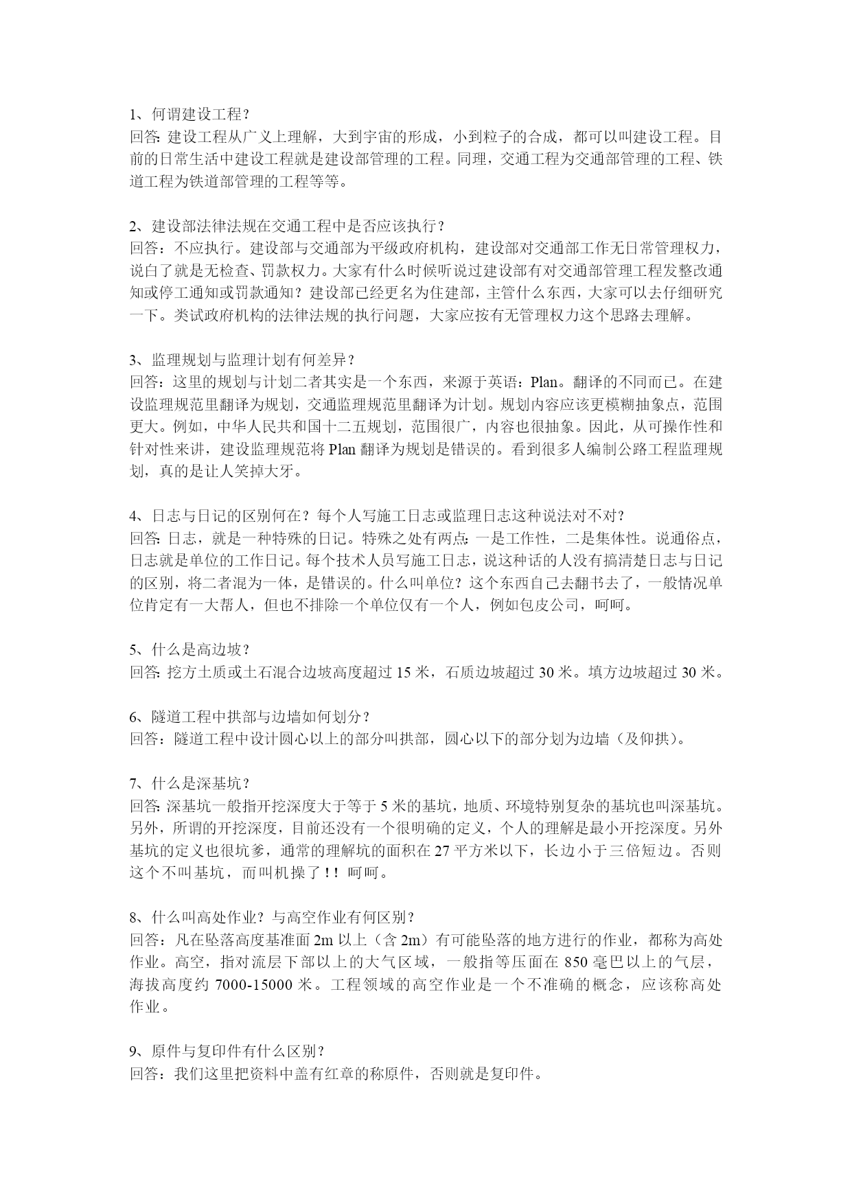 1、何谓建设工程?回答:建设工程从广义上理解,大到宇宙的形成,小到粒子的合成,都可以叫建设工程。目前的日常生活中建设工程就是建设部管理的工程。同理,交通工程为交通部管理的工程、铁道工程为铁道部管理的工程等等。2、建设部法律法规在交通工程中是否应该执行?回答:不应执行。建设部与交通部为平级政府机构,建设部对交通部工作无日常管理权力,说白了就是无检查、罚款权力。大家有什么时候听说过建设部有对交通部管理工程发整改通知或停工通知或罚款通知?建设部已经更名为住建部,主管什么东西,大家可以去仔细研究一下。类试政府机构的法律法规的执行问题,大家应按有无管理权力这个思路去理解。3、监理规划与监理计划有何差异?回答:这里的规划与计划二者其实是一个东西,来源于英语:Plan。翻译的不同而已。在建设监理规范里翻译为规划,交通监理规范里翻译为计划。规划内容应该更模糊抽象点,范围更大。例如,中华人民共和国十二五规划,范围很广,内容也很抽象。因此,从可操作性和针对性来讲,建设监理规范将Plan翻译为规划是错误的。看到很多人编制公路工程监理规划,真的是让人笑掉大牙。4、日志与日记的区别何在?每个人写施工日志或监理日志这种说法对不对?回答:日志,就是一种特殊的日记。特殊之处有两点:一是工作性,二是集体性。说通俗点,日志就是单位的工作日记。每个技术人员写施工日志,说这种话的人没有搞清楚日志与日记的区别,将二者混为一体,是错误的。什么叫单位?这个东西自己去翻书去了,一般情况单位肯定有一大帮人,但也不排除一个单位仅有一个人,例如包皮公司,呵呵。5、什么是高边坡?回答:挖方土质或土石混合边坡高度超过15米,石质边坡超过30米。填方边坡超过30米。6、隧道工程中拱部与边墙如何划分?回答:隧道工程中设计圆心以上的部分叫拱部,圆心以下的部分划为边墙(及仰拱)。7、什么是深基坑?回答:深基坑一般指开挖深度大于等于5米的基坑,地质、环境特别复杂的基坑也叫深基坑。另外,所谓的开挖深度,目前还没有一个很明确的定义,个人的理解是最小开挖深度。另外基坑的定义也很坑爹,通常的理解坑的面积在27平方米以下,长边小于三倍短边。否则这个不叫基坑,而叫机操了!!呵呵。8、什么叫高处作业?与高空作业有何区别?回答:凡在坠落高度基准面2m以上(含2m)有可能坠落的地方进行的作业,都称为高处作业。高空,指对流层下部以上的大气区域,一般指等压面在850毫巴以上的气层,海拔高度约7000-15000米。工程领域的高空作业是一个不准确的概念,应该称高处作业。9、原件与复印件有什么区别?回答:我们这里把资料中盖有红章的称原件,否则就是复印件。10、危险性较大的分部分项工程应编制专项安全方案,这个说法对不对?回答:这个说法在交通工程领域是错误的。这个说法的来源是建设部文件建质[2009]87号,与交通工程质量检验评定标准中工程划分不一致。呵呵,交通部也有个类似文件,具体文件号大家自己去找。交通部把这个修改了一下,危险性较大的工程应编制专项安全方案。各位同志,看出有什么区别了吗?就是去掉了分部分项这四个字的定语。原因是建设部规定的工程在交通部规范里无法划定为某个分部或分项。以上观点,完全是个人观点,不代表CCTV及中华人民共和国中央人民政府观点,如有侵权,HYPERLINK"mailto:请与602349992@qq.com"请与602349992@qq.com联系!!!