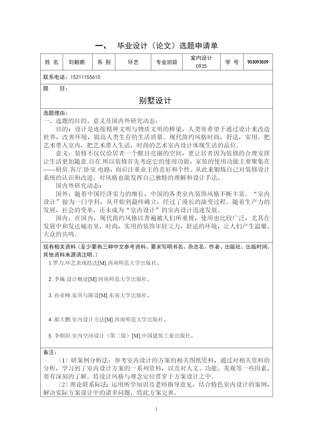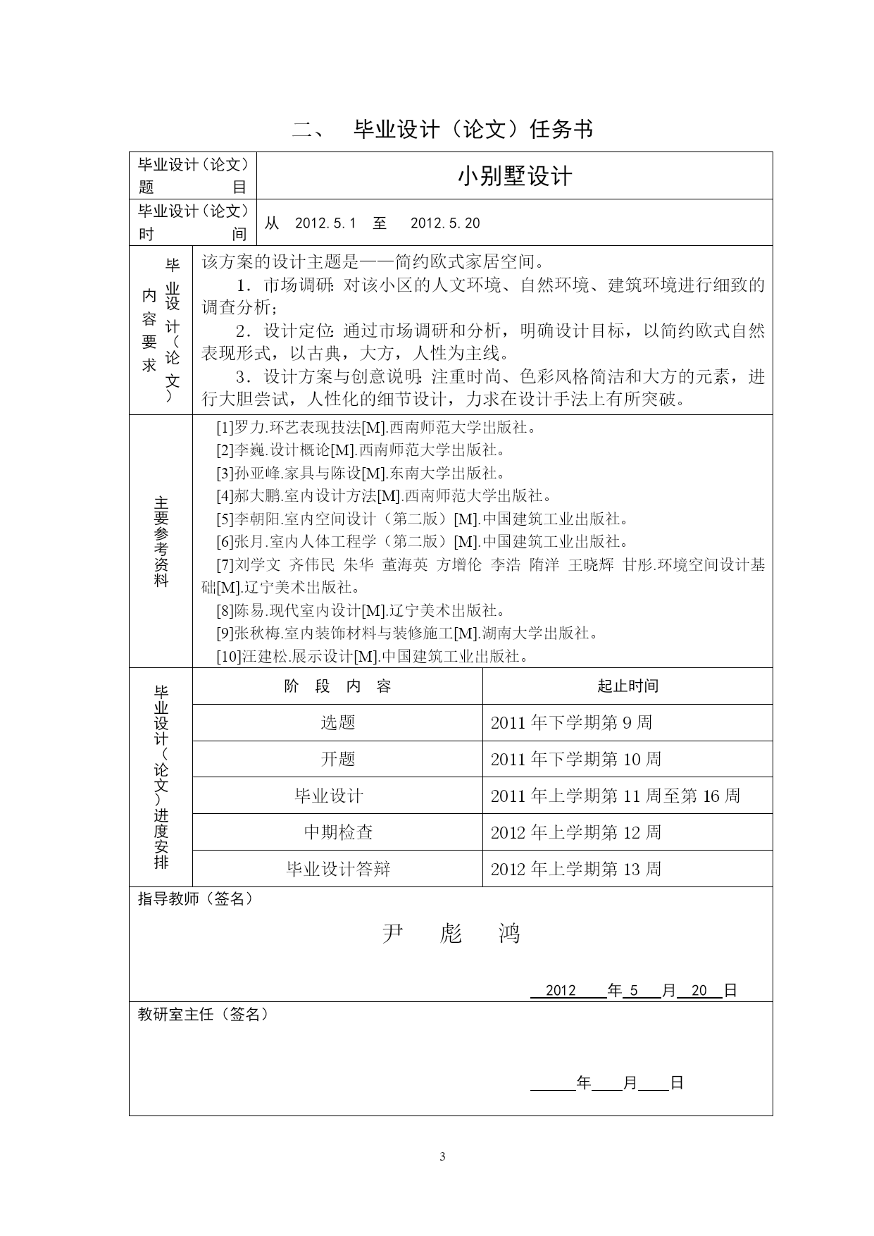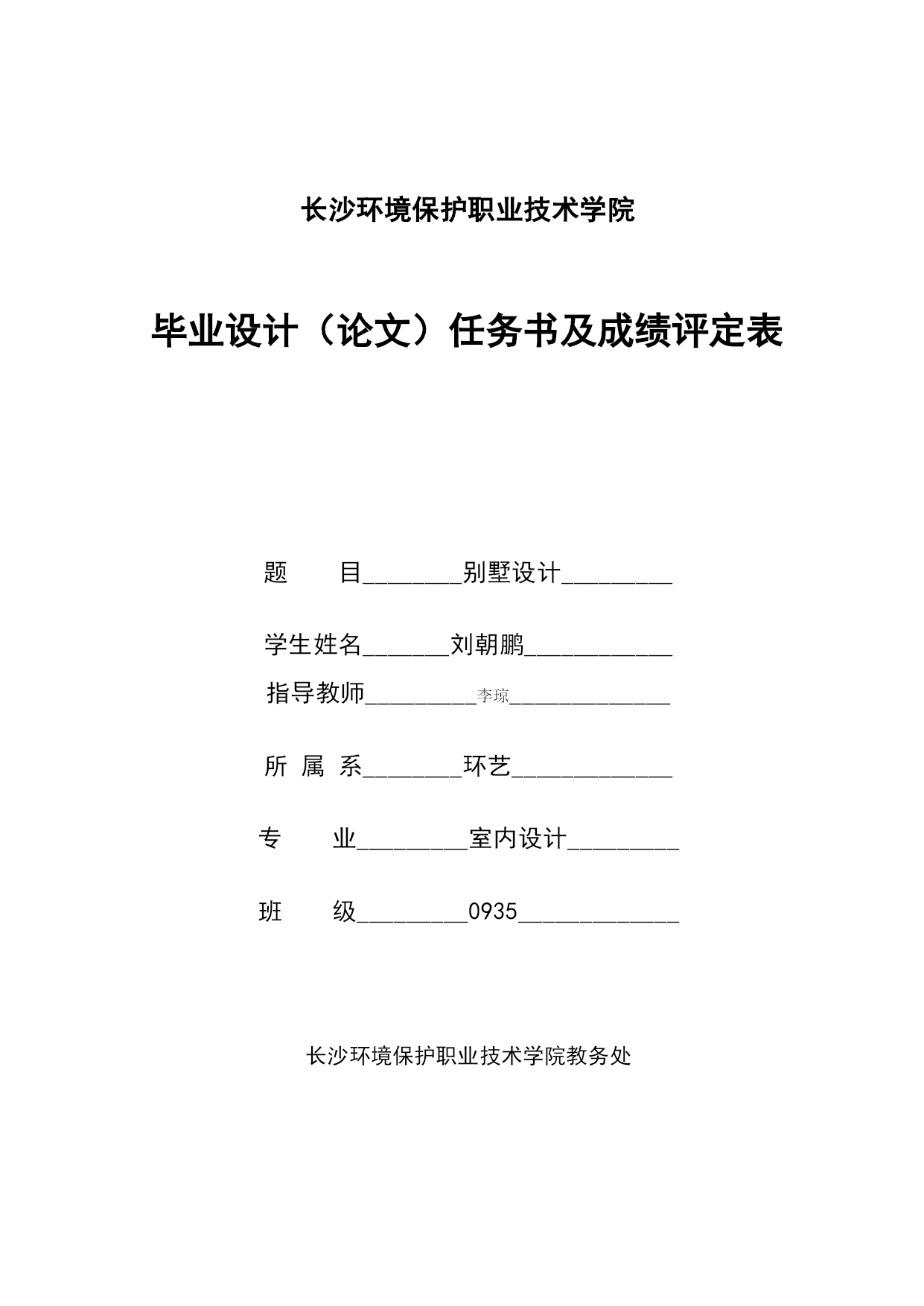 长沙环境保护职业技术学院毕业设计(论文)任务书及成绩评定表题目________别墅设计_________学生姓名_______刘朝鹏____________指导教师_________李琼_____________所属系________环艺_____________专业_________室内设计_________班级_________0935_____________长沙环境保护职业技术学院教务处毕业设计(论文)选题申请单姓名刘朝鹏系别环艺专业班级室内设计0935学号903093509联系电话:15211155610题目:别墅设计选题理由:一、选题的目的、意义及国内外研究动态:目的:设计是连接精神文明与物质文明的桥梁,人类寄希望于通过设计来改造世界,改善环境,提高人类生存的生活质量。现代简约风格时尚,舒适,实用。把艺术带入室内,把艺术带入生活,时尚的艺术室内设计体现生活的品位。意义:装修不仅仅给居者一个醒目亮丽的空间,更让居者因为装修的合理安排让生活更加随意.自在.所以装修首先考虑它的使用功能,家装的使用功能主要聚集在——厨房.客厅.卧室.电路,而后注重业主的喜好和个性。从此来锻炼自己对装修设计系统的认识和改进。对风格也能发挥自己独特的理解和设计手法。国内外研究动态:国外:随着中国经济实力的增长,中国的各类室内装饰风格不断丰富。“室内HYPERLINK"http://job.tgnet.cn/Sub06.aspx"\t"_blank"设计”做为一门学科,从开始到最终确立,经过了漫长的演变过程。随着生产力的发展,社会的变革,还未成为“室内设计”的室内设计迅速发展。国内:在国内,现代简约风格以普遍被人们所重视,使用也比较广泛,尤其在发展中和发达城市里,时尚,实用的装饰年轻又力,舒适的环境,让人们产生温馨、大众的共鸣。现有相关资料(至少要有三种中文参考资料。要求写明书名、杂志名、作者、出版社、出版时间。其他资料来源请注明。)罗力.环艺表现技法[M].西南师范大学出版社。2.李巍.设计概论[M].西南师范大学出版社。3.孙亚峰.家具与陈设[M].东南大学出版社。4.郝大鹏.室内设计方法[M].西南师范大学出版社。5.李朝阳.室内空间设计(第二版)[M].中国建筑工业出版社。备注:〔1〕研案例分析法:参考室内设计的方案的相关图纸资料,通过对相关资料的分析,学习到了室内设计方案的一系列资料,以及对人文、功能、美观等一些因素,要有深刻的了解。将设计风格与理念定位贯穿于方案设计之中。〔2〕理论联系际法:运用所学知识及老师指导意见,结合特色室内设计的案例,解决实际方案设计中的诸多问题,将此方案完善。〔3〕文献资料法:通过书籍、网络等查阅大量关于家装的资料。访谈法:通过与老师的多次交谈对方案的修改与确定,对整个家装室内运用大方向的把握。毕业设计(论文)任务书毕业设计(论文)题目小别墅设计毕业设计(论文)时间从2012.5.1至2012.5.20毕业设计(论文)内容要求该方案的设计主题是——简约欧式家居空间。1.市场调研:对该小区的人文环境、自然环境、建筑环境进行细致的调查分析;2.设计定位:通过市场调研和分析,明确设计目标,以简约欧式自然表现形式,以古典,大方,人性为主线。3.设计方案与创意说明:注重时尚、色彩风格简洁和大方的元素,进行大胆尝试,人性化的细节设计,力求在设计手法上有所突破。主要参考资料[1]罗力.环艺表现技法[M].西南师范大学出版社。[2]李巍.设计概论[M].西南师范大学出版社。[3]孙亚峰.家具与陈设[M].东南大学出版社。[4]郝大鹏.室内设计方法[M].西南师范大学出版社。[5]李朝阳.室内空间设计(第二版)[M].中国建筑工业出版社。[6]张月.室内人体工程学(第二版)[M].中国建筑工业出版社。[7]刘学文齐伟民朱华董海英方增伦李浩隋洋王晓辉甘彤.环境空间设计基础[M].辽宁美术出版社。[8]陈易.现代室内设计[M].辽宁美术出版社。[9]张秋梅.室内装饰材料与装修施工[M].湖南大学出版社。[10]汪建松.展示设计[M].中国建筑工业出版社。毕业设计(论文)进度安排阶段内容起止时间选题2011年下学期第9周开题2011年下学期第10周毕业设计2011年上学期第11周至第16周中期检查2012年上学期第12周毕业设计答辩2012年上学期第13周指导教师(签名)尹彪鸿2012年5月20日教研室主任(签名)年月日系主任(签名)年月日毕业设计(论文)成绩评定表指导教师评语指导教师(签名):年月日设计(论文)评阅人评语建议成绩:评阅人(签名):年月日答辩记录及意见成绩评定:答辩委员会(小组)负责人(签名):年月日附表1:毕业设计(论文)评分表附表1:毕业设计(论文)评分表毕业设计/论文评分表