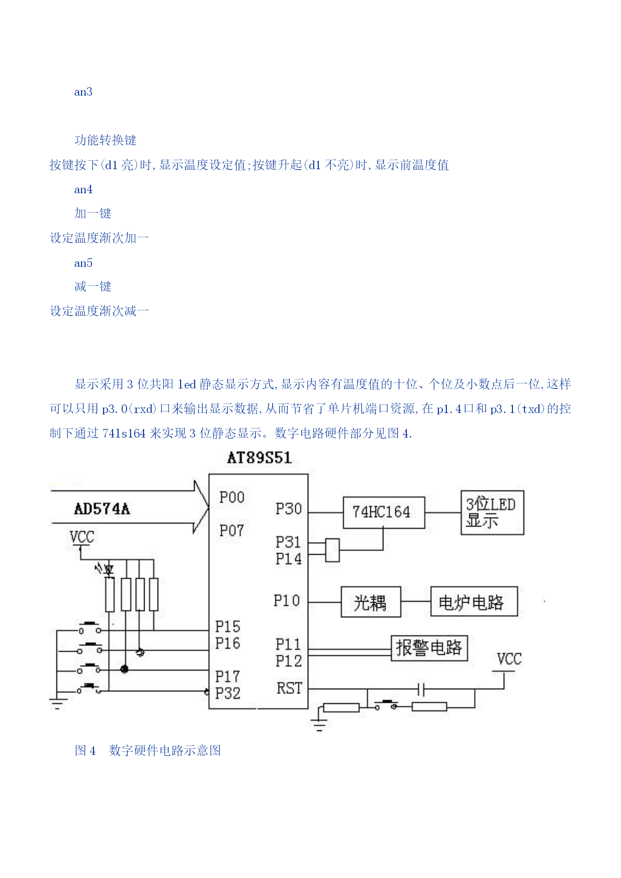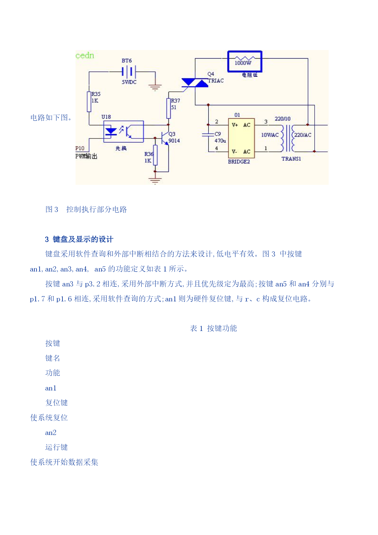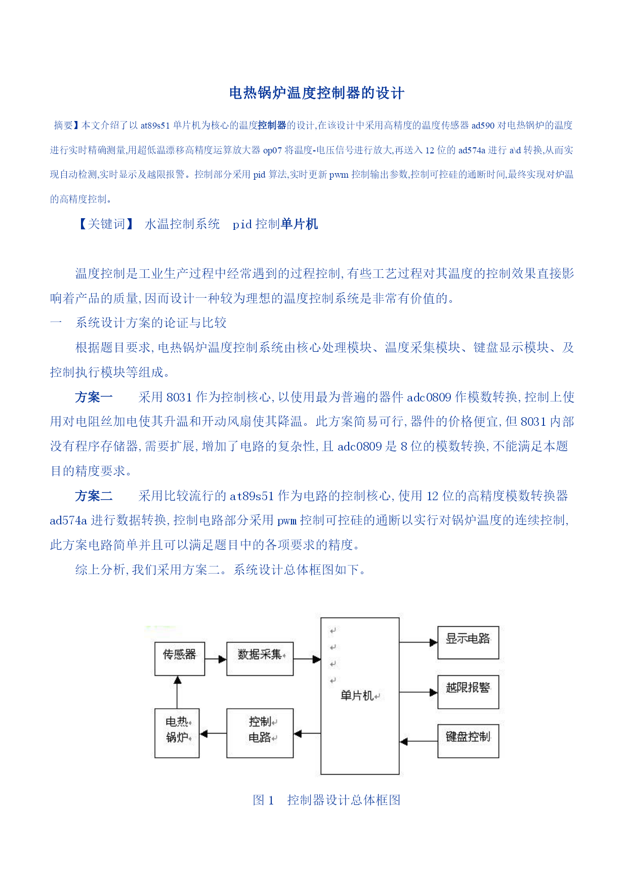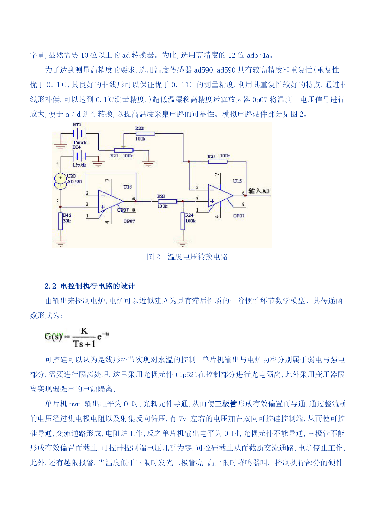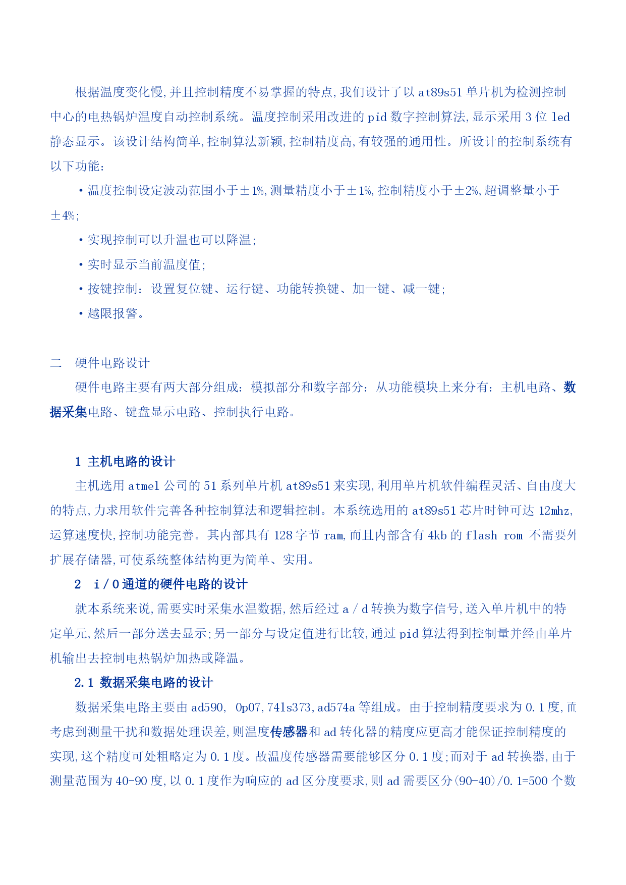 电热锅炉温度控制器的设计摘要】本文介绍了以at89s51单片机为核心的温度控制器的设计,在该设计中采用高精度的温度传感器ad590对电热锅炉的温度进行实时精确测量,用超低温漂移高精度运算放大器op07将温度-电压信号进行放大,再送入12位的ad574a进行a\d转换,从而实现自动检测,实时显示及越限报警。控制部分采用pid算法,实时更新pwm控制输出参数,控制可控硅的通断时间,最终实现对炉温的高精度控制。【关键词】水温控制系统pid控制单片机温度控制是工业生产过程中经常遇到的过程控制,有些工艺过程对其温度的控制效果直接影响着产品的质量,因而设计一种较为理想的温度控制系统是非常有价值的。一系统设计方案的论证与比较根据题目要求,电热锅炉温度控制系统由核心处理模块、温度采集模块、键盘显示模块、及控制执行模块等组成。方案一采用8031作为控制核心,以使用最为普遍的器件adc0809作模数转换,控制上使用对电阻丝加电使其升温和开动风扇使其降温。此方案简易可行,器件的价格便宜,但8031内部没有程序存储器,需要扩展,增加了电路的复杂性,且adc0809是8位的模数转换,不能满足本题目的精度要求。方案二采用比较流行的at89s51作为电路的控制核心,使用12位的高精度模数转换器ad574a进行数据转换,控制电路部分采用pwm控制可控硅的通断以实行对锅炉温度的连续控制,此方案电路简单并且可以满足题目中的各项要求的精度。综上分析,我们采用方案二。系统设计总体框图如下。图1控制器设计总体框图根据温度变化慢,并且控制精度不易掌握的特点,我们设计了以at89s51单片机为检测控制中心的电热锅炉温度自动控制系统。温度控制采用改进的pid数字控制算法,显示采用3位led静态显示。该设计结构简单,控制算法新颖,控制精度高,有较强的通用性。所设计的控制系统有以下功能:·温度控制设定波动范围小于±1%,测量精度小于±1%,控制精度小于±2%,超调整量小于±4%;·实现控制可以升温也可以降温;·实时显示当前温度值;·按键控制:设置复位键、运行键、功能转换键、加一键、减一键;·越限报警。二硬件电路设计硬件电路主要有两大部分组成:模拟部分和数字部分:从功能模块上来分有:主机电路、数据采集电路、键盘显示电路、控制执行电路。1主机电路的设计主机选用atmel公司的51系列单片机at89s51来实现,利用单片机软件编程灵活、自由度大的特点,力求用软件完善各种控制算法和逻辑控制。本系统选用的at89s51芯片时钟可达12mhz,运算速度快,控制功能完善。其内部具有128字节ram,而且内部含有4kb的flashrom不需要外扩展存储器,可使系统整体结构更为简单、实用。2i/0通道的硬件电路的设计就本系统来说,需要实时采集水温数据,然后经过a/d转换为数字信号,送入单片机中的特定单元,然后一部分送去显示;另一部分与设定值进行比较,通过pid算法得到控制量并经由单片机输出去控制电热锅炉加热或降温。2.1数据采集电路的设计数据采集电路主要由ad590,0p07,74ls373,ad574a等组成。由于控制精度要求为0.1度,而考虑到测量干扰和数据处理误差,则温度传感器和ad转化器的精度应更高才能保证控制精度的实现,这个精度可处粗略定为0.1度。故温度传感器需要能够区分0.1度;而对于ad转换器,由于测量范围为40-90度,以0.1度作为响应的ad区分度要求,则ad需要区分(90-40)/0.1=500个数字量,显然需要10位以上的ad转换器。为此,选用高精度的12位ad574a。为了达到测量高精度的要求,选用温度传感器ad590,ad590具有较高精度和重复性(重复性优于0.1℃,其良好的非线形可以保证优于0.1℃的测量精度,利用其重复性较好的特点,通过非线形补偿,可以达到0.1℃测量精度.)超低温漂移高精度运算放大器0p07将温度一电压信号进行放大,便于a/d进行转换,以提高温度采集电路的可靠性。模拟电路硬件部分见图2。图2温度电压转换电路2.2电控制执行电路的设计由输出来控制电炉,电炉可以近似建立为具有滞后性质的一阶惯性环节数学模型。其传递函数形式为:可控硅可以认为是线形环节实现对水温的控制。单片机输出与电炉功率分别属于弱电与强电部分,需要进行隔离处理,这里采用光耦元件tlp521在控制部分进行光电隔离,此外采用变压器隔离实现弱强电的电源隔离。单片机pwm输出电平为0时,光耦元件导通,从而使三极管形成有效偏置而导通,通过整流桥的电压经过集电极电阻以及射集反向偏压,有7v左右的电压加在双向可控硅控制端,从而使可控硅导通,交流通路形成,电阻炉工作;反之单片机输出电平为0时,光耦元件不能导通,三极管不能形成有效偏置而截止,可控硅控制端电压几乎为零,可控硅截止从而截断交流通路,电炉停
