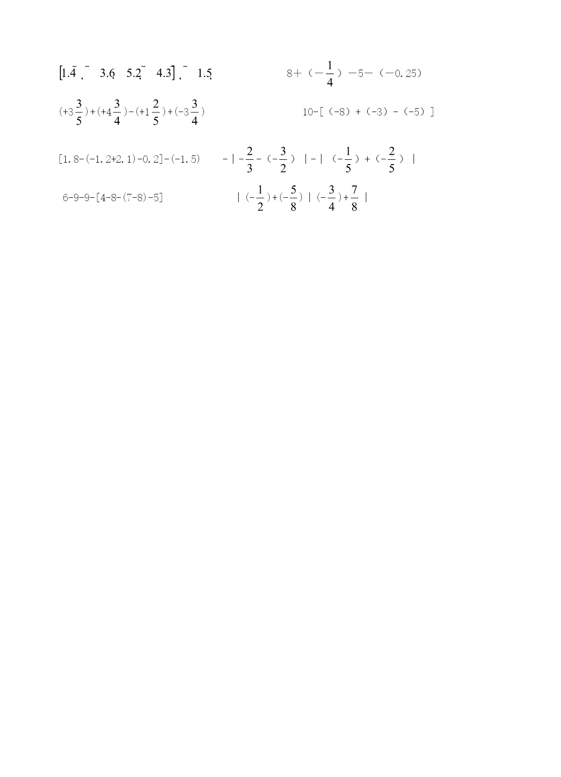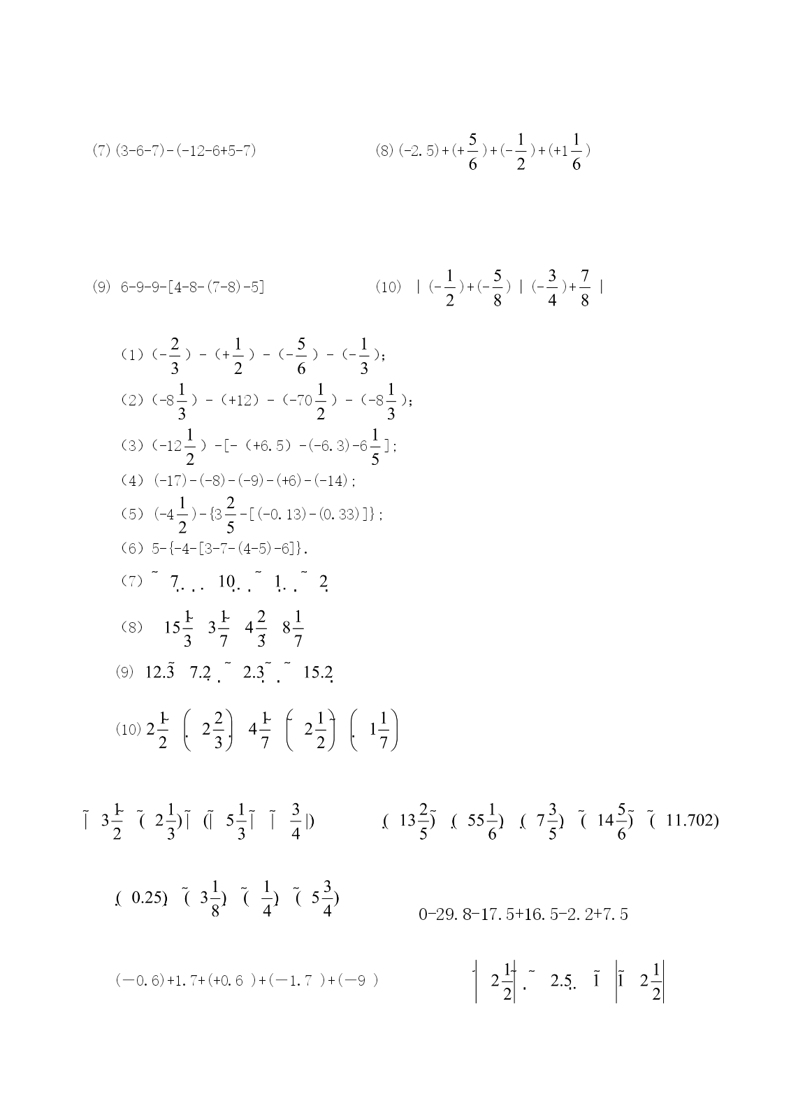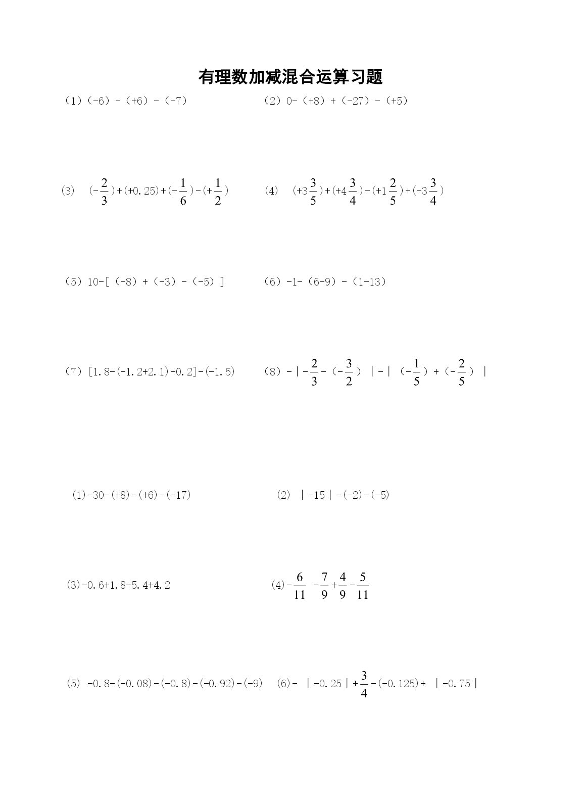 有理数加减混合运算习题(1)(-6)-(+6)-(-7)(2)0-(+8)+(-27)-(+5)(3)(-)+(+0.25)+(-)-(+)(4)(+3)+(+4)-(+1)+(-3)(5)10-[(-8)+(-3)-(-5)](6)-1-(6-9)-(1-13)(7)[1.8-(-1.2+2.1)-0.2]-(-1.5)(8)-︱--(-)︱-︱(-)+(-)︱(1)-30-(+8)-(+6)-(-17)(2)︱-15︱-(-2)-(-5)(3)-0.6+1.8-5.4+4.2(4)--+-(5)-0.8-(-0.08)-(-0.8)-(-0.92)-(-9)(6)-︱-0.25︱+-(-0.125)+︱-0.75︱(7)(3-6-7)-(-12-6+5-7)(8)(-2.5)+(+)+(-)+(+1)(9)6-9-9-[4-8-(7-8)-5](10)︱(-)+(-)︱(-)+︱(1)(-)-(+)-(-)-(-);(2)(-8)-(+12)-(-70)-(-8);(3)(-12)-[-(+6.5)-(-6.3)-6];(4)(-17)-(-8)-(-9)-(+6)-(-14);(5)(-4)-{3-[(-0.13)-(0.33)]};(6)5-{-4-[3-7-(4-5)-6]}.(7)(8)(9)(10)0-29.8-17.5+16.5-2.2+7.5(-0.6)+1.7+(+0.6)+(-1.7)+(-9)8+(-)-5-(-0.25)(+3)+(+4)-(+1)+(-3)10-[(-8)+(-3)-(-5)][1.8-(-1.2+2.1)-0.2]-(-1.5)-︱--(-)︱-︱(-)+(-)︱6-9-9-[4-8-(7-8)-5]︱(-)+(-)︱(-)+︱