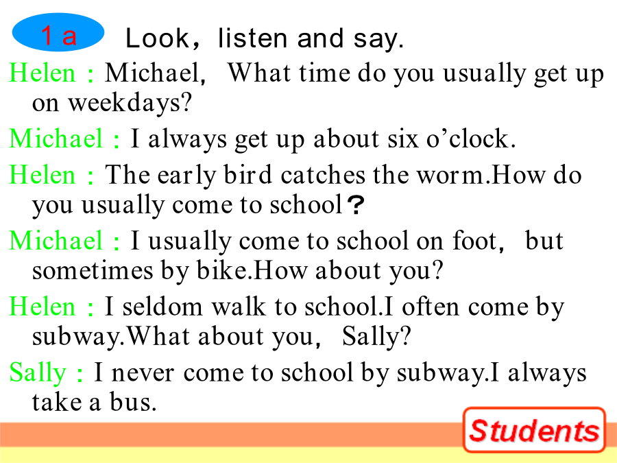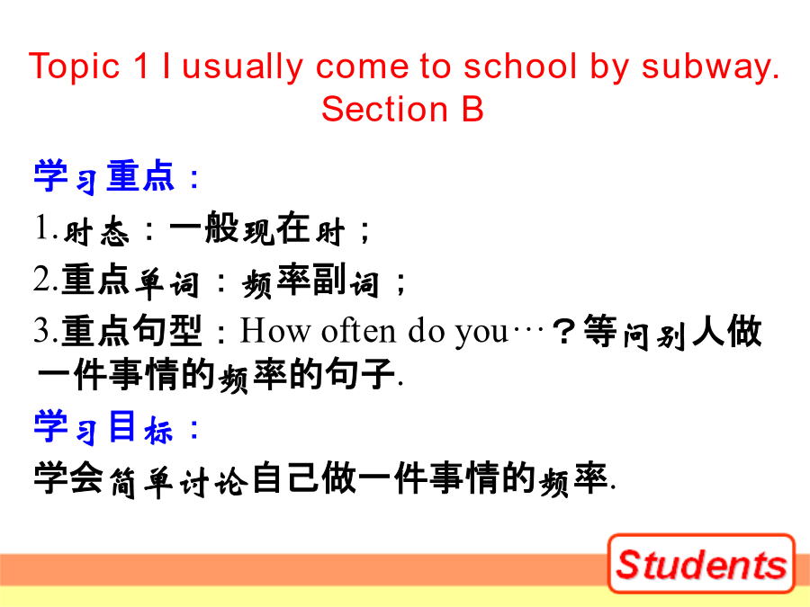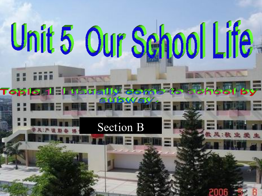 Unit5OurSchoolLifeTopic1Iusuallycometoschoolbysubway.SectionB单词学习Look,listenandsay.课文注释课文注释1b1c2a2a2a2a2b33333333Topic1Iusuallycometoschoolbysubway.SectionB