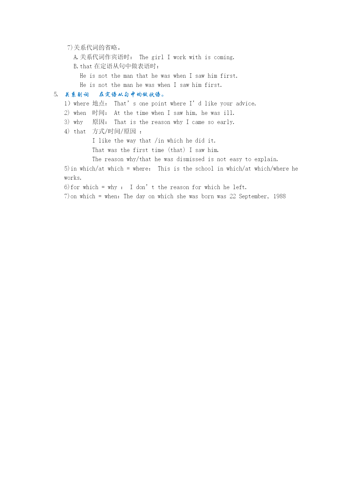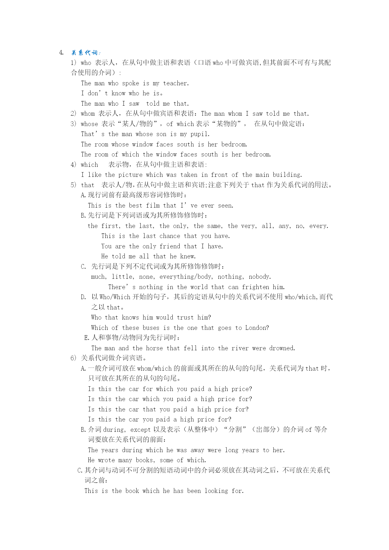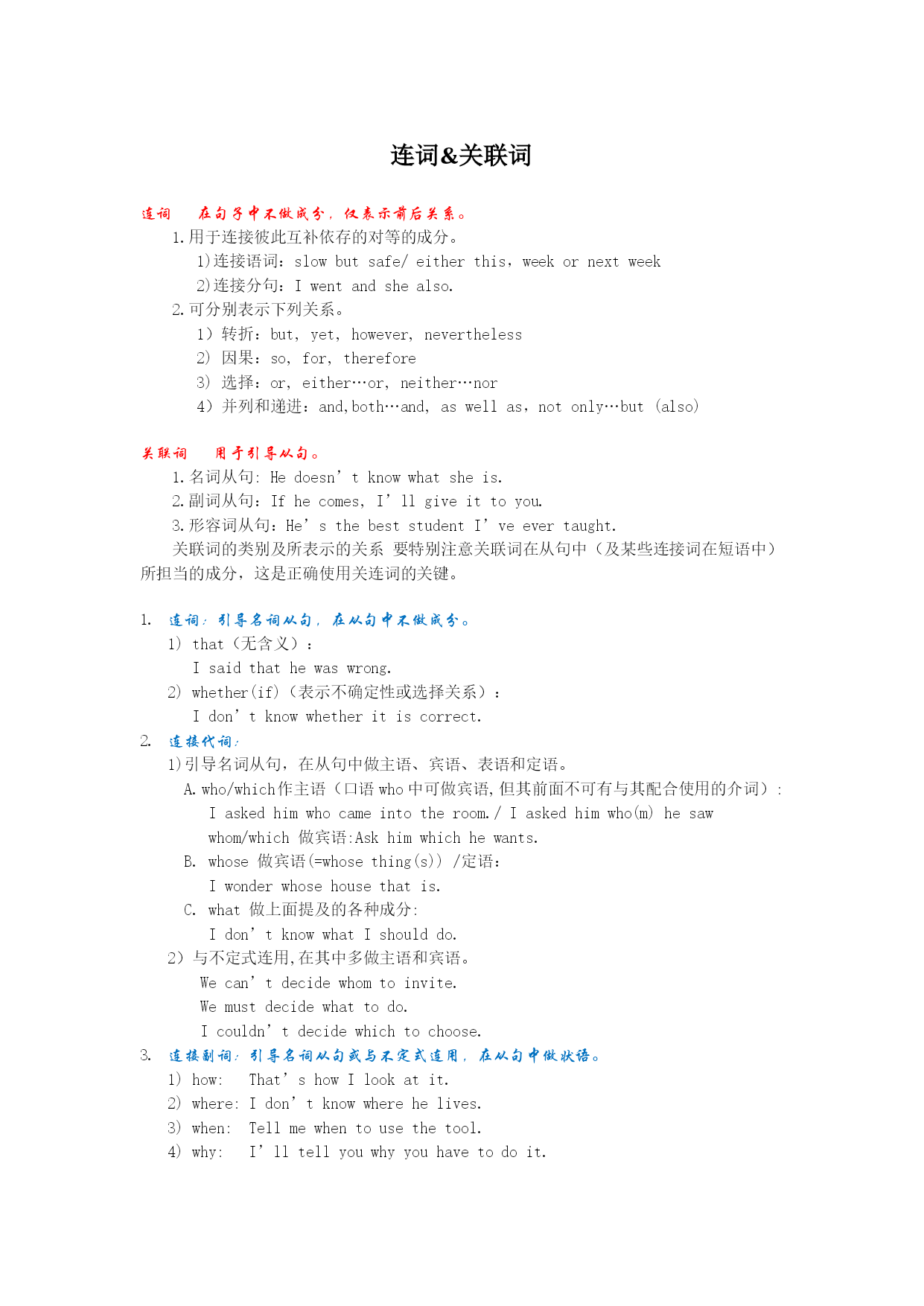 连词&关联词连词在句子中不做成分,仅表示前后关系。1.用于连接彼此互补依存的对等的成分。1)连接语词:slowbutsafe/eitherthis,weekornextweek2)连接分句:Iwentandshealso.2.可分别表示下列关系。1)转折:but,yet,however,nevertheless2)因果:so,for,therefore3)选择:or,either…or,neither…nor4)并列和递进:and,both…and,aswellas,notonly…but(also)关联词用于引导从句。1.名词从句:Hedoesn’tknowwhatsheis.2.副词从句:Ifhecomes,I’llgiveittoyou.3.形容词从句:He’sthebeststudentI’veevertaught.关联词的类别及所表示的关系要特别注意关联词在从句中(及某些连接词在短语中)所担当的成分,这是正确使用关连词的关键。连词:引导名词从句,在从句中不做成分。1)that(无含义):Isaidthathewaswrong.2)whether(if)(表示不确定性或选择关系):Idon’tknowwhetheritiscorrect.连接代词:1)引导名词从句,在从句中做主语、宾语、表语和定语。A.who/which作主语(口语who中可做宾语,但其前面不可有与其配合使用的介词):Iaskedhimwhocameintotheroom./Iaskedhimwho(m)hesawwhom/which做宾语:Askhimwhichhewants.B.whose做宾语(=whosething(s))/定语:Iwonderwhosehousethatis.C.what做上面提及的各种成分:Idon’tknowwhatIshoulddo.2)与不定式连用,在其中多做主语和宾语。Wecan’tdecidewhomtoinvite.Wemustdecidewhattodo.Icouldn’tdecidewhichtochoose.连接副词:引导名词从句或与不定式连用,在从句中做状语。1)how:That’showIlookatit.2)where:Idon’tknowwherehelives.3)when:Tellmewhentousethetool.4)why:I’lltellyouwhyyouhavetodoit.关系代词:1)who表示人,在从句中做主语和表语(口语who中可做宾语,但其前面不可有与其配合使用的介词):Themanwhospokeismyteacher.Idon’tknowwhoheis。ThemanwhoIsawtoldmethat.2)whom表示人,在从句中做宾语和表语:ThemanwhomIsawtoldmethat.3)whose表示“某人/物的”,ofwhich表示“某物的”,在从句中做定语:That’sthemanwhosesonismypupil.Theroomwhosewindowfacessouthisherbedroom.Theroomofwhichthewindowfacessouthisherbedroom.4)which表示物,在从句中做主语和表语:Ilikethepicturewhichwastakeninfrontofthemainbuilding.5)that表示人/物,在从句中做主语和宾语;注意下列关于that作为关系代词的用法。A.现行词前有最高级形容词修饰时:ThisisthebestfilmthatI’veeverseen.B.先行词是下列词语或为其所修饰修饰时:thefirst,thelast,theonly,thesame,thevery,all,any,no,every.Thisisthelastchancethatyouhave.YouaretheonlyfriendthatIhave.Hetoldmeallthatheknew.C.先行词是下列不定代词或为其所修饰修饰时:much,little,none,everything/body,nothing,nobody.There’snothingintheworldthatcanfrightenhim.D.以Who/Which开始的句子,其后的定语从句中的关系代词不使用who/which,而代之以that。Whothatknowshimwouldtrusthim?WhichofthesebusesistheonethatgoestoLondon?E.人和事物/动物同为先行词时:Themanandthehorsethatfellintotheriverweredrowned.6)关系代词做介词宾语。A.一般介词