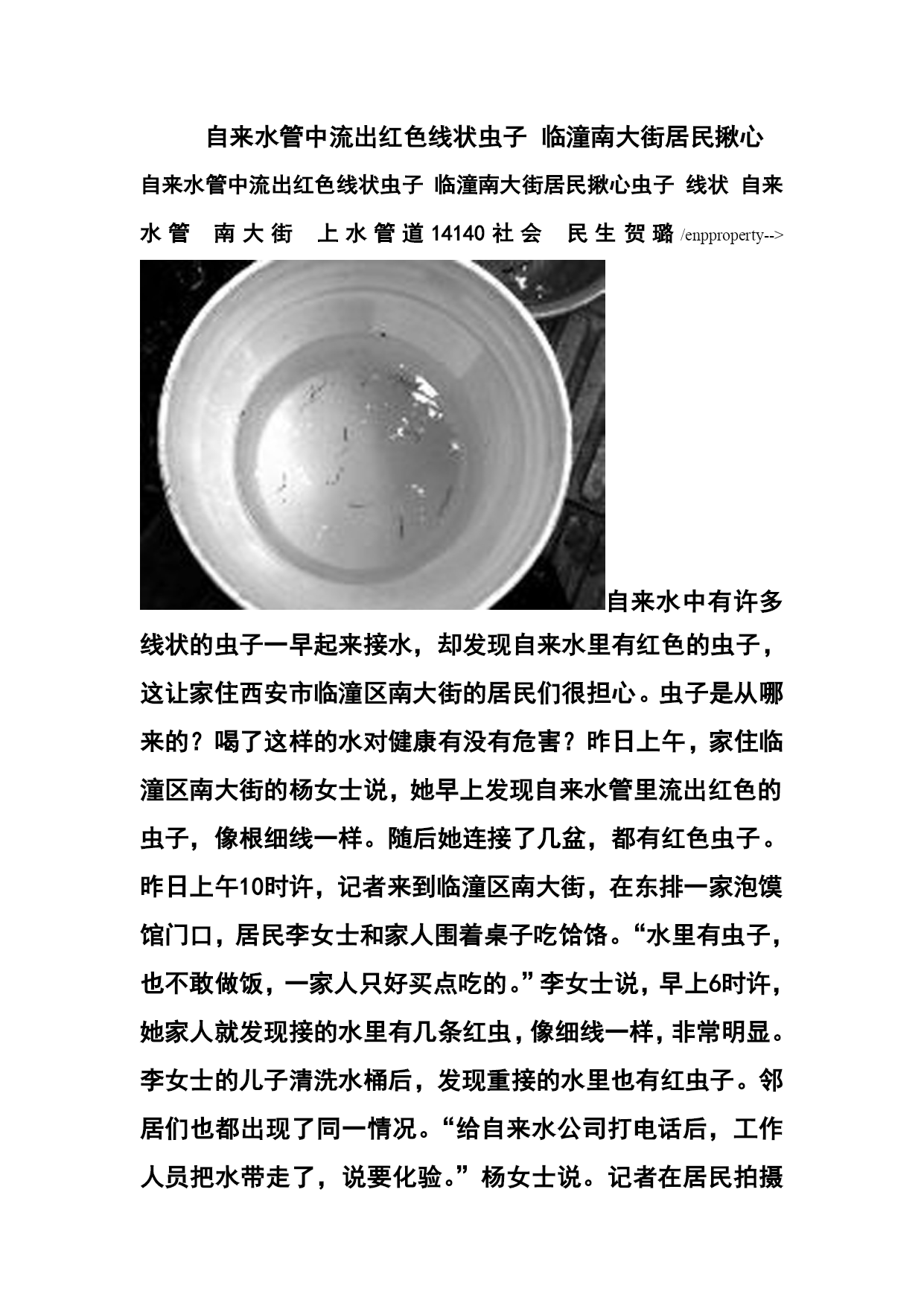 自来水管中流出红色线状虫子临潼南大街居民揪心 自来水管中流出红色线状虫子临潼南大街居民揪心虫子线状自来水管南大街上水管道14140社会民生贺璐/enpproperty-->自来水中有许多线状的虫子一早起来接水,却发现自来水里有红色的虫子,这让家住西安市临潼区南大街的居民们很担心。虫子是从哪来的?喝了这样的水对健康有没有危害?昨日上午,家住临潼区南大街的杨女士说,她早上发现自来水管里流出红色的虫子,像根细线一样。随后她连接了几盆,都有红色虫子。昨日上午10时许,记者来到临潼区南大街,在东排一家泡馍馆门口,居民李女士和家人围着桌子吃饸饹。“水里有虫子,也不敢做饭,一家人只好买点吃的。”李女士说,早上6时许,她家人就发现接的水里有几条红虫,像细线一样,非常明显。李女士的儿子清洗水桶后,发现重接的水里也有红虫子。邻居们也都出现了同一情况。“给自来水公司打电话后,工作人员把水带走了,说要化验。”杨女士说。记者在居民拍摄的照片上清楚地看到,一盆水里有十几条红色的细虫子,长约6、7厘米。临潼区自来水公司动力科姓李的科长表示:“工作人员排查管道后,发现主管道没有问题,怀疑是支管道受到污染。”昨日下午3时许,李姓科长来电称,是东排一家餐馆把下水管道和上水管道挨在一起了,上水管道污染了,导致支管道水源污染,细菌滋生,所以产生了红虫子。“我们已把污染的管道锯断了,会尽快恢复这里的管道。”