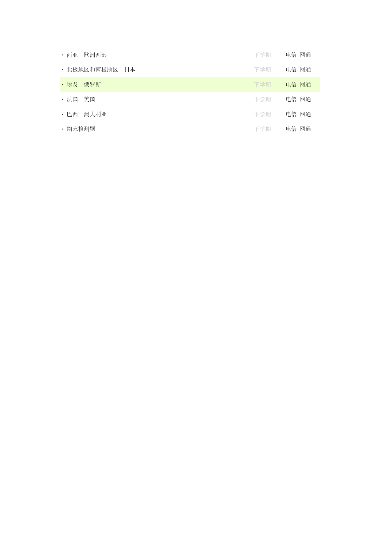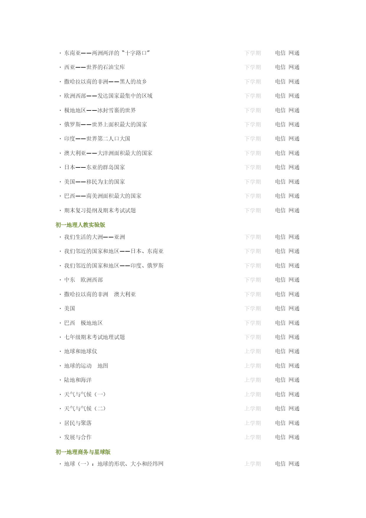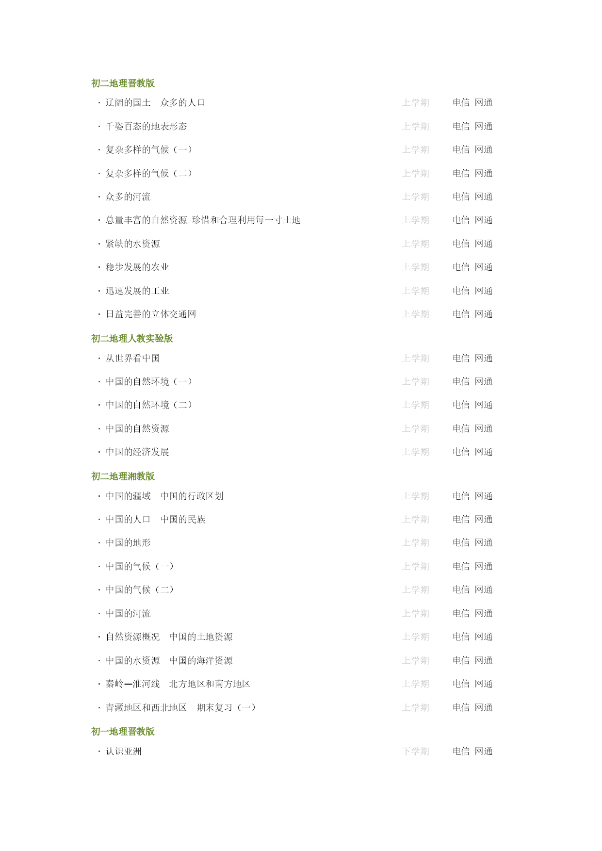 初二地理晋教版·辽阔的国土众多的人口上学期HYPERLINK"http://edu.huanggao.net/huanggao/student/lesson.php?subtype=oneweek&i=27"\l"#"电信HYPERLINK"http://edu.huanggao.net/huanggao/student/lesson.php?subtype=oneweek&i=27"\l"#"网通·千姿百态的地表形态上学期HYPERLINK"http://edu.huanggao.net/huanggao/student/lesson.php?subtype=oneweek&i=27"\l"#"电信HYPERLINK"http://edu.huanggao.net/huanggao/student/lesson.php?subtype=oneweek&i=27"\l"#"网通·复杂多样的气候(一)上学期HYPERLINK"http://edu.huanggao.net/huanggao/student/lesson.php?subtype=oneweek&i=27"\l"#"电信HYPERLINK"http://edu.huanggao.net/huanggao/student/lesson.php?subtype=oneweek&i=27"\l"#"网通·复杂多样的气候(二)上学期HYPERLINK"http://edu.huanggao.net/huanggao/student/lesson.php?subtype=oneweek&i=27"\l"#"电信HYPERLINK"http://edu.huanggao.net/huanggao/student/lesson.php?subtype=oneweek&i=27"\l"#"网通·众多的河流上学期HYPERLINK"http://edu.huanggao.net/huanggao/student/lesson.php?subtype=oneweek&i=27"\l"#"电信HYPERLINK"http://edu.huanggao.net/huanggao/student/lesson.php?subtype=oneweek&i=27"\l"#"网通·总量丰富的自然资源珍惜和合理利用每一寸土地上学期HYPERLINK"http://edu.huanggao.net/huanggao/student/lesson.php?subtype=oneweek&i=27"\l"#"电信HYPERLINK"http://edu.huanggao.net/huanggao/student/lesson.php?subtype=oneweek&i=27"\l"#"网通·紧缺的水资源上学期HYPERLINK"http://edu.huanggao.net/huanggao/student/lesson.php?subtype=oneweek&i=27"\l"#"电信HYPERLINK"http://edu.huanggao.net/huanggao/student/lesson.php?subtype=oneweek&i=27"\l"#"网通·稳步发展的农业上学期HYPERLINK"http://edu.huanggao.net/huanggao/student/lesson.php?subtype=oneweek&i=27"\l"#"电信HYPERLINK"http://edu.huanggao.net/huanggao/student/lesson.php?subtype=oneweek&i=27"\l"#"网通·迅速发展的工业上学期HYPERLINK"http://edu.huanggao.net/huanggao/student/lesson.php?subtype=oneweek&i=27"\l"#"电信HYPERLINK"http://edu.huanggao.net/huanggao/student/lesson.php?subtype=oneweek&i=27"\l"#"网通·日益完善的立体交通网上学期HYPERLINK"http://edu.huanggao.net/huanggao/student/lesson.php?subtype=oneweek&i=27"\l"#"电信HYPERLINK"http://edu.huanggao.net/huanggao/student/lesson.php?subtype=oneweek&i=27"\l"#"网