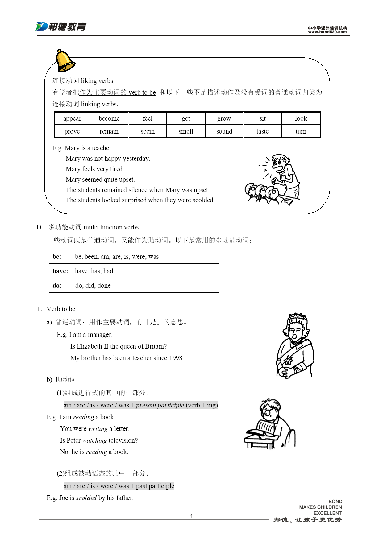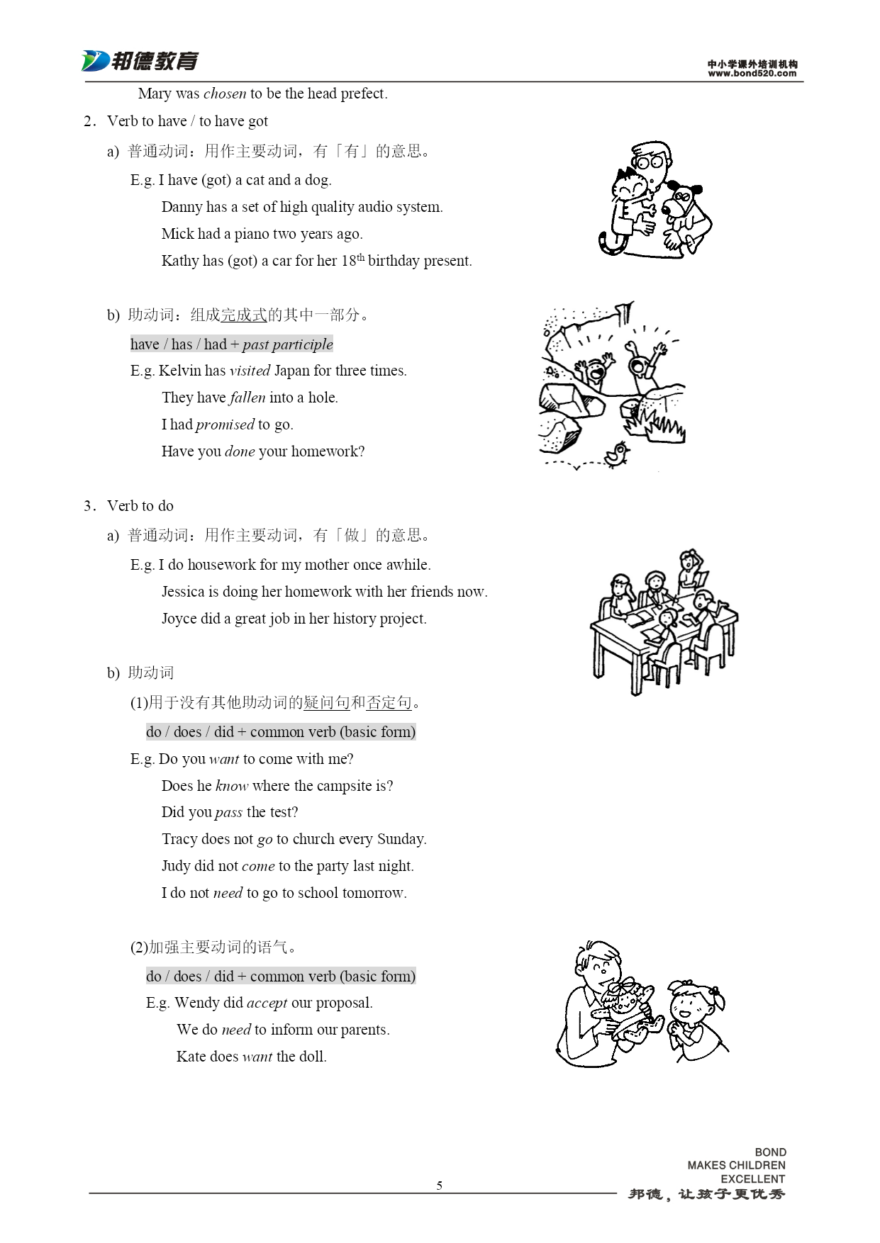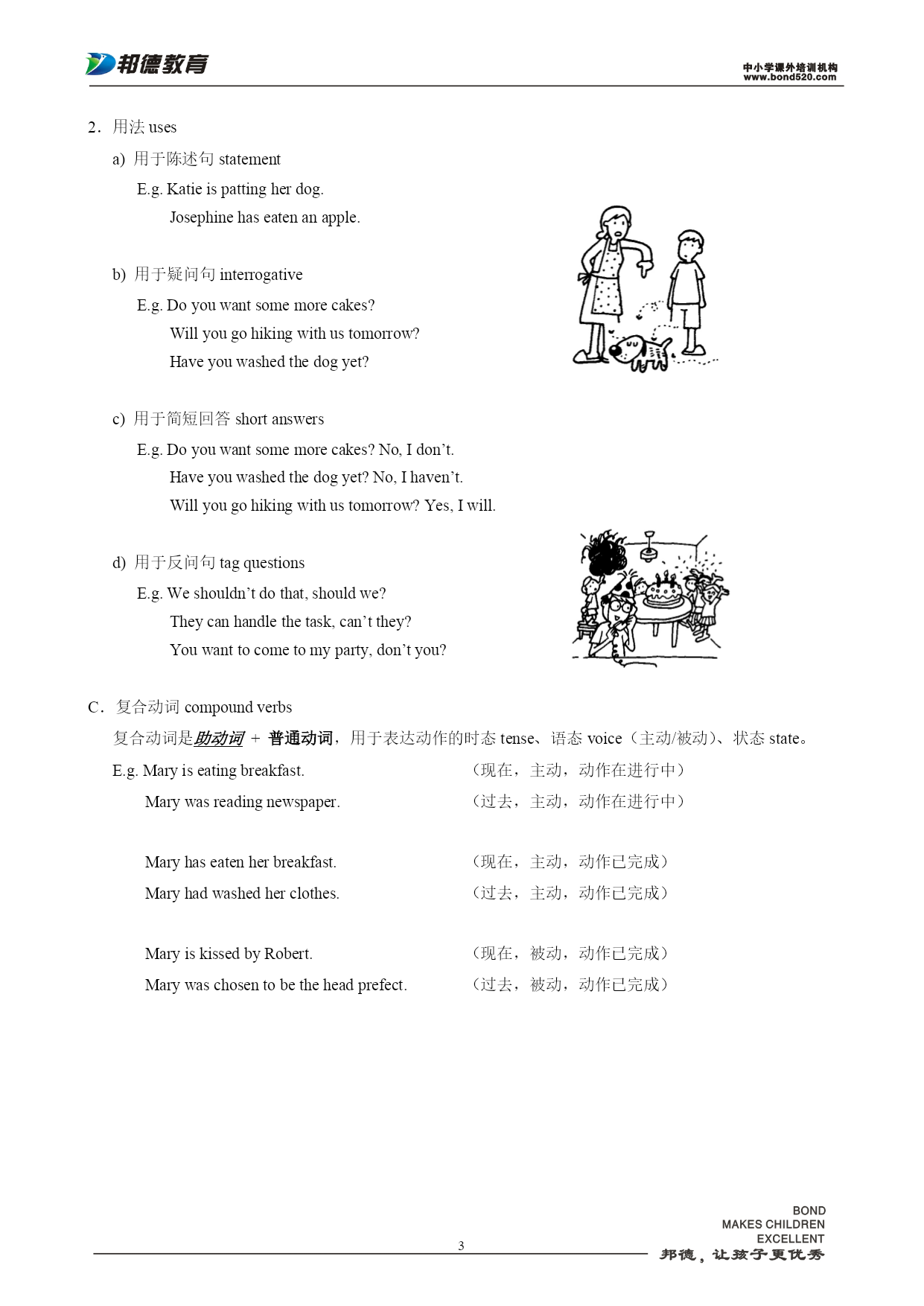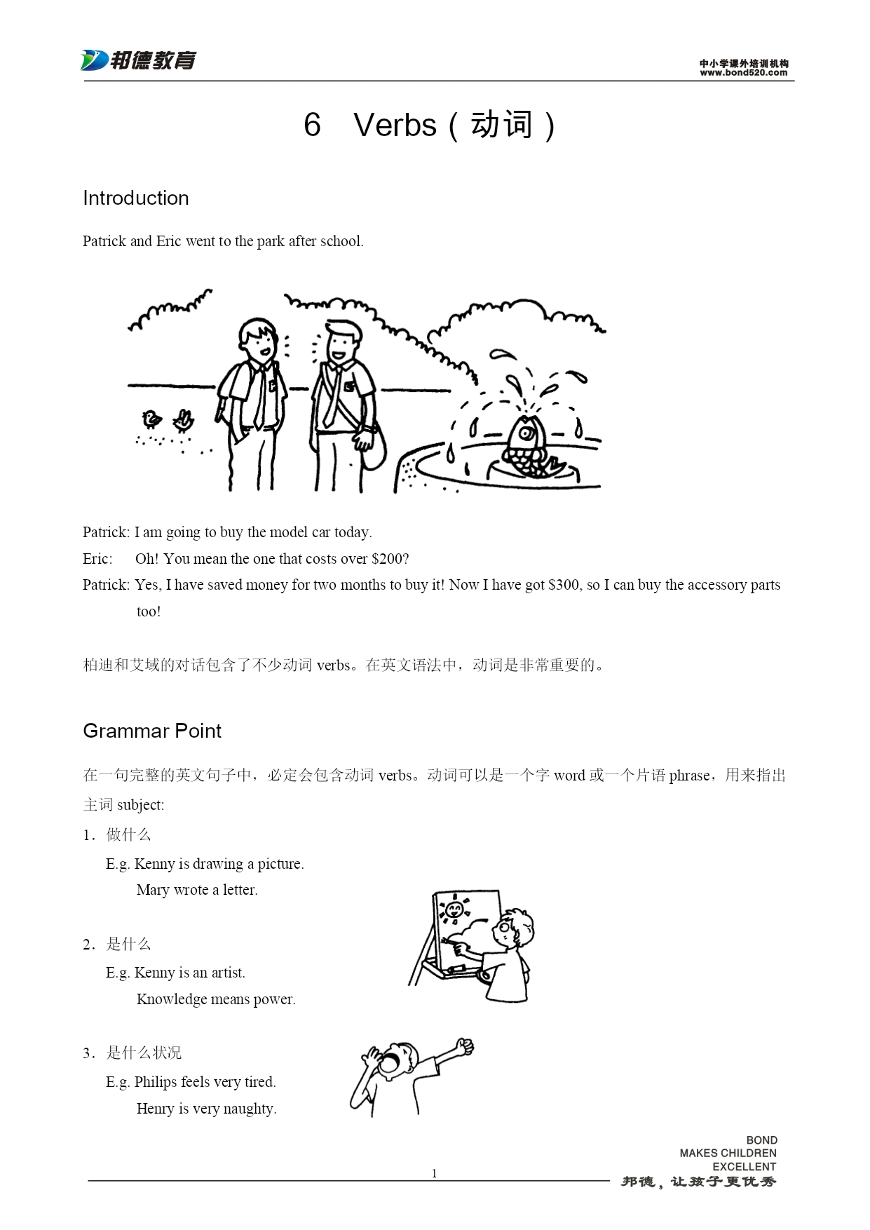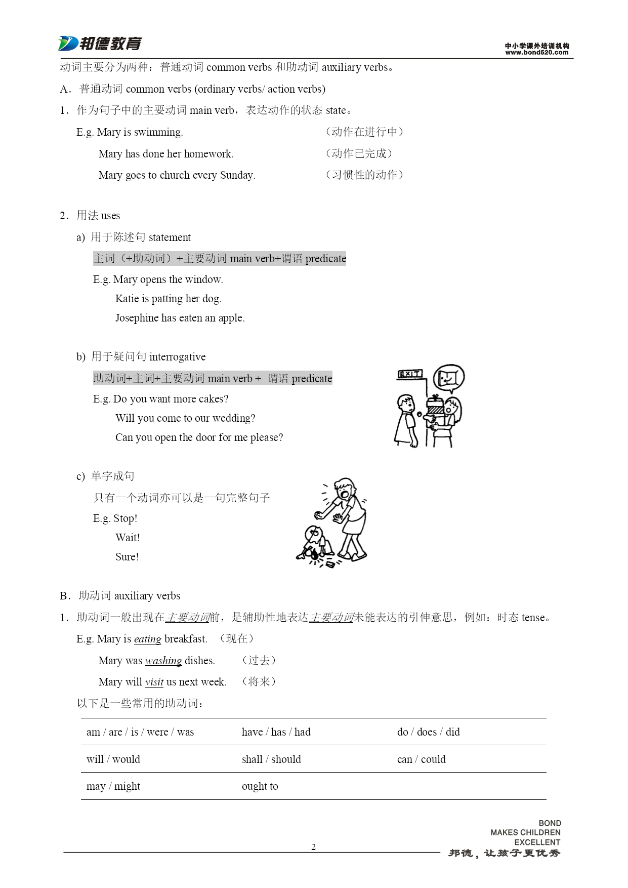 6Verbs(动词) Introduction PatrickandEricwenttotheparkafterschool. Patrick:Iamgoingtobuythemodelcartoday. Eric:Oh!Youmeantheonethatcostsover$200? Patrick:Yes,Ihavesavedmoneyfortwomonthstobuyit!NowIhavegot$300,soIcanbuytheaccessoryparts too! 柏迪和艾域的对话包含了不少动词verbs。在英文语法中,动词是非常重要的。 GrammarPoint 在一句完整的英文句子中,必定会包含动词verbs。动词可以是一个字word或一个片语phrase,用来指出主词subject: 1.做什么 E.g.Kennyisdrawingapicture. Marywrotealetter. 2.是什么 E.g.Kennyisanartist. Knowledgemeanspower. 3.是什么状况 E.g.Philipsfeelsverytired. Henryisverynaughty. 动词主要分为两种:普通动词commonverbs和助动词auxiliaryverbs。 A.普通动词commonverbs(ordinaryverbs/actionverbs) 1.作为句子中的主要动词mainverb,表达动作的状态state。 E.g.Maryisswimming. (动作在进行中) Maryhasdoneherhomework. (动作已完成) MarygoestochurcheverySunday. (习惯性的动作) 2.用法uses a)用于陈述句statement 主词(+助动词)+主要动词mainverb+谓语predicate E.g.Maryopensthewindow. Katieispattingherdog. Josephinehaseatenanapple. b)用于疑问句interrogative 助动词+主词+主要动词mainverb+谓语predicate E.g.Doyouwantmorecakes? Willyoucometoourwedding? Canyouopenthedoorformeplease? c)单字成句 只有一个动词亦可以是一句完整句子 E.g.Stop! Wait! Sure! B.助动词auxiliaryverbs 1.助动词一般出现在主要动词前,是辅助性地表达主要动词未能表达的引伸意思,例如:时态tense。 E.g.Maryiseatingbreakfast. (现在) Marywaswashingdishes. (过去) Marywillvisitusnextweek. (将来) 以下是一些常用的助动词: am/are/is/were/washave/has/haddo/does/didwill/wouldshall/shouldcan/couldmay/mightoughtto 2.用法uses a)用于陈述句statement E.g.Katieispattingherdog. Josephinehaseatenanapple. b)用于疑问句interrogative E.g.Doyouwantsomemorecakes? Willyougohikingwithustomorrow? Haveyouwashedthedogyet? c)用于简短回答shortanswers E.g.Doyouwantsomemorecakes?No,Idon’t. Haveyouwashedthedogyet?No,Ihaven’t. Willyougohikingwithustomorrow?Yes,Iwill. d)用于反问句tagquestions E.g.Weshouldn’tdothat,shouldwe? Theycanhandlethetask,can’tthey? Youwanttocometomyparty,don’tyou? C.复合动词compoundverbs 复合动词是助动词+普通动词,用于表达动作的时态tense、语态voice(主动/被动)、状态state。 E.g.Maryiseatingbreakfast. (现在,主动,动作在进行中) Marywasreadingnewspaper. (过去,主动,动作在进行中) Maryhaseatenherbreakfast. (现在,主动,动作已完成) Maryhadwashedherclothe