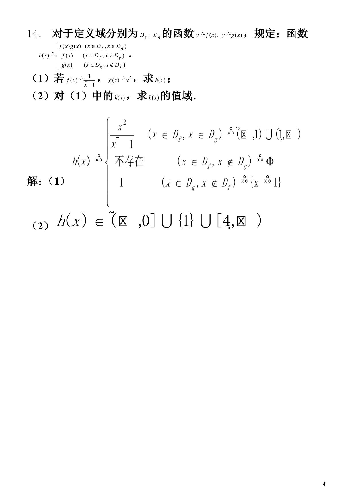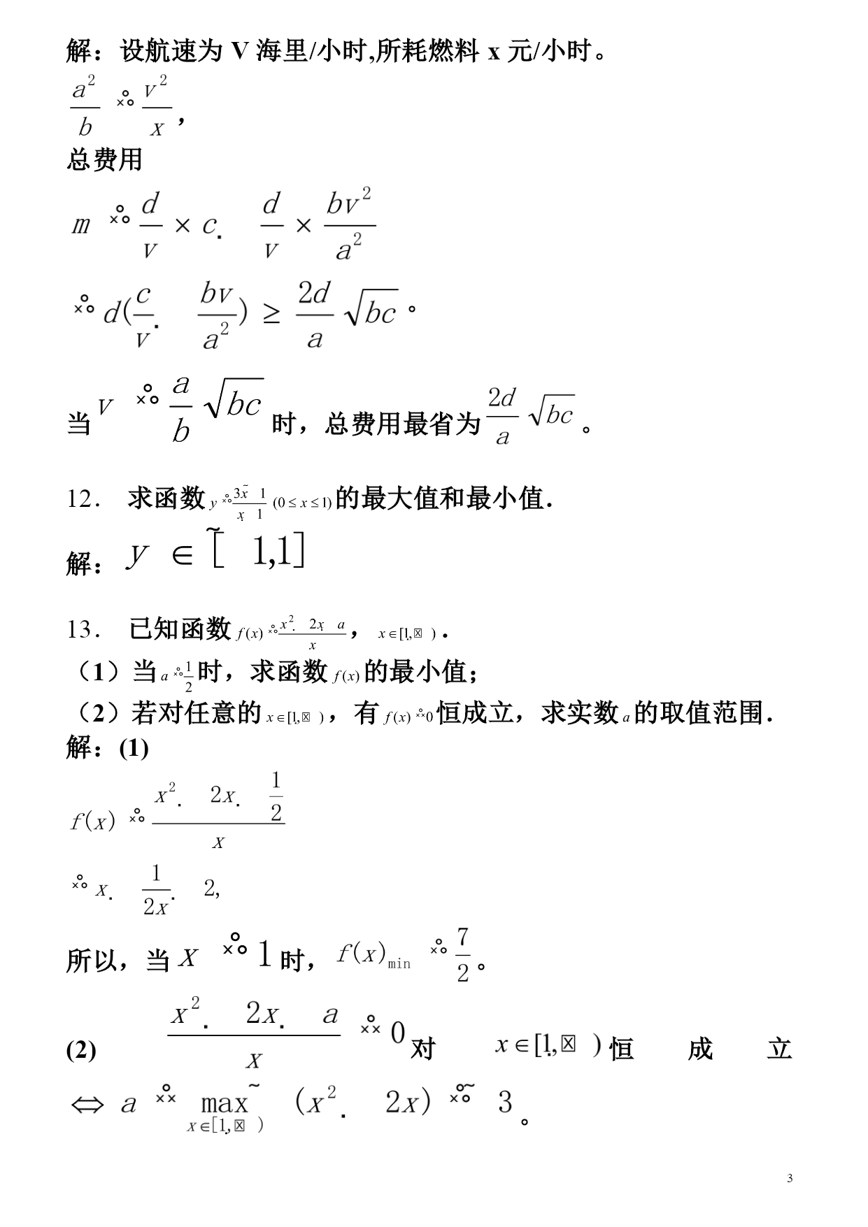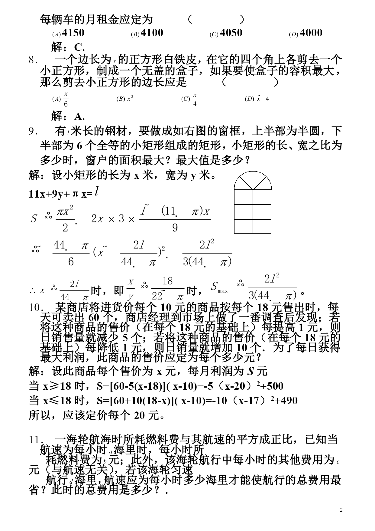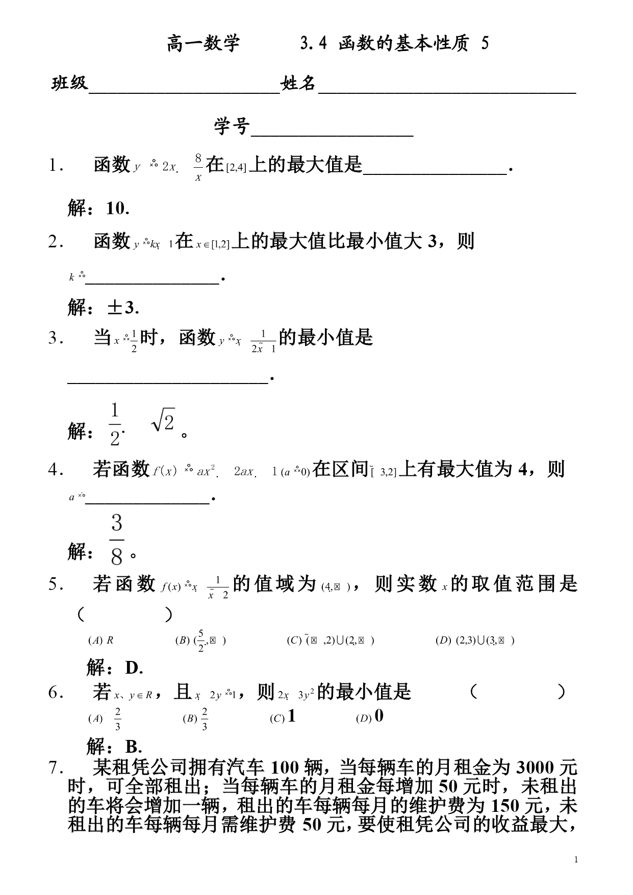 高一数学3.4函数的基本性质5班级____________________姓名___________________________学号_________________函数在上的最大值是_______________.解:10.函数在上的最大值比最小值大3,则______________.解:±3.当时,函数的最小值是_____________________.解:。若函数在区间上有最大值为4,则_____________.解:。若函数的值域为,则实数的取值范围是()解:D.若,且,则的最小值是()10解:B.某租凭公司拥有汽车100辆,当每辆车的月租金为3000元时,可全部租出;当每辆车的月租金每增加50元时,未租出的车将会增加一辆,租出的车每辆每月的维护费为150元,未租出的车每辆每月需维护费50元,要使租凭公司的收益最大,每辆车的月租金应定为()4150410040504000解:C.一个边长为的正方形白铁皮,在它的四个角上各剪去一个小正方形,制成一个无盖的盒子,如果要使盒子的容积最大,那么剪去小正方形的边长应是()解:A.有米长的钢材,要做成如右图的窗框,上半部为半圆,下半部为6个全等的小矩形组成的矩形,小矩形的长、宽之比为多少时,窗户的面积最大?最大值是多少?解:设小矩形的长为x米,宽为y米。11x+9y+πx=时,即时,。某商店将进货价每个10元的商品按每个18元售出时,每天可卖出60个,商店经理到市场上做了一番调查后发现;若将这种商品的售价(在每个18元的基础上)每提高1元,则日销售量就减少5个;若将这种商品的售价(在每个18元的基础上)每降低1元,则日销量就增加10个.为了每日获得最大利润,此商品的售价应定为每个多少元?解:设此商品每个售价为x元,每月利润为S元当x≥18时,S=[60-5(x-18)](x-10)=-5(x-20)2+500当x≤18时,S=[60+10(18-x)](x-10)=-10(x-17)2+490所以,应该定价每个20元。一海轮航海时所耗燃料费与其航速的平方成正比,已知当航速为每小时海里时,每小时所耗燃料费为元;此外,该海轮航行中每小时的其他费用为元(与航速无关),若该海轮匀速航行海里,航速应为每小时多少海里才能使航行的总费用最省?此时的总费用是多少?.解:设航速为V海里/小时,所耗燃料x元/小时。,总费用。当时,总费用最省为。求函数的最大值和最小值.解:已知函数,.(1)当时,求函数的最小值;(2)若对任意的,有恒成立,求实数的取值范围.解:(1)所以,当时,。(2)对恒成立。对于定义域分别为的函数,规定:函数.(1)若,,求;(2)对(1)中的,求的值域.解:(1)(2)