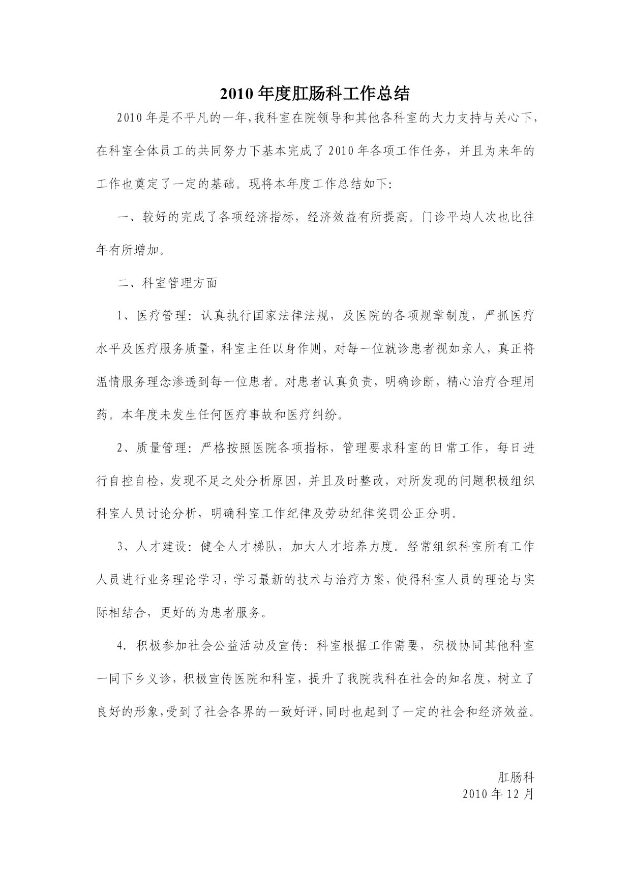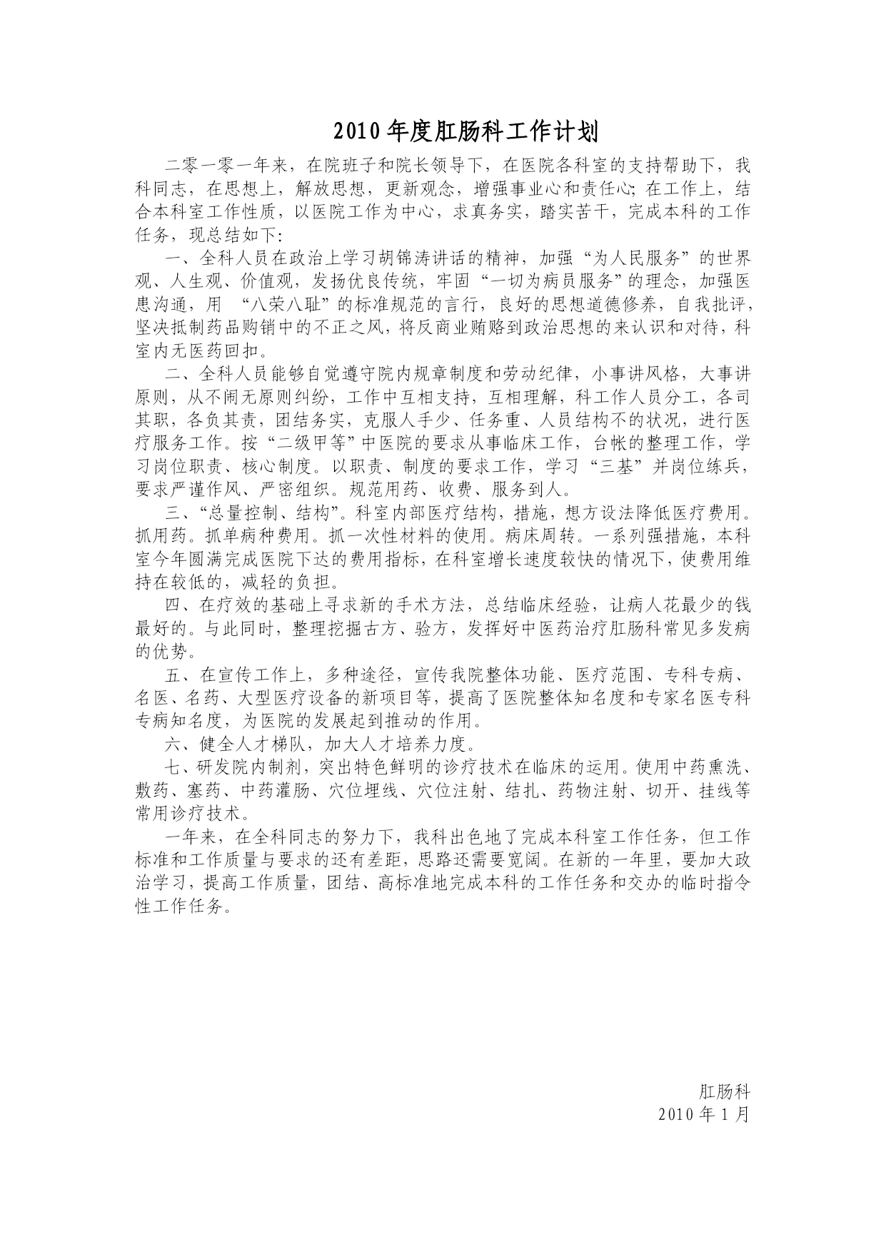 2010年度肛肠科工作总结2010年是不平凡的一年,我科室在院领导和其他各科室的大力支持与关心下,在科室全体员工的共同努力下基本完成了2010年各项工作任务,并且为来年的工作也奠定了一定的基础。现将本年度工作总结如下:一、较好的完成了各项经济指标,经济效益有所提高。门诊平均人次也比往年有所增加。二、科室管理方面1、医疗管理:认真执行国家法律法规,及医院的各项规章制度,严抓医疗水平及医疗服务质量,科室主任以身作则,对每一位就诊患者视如亲人,真正将温情服务理念渗透到每一位患者。对患者认真负责,明确诊断,精心治疗合理用药。本年度未发生任何医疗事故和医疗纠纷。2、质量管理:严格按照医院各项指标,管理要求科室的日常工作,每日进行自控自检,发现不足之处分析原因,并且及时整改,对所发现的问题积极组织科室人员讨论分析,明确科室工作纪律及劳动纪律奖罚公正分明。3、人才建设:健全人才梯队,加大人才培养力度。经常组织科室所有工作人员进行业务理论学习,学习最新的技术与治疗方案,使得科室人员的理论与实际相结合,更好的为患者服务。4.积极参加社会公益活动及宣传:科室根据工作需要,积极协同其他科室一同下乡义诊,积极宣传医院和科室,提升了我院我科在社会的知名度,树立了良好的形象,受到了社会各界的一致好评,同时也起到了一定的社会和经济效益。肛肠科2010年12月2010年度肛肠科工作计划二零一零一年来,在院班子和院长领导下,在医院各科室的支持帮助下,我科同志,在思想上,解放思想,更新观念,增强事业心和责任心;在工作上,结合本科室工作性质,以医院工作为中心,求真务实,踏实苦干,完成本科的工作任务,现总结如下:一、全科人员在政治上学习胡锦涛讲话的精神,加强“为人民服务”的世界观、人生观、价值观,发扬优良传统,牢固“一切为病员服务”的理念,加强医患沟通,用“八荣八耻”的标准规范的言行,良好的思想道德修养,自我批评,坚决抵制药品购销中的不正之风,将反商业贿赂到政治思想的来认识和对待,科室内无医药回扣。二、全科人员能够自觉遵守院内规章制度和劳动纪律,小事讲风格,大事讲原则,从不闹无原则纠纷,工作中互相支持,互相理解,科工作人员分工,各司其职,各负其责,团结务实,克服人手少、任务重、人员结构不的状况,进行医疗服务工作。按“二级甲等”中医院的要求从事临床工作,台帐的整理工作,学习岗位职责、核心制度。以职责、制度的要求工作,学习“三基”并岗位练兵,要求严谨作风、严密组织。规范用药、收费、服务到人。三、“总量控制、结构”。科室内部医疗结构,措施,想方设法降低医疗费用。抓用药。抓单病种费用。抓一次性材料的使用。病床周转。一系列强措施,本科室今年圆满完成医院下达的费用指标,在科室增长速度较快的情况下,使费用维持在较低的,减轻的负担。四、在疗效的基础上寻求新的手术方法,总结临床经验,让病人花最少的钱最好的。与此同时,整理挖掘古方、验方,发挥好中医药治疗肛肠科常见多发病的优势。五、在宣传工作上,多种途径,宣传我院整体功能、医疗范围、专科专病、名医、名药、大型医疗设备的新项目等,提高了医院整体知名度和专家名医专科专病知名度,为医院的发展起到推动的作用。六、健全人才梯队,加大人才培养力度。七、研发院内制剂,突出特色鲜明的诊疗技术在临床的运用。使用中药熏洗、敷药、塞药、中药灌肠、穴位埋线、穴位注射、结扎、药物注射、切开、挂线等常用诊疗技术。一年来,在全科同志的努力下,我科出色地了完成本科室工作任务,但工作标准和工作质量与要求的还有差距,思路还需要宽阔。在新的一年里,要加大政治学习,提高工作质量,团结、高标准地完成本科的工作任务和交办的临时指令性工作任务。肛肠科2010年1月2011年工作计划为了更好地为病员服务,创造良好的社会效益和经济效益,进一步提高医疗水平和医疗质量,特制定本计划:一、进一步加强医德医风教育,学习徐州市医疗道德规范,使大家觉悟不断提高,关心国家大事,积极投身改革,努力学习党中央各项文件,每周政治学习一次。二、加强基础设施建设,争取在年中能够完成肛肠科病区的建设,并配备一定的新的设备。三、加强业务学习,努力提高大家业务水平,使医疗质量不断提高。积极撰写论文,要求至少每人一篇,争取有2-3人参加全国以上的学术交流会议。加强专科建设,培养专门人才,计划今年新近肛肠科中医本科毕业生2名,计划送一名肛肠科医生到上级医院进修学习,以提高我科的业务水平。四、定时抽查病房病历和门诊病历及门诊处方,保证病房病历甲级率达到95%以上,力争达100%。门诊病历合格率达95%以上,杜绝差错事故发生。门诊处方力求完整,杜绝商品名。五、按时完成院部下达的各项医疗技术指标,力争住院人次、门诊人次、病房周转率超过去年。进一步完善内科医疗设施基础建设,迎接新的挑战,提高疾病诊断符合率及治愈好转率,扩大收治