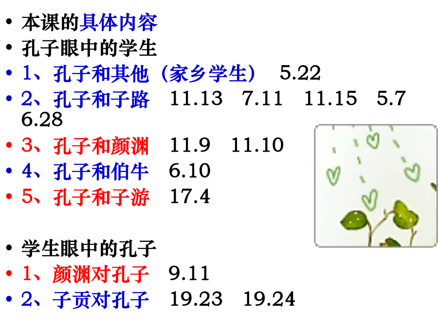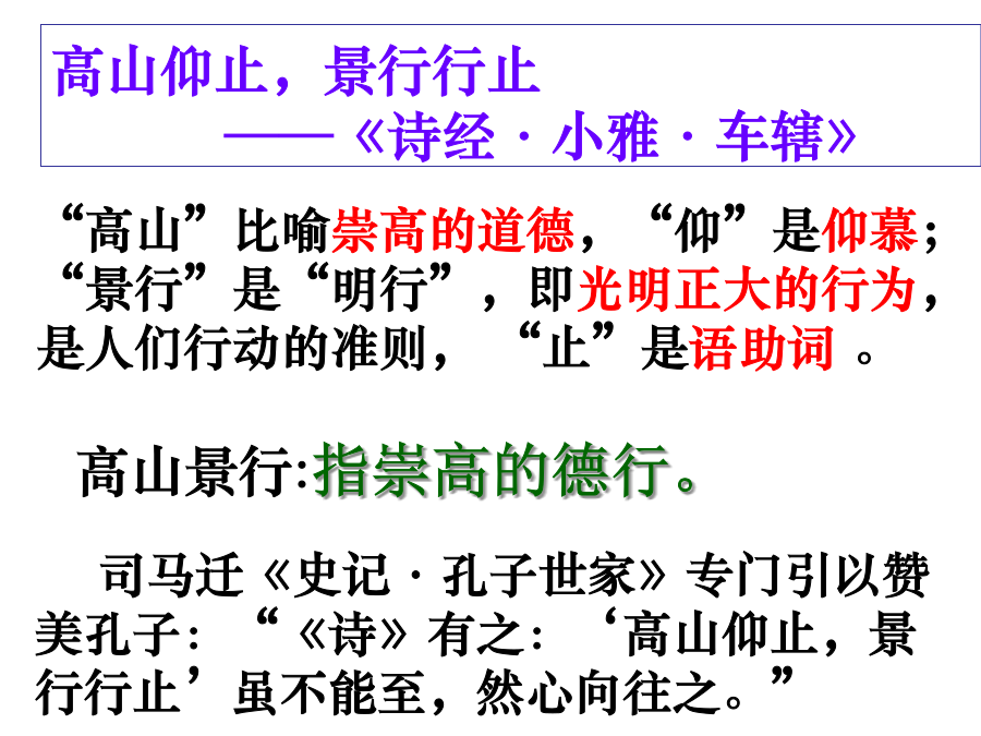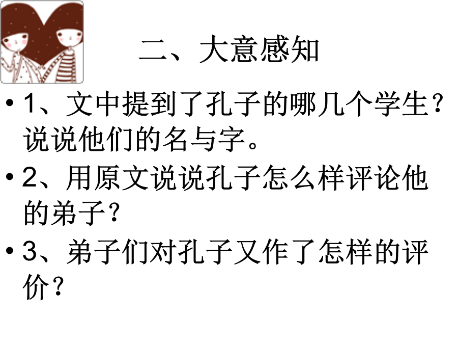 高山仰止高山仰止,景行行止——《诗经·小雅·车辖》二、大意感知本课的具体内容孔子眼中的学生1、孔子和其他(家乡学生)5.222、孔子和子路11.137.1111.155.76.283、孔子和颜渊11.911.104、孔子和伯牛6.105、孔子和子游17.4学生眼中的孔子1、颜渊对孔子9.112、子贡对孔子19.2319.24孔子眼中的家乡学生5·22子在陈曰:“归与!归与!吾党之小子狂简,斐然成章,不知所以裁之。”成语斐然成章:斐:文采。形容文章富有文采,很值得看。提问:孔子为什么想要回家?又体现了孔子怎样的心情?孔子眼中的子路子路是怎样的一个人?11·13闵子侍侧,訚訚如也;子路,行行如也;冉有、子贡,侃侃如也。子乐。“若由也,不得其死然。”提问:孔子很高兴很满意,却又为何说子路“不得其死然”?☆孔子眼中的子路成语:用行舍藏:被任用就干起来,不被任用就隐退.这是早时世大夫的处世态度。暴虎冯河:暴虎:空手搏虎;冯河:涉水过河。比喻有勇无谋,鲁莽冒险。临事而惧:遇到事情而有所惧怕。指遇到事谨慎处理。问:孔子对子路说这话的用意何在?11·15子曰:“由之瑟,奚为于丘之门?”门人不敬子路。子曰:“由也升堂矣,未入于室也。”奚为于丘之门:奚,疑问代词,为什么,怎么;为,动词,弹奏登堂入室:古代宫室,前面是堂,后面是室。登上厅堂,进入内室。比喻学问或技能从浅到深,达到很高的水平。提问:孔子说子路已“升堂”未“入室”的目的是什么?5·7子曰:“道不行,乘桴浮于海,从我者,其由与!”子路闻之喜。子曰:“由也好勇过我,无所取材。”浮于海:状语后置句,于海浮从:跟随,随从其:语气副词,表推测,“大概、莫非”无所取材:无所,没有可以用来……的东西;材通“哉”,语气词,呀提问:这一“喜”字写出了子路怎样的情状?孔子的话又意味着什么?6·28子见南子,子路不说。夫子矢之曰:“予所否者,天厌之!天厌之!”说:通“悦”,高兴、喜欢矢:发誓否:不对,不当,不是,指做了不正当的事南子是卫国国君卫灵公的老婆,生得花容月貌,容颜绝丽,是名副其实的美女。不过,南子已经不是单纯意义上的美人和国君老婆,一是卫灵公对她极为宠信,宠信到什么程度?只要老婆看着不顺眼的人,你要么死掉,要么滚蛋,从卫国消失。比如太子,也就是卫灵公的儿子蒯kuǎi聩得罪了南子,就被迫跑到了晋国去。二是南子权势惊人,卫灵公虽是国君,但对她言听计从,她实际上是卫国真正的掌权者。三是这个女人私生活极不检点,是个名副其实的声名狼藉的女人。孔子为实现自己的政治理想也来了卫国,被他撞上了,自然生出事端。孔子一到卫国,就得到一个消息:南子要见他。孔子为难起来。南子要见孔子,为的是什么呢?是要讨教学问?还是心生爱慕?明眼人一看就心知肚明,孔子身材伟岸,相貌堂堂,且声名显于天下,既是玉树临风的帅哥,又是才华横溢的大名人,所以,南子的讨教学问肯定是个幌子,没说出口的目的才是真正的目的。孔子也肯定知道这一点,他思量一番,就拒绝了。照咱们的想法,孔子毕竟是孔子,他到卫国干什么来着?是施展政治抱负来了,事业第一嘛,所以见。孔子与子路提问:你从孔子的发誓中感悟到了什么是真正的师生平等?探究一:《史记•仲尼弟子列传》说子路“性鄙,好勇力,志伉直”。从本书的有关材料中,可以看出子路是怎样一个人?《论语》中子路的形象为什么显得较为丰满生动?课文解读二课文解读二课文解读二文本研习三:11·9颜渊死,子曰:“噫!天丧予!天丧予!”11·10颜渊死,子哭之恸。从者曰:“子恸矣。”曰:“有恸乎?非夫人之为恸而谁为?”文本研习四:答案:运用叠句,表现出孔子对学生生病的痛苦、对天命的无奈和对学生的爱惜之情。探究二:《论语》中多叠句,如“觚哉,觚哉”、“使乎,使乎”、“归与,归与”、“天厌之,天厌之”等。说说这些叠句在表情达意上的作用以及这种句子形式与《论语》语体特点的关系。叠句,多为感叹句和祈使句,这类句子的重叠使用可进一步强化语气和感情色彩,有一唱三叹之效。多用叠句也是《论语》口语化特点之一。文本研习五:17·4子之武城,闻弦歌之声。夫子莞尔而笑,曰:“割鸡焉用牛刀?”子游对曰:“昔者偃也闻诸夫子曰:‘君子学道则爱人,小人学道则易使也。’”子曰:“二三子!偃之言是也。前言戏之耳。”成语:杀鸡焉用牛刀(割鸡焉用牛刀):比喻办小事情用不着花大气力。莞尔而笑:形容微笑。提问:孔子为什么说“割鸡焉用牛刀”这句话只是一句“戏言”?答案:孔子郑重其事地承认子游说得对。这才是真实的孔子,他也会犯错误,但也会因不好意思而作小小的掩饰。(肯定子游,承认自己的错误)当然也可以作另一种理解,孔子只是考验一下他的学生,没想到学生已对他的精神领会得这么好,并且予以实践,于是孔子不无得意地说:“我只是开个玩笑,你们看,子游说的做的都很好。”(考验学生)文本研习六:9