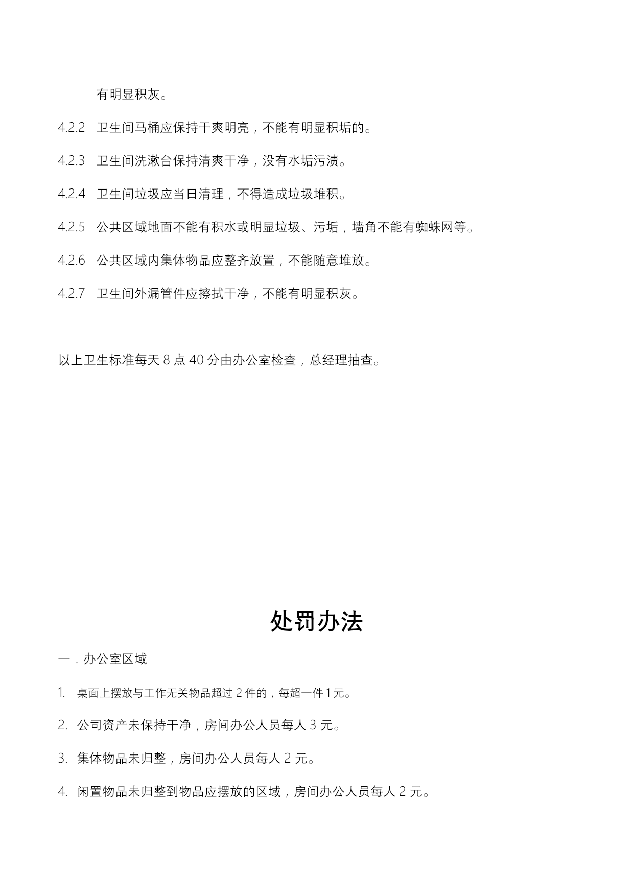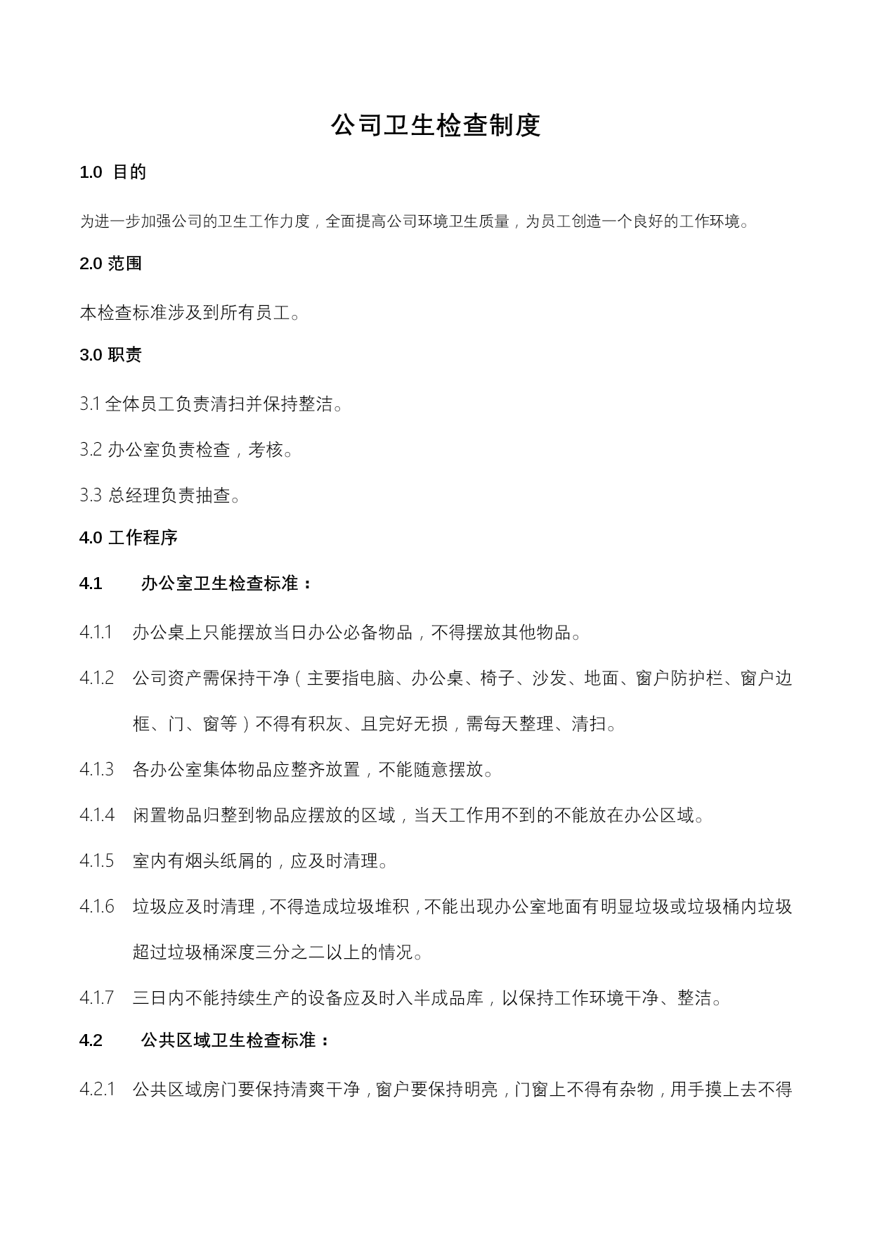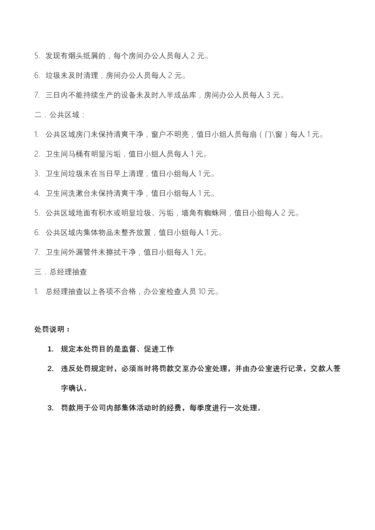 公司卫生检查制度1.0目的为进一步加强公司的卫生工作力度,全面提高公司环境卫生质量,为员工创造一个良好的工作环境。2.0范围本检查标准涉及到所有员工。3.0职责3.1全体员工负责清扫并保持整洁。3.2办公室负责检查,考核。3.3总经理负责抽查。4.0工作程序办公室卫生检查标准:办公桌上只能摆放当日办公必备物品,不得摆放其他物品。公司资产需保持干净(主要指电脑、办公桌、椅子、沙发、地面、窗户防护栏、窗户边框、门、窗等)不得有积灰、且完好无损,需每天整理、清扫。各办公室集体物品应整齐放置,不能随意摆放。闲置物品归整到物品应摆放的区域,当天工作用不到的不能放在办公区域。室内有烟头纸屑的,应及时清理。垃圾应及时清理,不得造成垃圾堆积,不能出现办公室地面有明显垃圾或垃圾桶内垃圾超过垃圾桶深度三分之二以上的情况。三日内不能持续生产的设备应及时入半成品库,以保持工作环境干净、整洁。公共区域卫生检查标准:公共区域房门要保持清爽干净,窗户要保持明亮,门窗上不得有杂物,用手摸上去不得有明显积灰。卫生间马桶应保持干爽明亮,不能有明显积垢的。卫生间洗漱台保持清爽干净,没有水垢污渍。卫生间垃圾应当日清理,不得造成垃圾堆积。公共区域地面不能有积水或明显垃圾、污垢,墙角不能有蜘蛛网等。公共区域内集体物品应整齐放置,不能随意堆放。卫生间外漏管件应擦拭干净,不能有明显积灰。以上卫生标准每天8点40分由办公室检查,总经理抽查。处罚办法办公室区域桌面上摆放与工作无关物品超过2件的,每超一件1元。公司资产未保持干净,房间办公人员每人3元。集体物品未归整,房间办公人员每人2元。闲置物品未归整到物品应摆放的区域,房间办公人员每人2元。发现有烟头纸屑的,每个房间办公人员每人2元。垃圾未及时清理,房间办公人员每人2元。三日内不能持续生产的设备未及时入半成品库,房间办公人员每人3元。公共区域:公共区域房门未保持清爽干净,窗户不明亮,值日小组人员每扇(门\窗)每人1元。卫生间马桶有明显污垢,值日小组人员每人1元。卫生间垃圾未在当日早上清理,值日小组每人1元。卫生间洗漱台未保持清爽干净,值日小组每人1元。公共区域地面有积水或明显垃圾、污垢,墙角有蜘蛛网,值日小组每人2元。公共区域内集体物品未整齐放置,值日小组每人1元。卫生间外漏管件未擦拭干净,值日小组每人1元。总经理抽查总经理抽查以上各项不合格,办公室检查人员10元。处罚说明:规定本处罚目的是监督、促进工作违反处罚规定时,必须当时将罚款交至办公室处理,并由办公室进行记录,交款人签字确认。罚款用于公司内部集体活动时的经费,每季度进行一次处理。