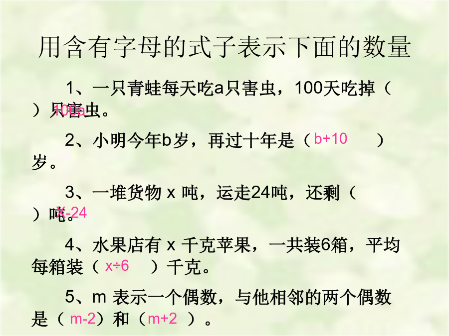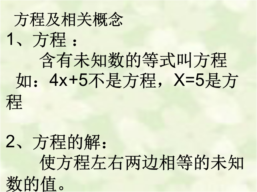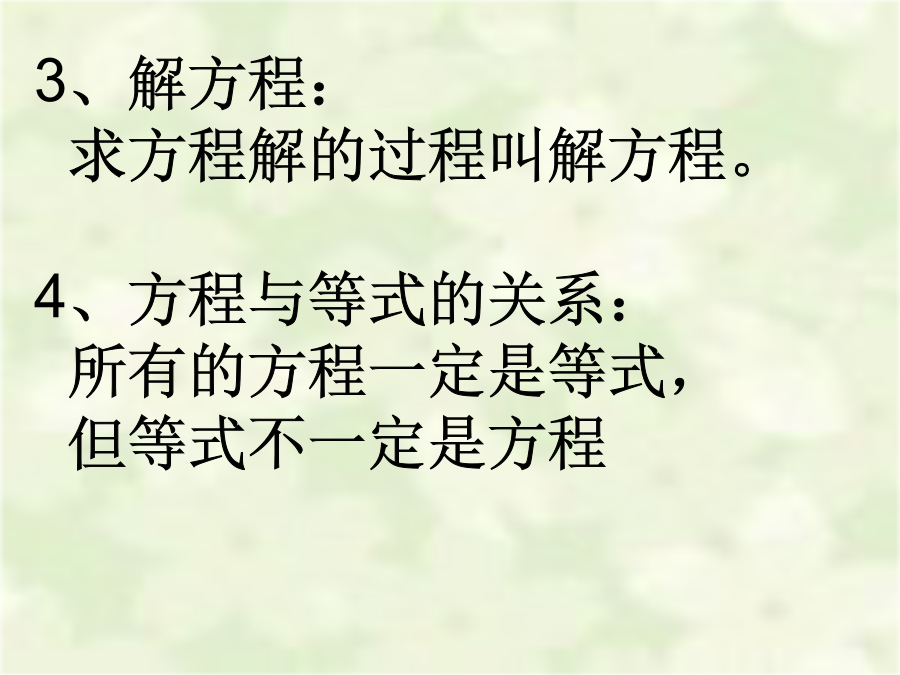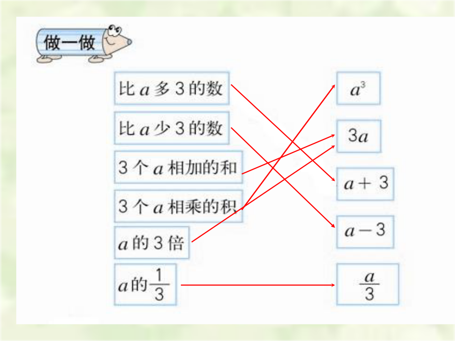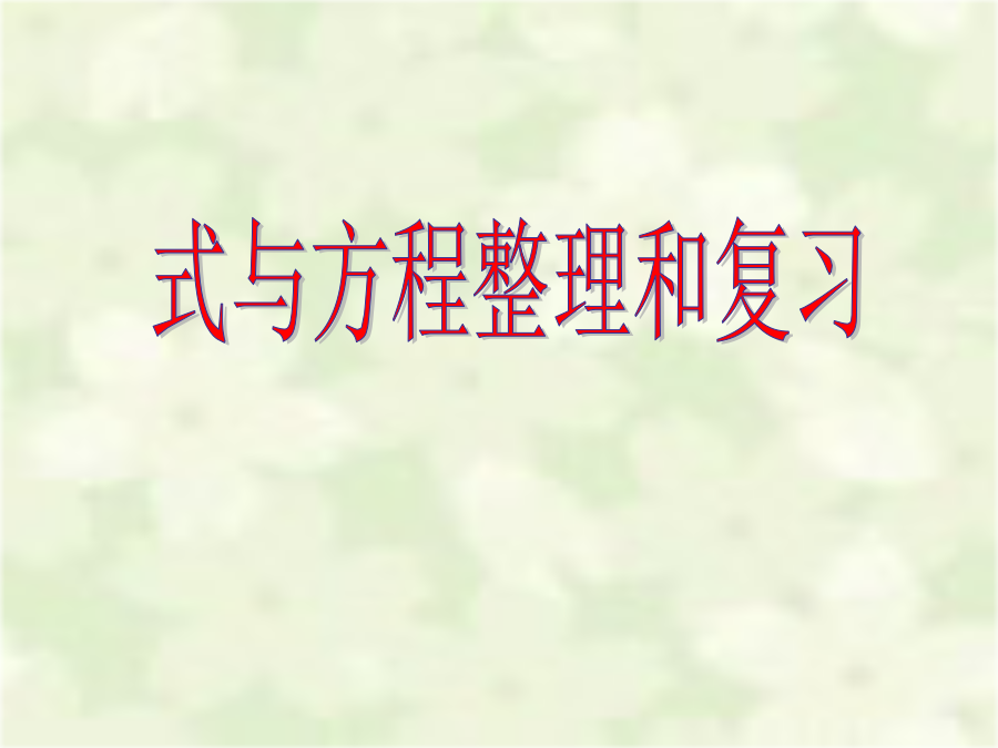 式与方程整理和复习用含有字母的式子表示下面的数量注意:①在含有字母的式子里,数和字母中间的乘号可以作“•”,也可以省略不写。②省略乘号时,应当把数写在字母的前面。③数与数之间的乘号不能省略。加号、减号、除号都不能省略。学校买来9个足球,每个a元,又买来b个篮球,每个58元。判断下列式子哪些是方程,为什么?例3:学校组织远足活动。原计划每小时走3.8千米,3小时到达目的地。实际2.5小时走完了原定路程,平均每小时走了多少千米?交流:说一说列方程解应用题的步骤。列方程解应用题4.六年级参加数学兴趣小组的共有45人,其中女生是男生的,参加数学兴趣小组的男女生各有多少人?5.两列火车同时从相距325千米的两城相对开出,一列火车每小时行60千米,另一列火车每小时行70千米,经过几小时两车相遇?