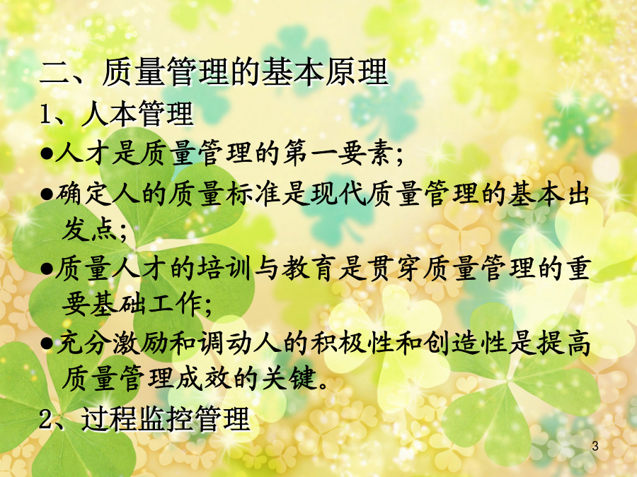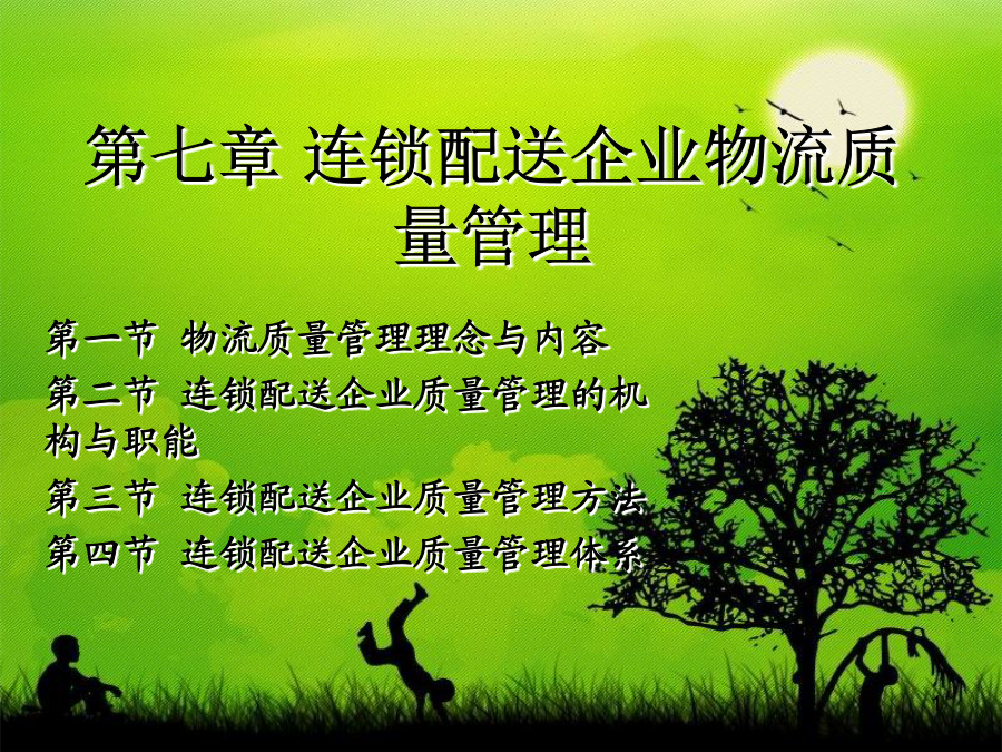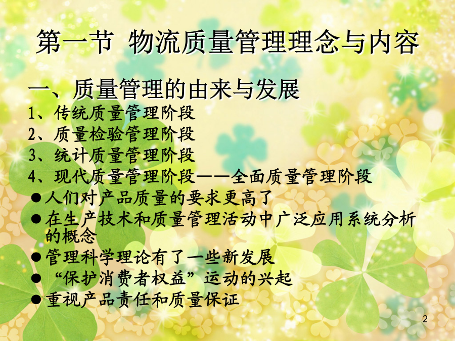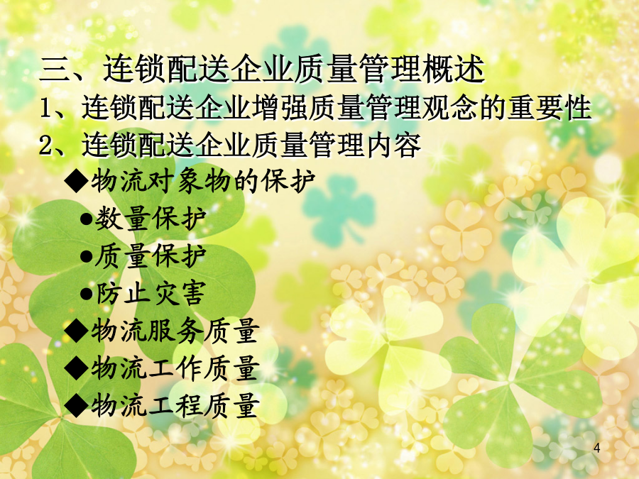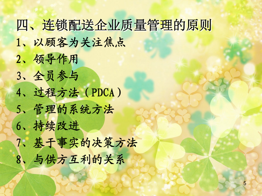 第七章连锁配送企业物流质量管理第一节物流质量管理理念与内容二、质量管理的基本原理 1、人本管理 ●人才是质量管理的第一要素; ●确定人的质量标准是现代质量管理的基本出发点; ●质量人才的培训与教育是贯穿质量管理的重要基础工作; ●充分激励和调动人的积极性和创造性是提高质量管理成效的关键。 2、过程监控管理三、连锁配送企业质量管理概述 1、连锁配送企业增强质量管理观念的重要性 2、连锁配送企业质量管理内容 ◆物流对象物的保护 ●数量保护 ●质量保护 ●防止灾害 ◆物流服务质量 ◆物流工作质量 ◆物流工程质量四、连锁配送企业质量管理的原则 1、以顾客为关注焦点 2、领导作用 3、全员参与 4、过程方法(PDCA) 5、管理的系统方法 6、持续改进 7、基于事实的决策方法 8、与供方互利的关系第二节连锁配送企业质量管理的机构与职能二、物流质量管理项目机构 1、物流质量项目组的组建 2、质量管理项目组活动程序及要求 ●选定课题,确定目标值 ●分析存在问题的主要原因 ●制定对策(P阶段) ●实施对策(D阶段) ●检查实施结果(C阶段) ●总结(A阶段) ●总结并写好成果报告书三、连锁配送企业质量管理机构的作用 1、是组织全体职工参加质量管理的好形式 2、能对企业目标的实现起到推动作用 3、有利于提高职工素质和人才的开发 4、提高质量、降低消耗、提高经济效益 5、推动技术进步,提高企业管理水平,增强企业素质第三节连锁配送企业质量管理方法二、六西格玛(6σ)物流质量管理 六西格玛质量策略是建立在测量、试验和统计学基础上的现代质量管理方法。由摩托罗拉公司于1987年首创,作为全面满足客户需求的关键经营战略,经过十多年的发展,逐渐被众多一流公司采用。 20世纪80年代到90年代初期,摩托罗拉是众多市场不断被日本竞争对手吞食的西方公司之一。当时摩托罗拉的领导人承认其产品质量低劣。1987年,当时摩托罗拉通信部门的经理乔治.费希尔提出了一种质量管理新方法,就是六西格玛方法。在公司主席鲍伯.高尔文的支持下,六西格玛方法在公司范围内得到推广。 实施六西格玛方法仅仅两年,摩托罗拉就获得了马可姆·波里奇国家质量奖。从实施六西格玛方法的1987年到1997年,销售额增长5倍,利润平均每年增长20%;带来的节约额累计达140亿美元;股票价格平均每年上涨21.3%。希腊字母σ(音SIGMA,大写为Σ)是统计学里的一个单位,表示与平均值的标准偏差。六西格玛(SIXSIGMA)质量水平表示在生产或服务过程中有百万次出现缺陷的机会仅出现3.4个缺陷,即达到99.9997%合格率。 实行六西格玛质量计划要求管理层全面介入,并由经过特殊培训的内部六西格玛质量计划的专职人员以及项目负责人组织实施,以实现减少偏差,提高过程能力的短期目标和达到六西格玛的世界一流水平的长期目标。6个西格玛=3.4失误/百万机会―意味着卓越的管理,强大的竞争力和忠诚的客户 5个西格玛=230失误/百万机会-优秀的管理、很强的竞争力和比较忠诚的客户 4个西格玛=6,210失误/百万机会-意味着较好的管理和运营能力,满意的客户 3个西格玛=66,800失误/百万机会-意味着平平常常的管理,缺乏竞争力 2个西格玛=308,000失误/百万机会-意味着企业资源每天都有三分之一的浪费 1个西格玛=690,000失误/百万机会-每天有三分之二的事情做错的企业无法生存★界定:确定需要改进的目标及其进度,企业高层领导就是确定企业的策略目标,中层营运目标可能是提高制造部门的生产量,项目层的目标可能是减少次品和提高效率。界定前,需要辨析并绘制出流程。 ★测量:以灵活有效的衡量标准测量和权衡现存的系统与数据,了解现有质量水平。 ★分析:利用统计学工具对整个系统进行分析,找到影响质量的少数几个关键因素。 ★改进:运用项目管理和其他管理工具,针对关键因素确立最佳改进方案。 ★控制:监控新的系统流程,采取措施以维持改进的结果,以期整个流程充分发挥功效。第四节连锁配送企业质量管理体系二、用全面质量管理思想构筑连锁配送企业服务质量管理体系 (一)全面质量管理及其含义 全面质量管理理念TQM(totalqualitymanagement) 美国通用电气:为了能够在最经济的水平上,并考虑到充分满足顾客要求的条件下进行市场研究、设计、制造和售后服务,把企业内各部门的研制质量、维持质量和提高质量的活动构成为一体的一种有效的体系。 ISO8402:一个组织以质量为中心,以全员参与为基础,目的在于通过让顾客满意和本组织所有成员及社会受益而达到长期成功的管理途径。(二)全面质量管理原理概述 1、在“质量控制”(QualityControl)这一短语中,“质量”一词并不具有绝对意义上的“最好”的一般含义。质量是指“最适合于一定顾客的要求”。这些