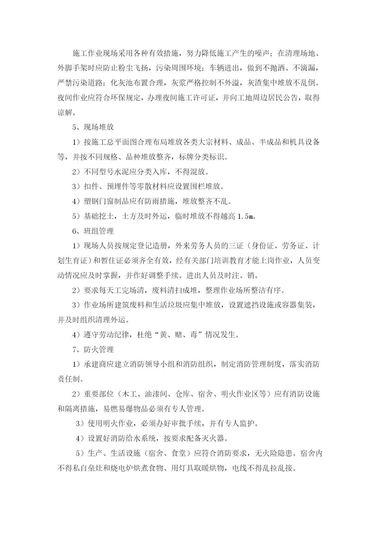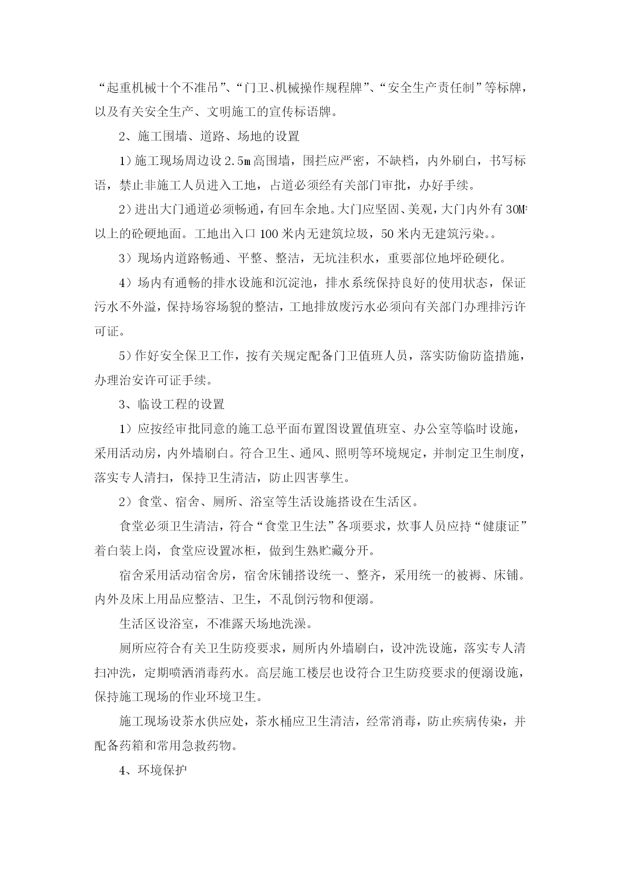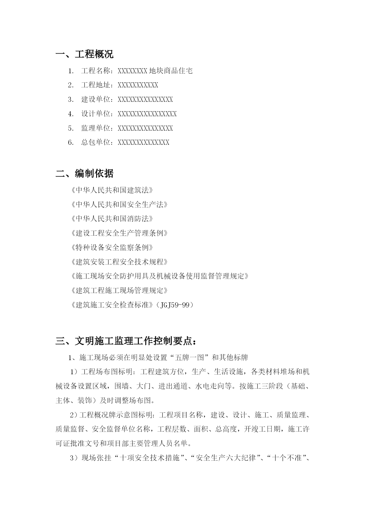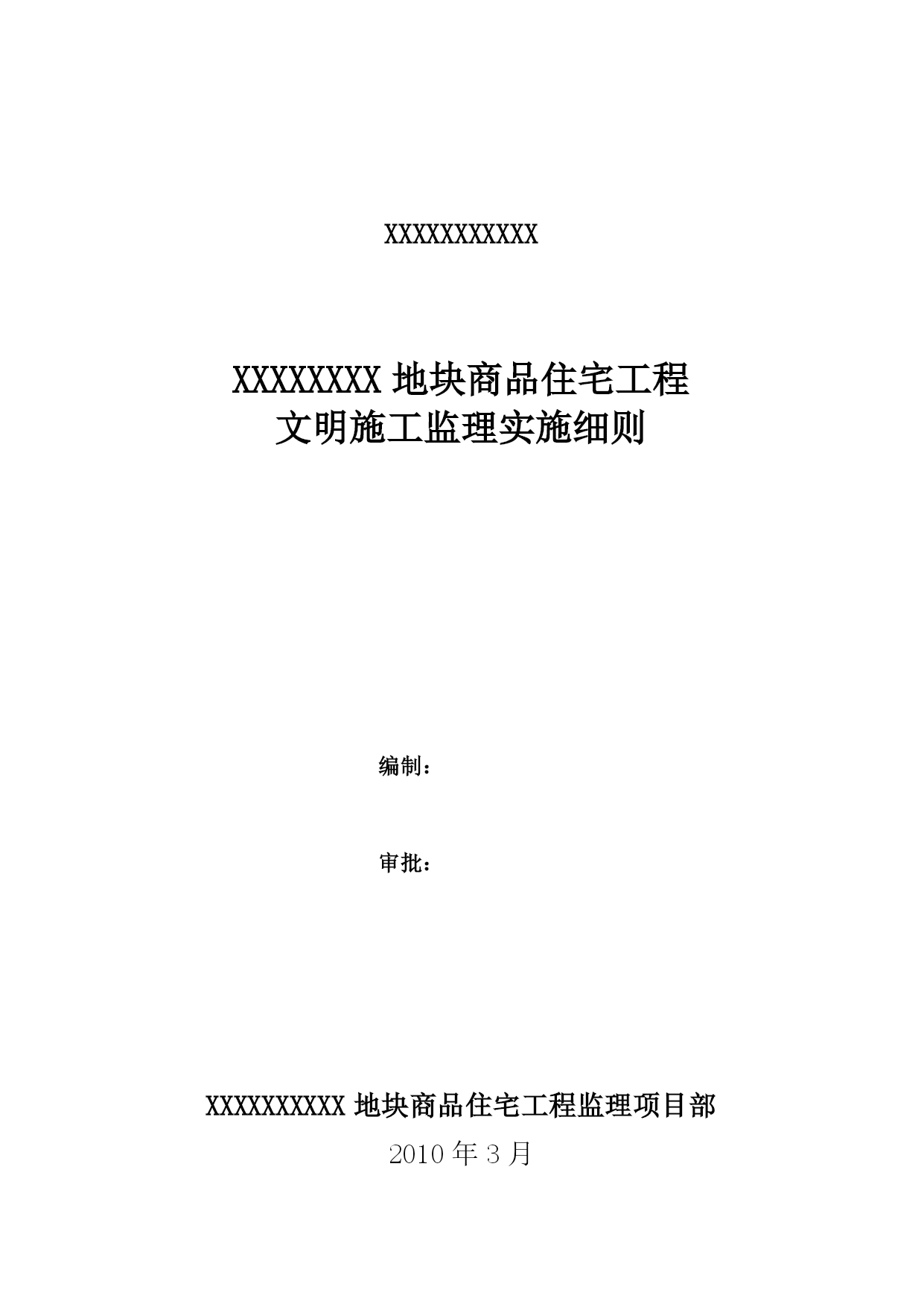 XXXXXXXXXXXXXXXXXXX地块商品住宅工程文明施工监理实施细则编制:审批:XXXXXXXXXX地块商品住宅工程监理项目部2010年3月目录工程项目概况编制依据文明施工监理控制要点监理工作方法和措施文明施工检查细则交底记录一、工程概况工程名称:XXXXXXXX地块商品住宅工程地址:XXXXXXXXXXX建设单位:XXXXXXXXXXXXXXX设计单位:XXXXXXXXXXXXXXXX监理单位:XXXXXXXXXXXXXXX总包单位:XXXXXXXXXXXXXX二、编制依据《中华人民共和国建筑法》《中华人民共和国安全生产法》《中华人民共和国消防法》《建设工程安全生产管理条例》《特种设备安全监察条例》《建筑安装工程安全技术规程》《施工现场安全防护用具及机械设备使用监督管理规定》《建筑工程施工现场管理规定》《建筑施工安全检查标准》(JGJ59-99)三、文明施工监理工作控制要点:1、施工现场必须在明显处设置“五牌一图”和其他标牌1)工程场布图标明:工程建筑方位,生产、生活设施,各类材料堆场和机械设备设置区域,围墙、大门、进出通道、水电走向等。按施工三阶段(基础、主体、装饰)及时调整场布图。2)工程概况牌示意图标明:工程项目名称,建设、设计、施工、质量监理、质量监督、安全监督单位名称,工程层数、面积、总高度,开竣工日期,施工许可证批准文号和项目部主要管理人员名单。3)现场张挂“十项安全技术措施”、“安全生产六大纪律”、“十个不准”、“起重机械十个不准吊”、“门卫、机械操作规程牌”、“安全生产责任制”等标牌,以及有关安全生产、文明施工的宣传标语牌。2、施工围墙、道路、场地的设置1)施工现场周边设2.5m高围墙,围拦应严密,不缺档,内外刷白,书写标语,禁止非施工人员进入工地,占道必须经有关部门审批,办好手续。2)进出大门通道必须畅通,有回车余地。大门应坚固、美观,大门内外有30M2以上的砼硬地面。工地出入口100米内无建筑垃圾,50米内无建筑污染。。3)现场内道路畅通、平整、整洁,无坑洼积水,重要部位地坪砼硬化。4)场内有通畅的排水设施和沉淀池,排水系统保持良好的使用状态,保证污水不外溢,保持场容场貌的整洁,工地排放废污水必须向有关部门办理排污许可证。5)作好安全保卫工作,按有关规定配备门卫值班人员,落实防偷防盗措施,办理治安许可证手续。3、临设工程的设置1)应按经审批同意的施工总平面布置图设置值班室、办公室等临时设施,采用活动房,内外墙刷白。符合卫生、通风、照明等环境规定,并制定卫生制度,落实专人清扫,保持卫生清洁,防止四害孳生。2)食堂、宿舍、厕所、浴室等生活设施搭设在生活区。食堂必须卫生清洁,符合“食堂卫生法”各项要求,炊事人员应持“健康证”着白装上岗,食堂应设置冰柜,做到生熟贮藏分开。宿舍采用活动宿舍房,宿舍床铺搭设统一、整齐,采用统一的被褥、床铺。内外及床上用品应整洁、卫生,不乱倒污物和便溺。生活区设浴室,不准露天场地洗澡。厕所应符合有关卫生防疫要求,厕所内外墙刷白,设冲洗设施,落实专人清扫冲洗,定期喷洒消毒药水。高层施工楼层也设符合卫生防疫要求的便溺设施,保持施工现场的作业环境卫生。施工现场设茶水供应处,茶水桶应卫生清洁,经常消毒,防止疾病传染,并配备药箱和常用急救药物。4、环境保护施工作业现场采用各种有效措施,努力降低施工产生的噪声;在清理场地、外脚手架时应防止粉尘飞扬,污染周围环境;车辆进出,做到不抛洒、不滴漏,严禁污染道路;化灰池布置合理,灰浆严格控制不外溢,灰渣集中堆放不乱倒。夜间作业应符合环保规定,办理夜间施工许可证,并向工地周边居民公告,取得谅解。5、现场堆放1)按施工总平面图合理布局堆放各类大宗材料、成品、半成品和机具设备等,并按不同规格、品种堆放整齐,标牌分类标识。2)不同型号水泥应分类入库,不得混放。3)扣件、预埋件等零散材料应设置围栏堆放。4)塑钢门窗制品应有防雨措施,堆放整齐不乱。5)基础挖土,土方及时外运,临时堆放不得越高1.5m。6、班组管理1)现场人员按规定登记造册,外来劳务人员的三证(身份证、劳务证、计划生育证)和暂住证必须齐全有效,经有关部门培训教育才能上岗作业,人员变动情况应及时掌握,并作好调整手续。进出人员及时注、销。2)要求每天工完场清,废料清扫成堆,整理作业场所整洁有序。3)作业场所建筑废料和生活垃圾应集中堆放,设置遮挡设施或容器集装,并及时组织清理外运。4)遵守劳动纪律,杜绝“黄、赌、毒”情况发生。7、防火管理1)承建商应建立消防领导小组和消防组织,制定消防管理制度,落实消防责任制。2)重要部位(木工、油漆间、仓库、宿舍、明火作业区等)应有消防设施和隔离措施,易燃易爆物品必须有专人管理。3)使用明火作业,必须办好审批手续,并有专人监护。4)设置好消防给水系统,按要求配备灭火器