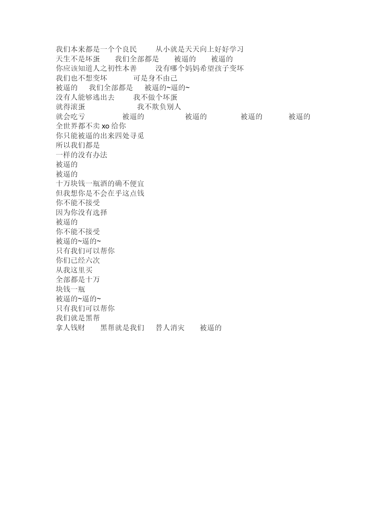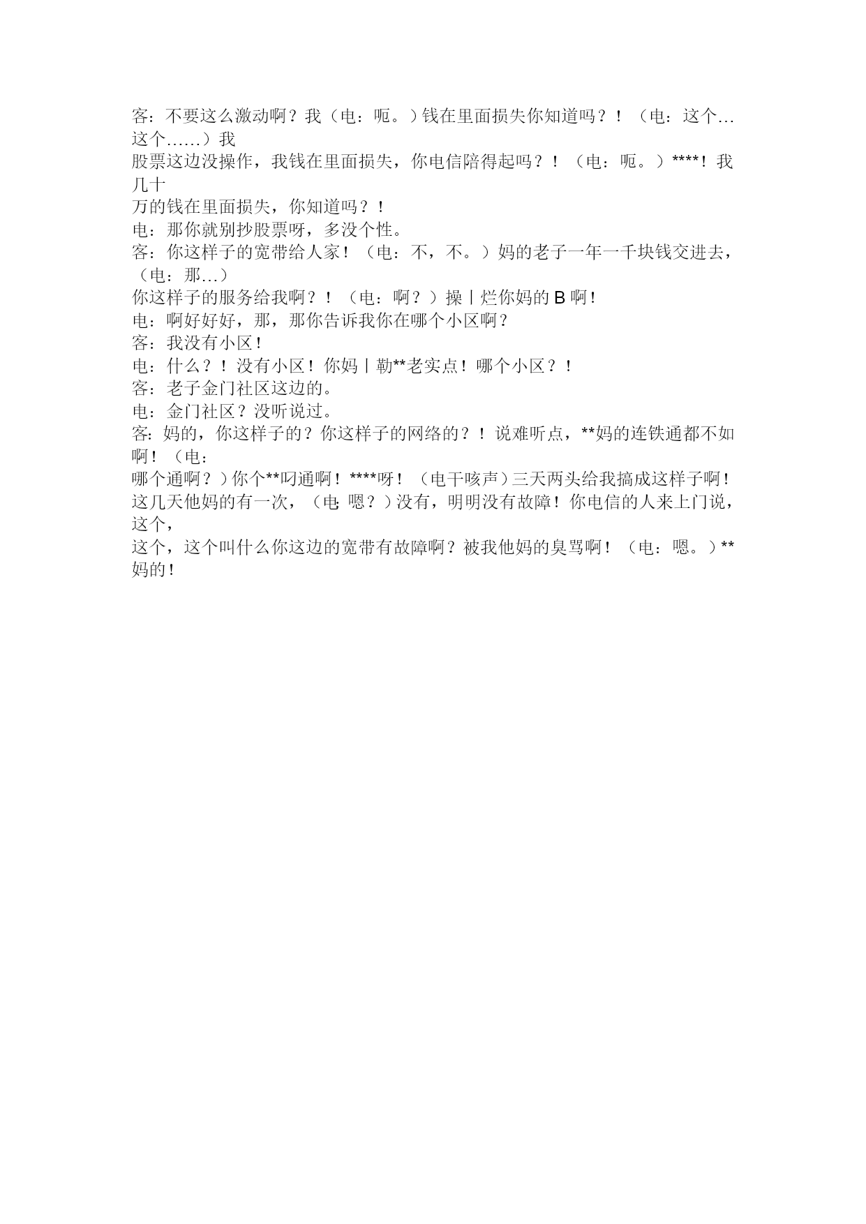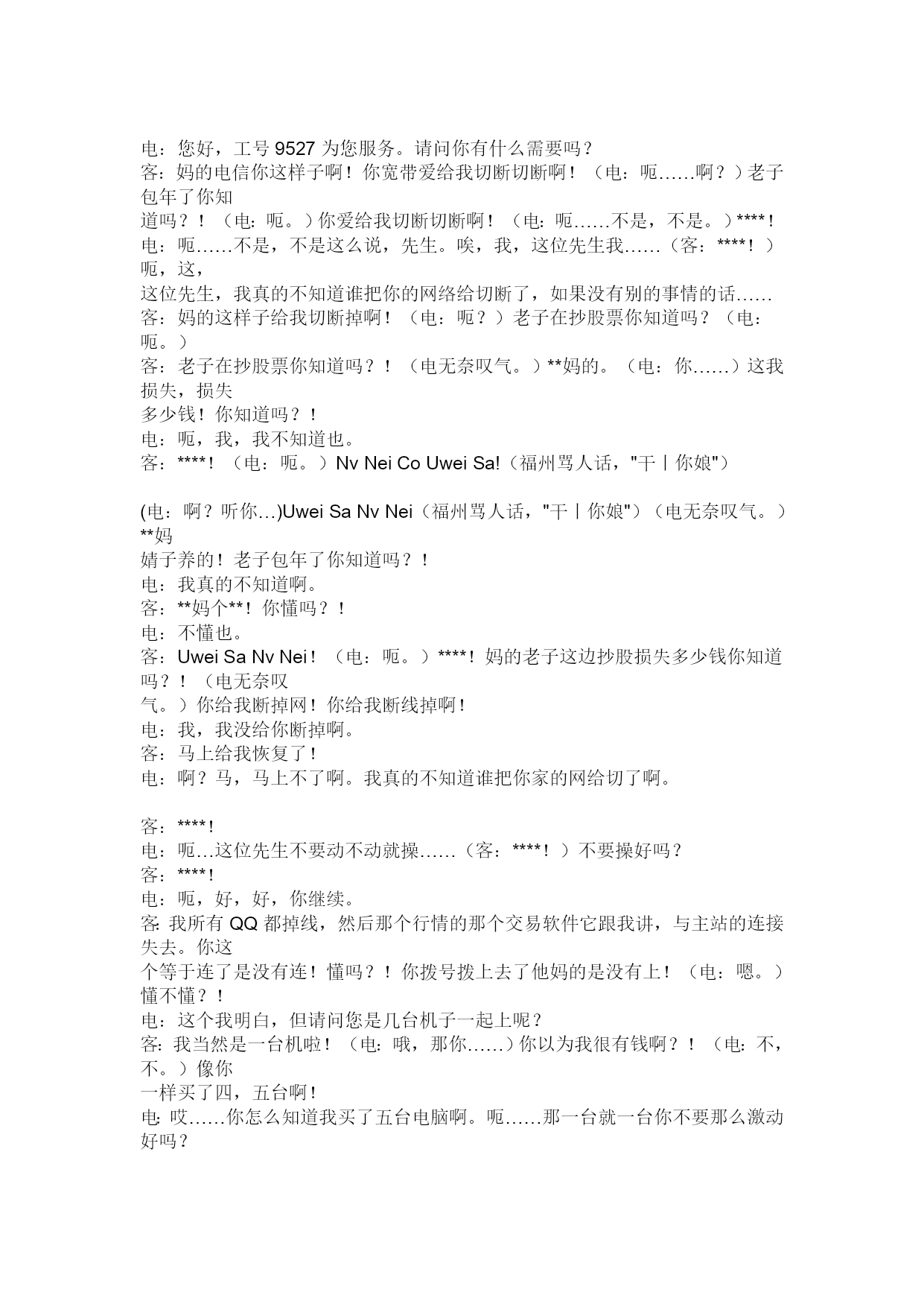 我们本来都是一个个良民从小就是天天向上好好学习天生不是坏蛋我们全部都是被逼的被逼的你应该知道人之初性本善没有哪个妈妈希望孩子变坏我们也不想变坏可是身不由己被逼的我们全部都是被逼的~逼的~没有人能够逃出去我不做个坏蛋就得滚蛋我不欺负别人就会吃亏被逼的被逼的被逼的被逼的全世界都不卖xo给你你只能被逼的出来四处寻觅所以我们都是一样的没有办法被逼的被逼的十万块钱一瓶酒的确不便宜但我想你是不会在乎这点钱你不能不接受因为你没有选择被逼的你不能不接受被逼的~逼的~只有我们可以帮你你们已经六次从我这里买全部都是十万块钱一瓶被逼的~逼的~只有我们可以帮你我们就是黑帮拿人钱财黑帮就是我们替人消灾被逼的赞同电:您好,工号9527为您服务。请问你有什么需要吗?客:妈的电信你这样子啊!你宽带爱给我切断切断啊!(电:呃……啊?)老子包年了你知道吗?!(电:呃。)你爱给我切断切断啊!(电:呃……不是,不是。)****!电:呃……不是,不是这么说,先生。唉,我,这位先生我……(客:****!)呃,这,这位先生,我真的不知道谁把你的网络给切断了,如果没有别的事情的话……客:妈的这样子给我切断掉啊!(电:呃?)老子在抄股票你知道吗?(电:呃。)客:老子在抄股票你知道吗?!(电无奈叹气。)**妈的。(电:你……)这我损失,损失多少钱!你知道吗?!电:呃,我,我不知道也。客:****!(电:呃。)NvNeiCoUweiSa!(福州骂人话,"干丨你娘")(电:啊?听你…)UweiSaNvNei(福州骂人话,"干丨你娘")(电无奈叹气。)**妈婧子养的!老子包年了你知道吗?!电:我真的不知道啊。客:**妈个**!你懂吗?!电:不懂也。客:UweiSaNvNei!(电:呃。)****!妈的老子这边抄股损失多少钱你知道吗?!(电无奈叹气。)你给我断掉网!你给我断线掉啊!电:我,我没给你断掉啊。客:马上给我恢复了!电:啊?马,马上不了啊。我真的不知道谁把你家的网给切了啊。客:****!电:呃…这位先生不要动不动就操……(客:****!)不要操好吗?客:****!电:呃,好,好,你继续。客:我所有QQ都掉线,然后那个行情的那个交易软件它跟我讲,与主站的连接失去。你这个等于连了是没有连!懂吗?!你拨号拨上去了他妈的是没有上!(电:嗯。)懂不懂?!电:这个我明白,但请问您是几台机子一起上呢?客:我当然是一台机啦!(电:哦,那你……)你以为我很有钱啊?!(电:不,不。)像你一样买了四,五台啊!电:哎……你怎么知道我买了五台电脑啊。呃……那一台就一台你不要那么激动好吗?客:不要这么激动啊?我(电:呃。)钱在里面损失你知道吗?!(电:这个…这个……)我股票这边没操作,我钱在里面损失,你电信陪得起吗?!(电:呃。)****!我几十万的钱在里面损失,你知道吗?!电:那你就别抄股票呀,多没个性。客:你这样子的宽带给人家!(电:不,不。)妈的老子一年一千块钱交进去,(电:那…)你这样子的服务给我啊?!(电:啊?)操丨烂你妈的B啊!电:啊好好好,那,那你告诉我你在哪个小区啊?客:我没有小区!电:什么?!没有小区!你妈丨勒**老实点!哪个小区?!客:老子金门社区这边的。电:金门社区?没听说过。客:妈的,你这样子的?你这样子的网络的?!说难听点,**妈的连铁通都不如啊!(电:哪个通啊?)你个**叼通啊!****呀!(电干咳声)三天两头给我搞成这样子啊!这几天他妈的有一次,(电:嗯?)没有,明明没有故障!你电信的人来上门说,这个,这个,这个叫什么你这边的宽带有故障啊?被我他妈的臭骂啊!(电:嗯。)**妈的!