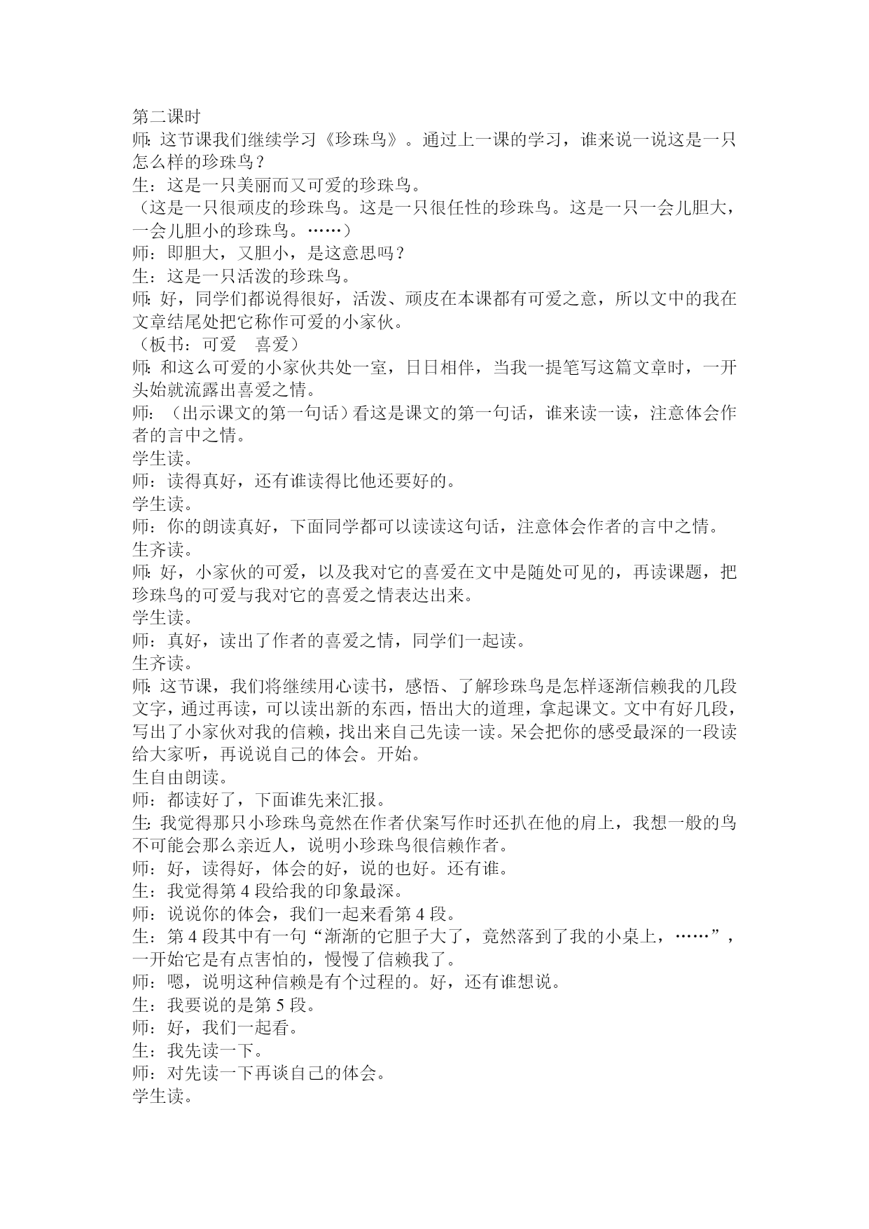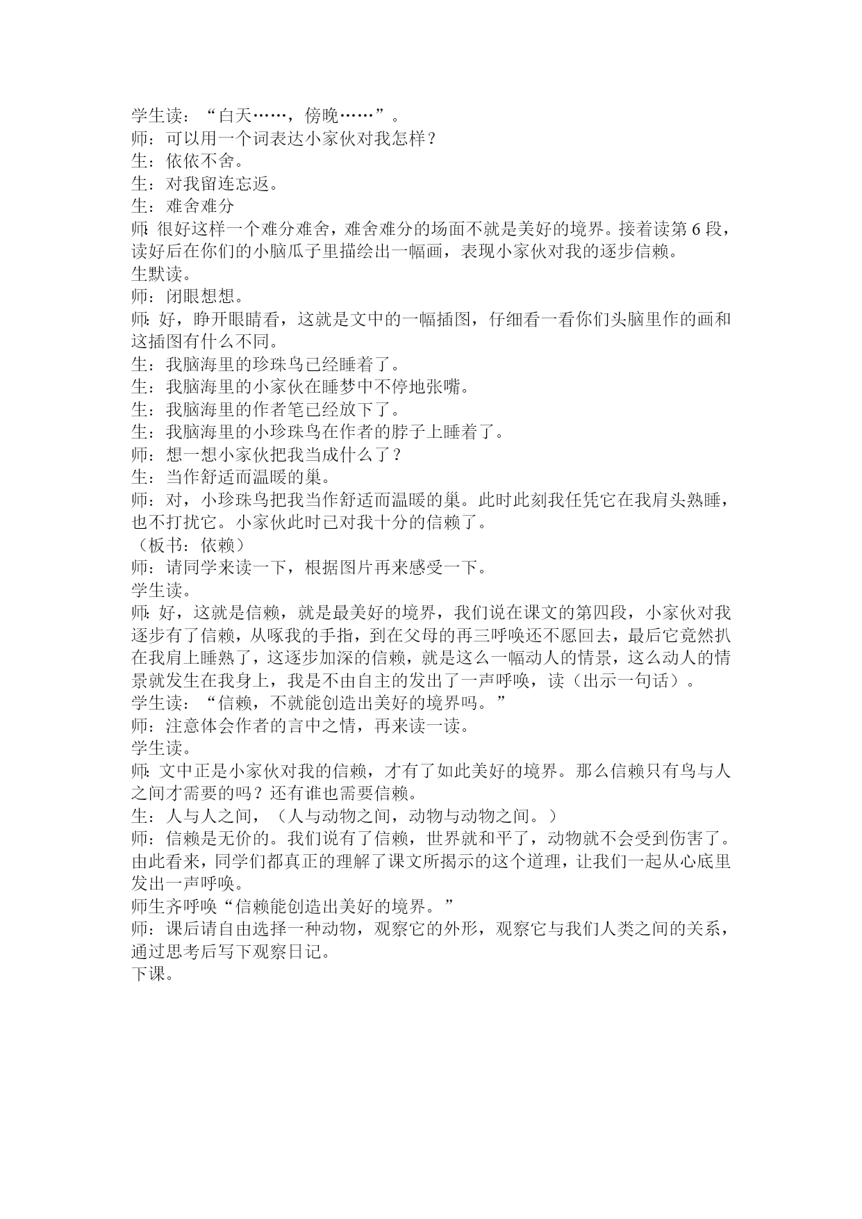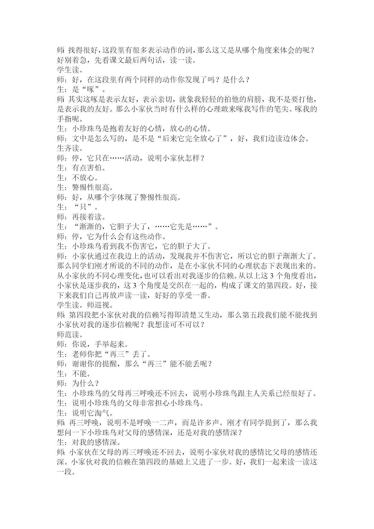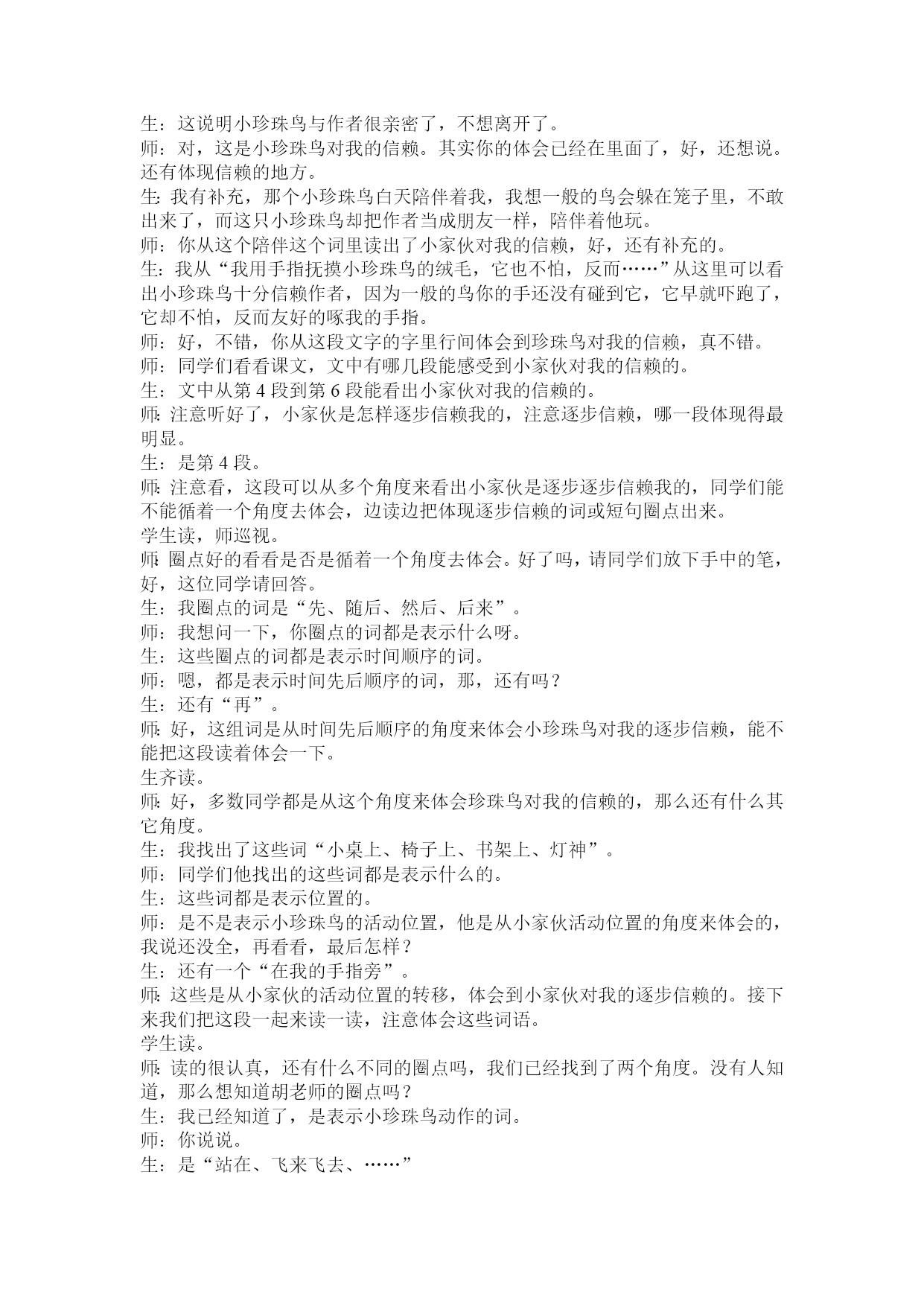 第二课时师:这节课我们继续学习《珍珠鸟》。通过上一课的学习,谁来说一说这是一只怎么样的珍珠鸟?生:这是一只美丽而又可爱的珍珠鸟。(这是一只很顽皮的珍珠鸟。这是一只很任性的珍珠鸟。这是一只一会儿胆大,一会儿胆小的珍珠鸟。……)师:即胆大,又胆小,是这意思吗?生:这是一只活泼的珍珠鸟。师:好,同学们都说得很好,活泼、顽皮在本课都有可爱之意,所以文中的我在文章结尾处把它称作可爱的小家伙。(板书:可爱喜爱)师:和这么可爱的小家伙共处一室,日日相伴,当我一提笔写这篇文章时,一开头始就流露出喜爱之情。师:(出示课文的第一句话)看这是课文的第一句话,谁来读一读,注意体会作者的言中之情。学生读。师:读得真好,还有谁读得比他还要好的。学生读。师:你的朗读真好,下面同学都可以读读这句话,注意体会作者的言中之情。生齐读。师:好,小家伙的可爱,以及我对它的喜爱在文中是随处可见的,再读课题,把珍珠鸟的可爱与我对它的喜爱之情表达出来。学生读。师:真好,读出了作者的喜爱之情,同学们一起读。生齐读。师:这节课,我们将继续用心读书,感悟、了解珍珠鸟是怎样逐渐信赖我的几段文字,通过再读,可以读出新的东西,悟出大的道理,拿起课文。文中有好几段,写出了小家伙对我的信赖,找出来自己先读一读。呆会把你的感受最深的一段读给大家听,再说说自己的体会。开始。生自由朗读。师:都读好了,下面谁先来汇报。生:我觉得那只小珍珠鸟竟然在作者伏案写作时还扒在他的肩上,我想一般的鸟不可能会那么亲近人,说明小珍珠鸟很信赖作者。师:好,读得好,体会的好,说的也好。还有谁。生:我觉得第4段给我的印象最深。师:说说你的体会,我们一起来看第4段。生:第4段其中有一句“渐渐的它胆子大了,竟然落到了我的小桌上,……”,一开始它是有点害怕的,慢慢了信赖我了。师:嗯,说明这种信赖是有个过程的。好,还有谁想说。生:我要说的是第5段。师:好,我们一起看。生:我先读一下。师:对先读一下再谈自己的体会。学生读。生:这说明小珍珠鸟与作者很亲密了,不想离开了。师:对,这是小珍珠鸟对我的信赖。其实你的体会已经在里面了,好,还想说。还有体现信赖的地方。生:我有补充,那个小珍珠鸟白天陪伴着我,我想一般的鸟会躲在笼子里,不敢出来了,而这只小珍珠鸟却把作者当成朋友一样,陪伴着他玩。师:你从这个陪伴这个词里读出了小家伙对我的信赖,好,还有补充的。生:我从“我用手指抚摸小珍珠鸟的绒毛,它也不怕,反而……”从这里可以看出小珍珠鸟十分信赖作者,因为一般的鸟你的手还没有碰到它,它早就吓跑了,它却不怕,反而友好的啄我的手指。师:好,不错,你从这段文字的字里行间体会到珍珠鸟对我的信赖,真不错。师:同学们看看课文,文中有哪几段能感受到小家伙对我的信赖的。生:文中从第4段到第6段能看出小家伙对我的信赖的。师:注意听好了,小家伙是怎样逐步信赖我的,注意逐步信赖,哪一段体现得最明显。生:是第4段。师:注意看,这段可以从多个角度来看出小家伙是逐步逐步信赖我的,同学们能不能循着一个角度去体会,边读边把体现逐步信赖的词或短句圈点出来。学生读,师巡视。师:圈点好的看看是否是循着一个角度去体会。好了吗,请同学们放下手中的笔,好,这位同学请回答。生:我圈点的词是“先、随后、然后、后来”。师:我想问一下,你圈点的词都是表示什么呀。生:这些圈点的词都是表示时间顺序的词。师:嗯,都是表示时间先后顺序的词,那,还有吗?生:还有“再”。师:好,这组词是从时间先后顺序的角度来体会小珍珠鸟对我的逐步信赖,能不能把这段读着体会一下。生齐读。师:好,多数同学都是从这个角度来体会珍珠鸟对我的信赖的,那么还有什么其它角度。生:我找出了这些词“小桌上、椅子上、书架上、灯神”。师:同学们他找出的这些词都是表示什么的。生:这些词都是表示位置的。师:是不是表示小珍珠鸟的活动位置,他是从小家伙活动位置的角度来体会的,我说还没全,再看看,最后怎样?生:还有一个“在我的手指旁”。师:这些是从小家伙的活动位置的转移,体会到小家伙对我的逐步信赖的。接下来我们把这段一起来读一读,注意体会这些词语。学生读。师:读的很认真,还有什么不同的圈点吗,我们已经找到了两个角度。没有人知道,那么想知道胡老师的圈点吗?生:我已经知道了,是表示小珍珠鸟动作的词。师:你说说。生:是“站在、飞来飞去、……”师:找得很好,这段里有很多表示动作的词,那么这又是从哪个角度来体会的呢?好别着急,先看课文最后两句话,读一读。学生读。师:好,在这段里有两个同样的动作你发现了吗?是什么?生:是“啄”。师:其实这啄是表示友好,表示亲切,就象我轻轻的拍他的肩膀,我不是要打他,是表示我的友好。那么小家伙当时有什么样的心理敢来啄我写作的笔尖、啄我的手指呢。生:小珍珠鸟是抱着友好的心情,放心的心情。师:文中是怎么写的,是不是“后来它完全放心了”,好