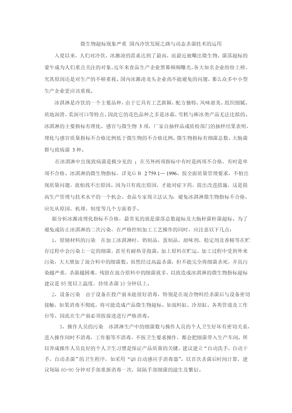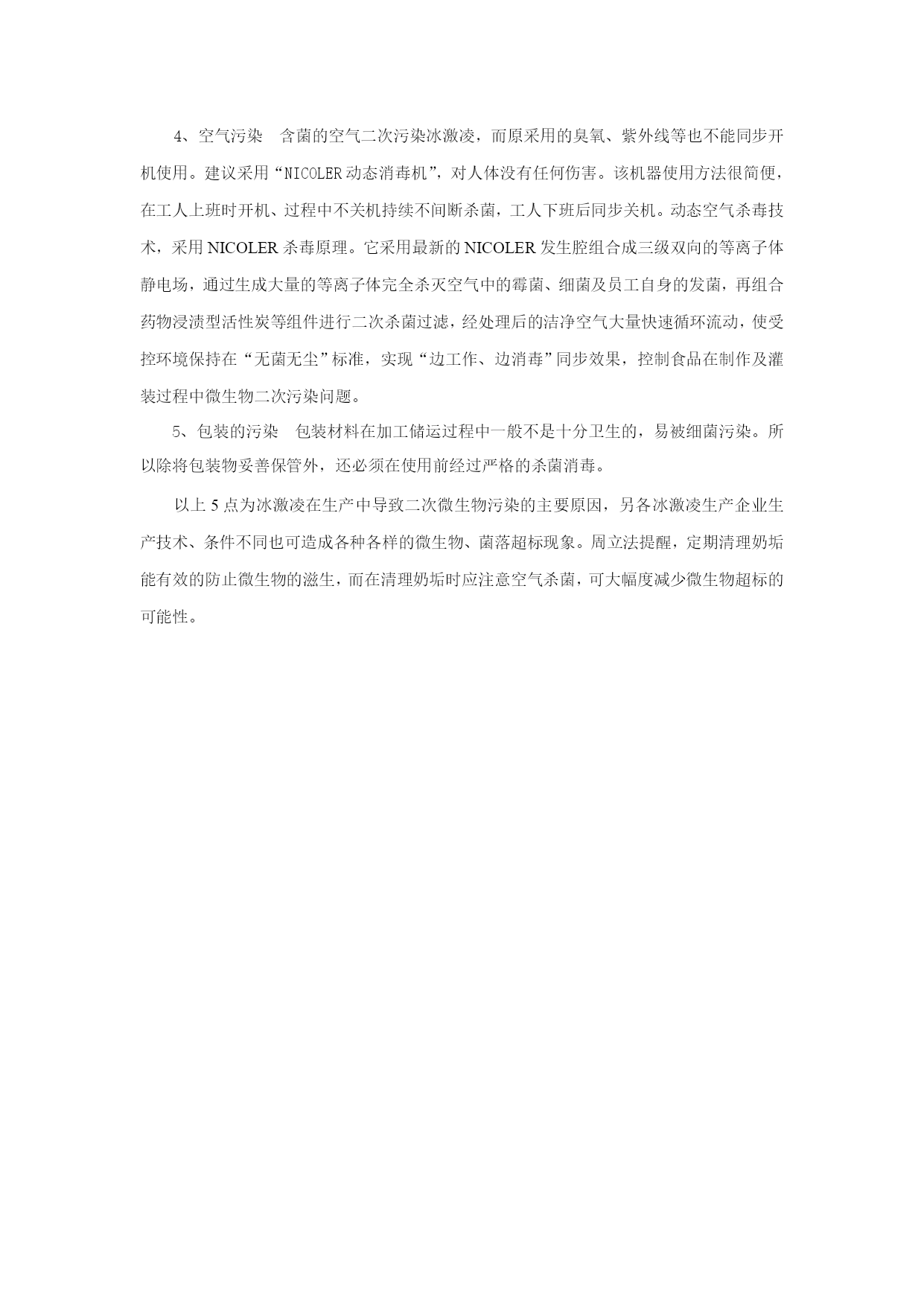 微生物超标现象严重国内冷饮发展之路与动态杀菌技术的运用入夏以来,人们对冷饮、冰激凌的需求达到了最高,而最近被曝出微生物、菌落超标的蒙牛成为人们重点关注的对象,近年来食品生产企业黑幕频频曝光,各大知名企业纷纷上榜,究其原因还是对生产的不够重视。国内冰激凌龙头企业尚不能避免的问题,那么众多中小型生产企业更应该重视。冰淇淋是冷饮的一个主要品种,由于它具有工艺新颖、配方独特、风味甜美、组织细腻、质地润滑、柔润可口等特点。因此它的花色品种之多是冰霜、雪糕与棒冰类产品无法比拟的。冰淇淋的主要指标有理化、感官与微生物3项,厂家自抽样品或质检部门的抽样结果表明,理化与感官质量指标不合格比例低于微生物的不合格比例。微生物指标有细菌总数、大肠菌群与致病菌3种。在冰淇淋中出现致病菌是极少见的;在另外两项指标中有时是两项不合格,有时是单项不合格。冰淇淋的微生物指标,详见GB2759.1—1996。按全面质量管理要求,不怕出现质量问题,就怕找不出原因。因为只有找出原因,才能对症下药,提出改进措施,这是提高生产管理与技术水平的一个机会。食品专家周立法认为,避免冰淇淋微生物指标不合格,应先从原因、机理、制度等几个方面着手。据分析冰激凌理化指标不合格,最常见的就是菌落总数超标及大肠杆菌杆菌超标。为了避免或防止冰淇淋的二次污染,在严格控制加工工艺操作的同时,应注意以下几点:1、原辅材料的污染在加工冰淇淋时,奶制品、蛋制品、甜味剂、稳定剂及香精等在贮存过程中会污染上一定的细菌,甚至有耐热芽孢菌。加上原料在贮运、加工过程中受到外来污染,大大增加了混合料中的细菌数。虽然经过高温杀菌,但不能完全将细菌杀死,并且污染越严重,杀菌越困难,残留在混合原料中的细菌就多,以致造成冰淇淋的微生物指标超标建议是85度以上温度,持续杀菌10分钟以上。2、设备污染由于设备在投产前未能很好消毒,特别是在混合物料经杀菌后与设备密切接触,如果消毒不彻底,将可能造成产品微生物超标。如混料缸、冷却缸、各类管道及工作台等。因此在生产前必须按前述进行严格消毒。3、操作人员的污染冰淇淋生产中的细菌数与操作人员的个人卫生好坏有密切关系,进入操作间时不消毒,工作服等不消毒,不按卫生要求操作,都会把细菌带入生产车间。所以养成操作人员良好的个人卫生习惯是保证产品质量的关键。建议建立“自动洗手、自动干手、自动杀菌”的卫生程序,如采用“Q8自动感应手消毒器”。以首次杀菌后时间计算,建议每隔60-90分钟对手部重新消毒一次,阻隔手部细菌的滋生及繁衍。4、空气污染含菌的空气二次污染冰激凌,而原采用的臭氧、紫外线等也不能同步开机使用。建议采用“NICOLER动态消毒机”,对人体没有任何伤害。该机器使用方法很简便,在工人上班时开机、过程中不关机持续不间断杀菌,工人下班后同步关机。动态空气杀毒技术,采用NICOLER杀毒原理。它采用最新的NICOLER发生腔组合成三级双向的等离子体静电场,通过生成大量的等离子体完全杀灭空气中的霉菌、细菌及员工自身的发菌,再组合药物浸渍型活性炭等组件进行二次杀菌过滤,经处理后的洁净空气大量快速循环流动,使受控环境保持在“无菌无尘”标准,实现“边工作、边消毒”同步效果,控制食品在制作及灌装过程中微生物二次污染问题。5、包装的污染包装材料在加工储运过程中一般不是十分卫生的,易被细菌污染。所以除将包装物妥善保管外,还必须在使用前经过严格的杀菌消毒。以上5点为冰激凌在生产中导致二次微生物污染的主要原因,另各冰激凌生产企业生产技术、条件不同也可造成各种各样的微生物、菌落超标现象。周立法提醒,定期清理奶垢能有效的防止微生物的滋生,而在清理奶垢时应注意空气杀菌,可大幅度减少微生物超标的可能性。