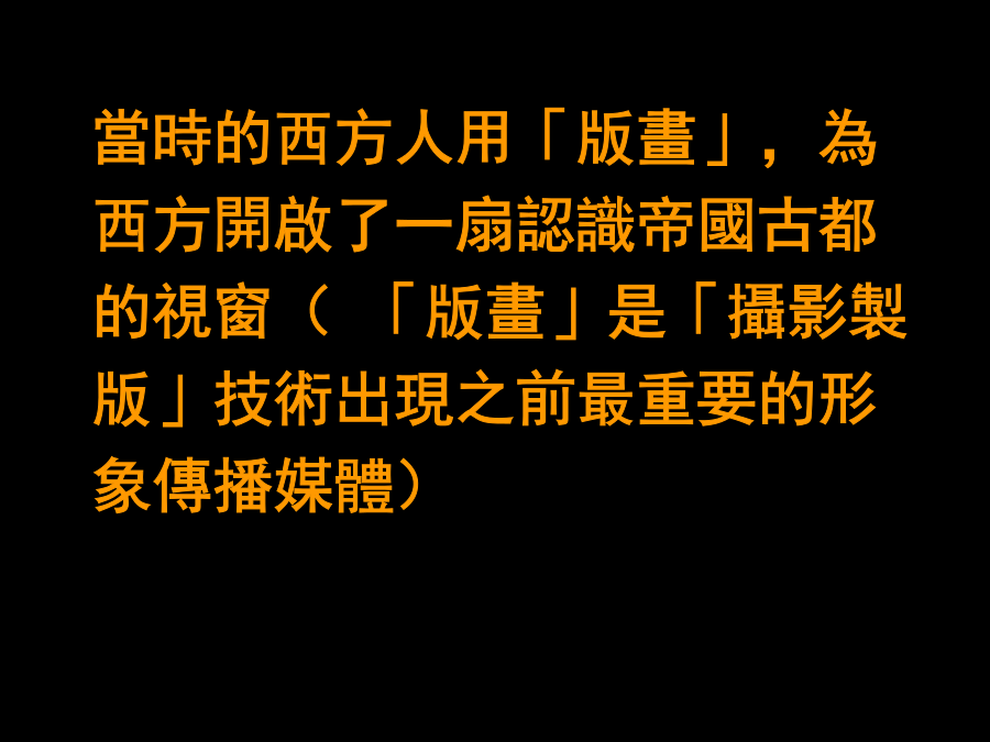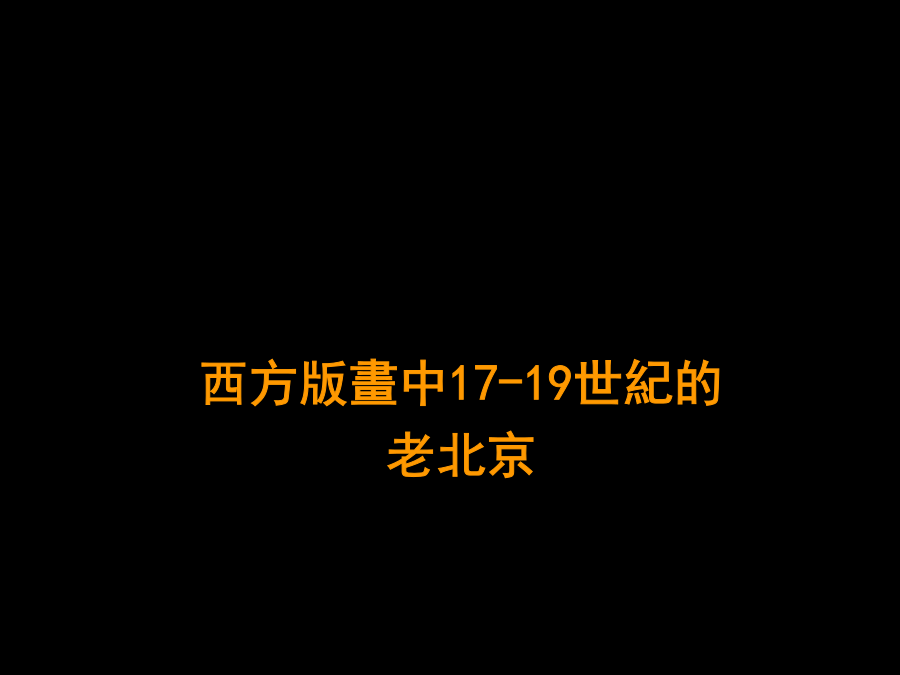 西方版畫中17-19世紀的老北京當時的西方人用「版畫」,為西方開啟了一扇認識帝國古都的視窗(「版畫」是「攝影製版」技術出現之前最重要的形象傳播媒體)大臣跪拜乾隆皇帝刊印年代1840年傳遞聖旨的官員刊印年代1796年作者威廉.亞歷山大出處《英使謁見乾隆紀實》祭牲爐火刊印年代1873年作者威廉.辛普森出處《倫敦新聞畫报》光緒皇帝冰上掠影冰上刊印年代1895年作者弗蘭克.戴德出處《倫敦新聞畫報》元日賞燈刊印年代1872年出處《畫報》清兵當街練箭刊印年代1894年作者弗蘭克.戴德出處《畫报》典衣、拍賣刊印年代1872年作者湯瑪斯.蔡爾德出處《畫报》街頭架鳥刊印年代1873年出處《倫敦新聞畫報》趣捉蜻蜓刊印年代1881年熱鬧的大茶樓刊印年代1881年出處《畫报》進出城門的車水馬龍刊印年代1894年出處《倫敦新聞畫报》華洋雜陳街景刊印年代1880年作者M.莫林出處《世界畫报》男孩子的學堂刊印年代1873年出處《倫敦新聞畫报》女孩子的學堂作者SEM出處《倫敦新聞畫報》碼頭市場刊印年代1843年作者湯瑪斯.阿羅姆出處《圖解中華帝國――社會建築風俗》郊外進京-燕山行刊印年代1873年出處《倫敦新聞畫报》京城西邊的城門-阜成門或德勝門刊印年代1796年作者威廉.亞歷山大出處《英使謁見乾隆紀實》一台大戲刊印年代1796年作者威廉.亞歷山大出處《英使謁見乾隆紀实》北海湖中景象刊印年代1796年作者威廉.亞歷山大出處《英使謁見乾隆紀实》乾隆皇帝六十大壽宴群叟刊印年代1788年作者I.S.赫爾曼光緒大轎進京刊印年代1902年作者F.瑪塔尼亞出處《倫敦新聞畫報》回京後的第一場接見刊印年代1902年清明祭掃刊印年代1901年作者維克多.普魯特出處《環球》冰上童趣與北京計程車刊印年代1861年出處《倫敦新聞畫报》郊區的兵站進出城門的車水馬龍刊印年代1894年出處《倫敦新聞畫报》外地進京-東路行刊印年代1895年作者C.E.弗利普出處《畫报》外地進京-西路行刊印年代1882年出處《倫敦新聞畫报》外地進京-蒙古行刊印年代1873年出處《倫敦新聞畫報》在北京南郊的賽馬場刊印年代1864年出處《畫報,環球旅行》在北京南郊的賽馬場刊印年代1867年出處《倫敦新聞畫報》西什庫教堂裡的祈禱刊印年代1900年出處《倫敦新聞畫報》英國使館前的一幕刊印年代1892年作者M.普賴斯出處《倫敦新聞畫报》