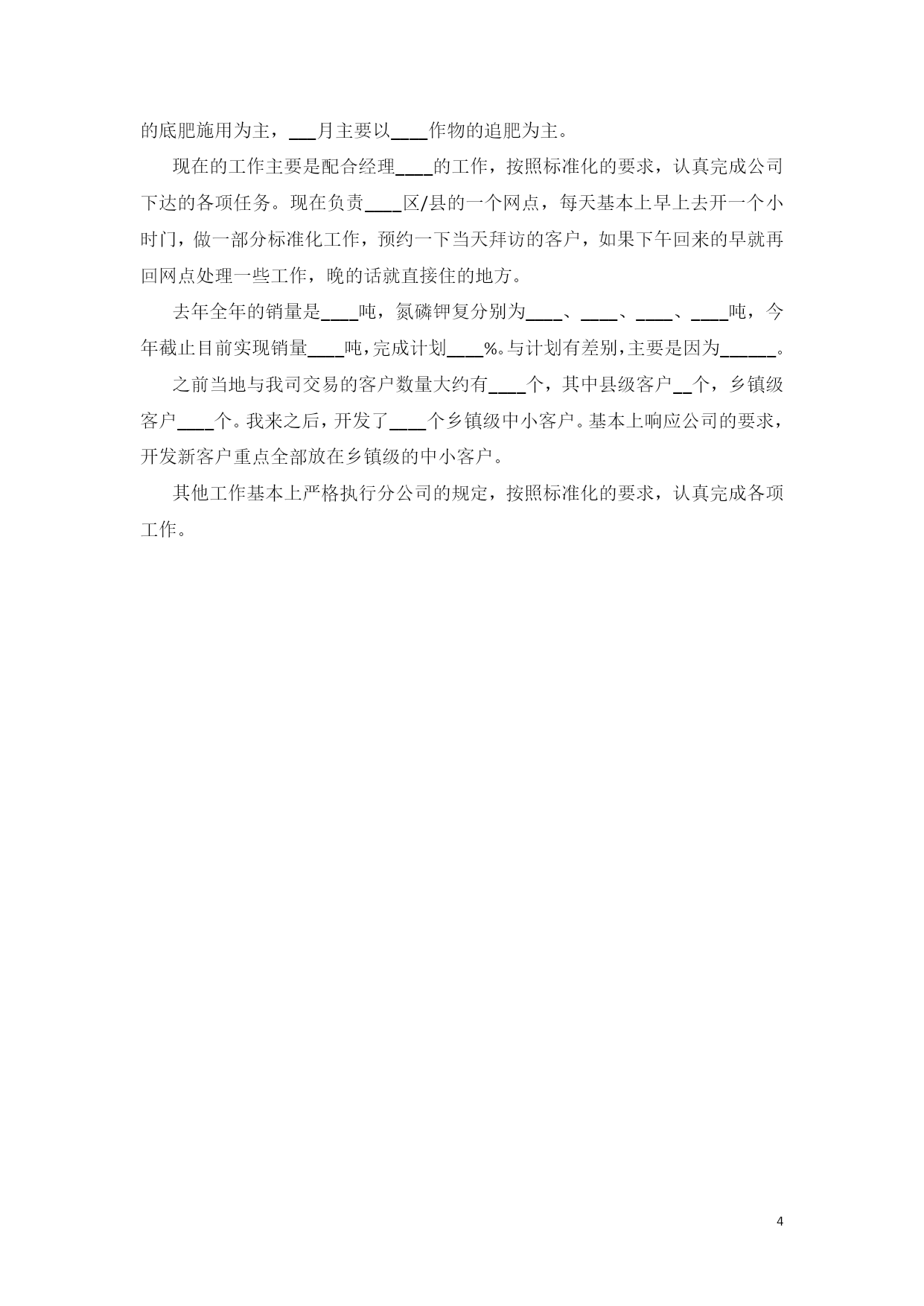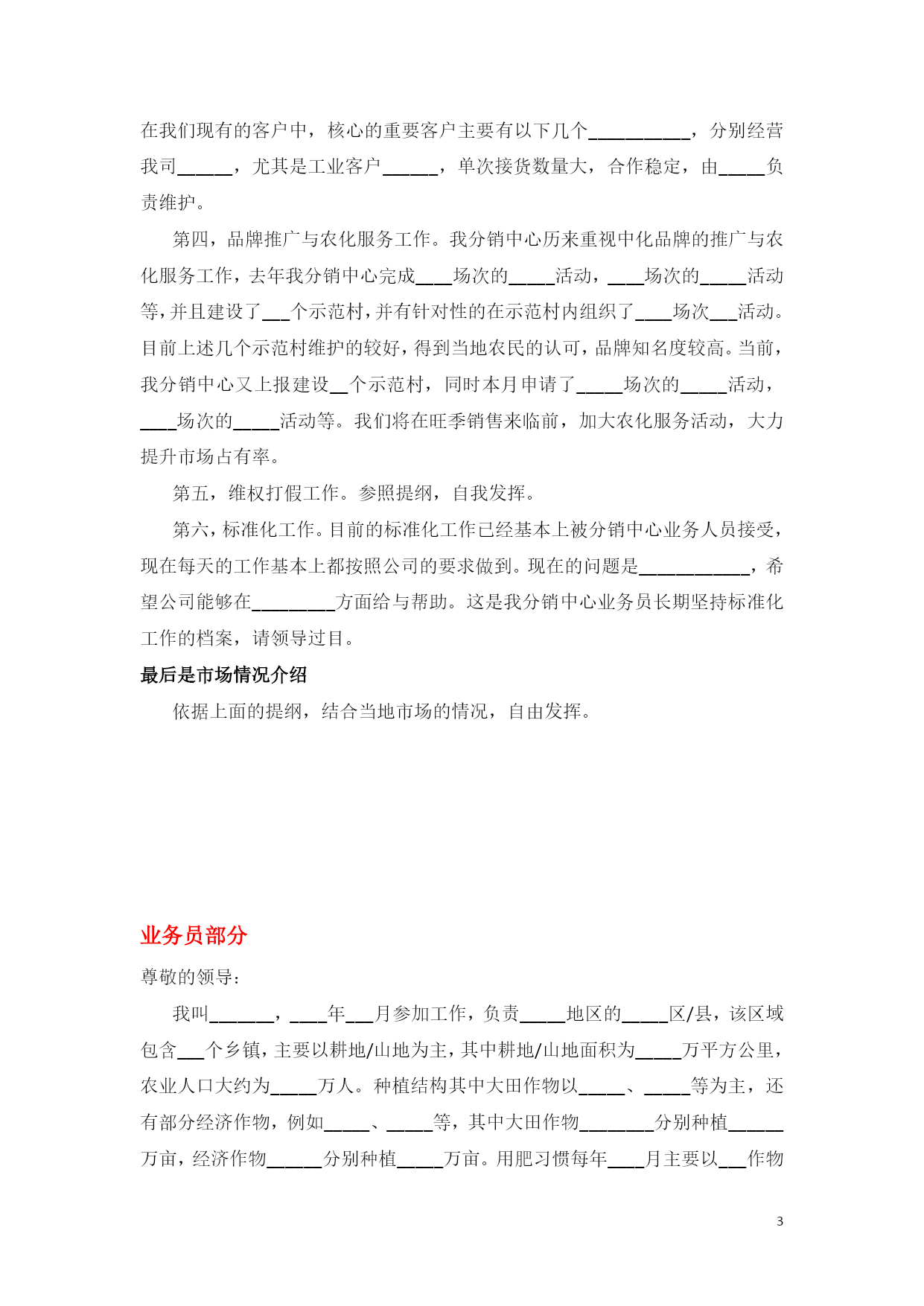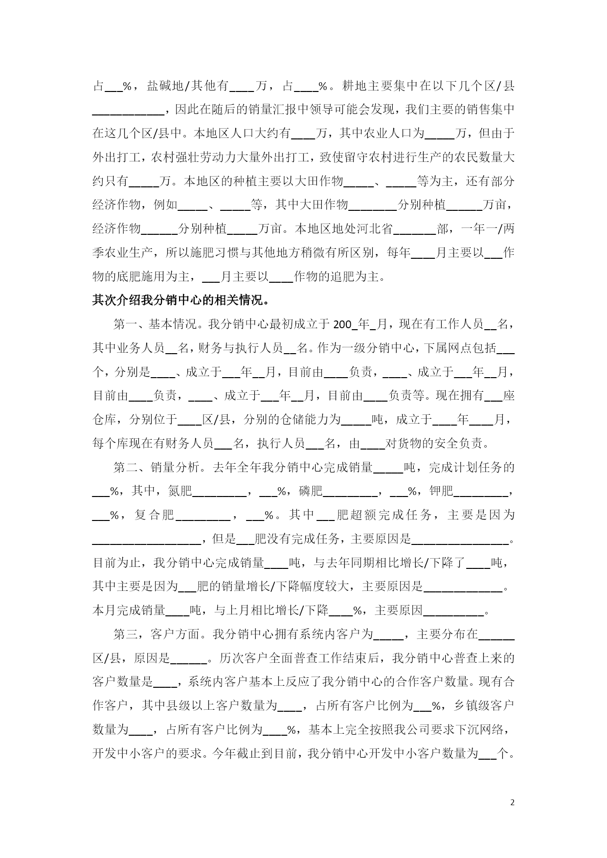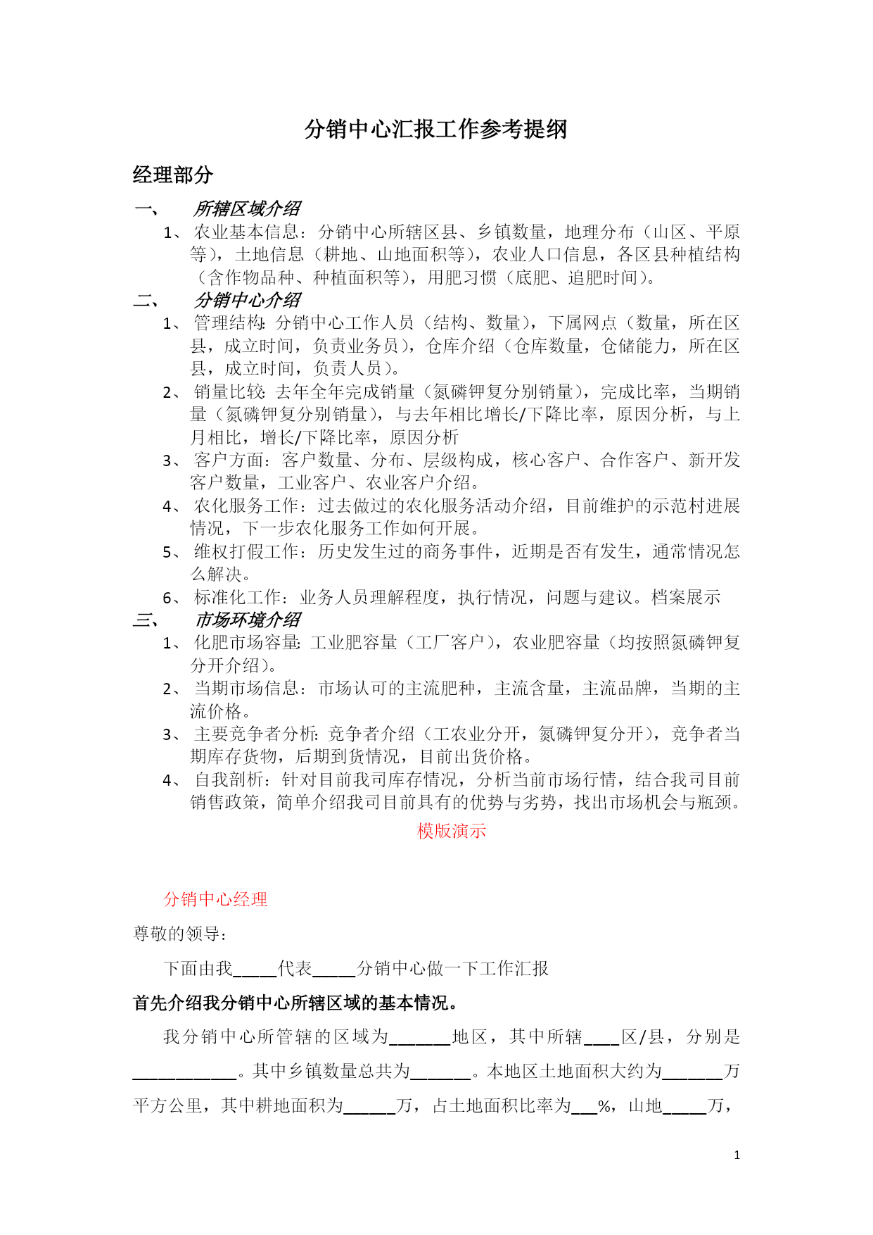 分销中心汇报工作参考提纲经理部分所辖区域介绍农业基本信息:分销中心所辖区县、乡镇数量,地理分布(山区、平原等),土地信息(耕地、山地面积等),农业人口信息,各区县种植结构(含作物品种、种植面积等),用肥习惯(底肥、追肥时间)。分销中心介绍管理结构:分销中心工作人员(结构、数量),下属网点(数量,所在区县,成立时间,负责业务员),仓库介绍(仓库数量,仓储能力,所在区县,成立时间,负责人员)。销量比较:去年全年完成销量(氮磷钾复分别销量),完成比率,当期销量(氮磷钾复分别销量),与去年相比增长/下降比率,原因分析,与上月相比,增长/下降比率,原因分析客户方面:客户数量、分布、层级构成,核心客户、合作客户、新开发客户数量,工业客户、农业客户介绍。农化服务工作:过去做过的农化服务活动介绍,目前维护的示范村进展情况,下一步农化服务工作如何开展。维权打假工作:历史发生过的商务事件,近期是否有发生,通常情况怎么解决。标准化工作:业务人员理解程度,执行情况,问题与建议。档案展示市场环境介绍化肥市场容量:工业肥容量(工厂客户),农业肥容量(均按照氮磷钾复分开介绍)。当期市场信息:市场认可的主流肥种,主流含量,主流品牌,当期的主流价格。主要竞争者分析:竞争者介绍(工农业分开,氮磷钾复分开),竞争者当期库存货物,后期到货情况,目前出货价格。自我剖析:针对目前我司库存情况,分析当前市场行情,结合我司目前销售政策,简单介绍我司目前具有的优势与劣势,找出市场机会与瓶颈。模版演示分销中心经理尊敬的领导:下面由我_____代表_____分销中心做一下工作汇报首先介绍我分销中心所辖区域的基本情况。我分销中心所管辖的区域为_______地区,其中所辖____区/县,分别是____________。其中乡镇数量总共为_______。本地区土地面积大约为_______万平方公里,其中耕地面积为______万,占土地面积比率为___%,山地_____万,占___%,盐碱地/其他有____万,占____%。耕地主要集中在以下几个区/县____________,因此在随后的销量汇报中领导可能会发现,我们主要的销售集中在这几个区/县中。本地区人口大约有____万,其中农业人口为_____万,但由于外出打工,农村强壮劳动力大量外出打工,致使留守农村进行生产的农民数量大约只有_____万。本地区的种植主要以大田作物_____、_____等为主,还有部分经济作物,例如_____、_____等,其中大田作物________分别种植______万亩,经济作物______分别种植_____万亩。本地区地处河北省_______部,一年一/两季农业生产,所以施肥习惯与其他地方稍微有所区别,每年____月主要以___作物的底肥施用为主,___月主要以____作物的追肥为主。其次介绍我分销中心的相关情况。第一、基本情况。我分销中心最初成立于200_年_月,现在有工作人员__名,其中业务人员__名,财务与执行人员__名。作为一级分销中心,下属网点包括___个,分别是____、成立于___年__月,目前由____负责,____、成立于___年__月,目前由____负责,____、成立于___年__月,目前由____负责等。现在拥有___座仓库,分别位于____区/县,分别的仓储能力为_____吨,成立于____年____月,每个库现在有财务人员___名,执行人员___名,由____对货物的安全负责。第二、销量分析。去年全年我分销中心完成销量_____吨,完成计划任务的___%,其中,氮肥_________,___%,磷肥_________,___%,钾肥_________,___%,复合肥_________,___%。其中___肥超额完成任务,主要是因为__________________,但是___肥没有完成任务,主要原因是________________。目前为止,我分销中心完成销量____吨,与去年同期相比增长/下降了____吨,其中主要是因为___肥的销量增长/下降幅度较大,主要原因是_____________。本月完成销量____吨,与上月相比增长/下降____%,主要原因__________。第三,客户方面。我分销中心拥有系统内客户为_____,主要分布在______区/县,原因是______。历次客户全面普查工作结束后,我分销中心普查上来的客户数量是____,系统内客户基本上反应了我分销中心的合作客户数量。现有合作客户,其中县级以上客户数量为____,占所有客户比例为___%,乡镇级客户数量为____,占所有客户比例为____%,基本上完全按照我公司要求下沉网络,开发中小客户的要求。今年截止到目前,我分销中心开发中小客户数量为___个。在我们现有的客户中