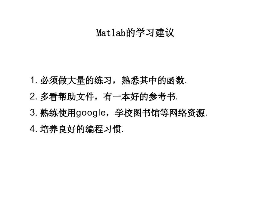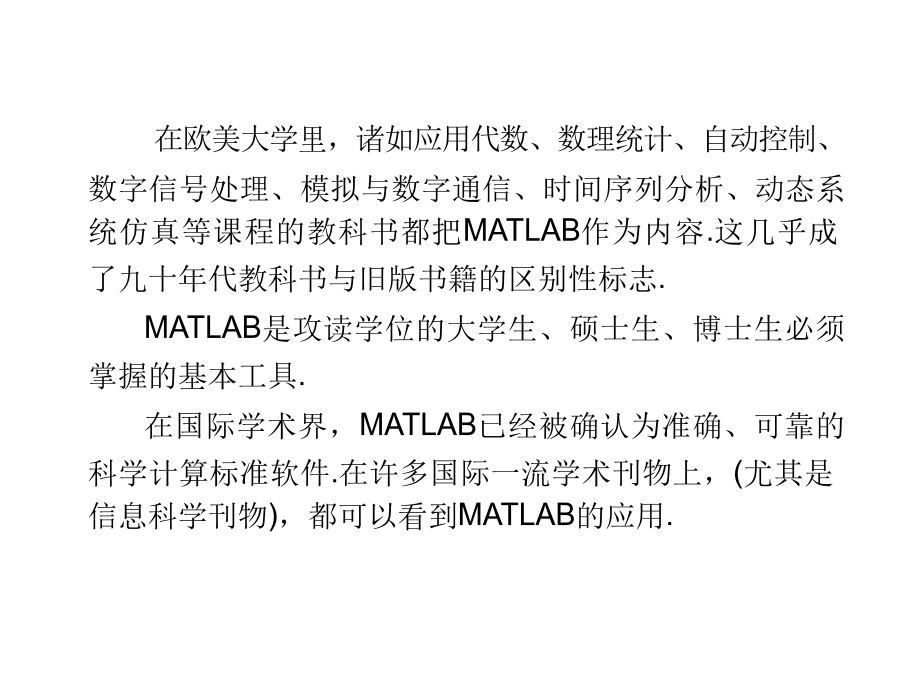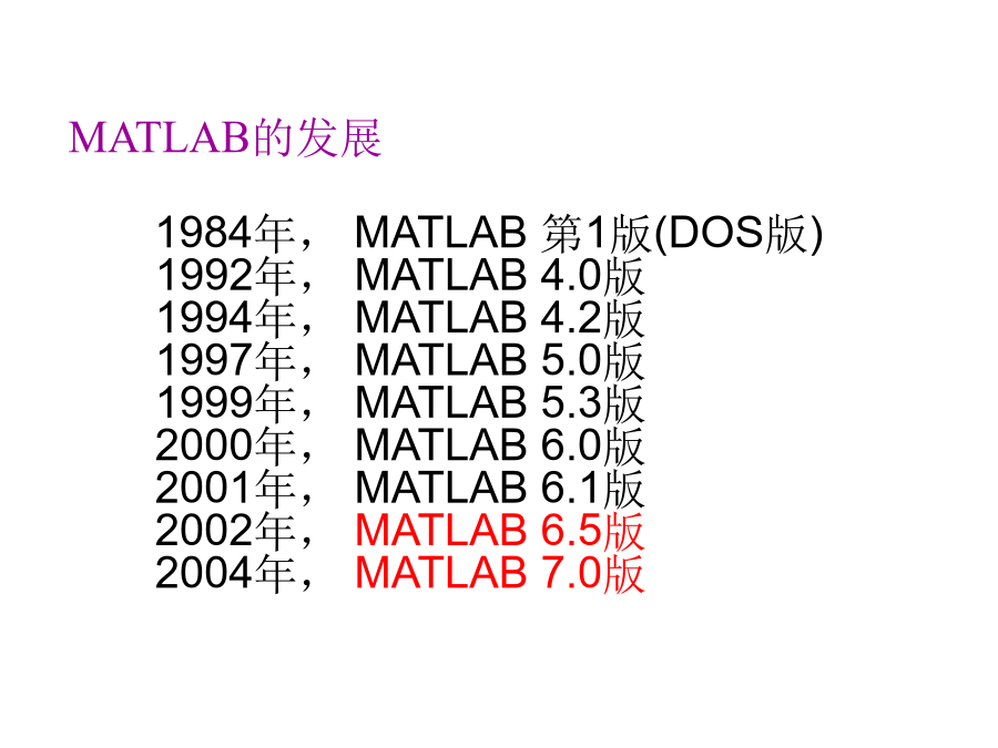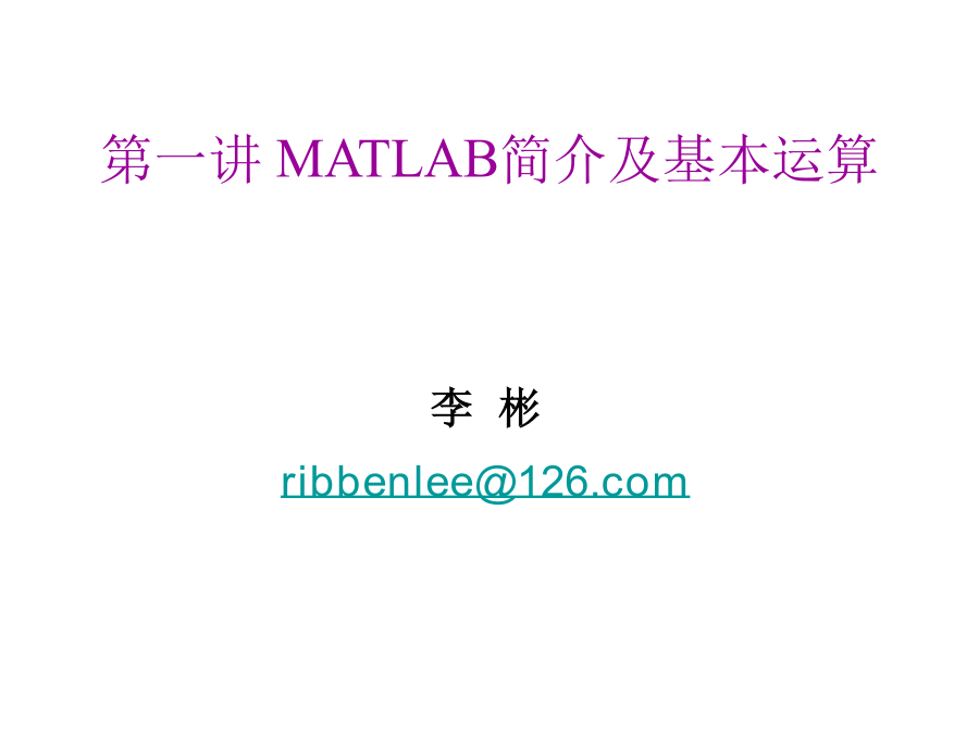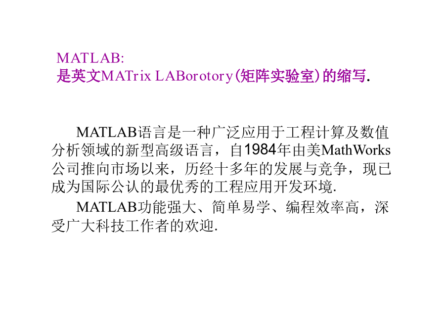 第一讲MATLAB简介及基本运算Matlab的学习建议MATLAB语言是一种广泛应用于工程计算及数值分析领域的新型高级语言,自1984年由美MathWorks公司推向市场以来,历经十多年的发展与竞争,现已成为国际公认的最优秀的工程应用开发环境. MATLAB功能强大、简单易学、编程效率高,深受广大科技工作者的欢迎. 在欧美大学里,诸如应用代数、数理统计、自动控制、数字信号处理、模拟与数字通信、时间序列分析、动态系统仿真等课程的教科书都把MATLAB作为内容.这几乎成了九十年代教科书与旧版书籍的区别性标志. MATLAB是攻读学位的大学生、硕士生、博士生必须掌握的基本工具. 在国际学术界,MATLAB已经被确认为准确、可靠的科学计算标准软件.在许多国际一流学术刊物上,(尤其是信息科学刊物),都可以看到MATLAB的应用.MATLAB的发展 1984年,MATLAB第1版(DOS版)1992年,MATLAB4.0版1994年,MATLAB4.2版1997年,MATLAB5.0版1999年,MATLAB5.3版2000年,MATLAB6.0版2001年,MATLAB6.1版2002年,MATLAB6.5版2004年,MATLAB7.0版 一.MATLAB特点: 一.MATLAB特点:3.高阶但简单的程式环境 作为一种直译式的程式语言,MATLAB容许使用者在短时间内写完程式,所花的时间约为用FORTRAN或C的几分之一,而且不需要编译(compile)及联结(link)即能执行,同时包含了更多及更容易使用的内建功能.5.应用工具箱 基本部分和各种可选的工具箱.基本部分中有数百个内部函数.工具箱提供了使用者在特别应用领域所需之许多函数. 现有工具箱有:符号运算(利用MapleV的计算核心执行)、影像处理、统计分析、讯号处理、神经网路、模拟分析、控制系统、最优化、模糊逻辑、化学计量分析.二.MATLAB运行环境命令三.MATLAB基本运算3.1基本表示方法2.变量命名规则: (1)变量名的大小写是敏感. (2)变量的第一个字符必须为英文字母,而且不能超过31个字符. (3)变量名可以包含下连字符、数字,但不能为空格符、标点.3.MATLAB表达式 算术表达式. 运算符有:+(加)、-(减)、*(乘)、/(右除)、\(左除)、^(乘方) 对于矩阵来说,左除和右除表示两种不同的除数矩阵和被除数矩阵的关系. 关系表达式. 运算符有:<(小于)、<=(小于或等于)、>(大于)、>=(大于或等于)、==(等于)、~=(不等于). 逻辑表达式. 运算符有:&(与)、|(或)和~(非). 在MATLAB下进行基本数学运算,只需将运算式直接打在提示号>>后面,并按Enter键. MATLAB将计算的结果以ans显示. 【例】求的算术运算结果. (1)用键盘在MATLAB指令窗中输入以下内容 >>(12+2*(7-4))/3^2 (2)在上述表达式输入完成后,按【Enter】键,该就指令被执行. (3)在指令执行后,MATLAB指令窗中将显示以下结果. ans= 2 我们也可给运算式的结果设定一个变量x: x=(5*2+1.3-0.8)*10^2/25 x= 42 变量x的值可以在下个语句中调用: y=2*x+1 y= 85例:计算圆面积Area,半径r=2,则可键入 >>r=2;%圆半径r=2, >>area=pi*r^2;%计算圆面积area >>area= 12.56644.矩阵运算2.冒号表达式 在MATLAB中,冒号是一个重要的运算符.利用它可以产生向量,还可用来拆分矩阵.冒号表达式的一般格式是: e1:e2:e3其中e1为初始值,e2为步长,e3为终止值.冒号表达式可产生一个由e1开始到e3结束,以步长e2自增的行向量. 例如:i=1:0.5:10 MATLAB常用数学函数 三角函数和双曲函数指数函数其他函数4.矩阵的基本运算 (1)矩阵转置 (2)矩阵加和减 (3)矩阵乘法 (4)矩阵除法A\b=inv(A)*b (5)矩阵的乘方a.^2 阵列运算功能(注意:一定要多加.符号) +加-减.*乘./左除.\右除.^次方.'转置6.矩阵的拆分 利用冒号表达式获得子矩阵①A(:,j)表示取A矩阵的第j列全部元素;A(i,:)表示A矩阵第i行的全部元素;A(i,j)表示取A矩阵第i行、第j列的元素.②A(i:i+m,:)表示取A矩阵第i~i+m行的全部元素;A(:,k:k+m)表示取A矩阵第k~k+m列的全部元素,A(i:i+m,k:k+m)表示取A矩阵第i~i+m行内,并在第k~k+m列中的所有元素.此外,还可利用一般向量和end运算符来表示矩阵下标,从而获得子矩阵.end表示某一维的末尾元素下标. 空矩阵的定义:X=[],存