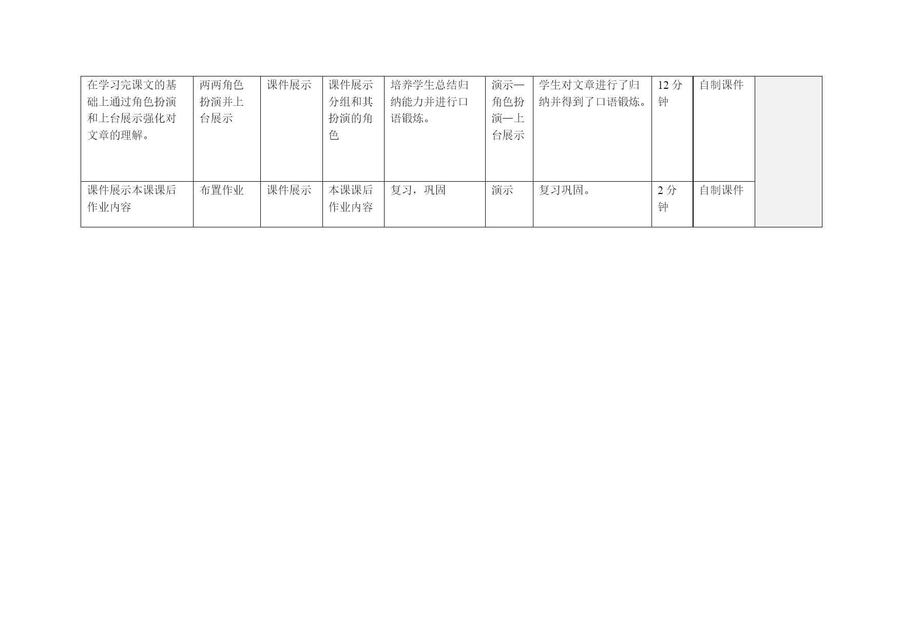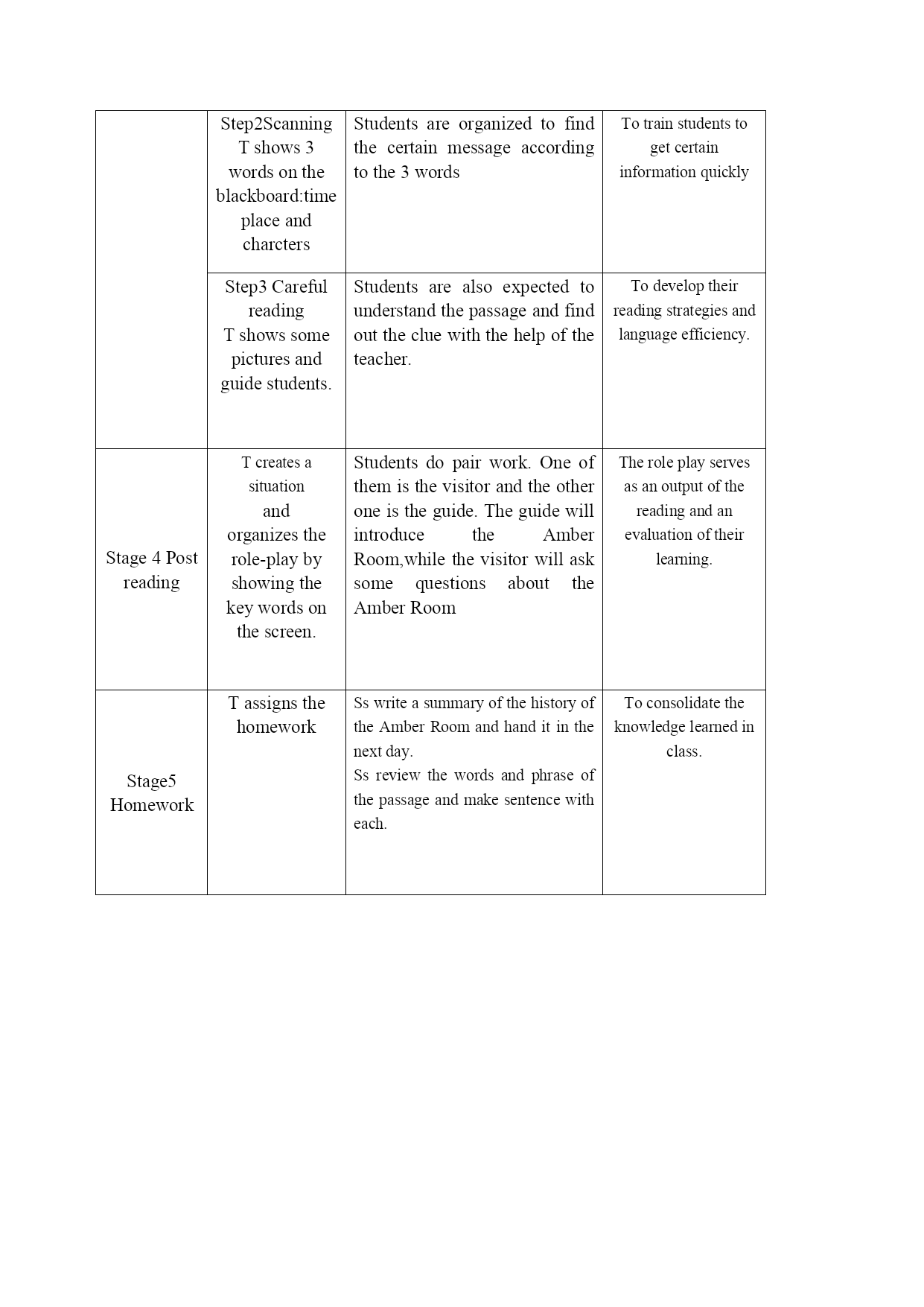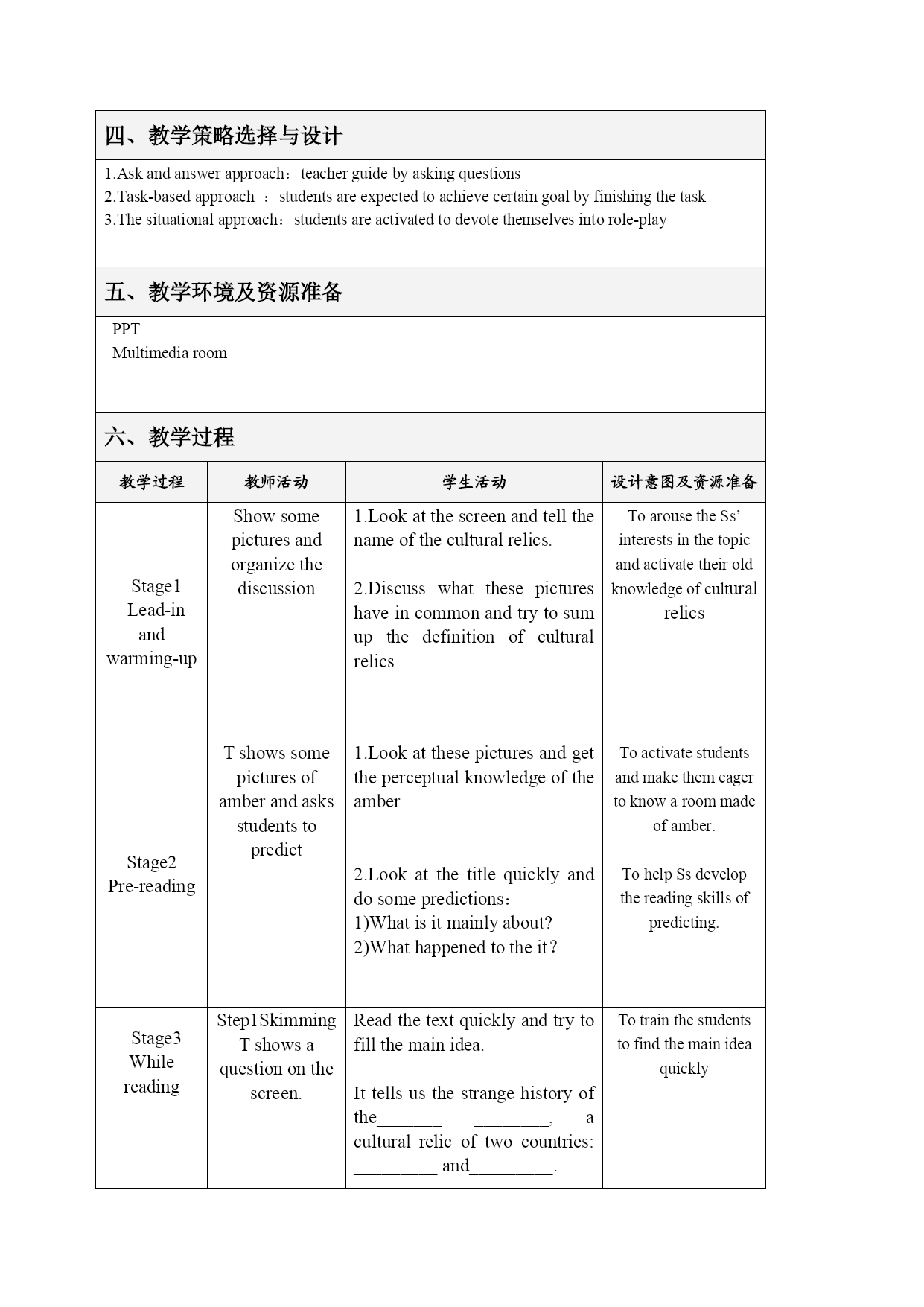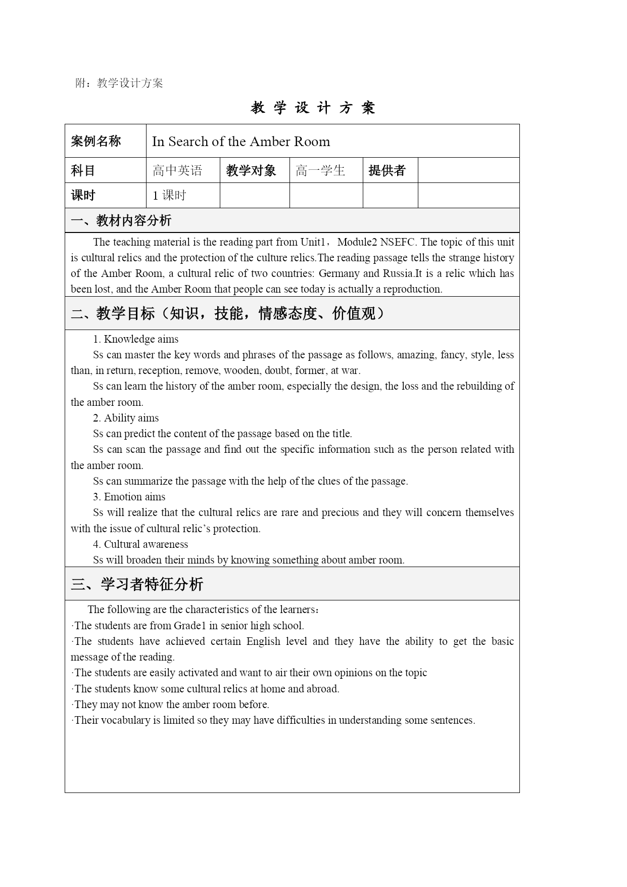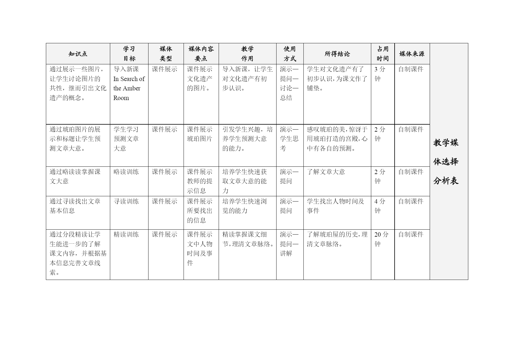 知识点学习目标媒体类型媒体内容要点教学作用使用方式所得结论占用时间媒体来源教学媒体选择分析表通过展示一些图片,让学生讨论图片的共性,继而引出文化遗产的概念。导入新课InSearchoftheAmberRoom课件展示课件展示文化遗产的图片。导入新课,让学生对文化遗产有初步认识。演示—提问—讨论—总结学生对文化遗产有了初步认识,为课文作了铺垫。3分钟自制课件通过琥珀图片的展示和标题让学生预测文章大意。学生学习预测文章大意课件展示课件展示琥珀图片引发学生兴趣,培养学生预测大意的能力。演示—学生思考感叹琥珀的美,惊讶于用琥珀打造的宫殿,心中有各自的预测。2分钟自制课件通过略读读掌握课文大意略读训练课件展示课件展示教师的提示信息培养学生快速获取文章大意的能力演示—提问了解文章大意2分钟自制课件通过寻读找出文章基本信息寻读训练课件展示课件展示所要找出的信息培养学生快速浏览的能力演示—提问学生找出人物时间及事件4分钟自制课件通过分段精读让学生能进一步的了解课文内容,并根据基本信息完善文章线索。精读训练课件展示课件展示文中人物时间及事件精读掌握课文细节,理清文章脉络。演示—提问—讲解了解琥珀屋的历史,理清文章脉络。20分钟自制课件在学习完课文的基础上通过角色扮演和上台展示强化对文章的理解。两两角色扮演并上台展示课件展示课件展示分组和其扮演的角色培养学生总结归纳能力并进行口语锻炼。演示—角色扮演—上台展示学生对文章进行了归纳并得到了口语锻炼。12分钟自制课件课件展示本课课后作业内容布置作业课件展示本课课后作业内容复习,巩固演示复习巩固。2分钟自制课件附:教学设计方案教学设计方案案例名称InSearchoftheAmberRoom科目高中英语教学对象高一学生提供者课时1课时一、教材内容分析TheteachingmaterialisthereadingpartfromUnit1,Module2NSEFC.Thetopicofthisunitisculturalrelicsandtheprotectionoftheculturerelics.ThereadingpassagetellsthestrangehistoryoftheAmberRoom,aculturalrelicoftwocountries:GermanyandRussia.Itisarelicwhichhasbeenlost,andtheAmberRoomthatpeoplecanseetodayisactuallyareproduction.二、教学目标(知识,技能,情感态度、价值观)1.KnowledgeaimsSscanmasterthekeywordsandphrasesofthepassageasfollows,amazing,fancy,style,lessthan,inreturn,reception,remove,wooden,doubt,former,atwar.Sscanlearnthehistoryoftheamberroom,especiallythedesign,thelossandtherebuildingoftheamberroom.2.AbilityaimsSscanpredictthecontentofthepassagebasedonthetitle.Sscanscanthepassageandfindoutthespecificinformationsuchasthepersonrelatedwiththeamberroom.Sscansummarizethepassagewiththehelpofthecluesofthepassage.3.EmotionaimsSswillrealizethattheculturalrelicsarerareandpreciousandtheywillconcernthemselveswiththeissueofculturalrelic’sprotection.4.CulturalawarenessSswillbroadentheirmindsbyknowingsomethingaboutamberroom.三、学习者特征分析Thefollowingarethecharacteristicsofthelearners:·ThestudentsarefromGrade1inseniorhighschool.·ThestudentshaveachievedcertainEnglishlevelandtheyhavetheabilitytogetthebasicmessageofthereading.·Thestudentsareeasilyactivatedandwanttoairtheirownopinion