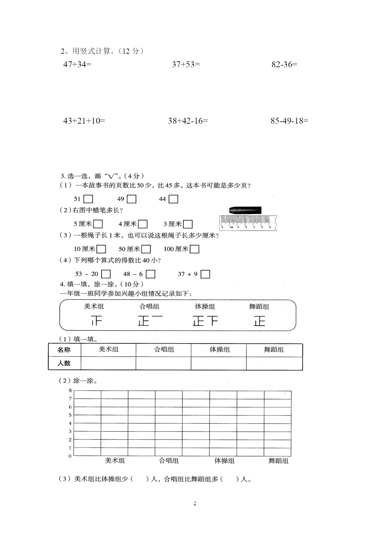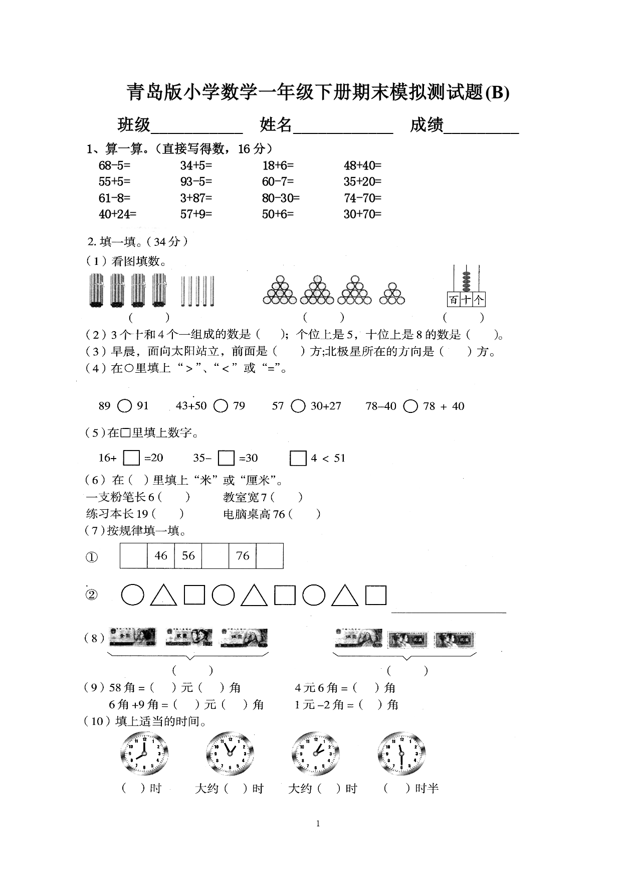 青岛版小学数学一年级下册期末模拟测试题(B)班级___________姓名____________成绩_________1、算一算。(直接写得数,16分)68-5=34+5=18+6=48+40=55+5=93-5=60-7=35+20=61-8=3+87=80-30=74-70=40+24=57+9=50+6=30+70=2、用竖式计算。(12分)47+34=37+53=82-36=43+21+10=38+42-16=85-49-18=